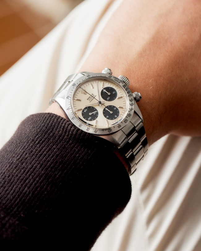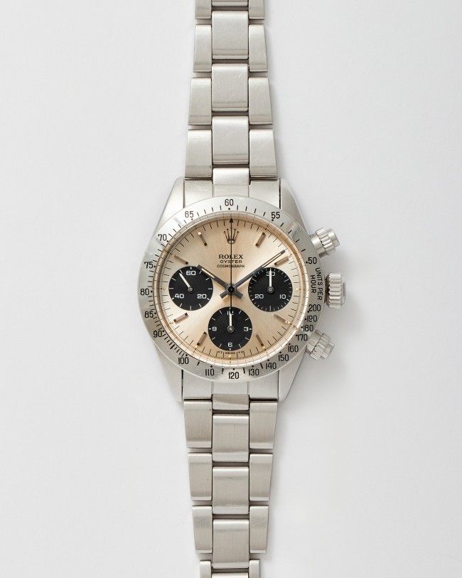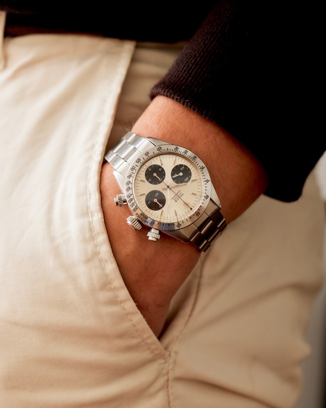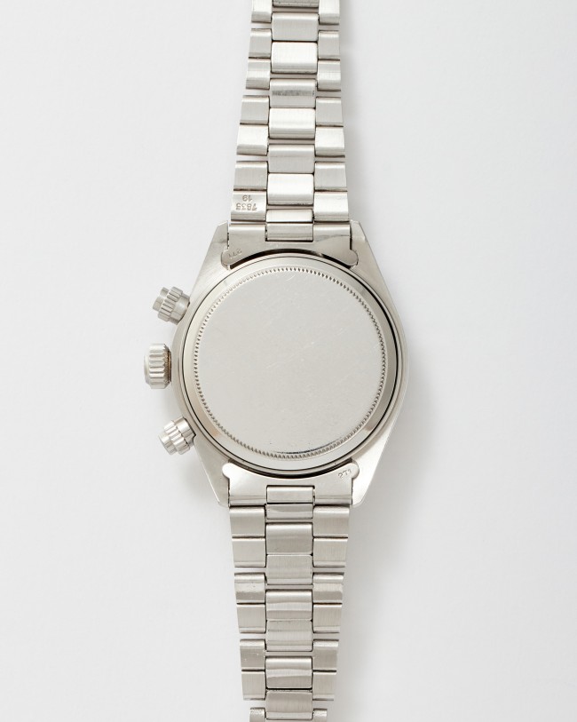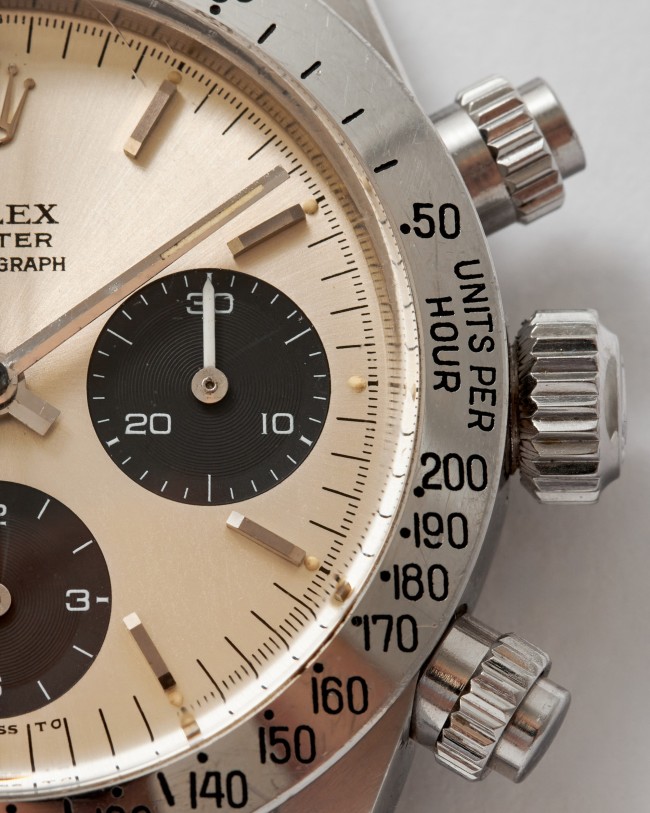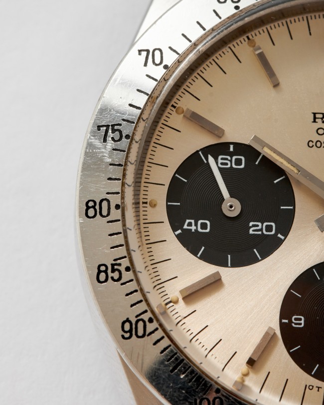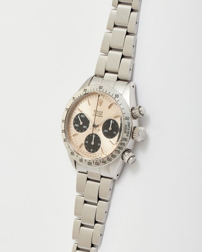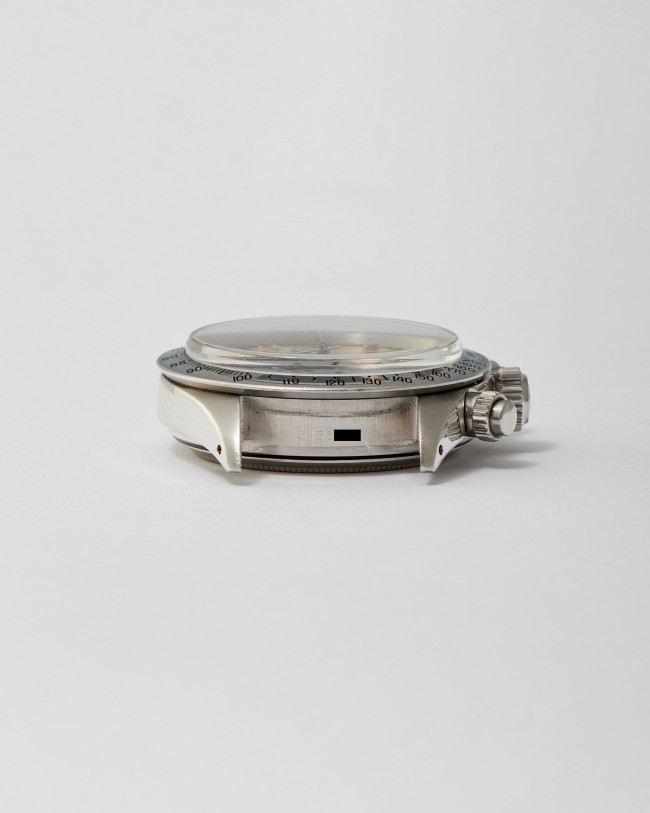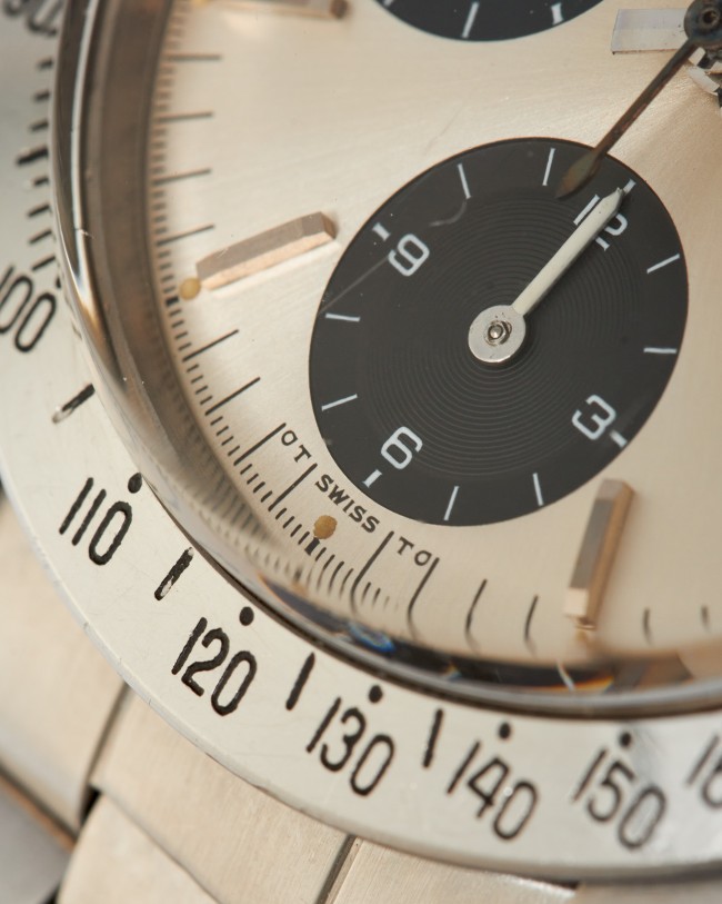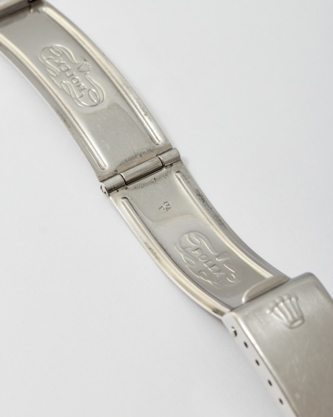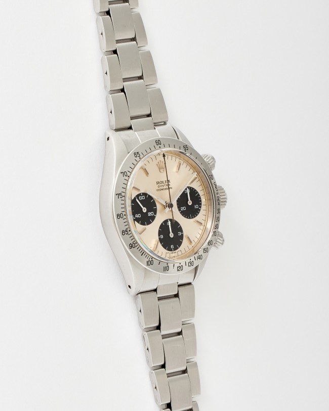 Stainless steel Rolex Daytona ref. 6265. This silver "Sigma" dial Daytona is in good condition and retains all of its original parts. While the case and bezel exhibit little polishing and signs of wear, they maintain their original integrity. The silver dial is flawless, with all luminous plots intact and visible. The Oyster folded bracelet shows some signs of wear but remains tight and wearable. Accompanied by its original box and papers dated September 1974, this full set Daytona represents a sound investment opportunity. Ready to grace the wrist of a seasoned collector, it combines timeless elegance with potential for future appreciation.