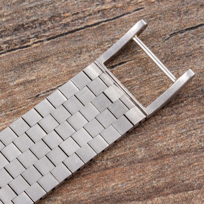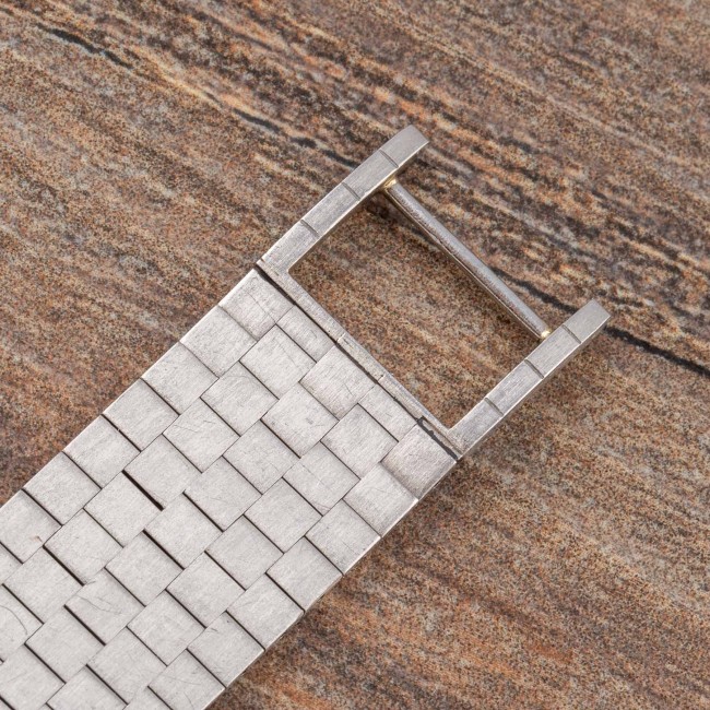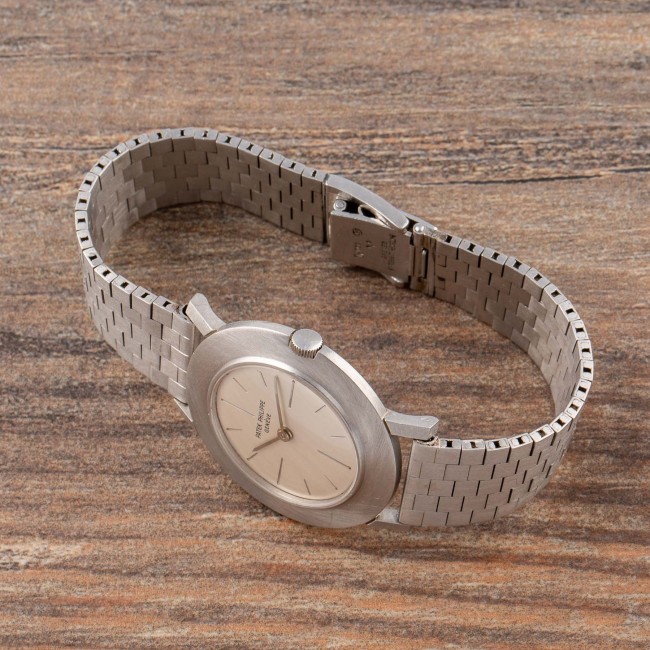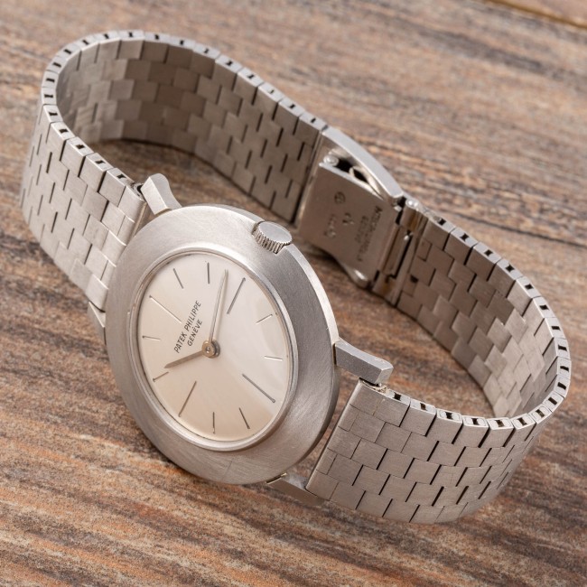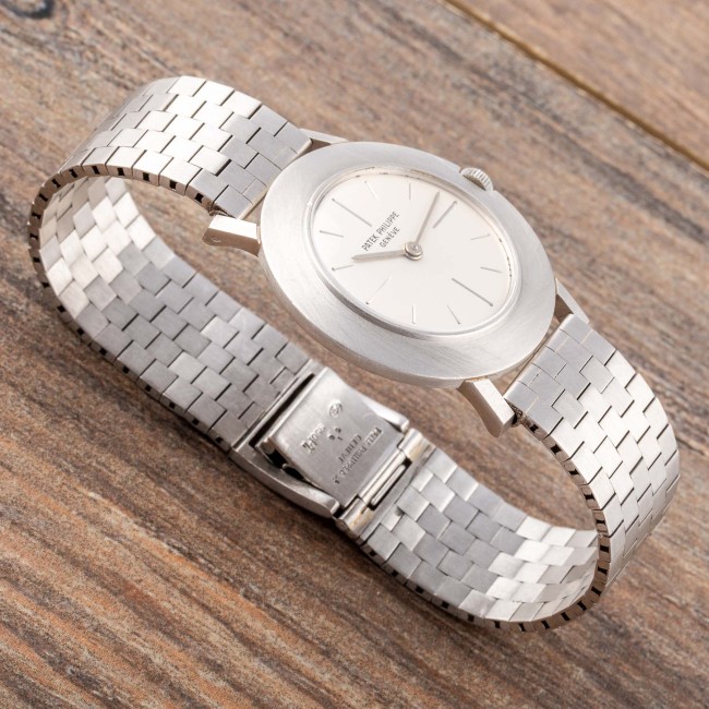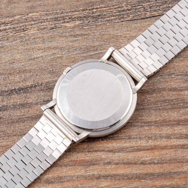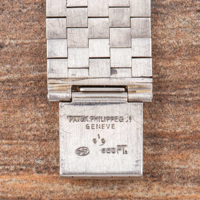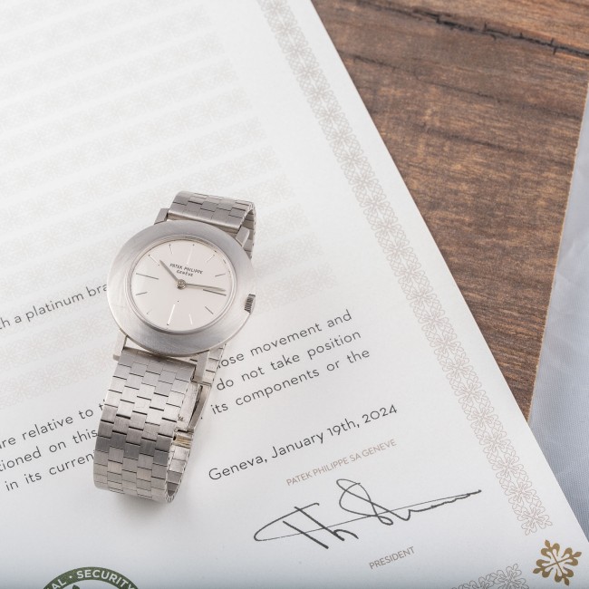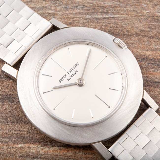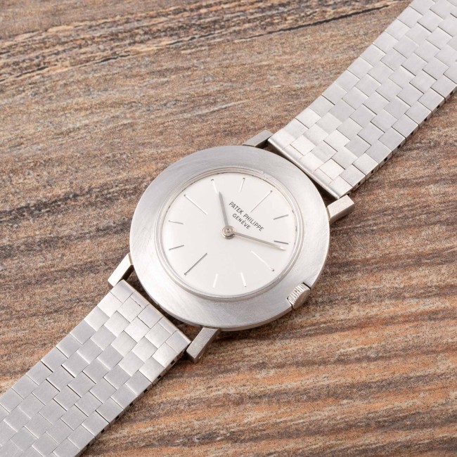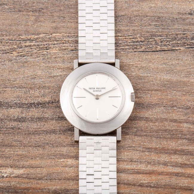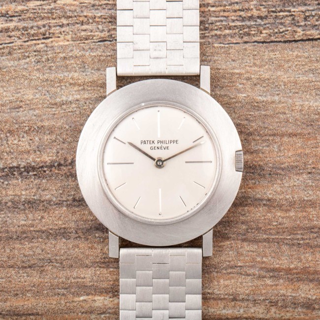 PATEK PHILIPPE “DISCO VOLANTE” REF. 2594 PLATINUM The early and mid-1900s were a time of great experimentation in the watchmaking world. Being a period where the pocket watch was quickly becoming obsolete, Swiss watchmaking companies found themselves overwhelmed by requests of watches that could be strapped on the wrist. An historical and repentine evolution which led the whole Swiss industry to totally reinvent their products by conceiving new forms, shapes, technical solutions. A striking example of stylistic evolution is the present watch produced by Patek Philippe in the early 60’s. The case has an extremely futuristic look consisting in very hidden lugs and in a flat circular bezel. Something definitely unusual for the time. This Patek Philippe model for its so peculiar shapes was renamed by the Italian collectors "Disco Volante", resembling those circular Unknown Flying Objects that have always tickled the fantasies of those who think there is something beyond our world. The present specimen is an exceptional example of the very rare and sought after "Disco Volante" models. The 32 mm small lugs case despite of some very light signs of aging still shows the original shapes and forms and it is most likely untouched. The silver dial is very well preserved especially if we consider that this watch was produced in 1958 with just some very light signs of aging. The caliber works perfectly and it’s in perfect shape. All the components including hands, signed Gay Freres and Patek Philippe platinum bracelet, caseback and 23-300 caliber match the production period and are correct for the watch. Accompanied by a Patek Philippe extract from the archives, it confirms that the watch was produced in 1958 and sold in 1958 with platinum bracelet. Serial Number 2,603,XXX, Year 1958, Diameter 32mm.