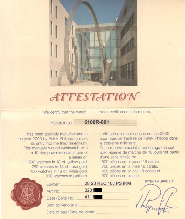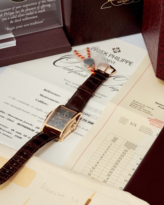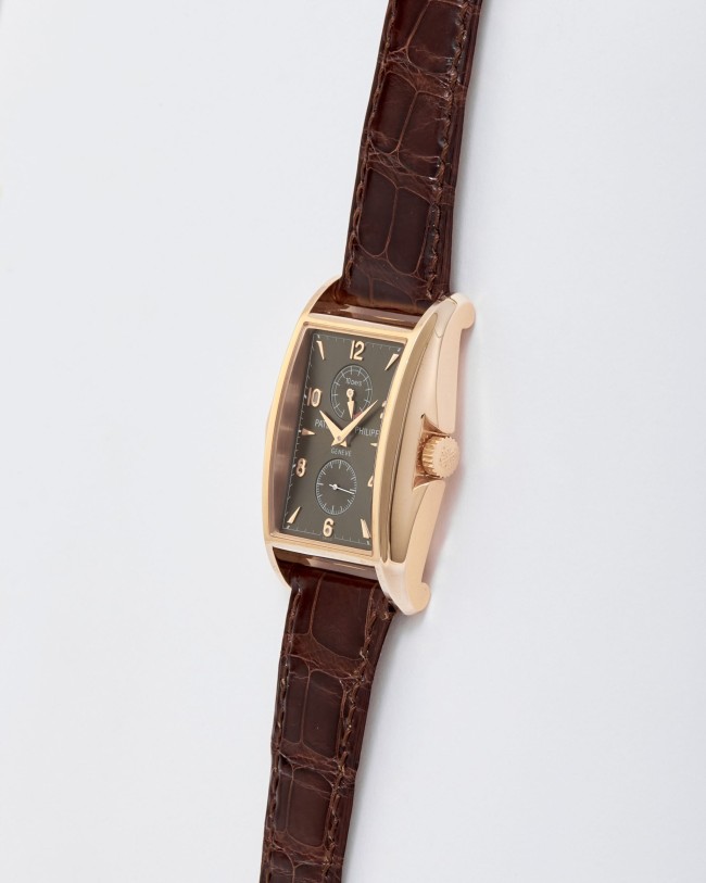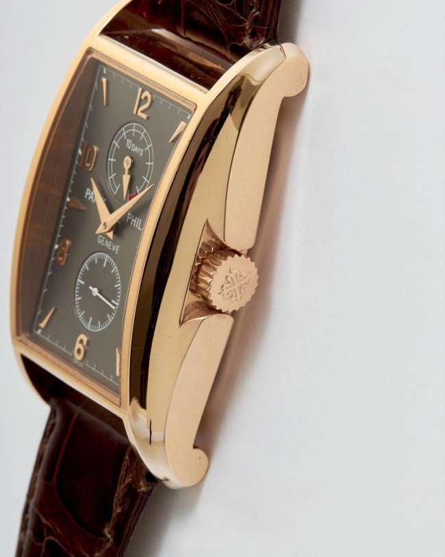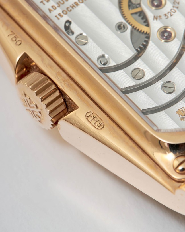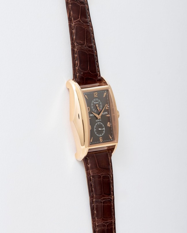 18K pink gold 10-Day Power Reserve Patek Philippe ref. 5100R. This Patek Philippe 10-Day Power Reserve is a part of a prestigious limited edition of four models created to commemorate the new millennium. Inspired by the iconic 1950s "Manta Ray" reference 2554, this particular example showcases an exquisite rose gold case in impeccable condition. While faint signs of minimal wear are visible on the bezel, the watch itself remains unused, with a brand-new strap still featuring the special Patek Philippe lead seal. Powered by the manual-winding Caliber 28-20 movement with a 10-day power reserve complication, this extraordinary timepiece is accompanied by its original box, wallet, limited edition certificate, chronometer certificate, and original papers. With its striking and unconventional case design combined with a sophisticated movement, this limited edition Patek Philippe is a remarkable addition to any collection.