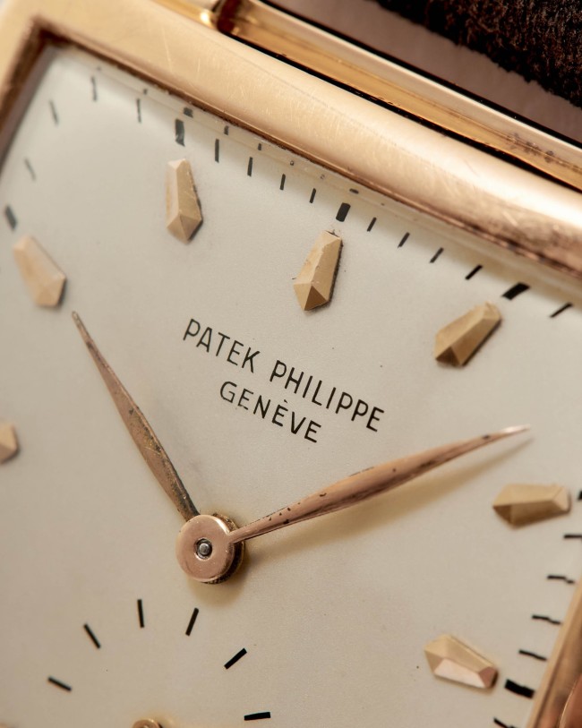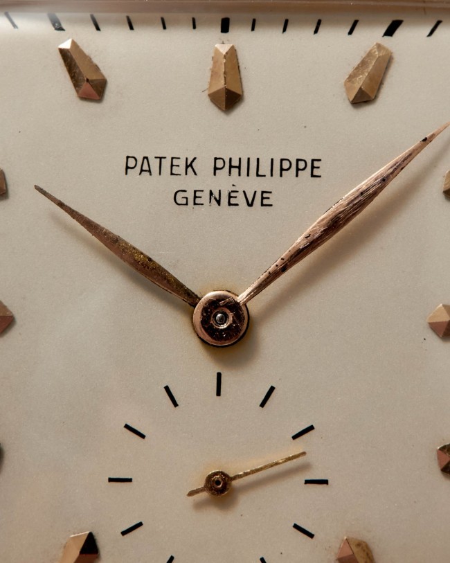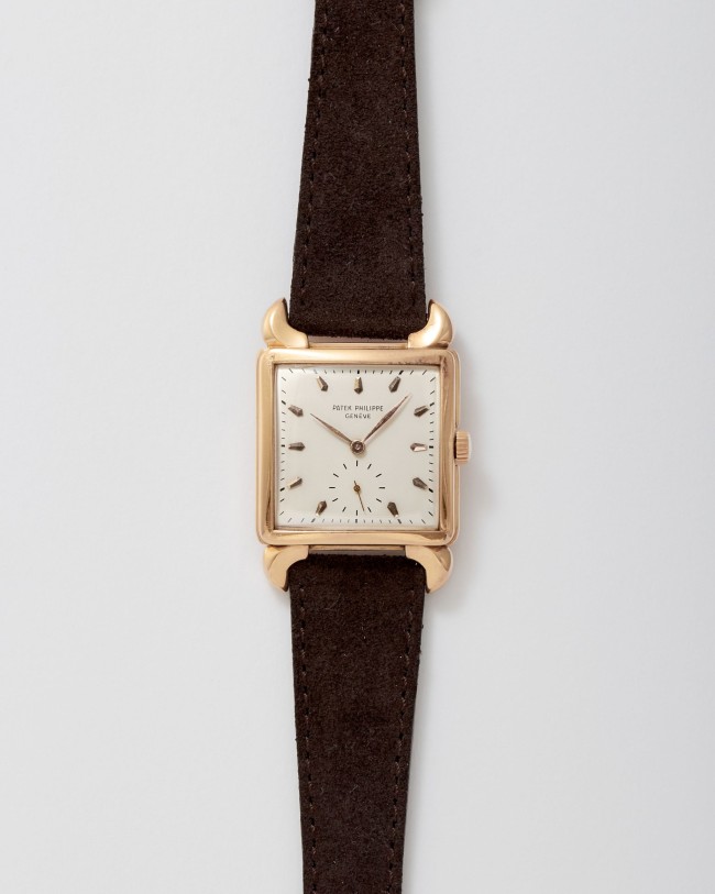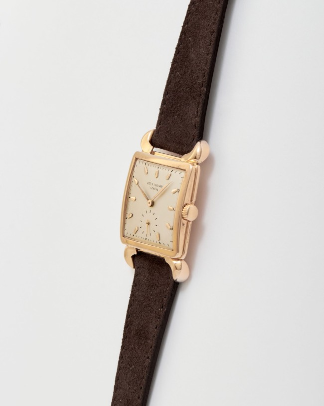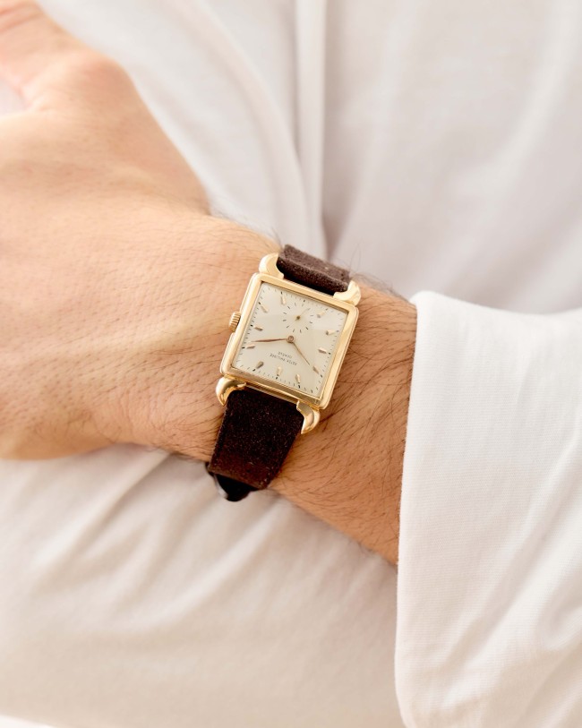 18K pink gold Patek Philippe ref. 2423. Affectionately nicknamed “Vichingo” by Italian collectors and part of the renowned “Forma” group of sculptural timepieces, this watch immediately captivates at first sight. Its case design is a true work of art — a masterful blend of bold geometry and refined elegance. The warm tones of the pink gold enhance its sculptural presence, making it a striking and distinguished piece on the wrist. The case remains in very good condition for a 1950s example, with well-defined shapes, sharp angles, and clearly visible hallmarks. The dial, likely cleaned in the past, retains its charm, with beautifully preserved enameled graphics that remain thick and crisp. Powered by a manual-winding Caliber 10 movement, this timepiece is fitted with a leather strap and comes with an Extract from the Archives that confirms its provenance. A rare opportunity for enthusiasts of distinctive mid-century design — this is a watch of strong personality, sculptural beauty, and unmistakable presence.
