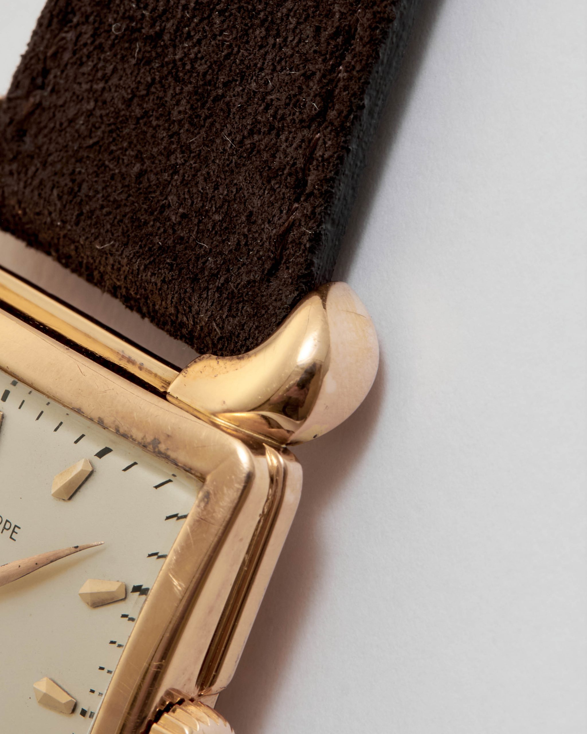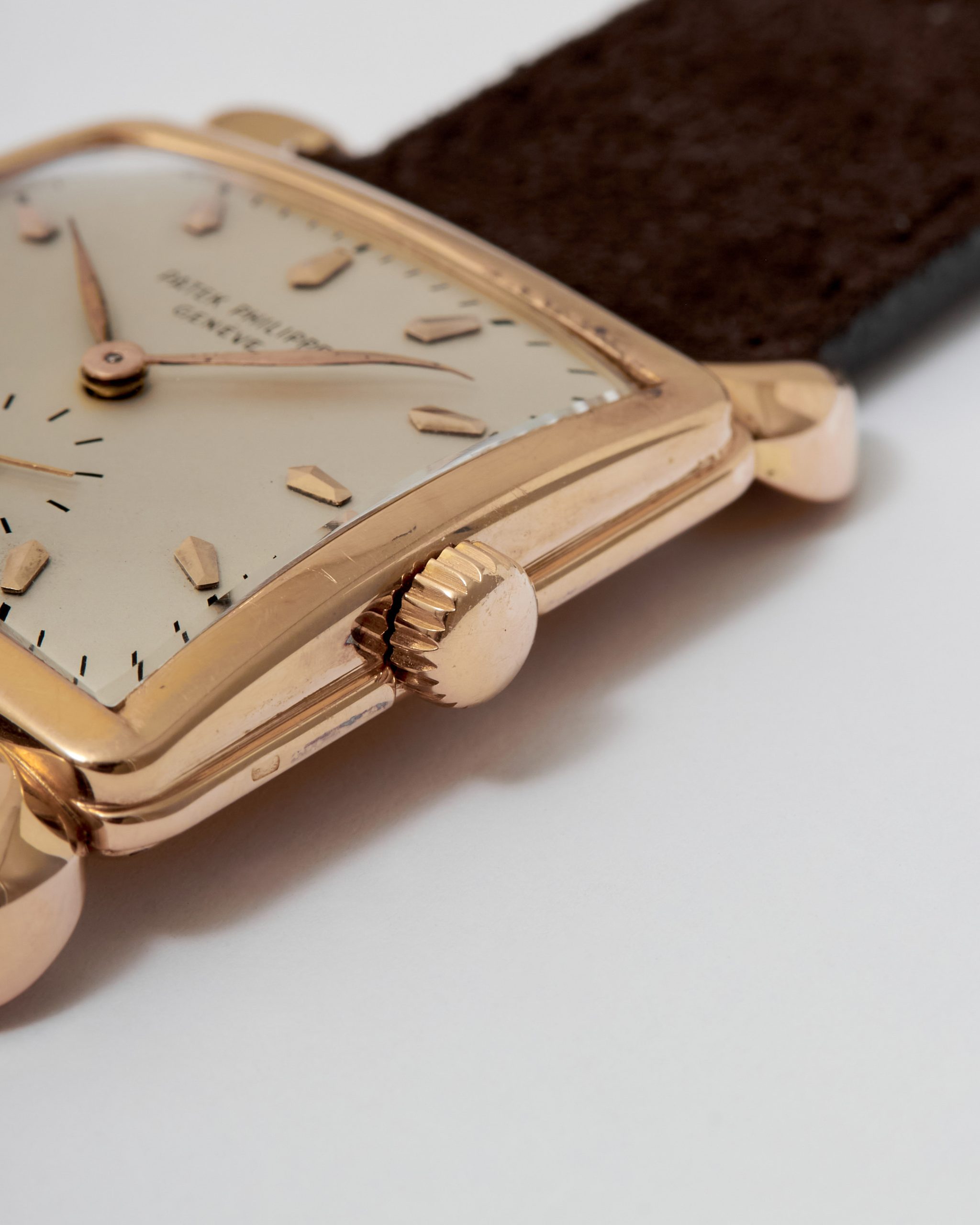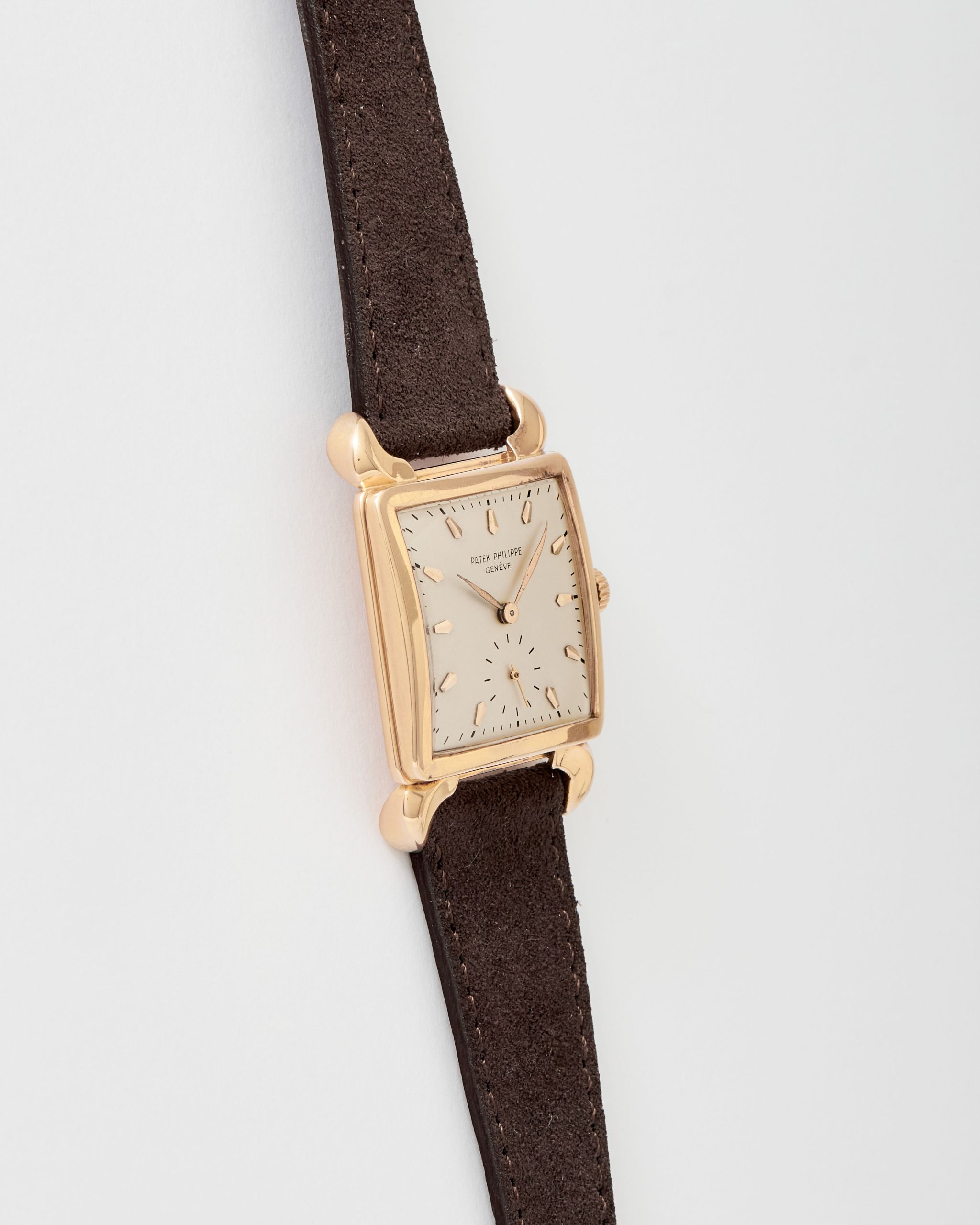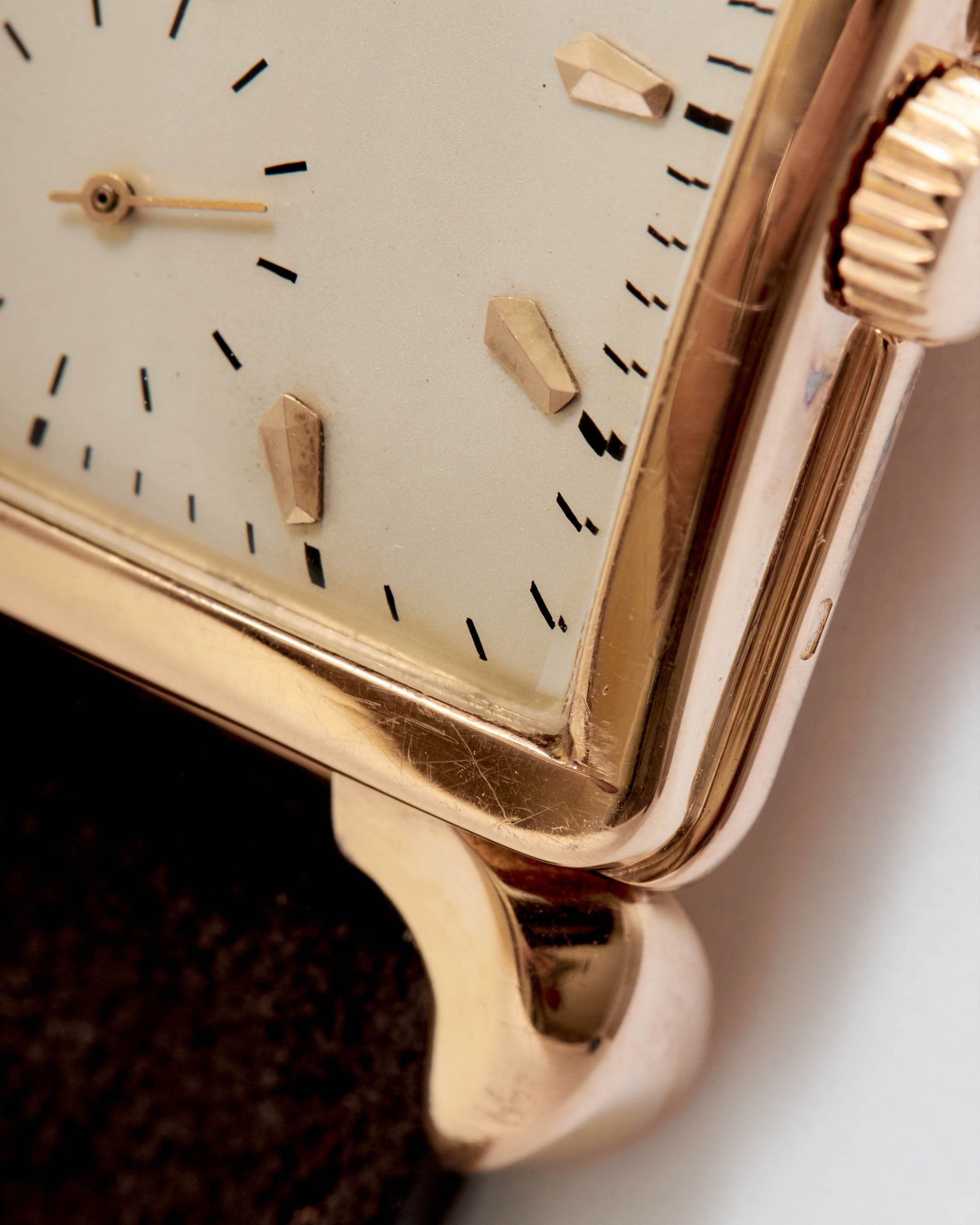 18K pink gold Patek Philippe ref. 2423. Affectionately nicknamed “Vichingo” by Italian collectors and part of the renowned “Forma” group of sculptural timepieces, this watch immediately captivates at first sight. Its case design is a true work of art — a masterful blend of bold geometry and refined elegance. The warm tones of the pink gold enhance its sculptural presence, making it a striking and distinguished piece on the wrist. The case remains in very good condition for a 1950s example, with well-defined shapes, sharp angles, and clearly visible hallmarks. The dial, likely cleaned in the past, retains its charm, with beautifully preserved enameled graphics that remain thick and crisp. Powered by a manual-winding Caliber 10 movement, this timepiece is fitted with a leather strap and comes with an Extract from the Archives that confirms its provenance. A rare opportunity for enthusiasts of distinctive mid-century design — this is a watch of strong personality, sculptural beauty, and unmistakable presence.