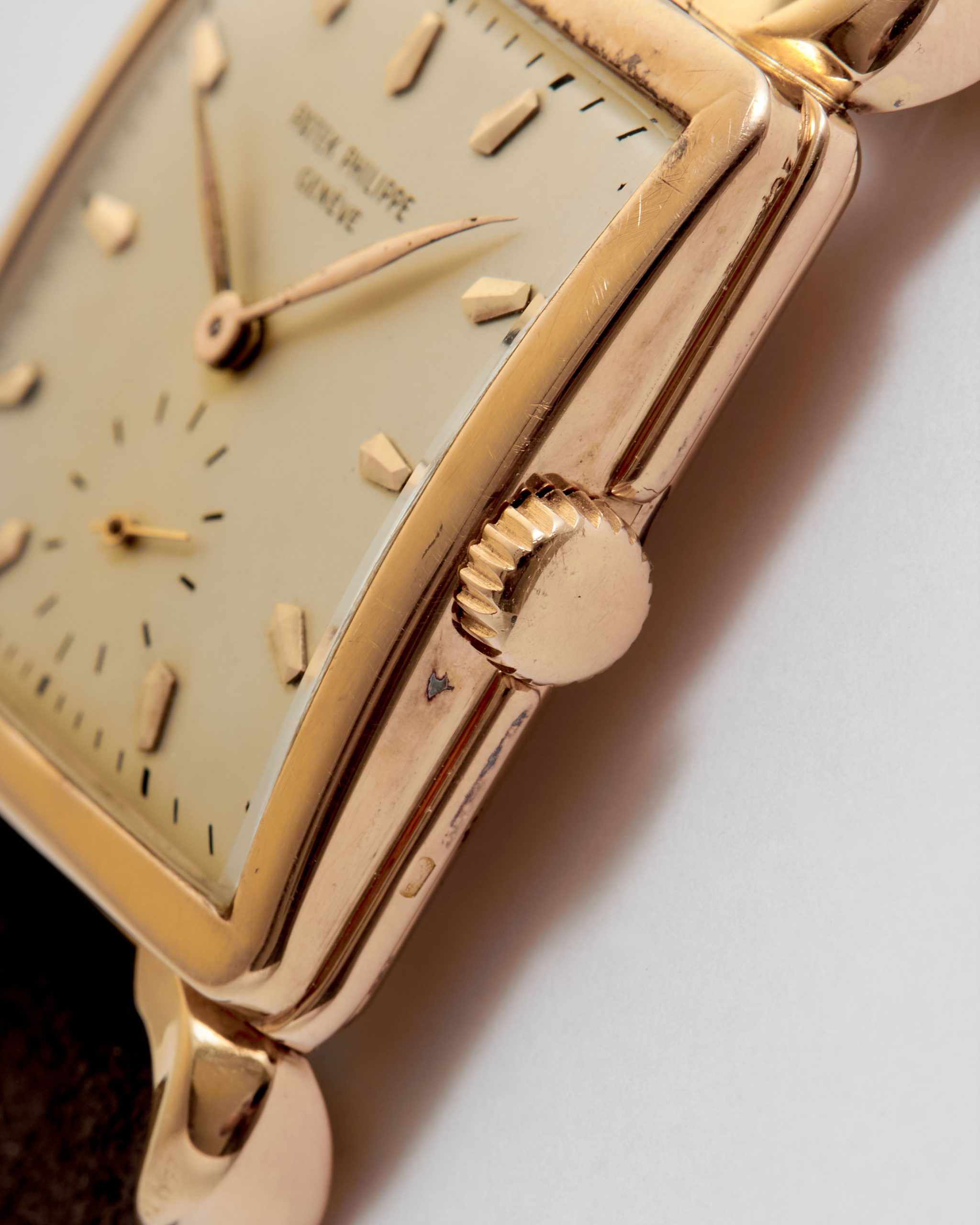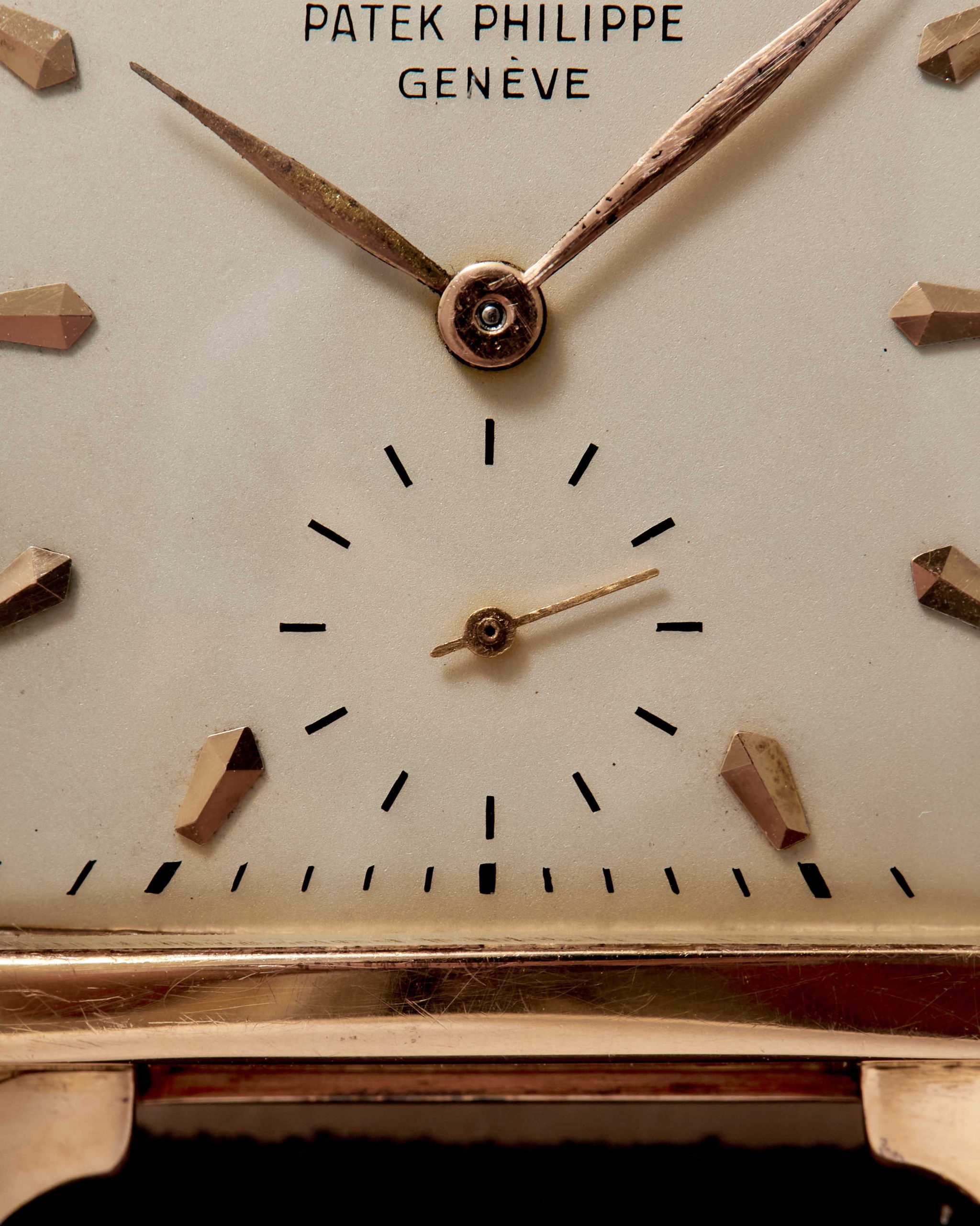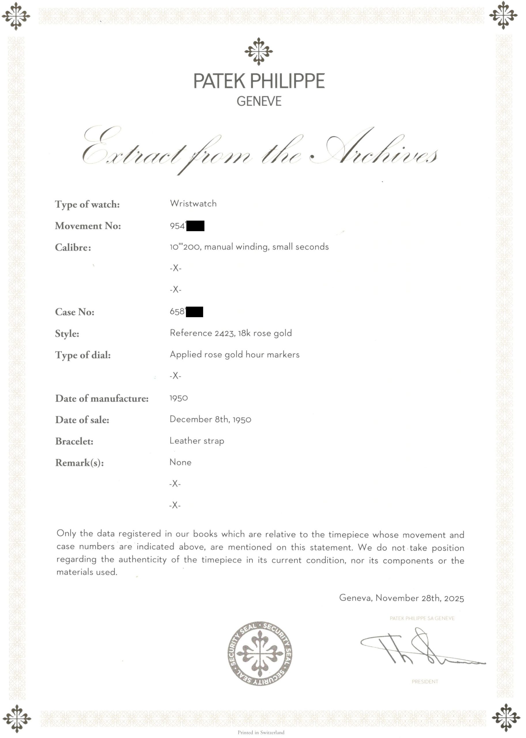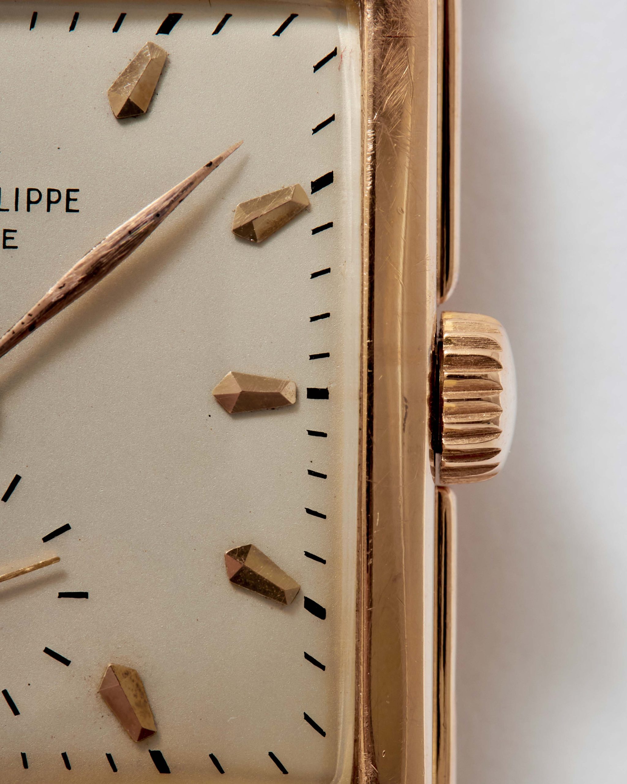 18K pink gold Patek Philippe ref. 2423. Affectionately nicknamed “Vichingo” by Italian collectors and part of the renowned “Forma” group of sculptural timepieces, this watch immediately captivates at first sight. Its case design is a true work of art — a masterful blend of bold geometry and refined elegance. The warm tones of the pink gold enhance its sculptural presence, making it a striking and distinguished piece on the wrist. The case remains in very good condition for a 1950s example, with well-defined shapes, sharp angles, and clearly visible hallmarks. The dial, likely cleaned in the past, retains its charm, with beautifully preserved enameled graphics that remain thick and crisp. Powered by a manual-winding Caliber 10 movement, this timepiece is fitted with a leather strap and comes with an Extract from the Archives that confirms its provenance. A rare opportunity for enthusiasts of distinctive mid-century design — this is a watch of strong personality, sculptural beauty, and unmistakable presence.