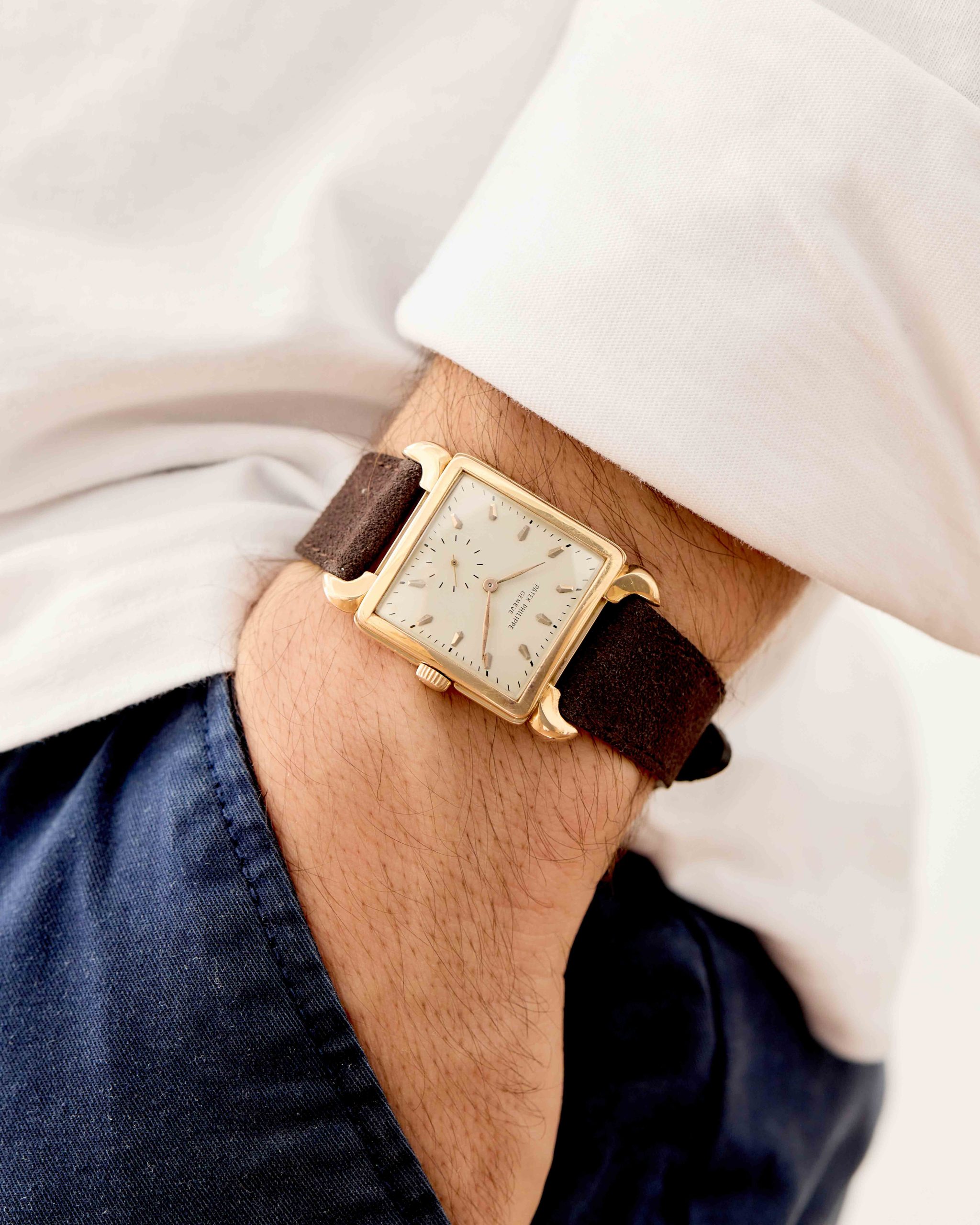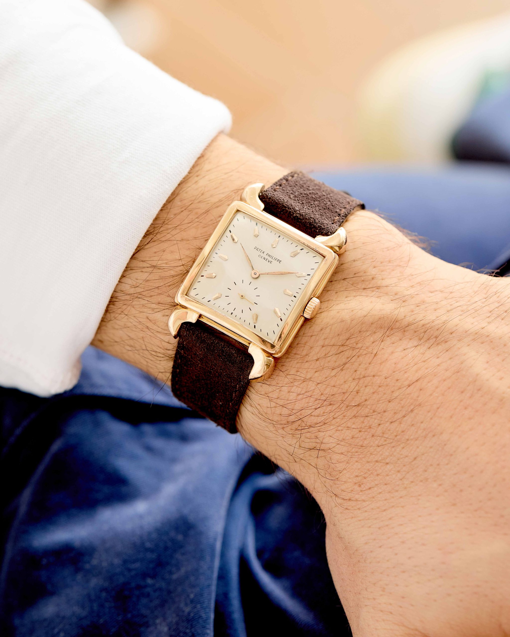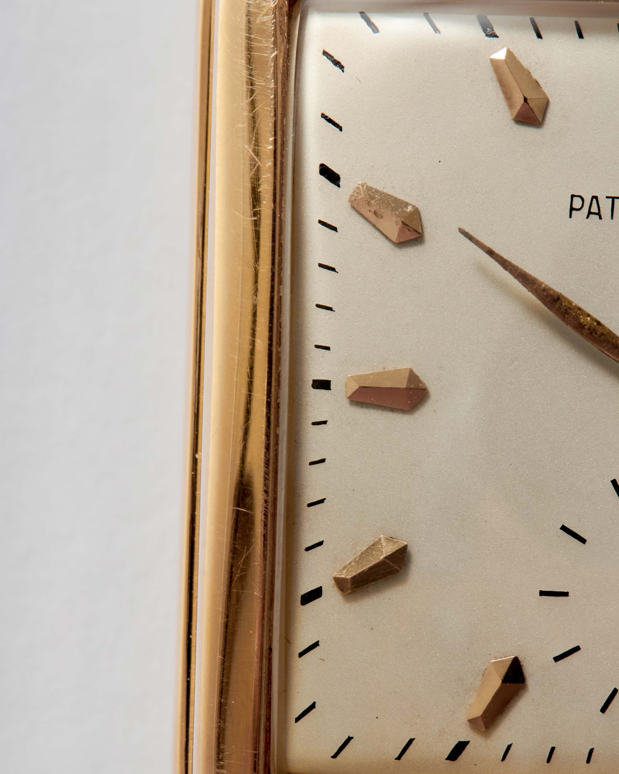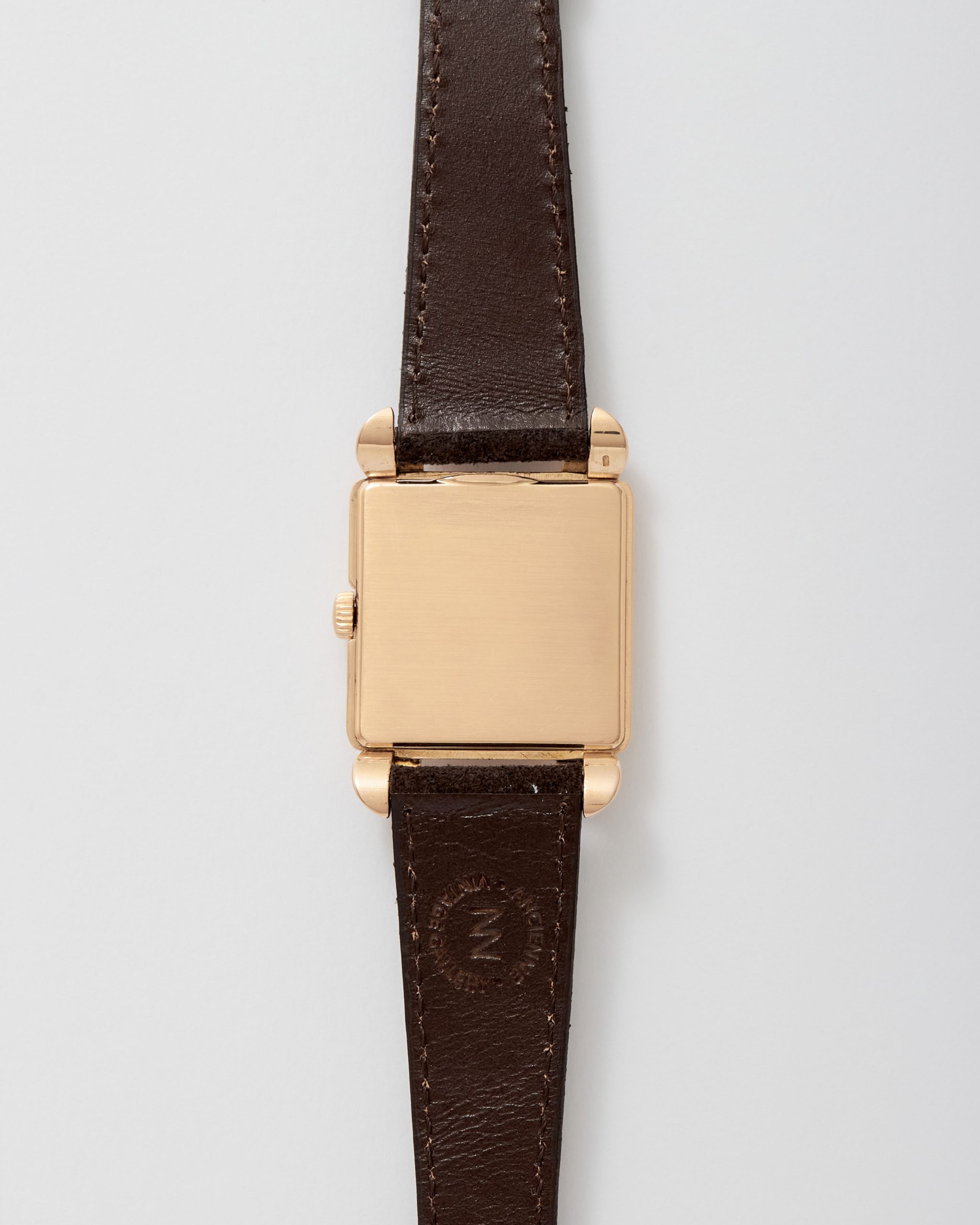 18K pink gold Patek Philippe ref. 2423. Affectionately nicknamed “Vichingo” by Italian collectors and part of the renowned “Forma” group of sculptural timepieces, this watch immediately captivates at first sight. Its case design is a true work of art — a masterful blend of bold geometry and refined elegance. The warm tones of the pink gold enhance its sculptural presence, making it a striking and distinguished piece on the wrist. The case remains in very good condition for a 1950s example, with well-defined shapes, sharp angles, and clearly visible hallmarks. The dial, likely cleaned in the past, retains its charm, with beautifully preserved enameled graphics that remain thick and crisp. Powered by a manual-winding Caliber 10 movement, this timepiece is fitted with a leather strap and comes with an Extract from the Archives that confirms its provenance. A rare opportunity for enthusiasts of distinctive mid-century design — this is a watch of strong personality, sculptural beauty, and unmistakable presence.