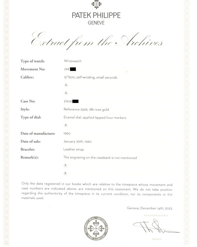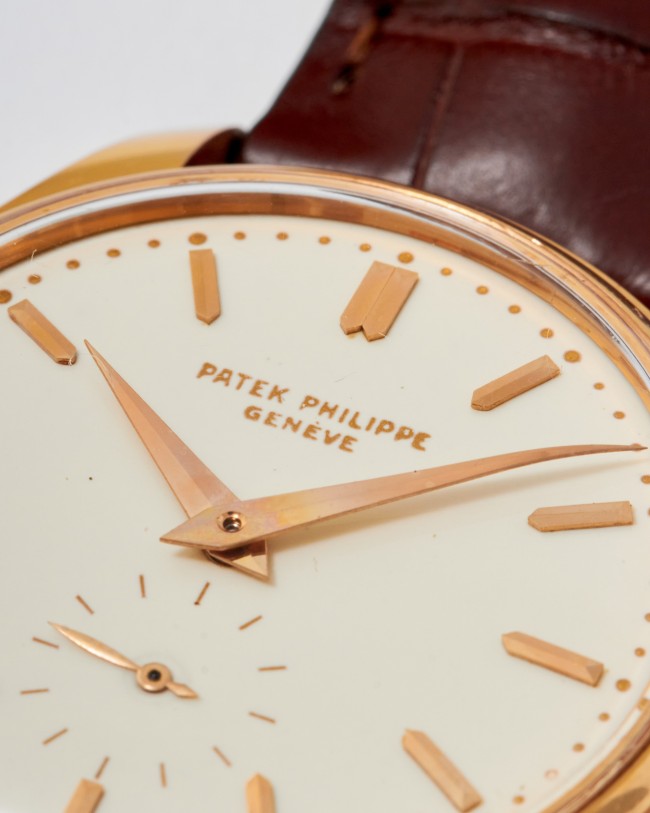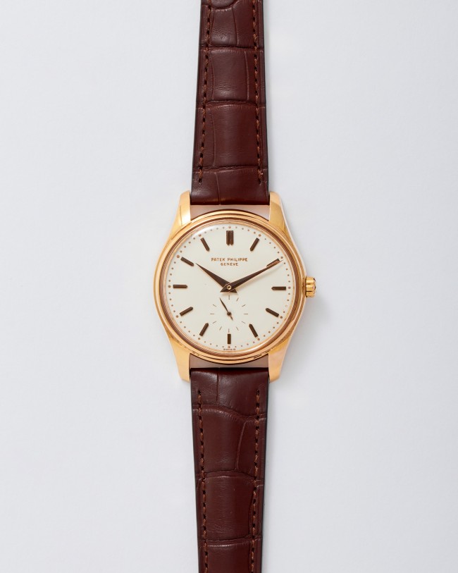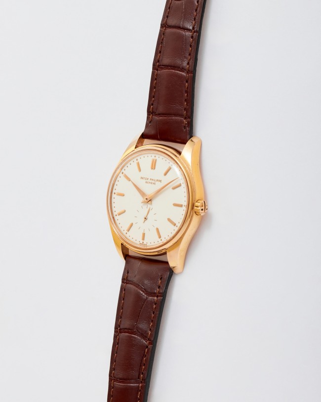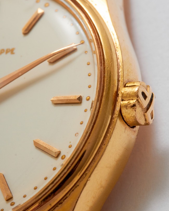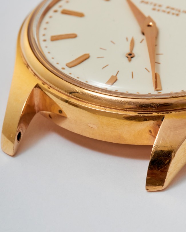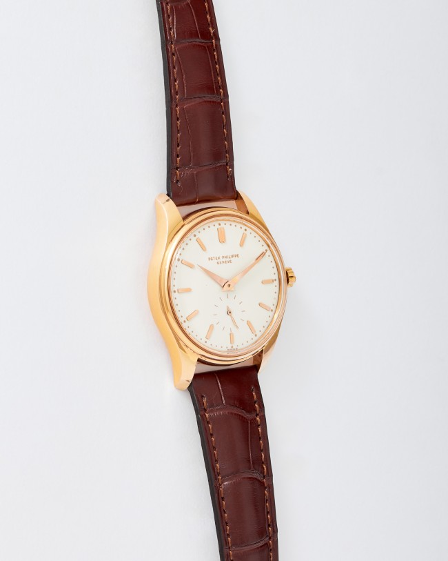 Pink gold Patek Philippe Calatrava from 1960. The ref. 2526 was Patek Philippe's first self-winding wristwatch. This specific watch is in remarkable condition, particularly noteworthy for a piece from 1960. The unpolished case and immaculate porcelain dial make this an exceptionally desirable example for collectors. Powered by self-winding movement Cal 12-600, comes with alligator leather strap, 18K gold buckle and extract from the archives. The extract from the archives indicates that a personal engraving was originally present on the case back and that has been later removed. The pristine state, combined with the rarity of the pink gold case and the historical significance of the model, positions this timepiece as a premier collectible for discerning enthusiasts of fine horology.