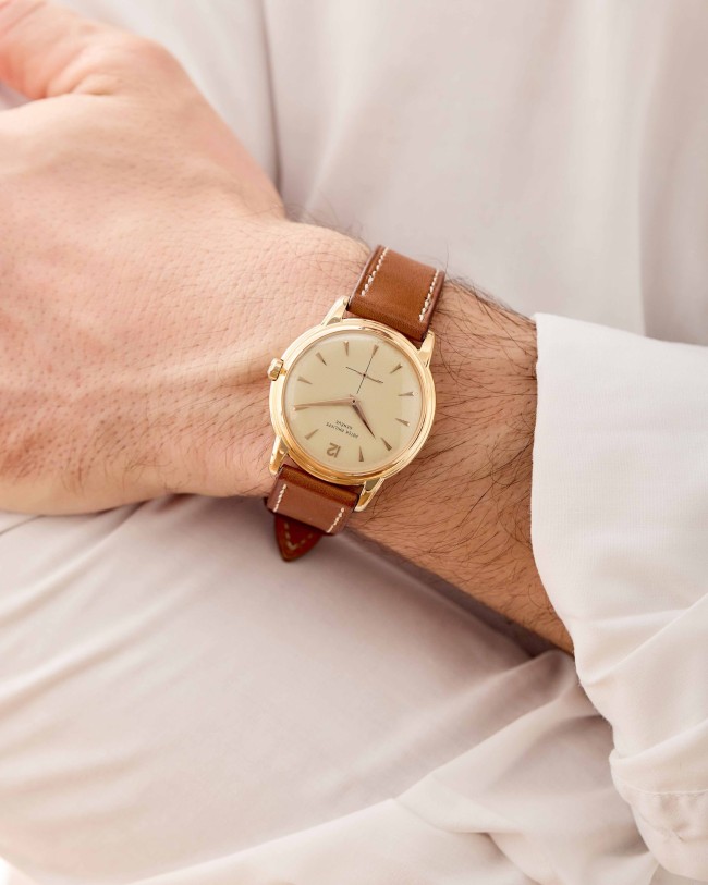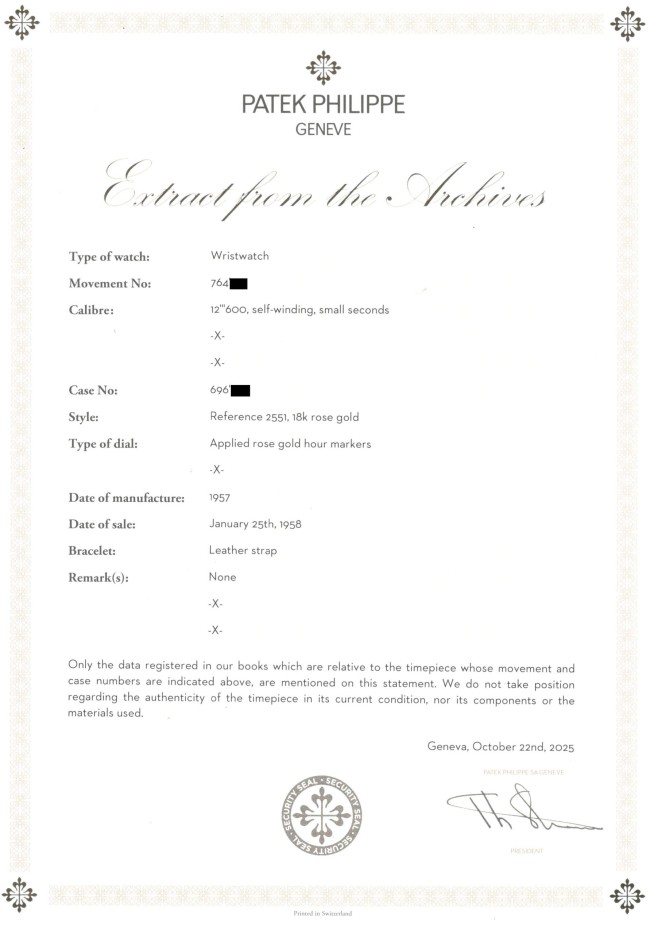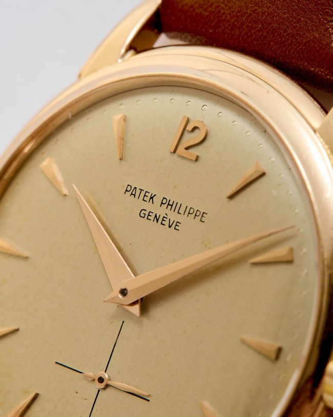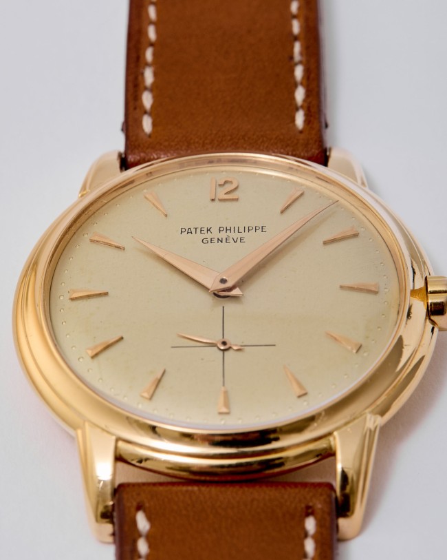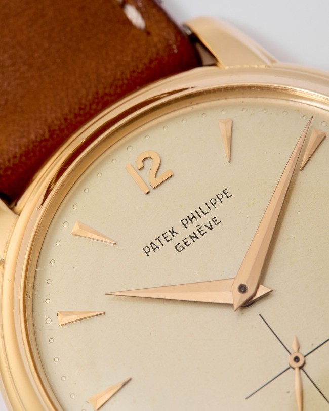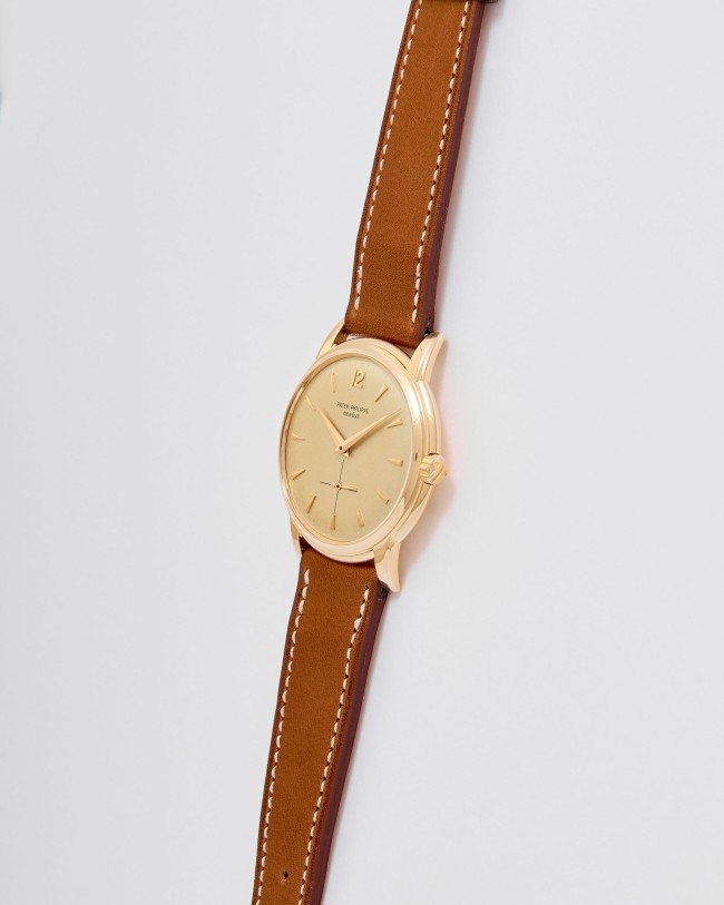 18K pink gold Patek Philippe Calatrava ref. 2551 “Disco Volante”. An attractive example of the sought-after self-winding Patek Philippe Calatrava reference 2551 from 1957. Featuring the desirable 36 mm pink-gold case, the iconic double-P winding crown, and an original dial aged with a wonderfully warm patina, this piece has all the ingredients of a true mid-century treasure. Although worn and polished over the decades, the case remains in good overall condition, retaining its original shape and presence. The dial is particularly charming: its even patina harmonizes beautifully with the pink-gold hour markers and dauphine hands, while the crisp enamel printing remains fully original and exceptionally well preserved. Powered by the legendary self-winding calibre 12-600 AT—one of Patek Philippe’s most celebrated automatic movements—this reference pairs technical pedigree with timeless refinement. Offered on a leather strap, it is accompanied by its Patek Philippe Extract from the Archives confirming production in 1957. Exceptionally elegant and full of character, this ref. 2551 radiates vintage charm and classical design—a piece that will thrill any discerning collector the moment it’s on the wrist.