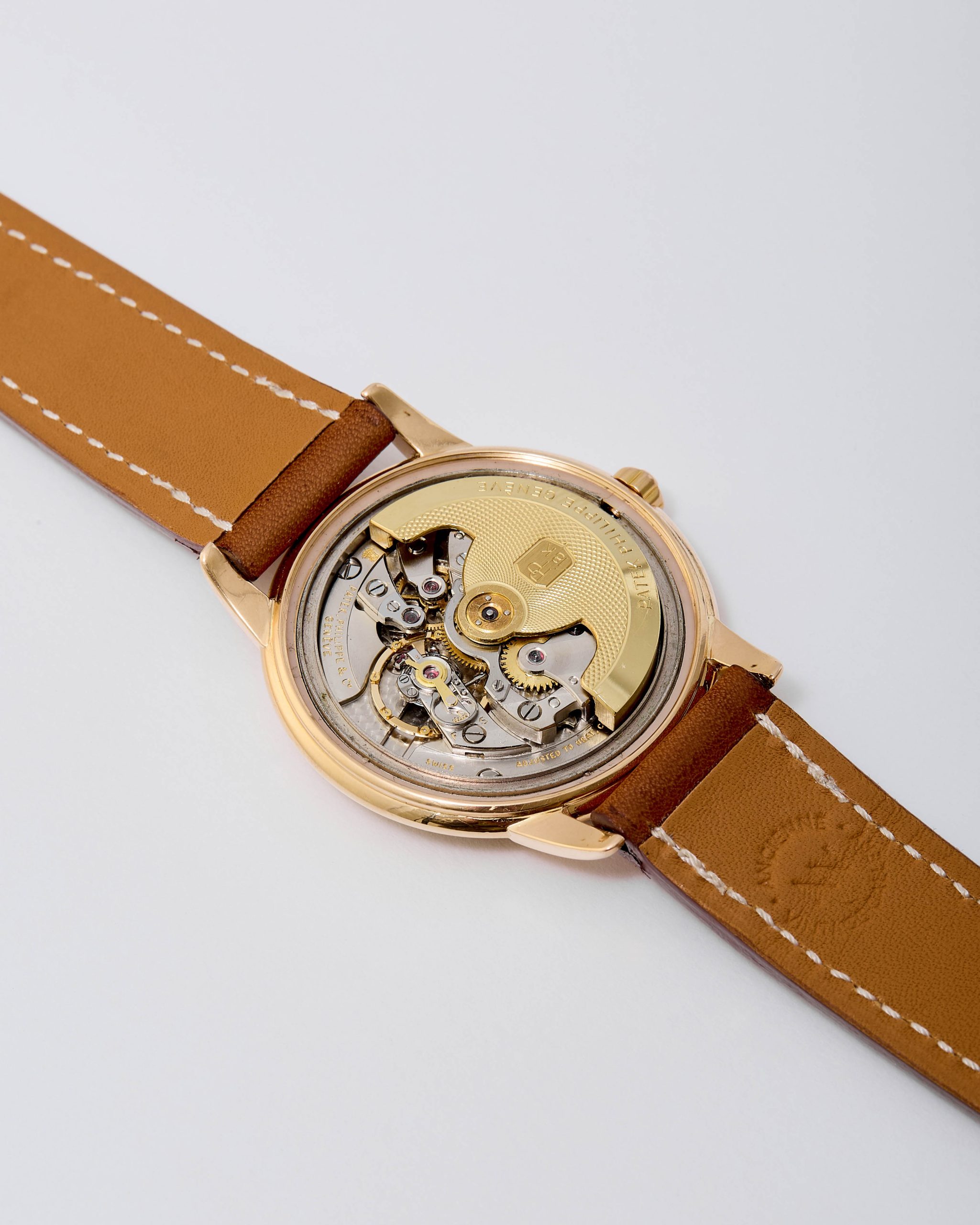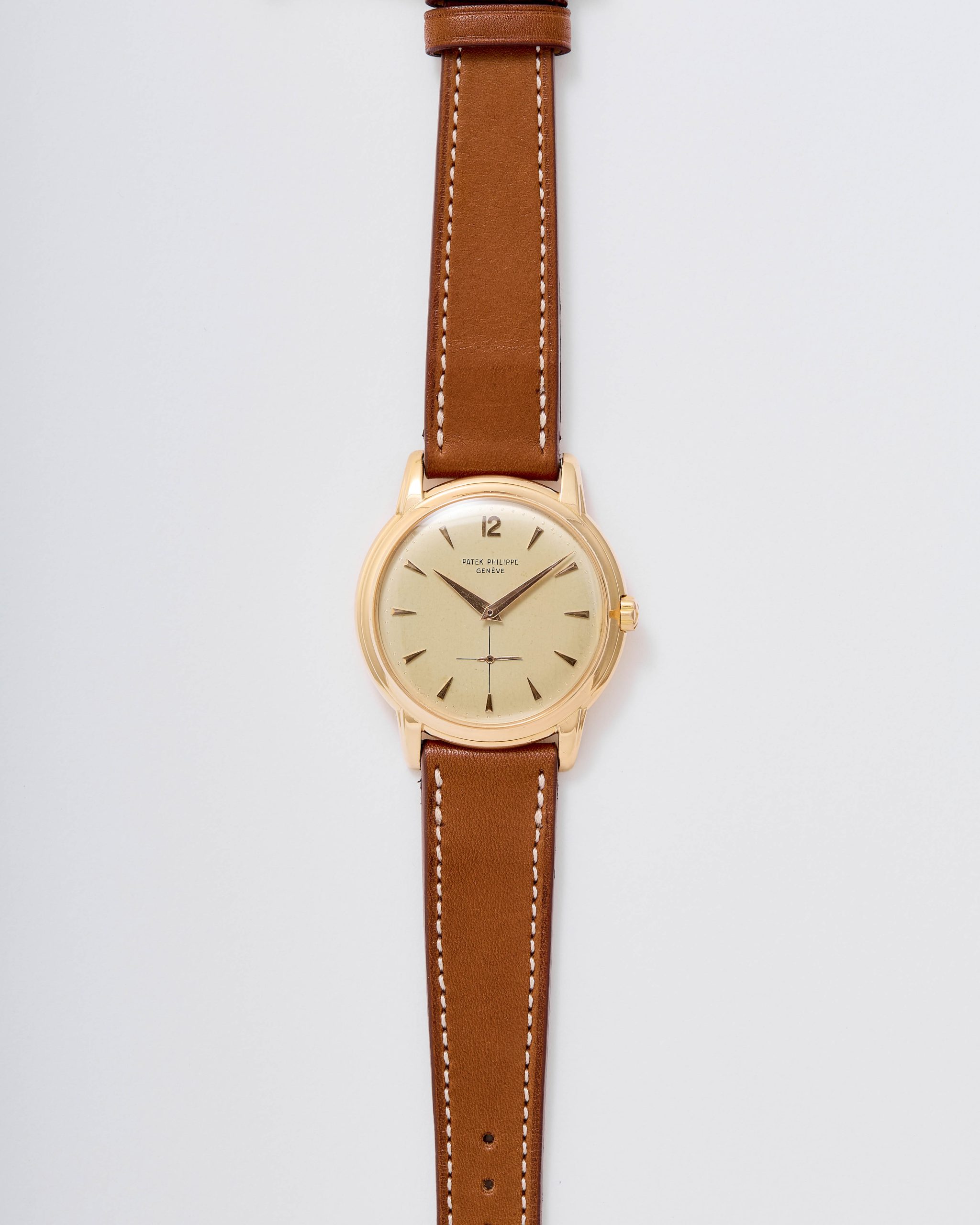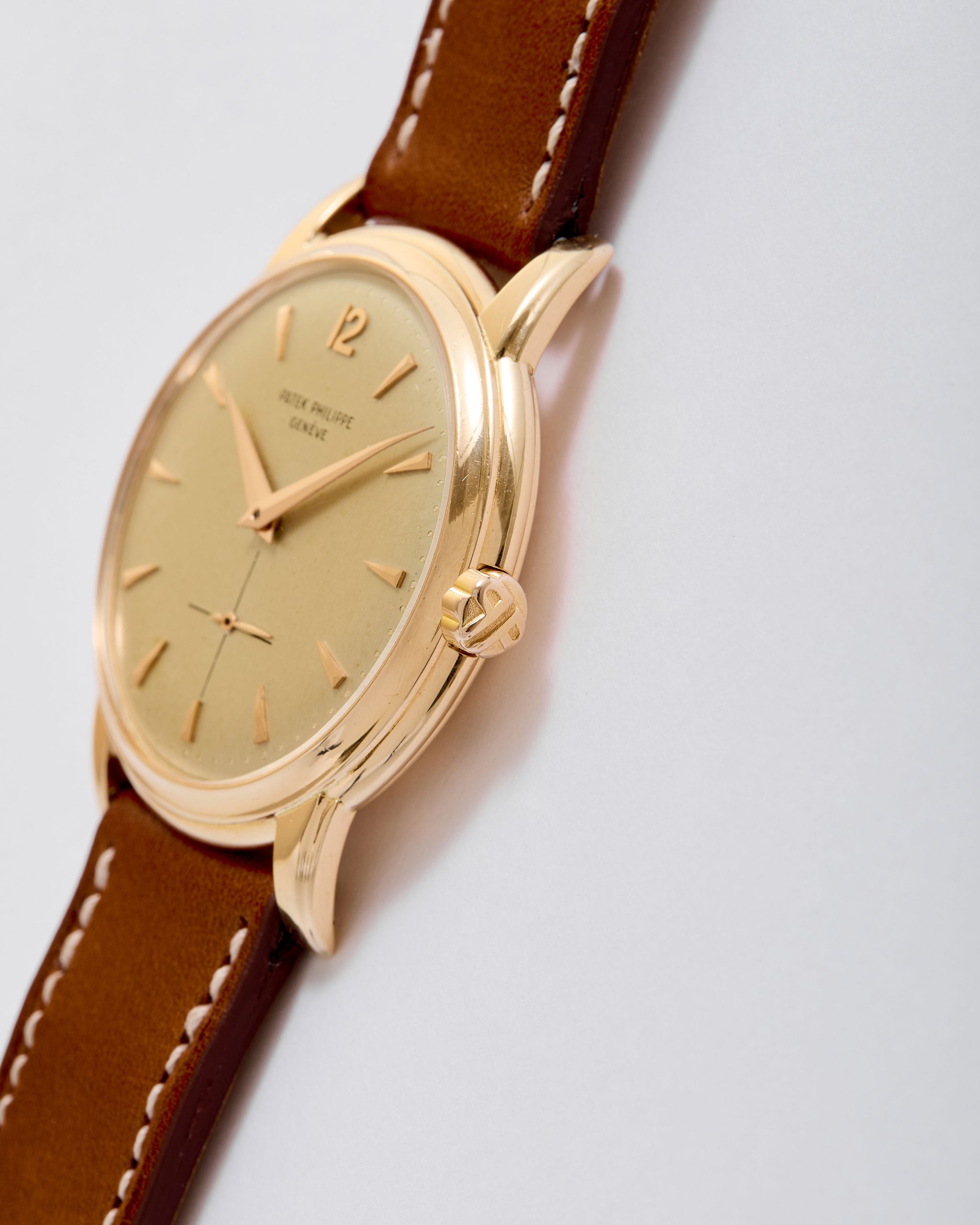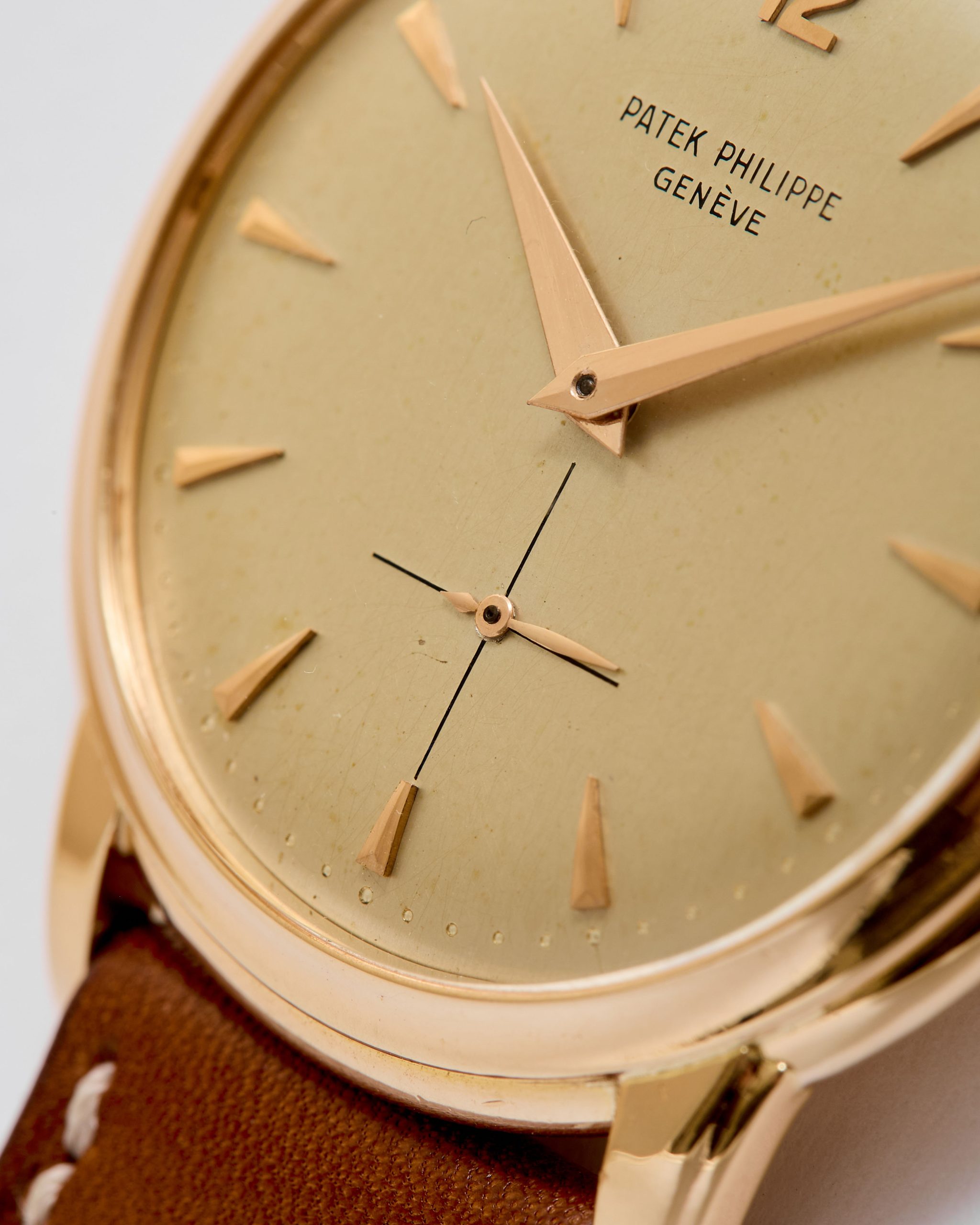 18K pink gold Patek Philippe Calatrava ref. 2551 “Disco Volante”. An attractive example of the sought-after self-winding Patek Philippe Calatrava reference 2551 from 1957. Featuring the desirable 36 mm pink-gold case, the iconic double-P winding crown, and an original dial aged with a wonderfully warm patina, this piece has all the ingredients of a true mid-century treasure. Although worn and polished over the decades, the case remains in good overall condition, retaining its original shape and presence. The dial is particularly charming: its even patina harmonizes beautifully with the pink-gold hour markers and dauphine hands, while the crisp enamel printing remains fully original and exceptionally well preserved. Powered by the legendary self-winding calibre 12-600 AT—one of Patek Philippe’s most celebrated automatic movements—this reference pairs technical pedigree with timeless refinement. Offered on a leather strap, it is accompanied by its Patek Philippe Extract from the Archives confirming production in 1957. Exceptionally elegant and full of character, this ref. 2551 radiates vintage charm and classical design—a piece that will thrill any discerning collector the moment it’s on the wrist.