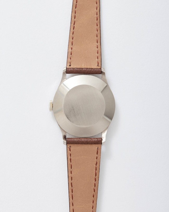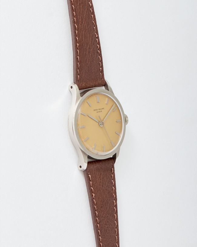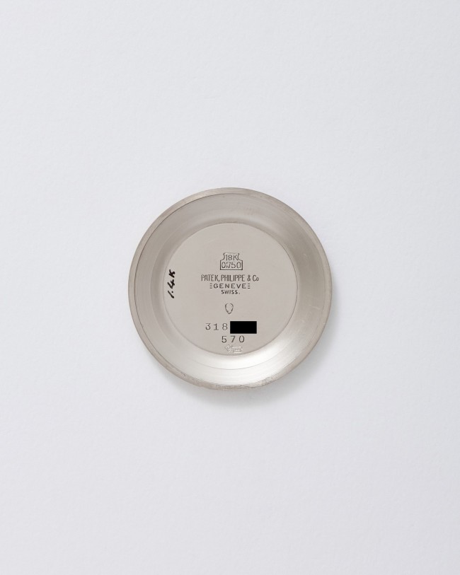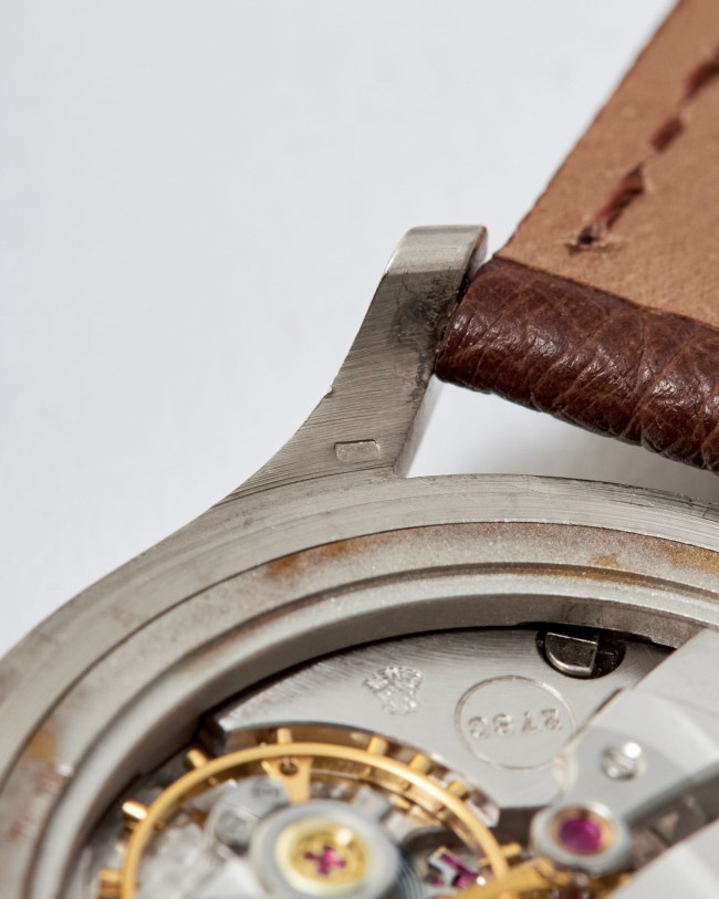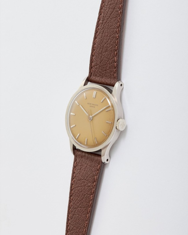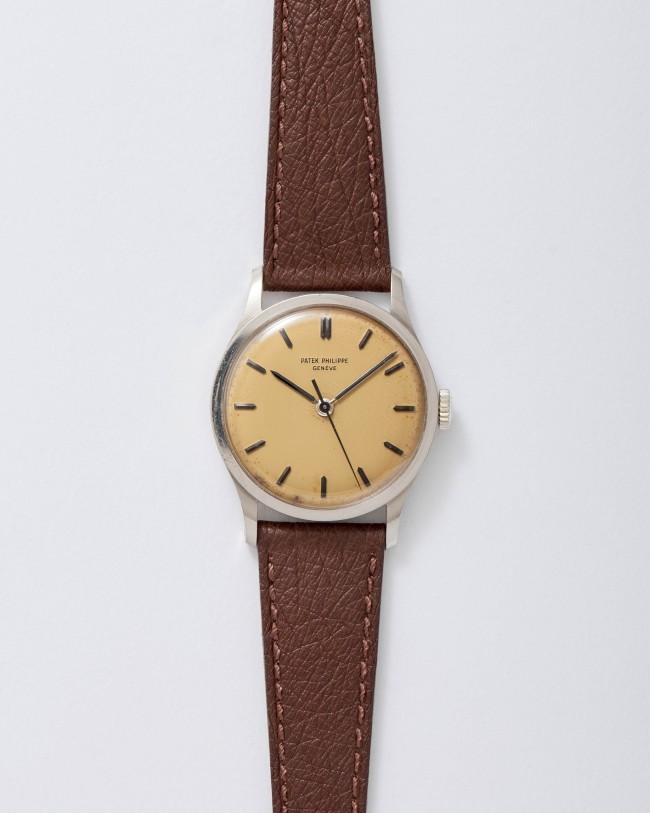 18K white gold Patek Philippe “Calatrava” ref. 570. This exceptional Ref. 570 is a second-series example, distinguished by the rarer “Baton hands” and sweep seconds configuration. A true collector’s piece, the watch is in outstanding condition, featuring a thick and sharply defined case that retains its original contours. The dial is equally remarkable, showcasing hand-crafted pearl hour markers and a stunning honey-colored patina that enhances its vintage appeal. While minor oxidation is visible around the outer markers, it only adds to the watch’s character and charm. Powered by the manual-winding Caliber 25SC, this timepiece combines mechanical excellence with timeless elegance. Accompanied by a Patek Philippe Extract from the Archives, confirming its manufacture in 1964, this is an extraordinary addition to any serious collection.