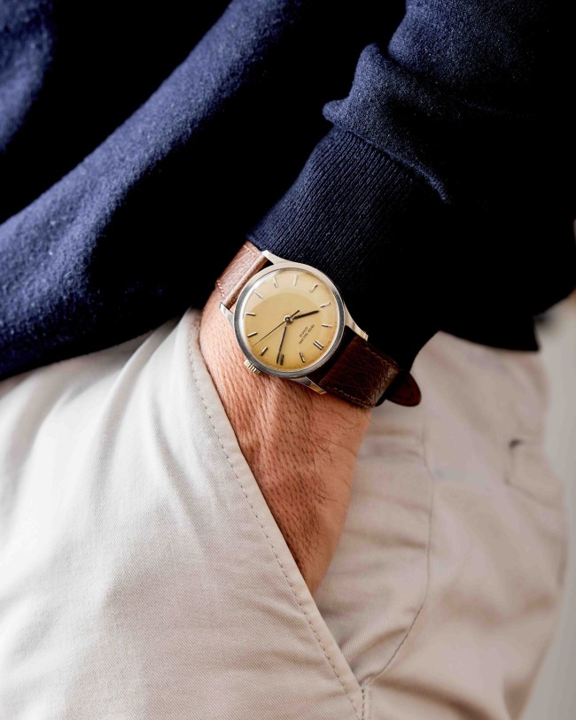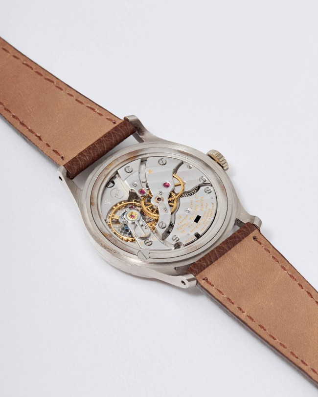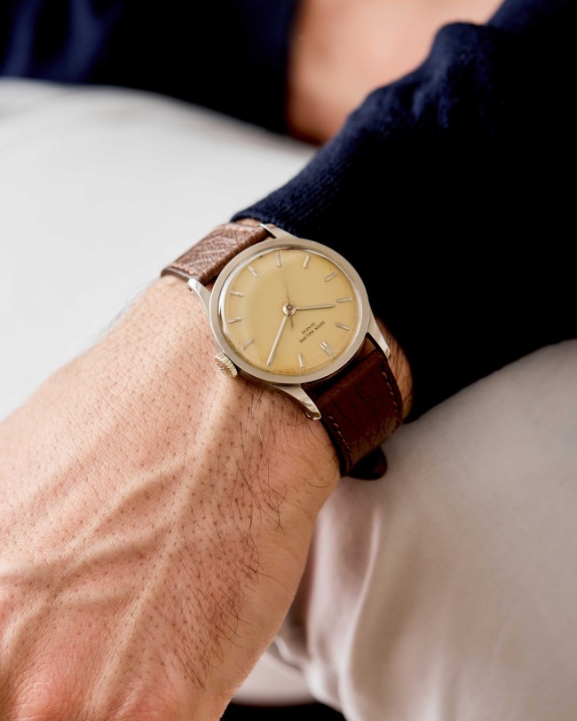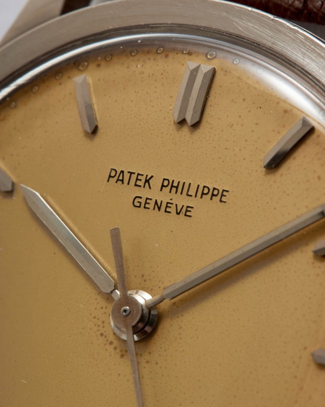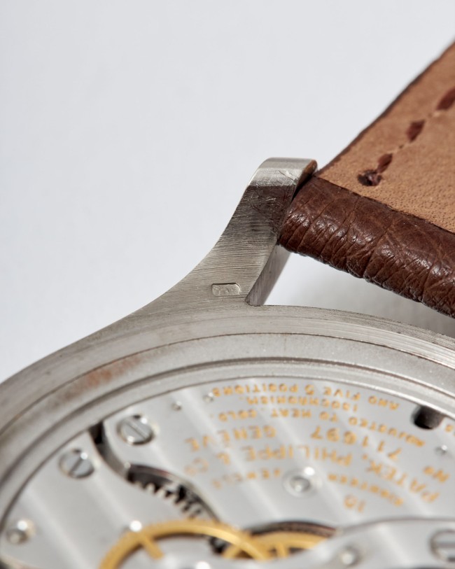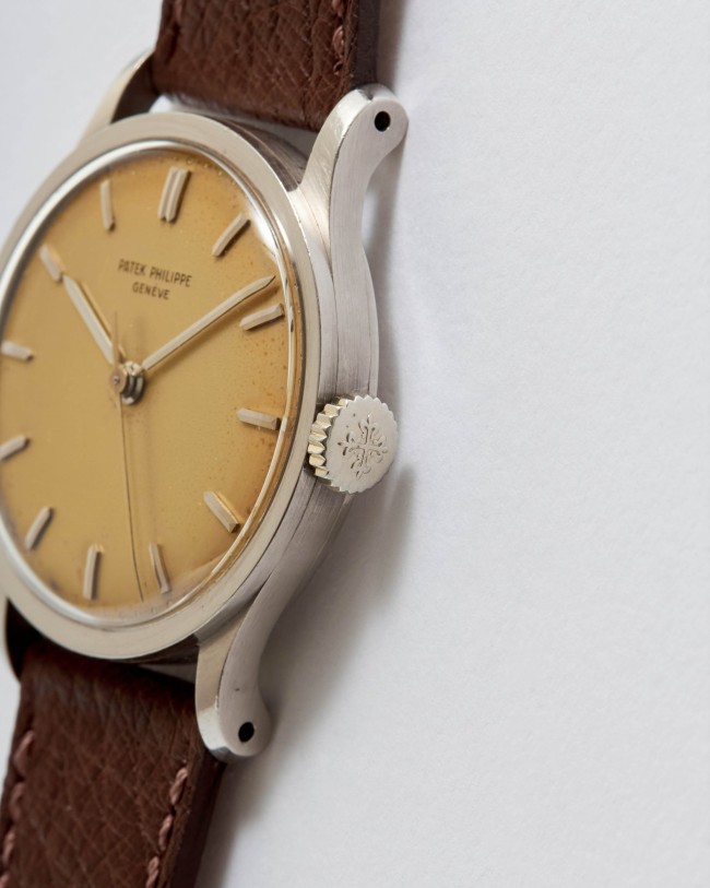 18K white gold Patek Philippe “Calatrava” ref. 570. This exceptional Ref. 570 is a second-series example, distinguished by the rarer “Baton hands” and sweep seconds configuration. A true collector’s piece, the watch is in outstanding condition, featuring a thick and sharply defined case that retains its original contours. The dial is equally remarkable, showcasing hand-crafted pearl hour markers and a stunning honey-colored patina that enhances its vintage appeal. While minor oxidation is visible around the outer markers, it only adds to the watch’s character and charm. Powered by the manual-winding Caliber 25SC, this timepiece combines mechanical excellence with timeless elegance. Accompanied by a Patek Philippe Extract from the Archives, confirming its manufacture in 1964, this is an extraordinary addition to any serious collection.