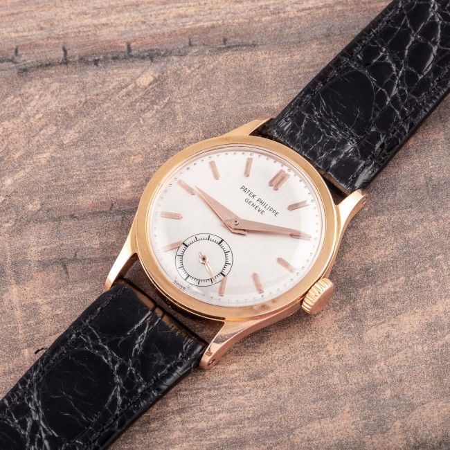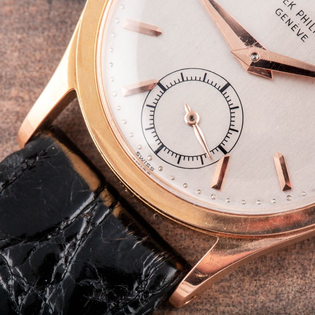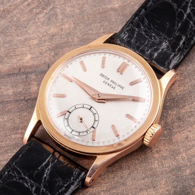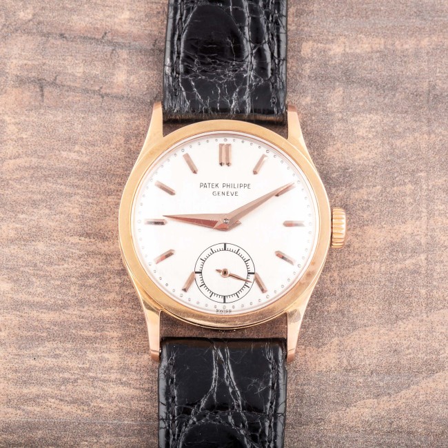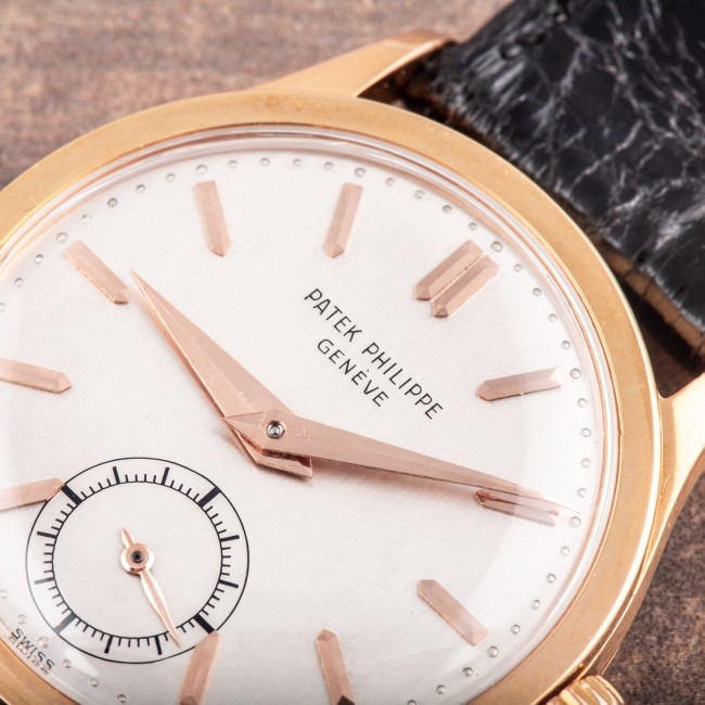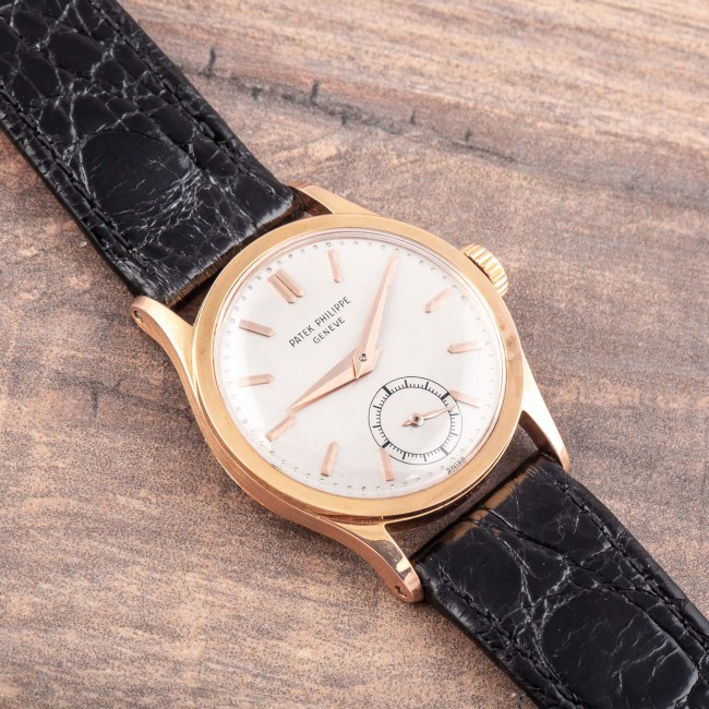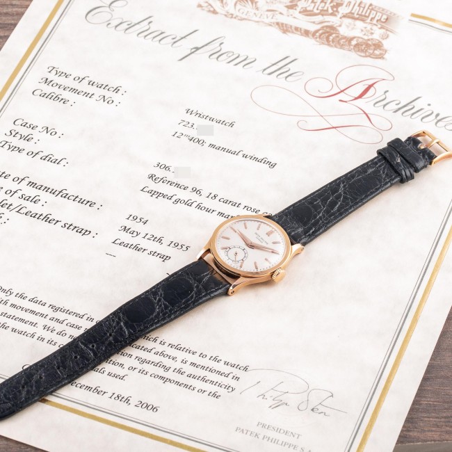 PATEK PHILIPPE CALATRAVA REF. 96 PINK GOLD The Patek Philippe Calatrava reference 96 is one of the most iconic and timeless watches ever created. It quickly became a favorite among collectors and enthusiasts due to its clean, minimalist design and exceptional craftsmanship. Its elegant simplicity and understated style have made it a favorite among collectors for decades, and its legacy continues to inspire new generations of watch enthusiasts today. The Calatrava reference 96 was manufactured between 1932 and 1973, and it was predominantly encased in yellow gold, although stainless steel, pink gold, white gold, and platinum were also used, albeit less frequently. While the case remained 31mm, over the years, the Calatrava reference 96 has undergone several updates and variations, including changes to the dial design, and movement. The present watch represents the epitome of classic design featuring a subsidiary seconds dial positioned at 6 o'clock. This particular Patek Philippe reference 96 is an exceptional timepiece, made even rarer by its pink gold case. While the majority of Patek Philippe reference 96 watches were encased in yellow gold, only a few were produced with a pink gold case. The watch is in excellent overall condition, with the case retaining its original factory shape, including sharp lugs and well-defined gold hallmarks both on lugs and caseback. The flawless dial shows no signs of aging, and the hand-wound 12”400 caliber movement is in perfect working order. Accompanying the watch is a Patek Philippe extract from the archives, which confirms its production in 1954 and delivery in 1955. Serial Number 306,XXX , Movement Number 723,XXX , Year 1955, Diameter 31mm.