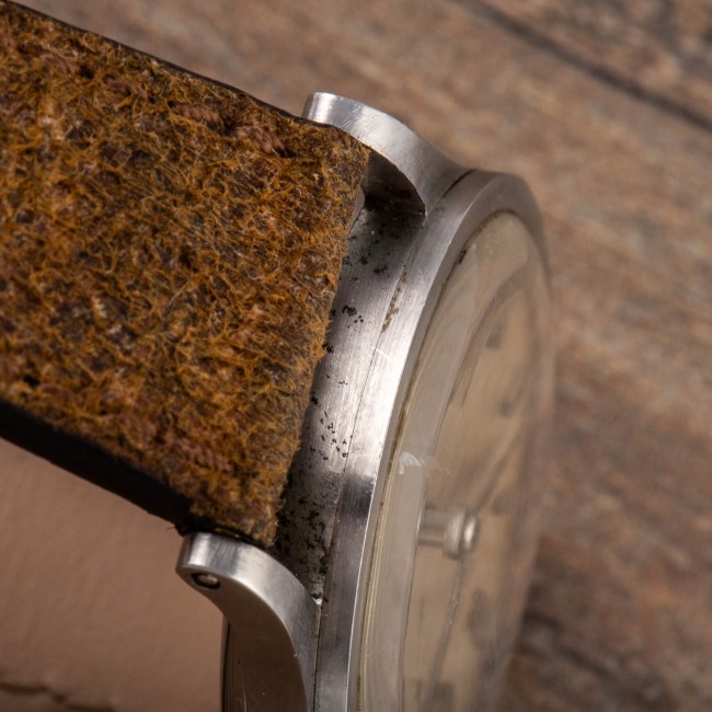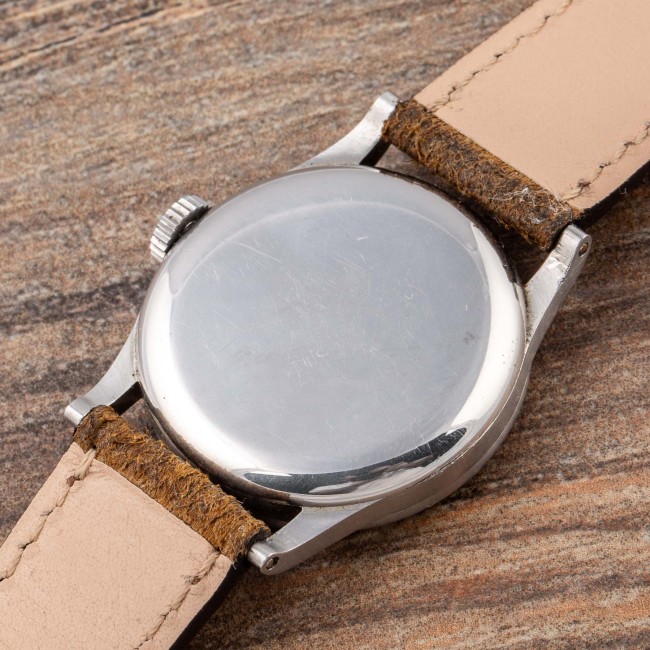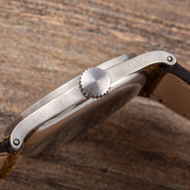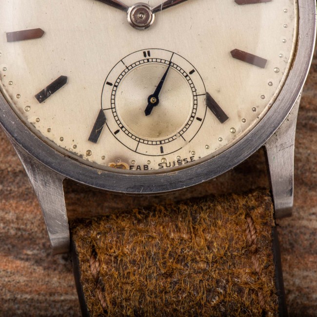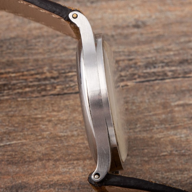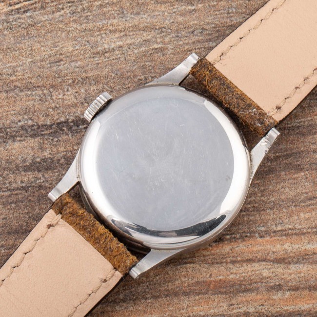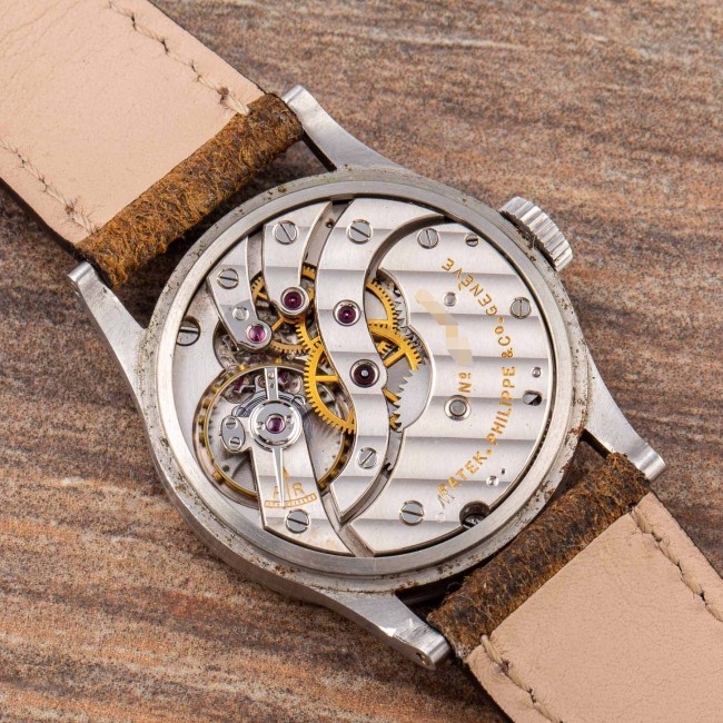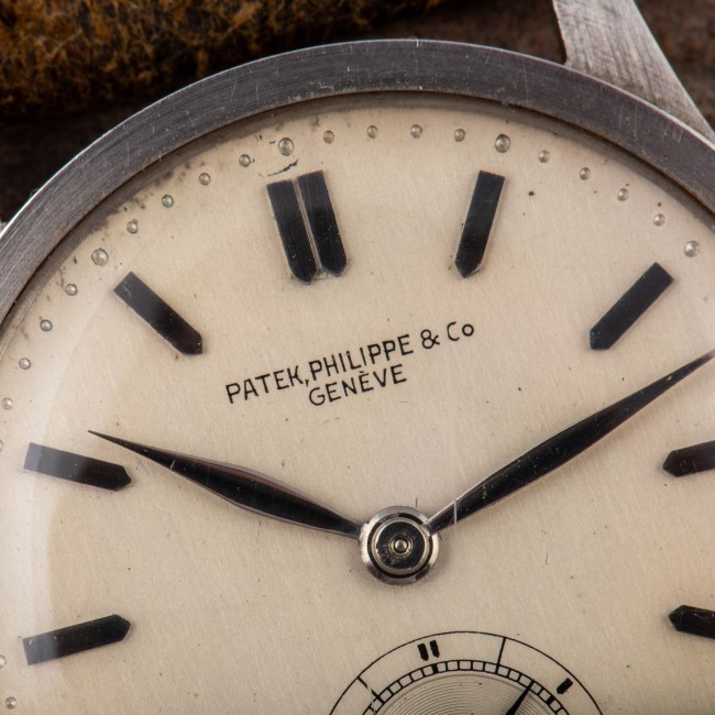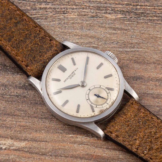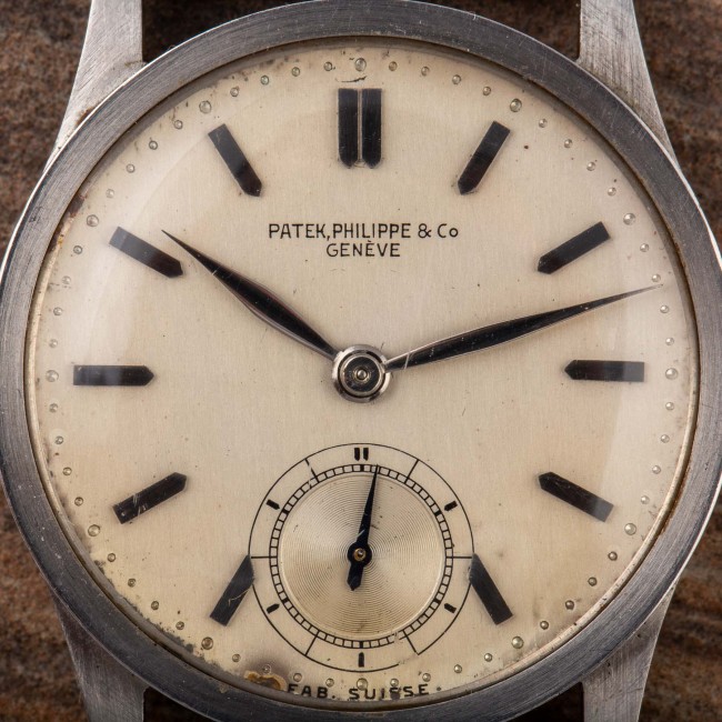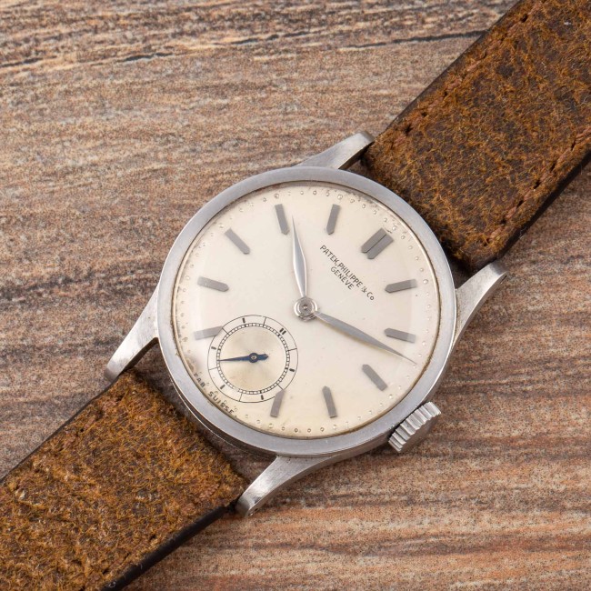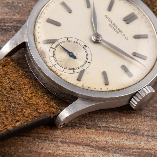 PATEK PHILIPPE CALATRAVA REF. 96 STAINLESS STEEL The Patek Philippe Calatrava Reference 96 is a landmark in the history of wristwatch design. Introduced in 1932, it was one of the first creations under the Stern family's stewardship of Patek Philippe. At a modest 31mm in diameter, the Ref. 96 was small by today’s standards but perfectly proportioned for its time. Its clean lines, slim case, and elegant dial epitomized simplicity. The Ref. 96 was powered by manually wound calibers such as the 12-120 or 12-400. The watch was offered in various metals, including yellow gold, pink gold, white gold, and platinum. The dial designs varied significantly over the years, ranging from simple silver dials to more eccentric sector dials. The Ref. 96 has recently been rediscovered by many watch enthusiasts, both due to the renewed appreciation for smaller watches and for its timeless elegance and significance in Patek Philippe's history. The overall condition of this extremely rare stainless steel Patek Philippe Calatrava Reference 96 is truly exceptional. The case appears to be untouched, still retaining its original factory finishes. It remains sharp, with well-defined lugs and a pristine, untouched flat bezel. The dial shows natural signs of aging, which is entirely expected for a watch of this age. It is most likely untouched and uncleaned, still featuring details such as the accent on "Genève" and the comma between "Patek" and "Philippe"—characteristics that often disappear after dial restoration or cleaning. The caliber is functioning perfectly without any issues. All components are correct for the year of manufacture, including the rare "Fab. Suisse" signed dial, as confirmed by the Extract from the Archives. The strap is not original Patek Philippe and the buckle is in white gold and period correct for the watch. The watch is accompanied by a Patek Philippe extract from the archives stating as date of manufacture 1934 and date of sale 1936. Year 1936, Serial Number, 611,XXX, Diameter 31mm