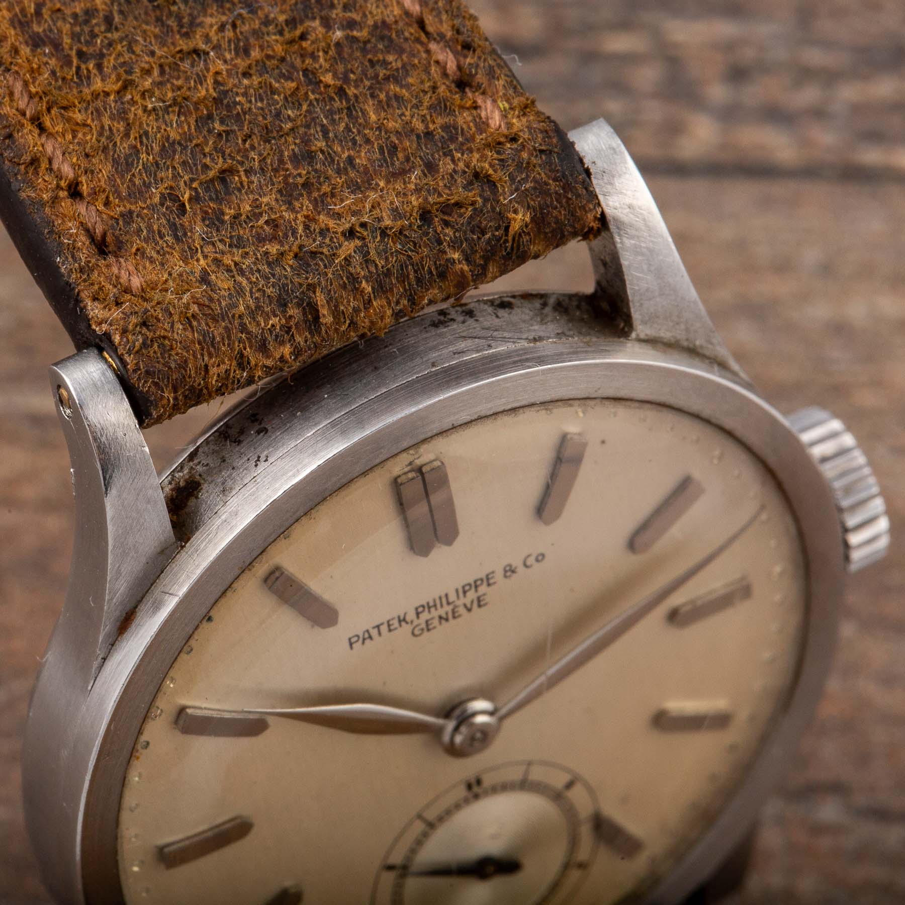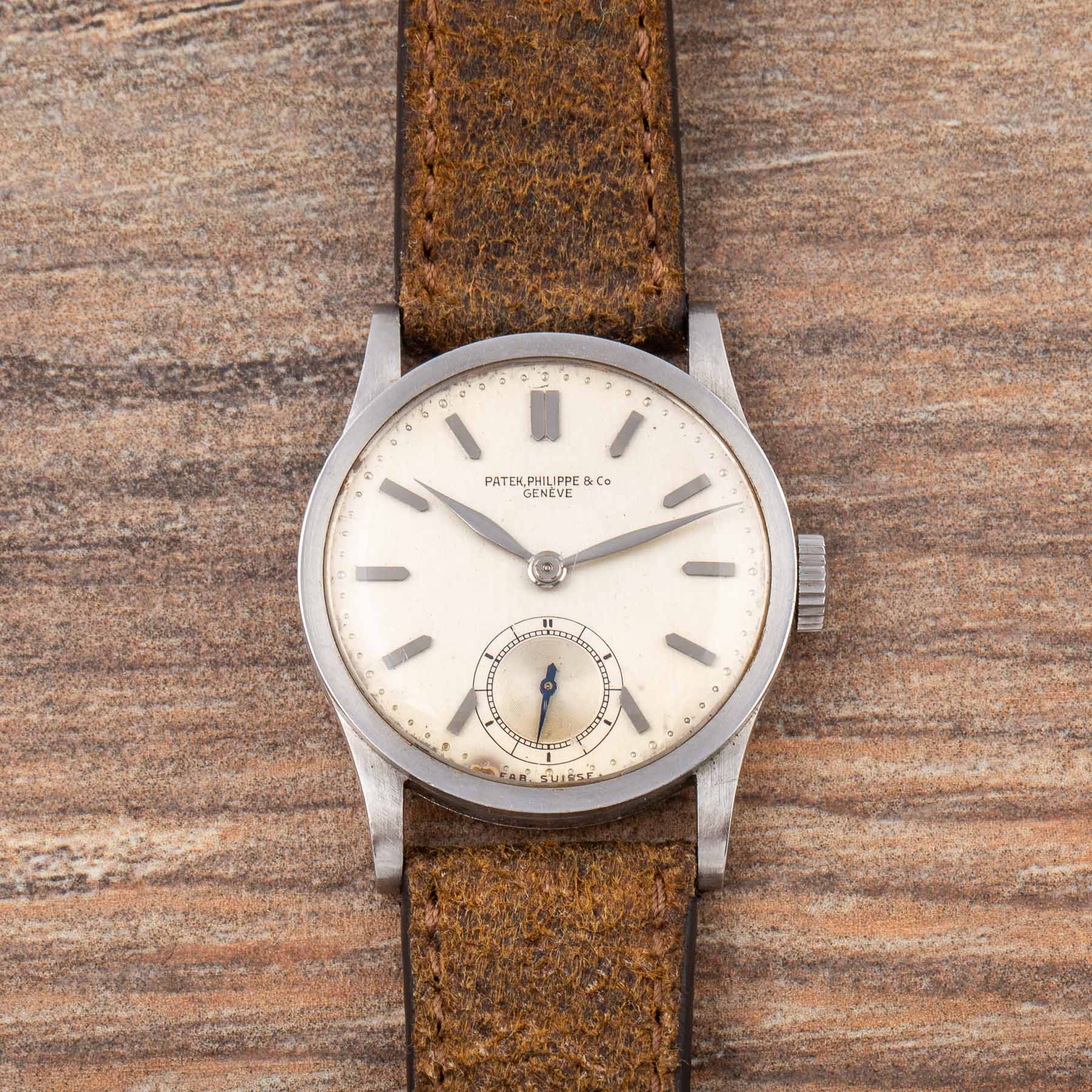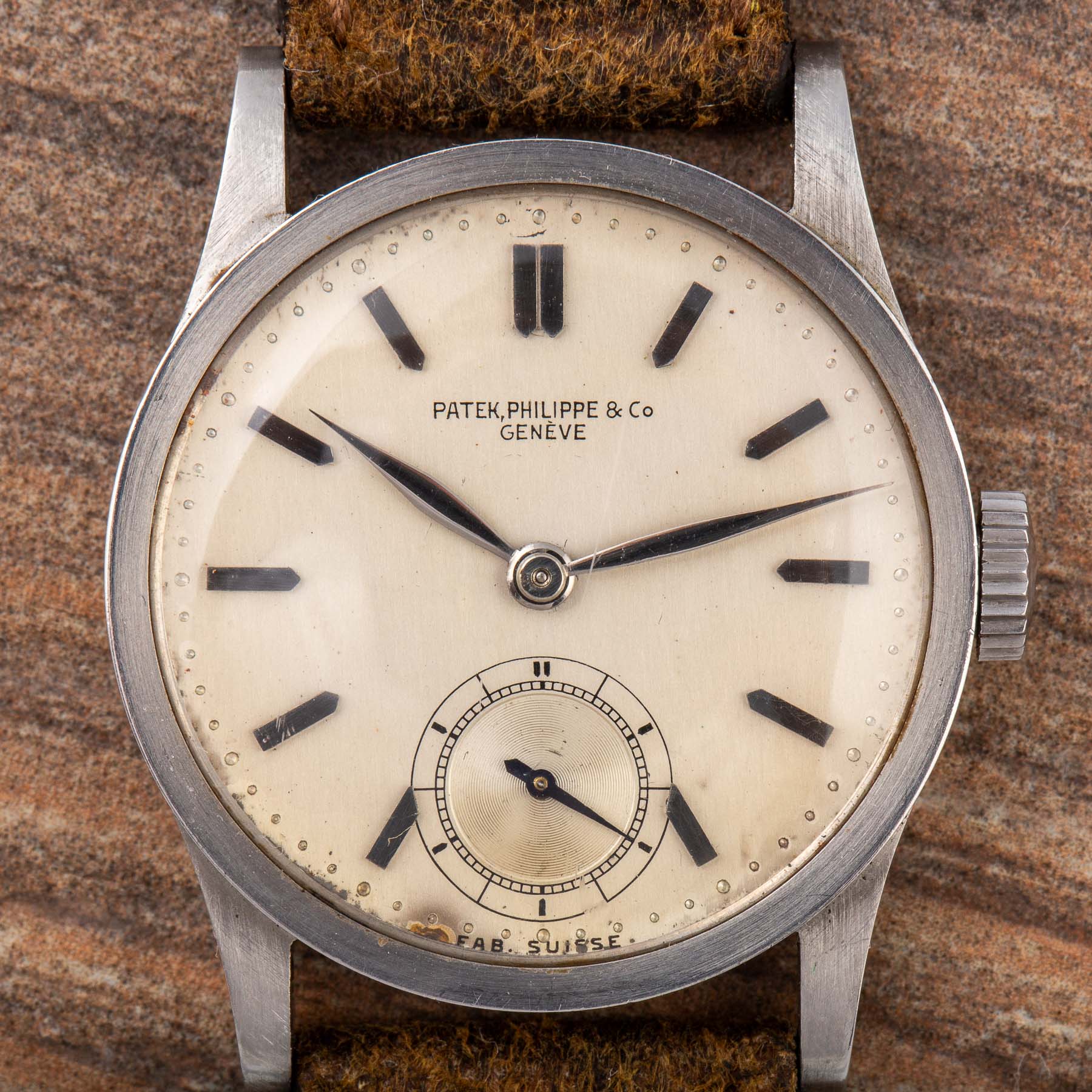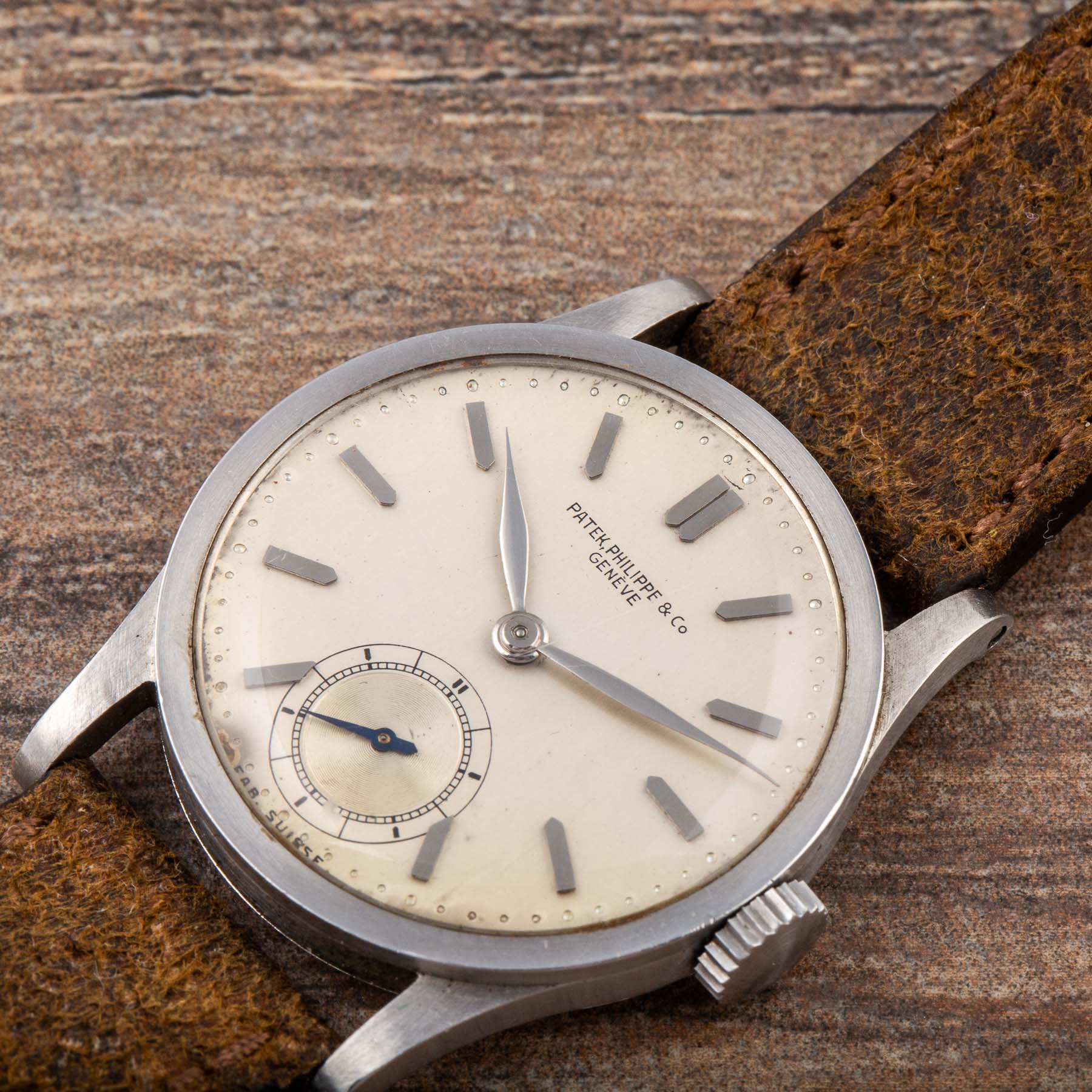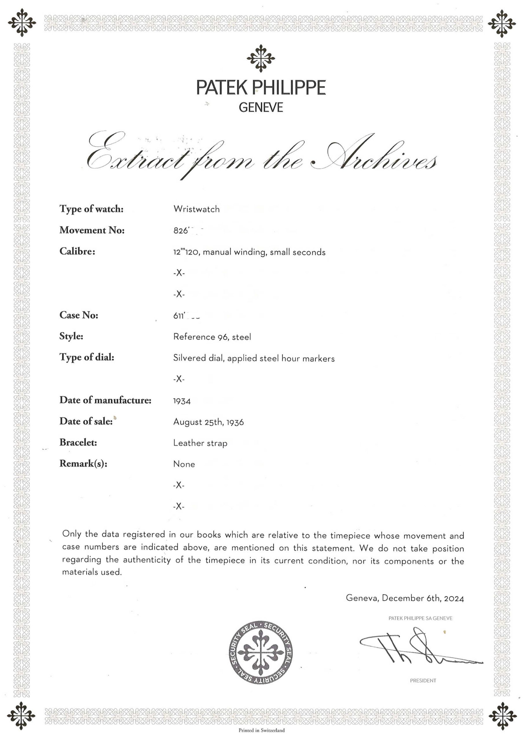 PATEK PHILIPPE CALATRAVA REF. 96 STAINLESS STEEL The Patek Philippe Calatrava Reference 96 is a landmark in the history of wristwatch design. Introduced in 1932, it was one of the first creations under the Stern family's stewardship of Patek Philippe. At a modest 31mm in diameter, the Ref. 96 was small by today’s standards but perfectly proportioned for its time. Its clean lines, slim case, and elegant dial epitomized simplicity. The Ref. 96 was powered by manually wound calibers such as the 12-120 or 12-400. The watch was offered in various metals, including yellow gold, pink gold, white gold, and platinum. The dial designs varied significantly over the years, ranging from simple silver dials to more eccentric sector dials. The Ref. 96 has recently been rediscovered by many watch enthusiasts, both due to the renewed appreciation for smaller watches and for its timeless elegance and significance in Patek Philippe's history. The overall condition of this extremely rare stainless steel Patek Philippe Calatrava Reference 96 is truly exceptional. The case appears to be untouched, still retaining its original factory finishes. It remains sharp, with well-defined lugs and a pristine, untouched flat bezel. The dial shows natural signs of aging, which is entirely expected for a watch of this age. It is most likely untouched and uncleaned, still featuring details such as the accent on "Genève" and the comma between "Patek" and "Philippe"—characteristics that often disappear after dial restoration or cleaning. The caliber is functioning perfectly without any issues. All components are correct for the year of manufacture, including the rare "Fab. Suisse" signed dial, as confirmed by the Extract from the Archives. The strap is not original Patek Philippe and the buckle is in white gold and period correct for the watch. The watch is accompanied by a Patek Philippe extract from the archives stating as date of manufacture 1934 and date of sale 1936. Year 1936, Serial Number, 611,XXX, Diameter 31mm