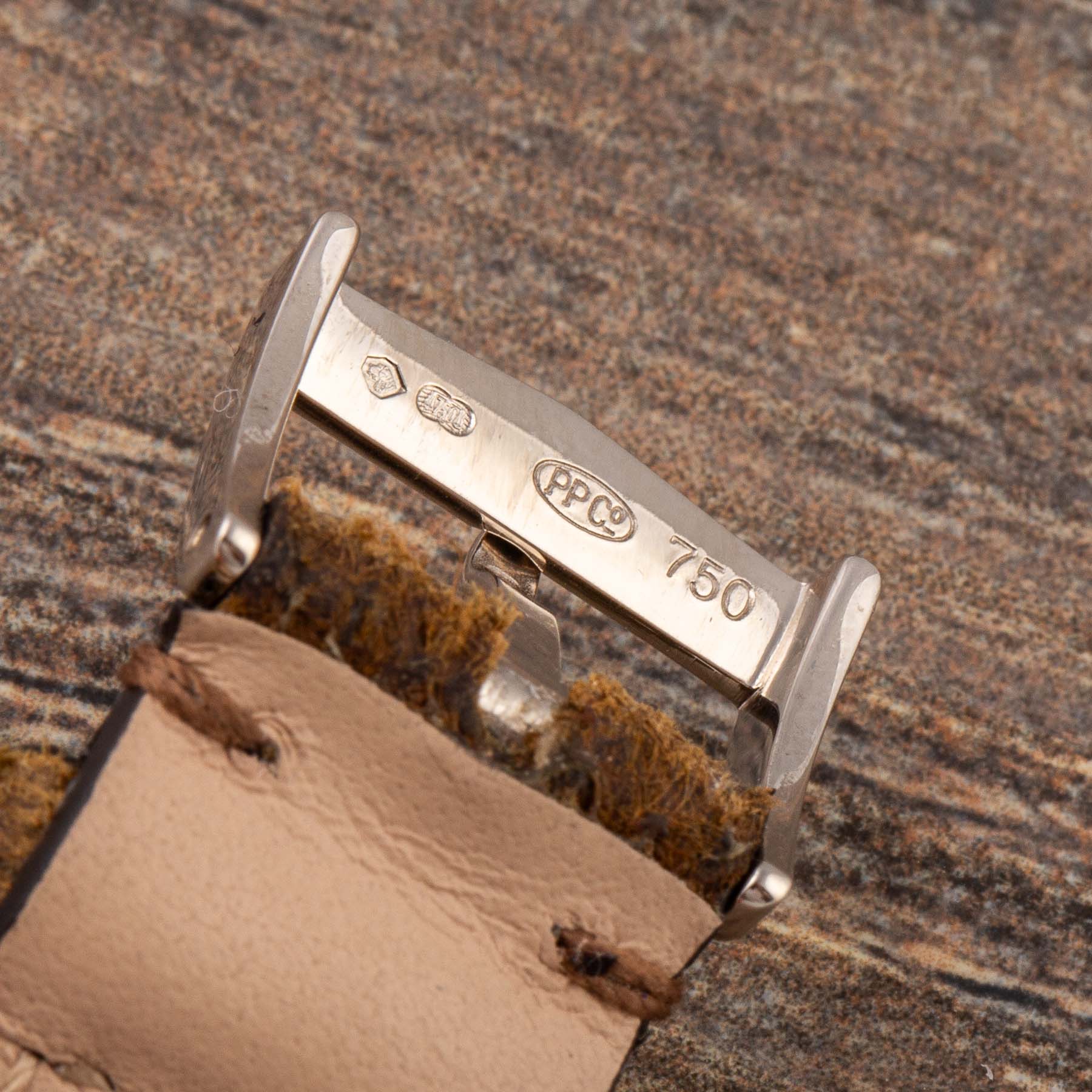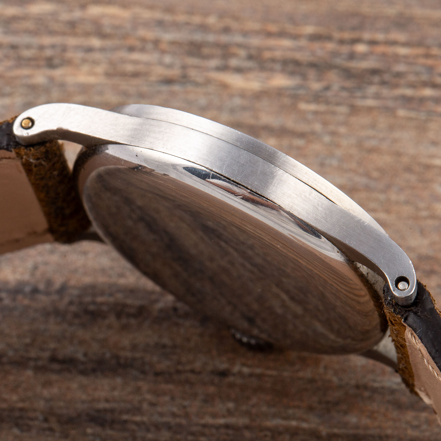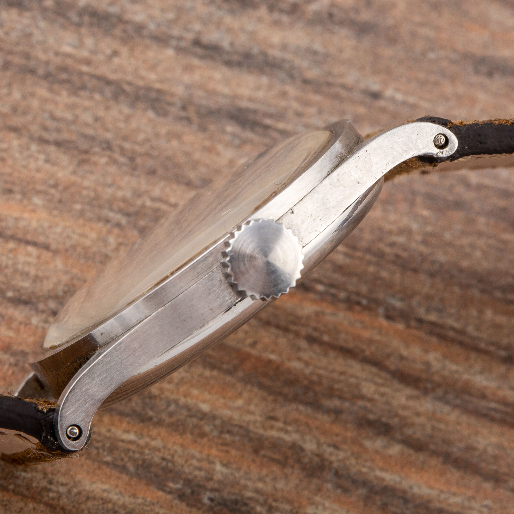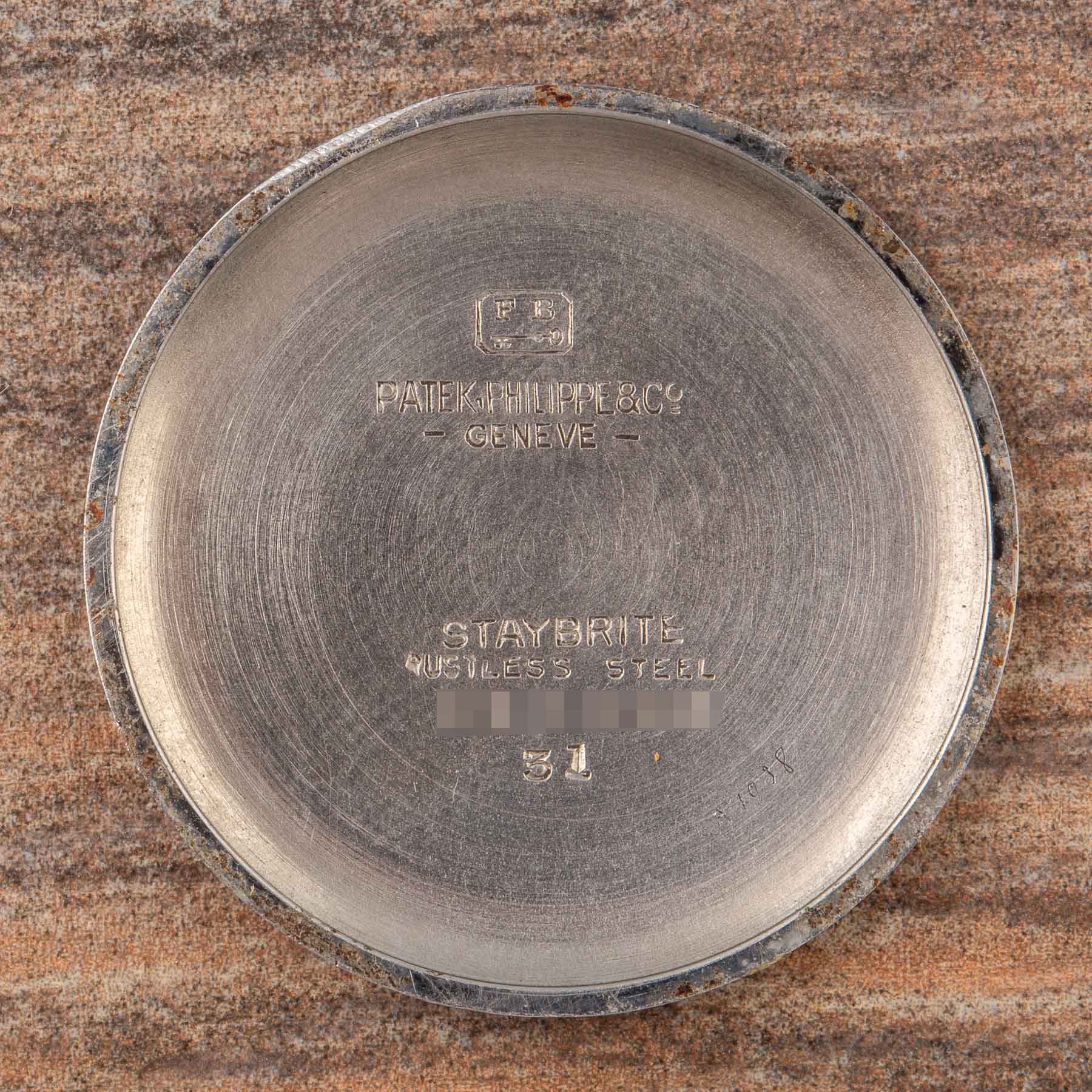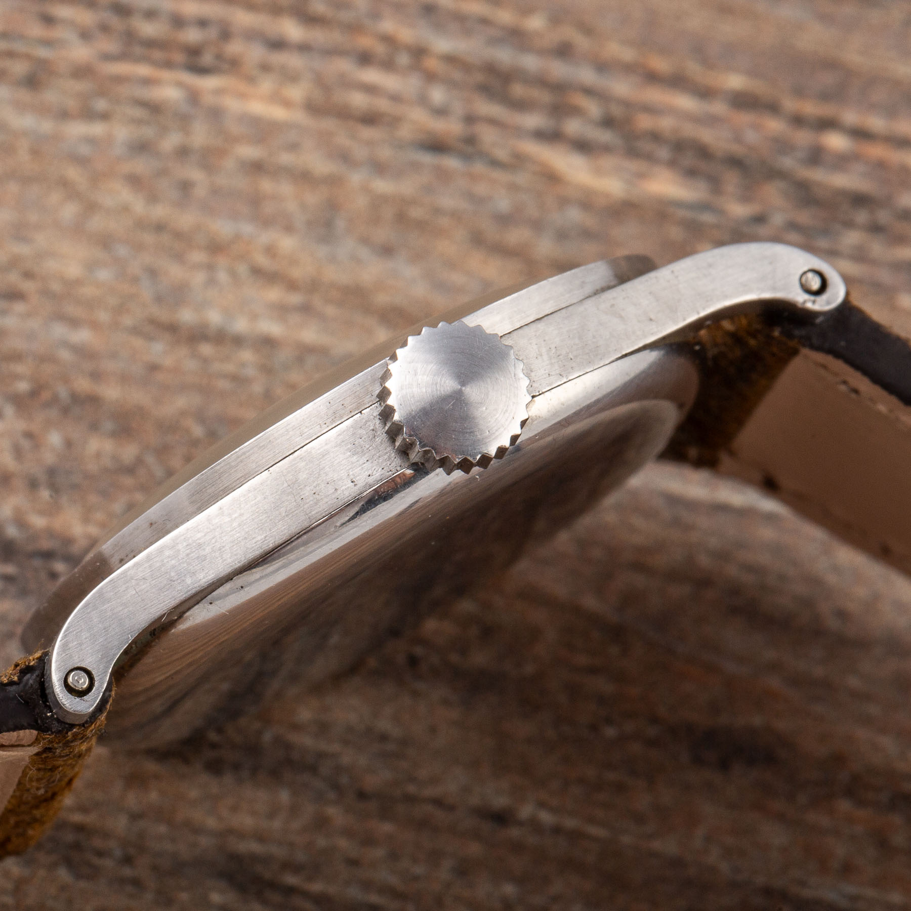 PATEK PHILIPPE CALATRAVA REF. 96 STAINLESS STEEL The Patek Philippe Calatrava Reference 96 is a landmark in the history of wristwatch design. Introduced in 1932, it was one of the first creations under the Stern family's stewardship of Patek Philippe. At a modest 31mm in diameter, the Ref. 96 was small by today’s standards but perfectly proportioned for its time. Its clean lines, slim case, and elegant dial epitomized simplicity. The Ref. 96 was powered by manually wound calibers such as the 12-120 or 12-400. The watch was offered in various metals, including yellow gold, pink gold, white gold, and platinum. The dial designs varied significantly over the years, ranging from simple silver dials to more eccentric sector dials. The Ref. 96 has recently been rediscovered by many watch enthusiasts, both due to the renewed appreciation for smaller watches and for its timeless elegance and significance in Patek Philippe's history. The overall condition of this extremely rare stainless steel Patek Philippe Calatrava Reference 96 is truly exceptional. The case appears to be untouched, still retaining its original factory finishes. It remains sharp, with well-defined lugs and a pristine, untouched flat bezel. The dial shows natural signs of aging, which is entirely expected for a watch of this age. It is most likely untouched and uncleaned, still featuring details such as the accent on "Genève" and the comma between "Patek" and "Philippe"—characteristics that often disappear after dial restoration or cleaning. The caliber is functioning perfectly without any issues. All components are correct for the year of manufacture, including the rare "Fab. Suisse" signed dial, as confirmed by the Extract from the Archives. The strap is not original Patek Philippe and the buckle is in white gold and period correct for the watch. The watch is accompanied by a Patek Philippe extract from the archives stating as date of manufacture 1934 and date of sale 1936. Year 1936, Serial Number, 611,XXX, Diameter 31mm