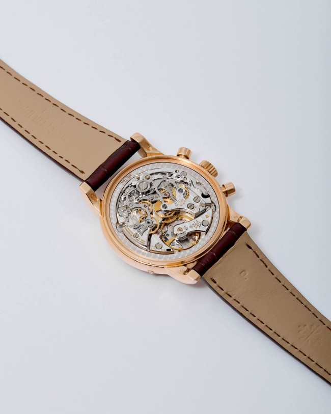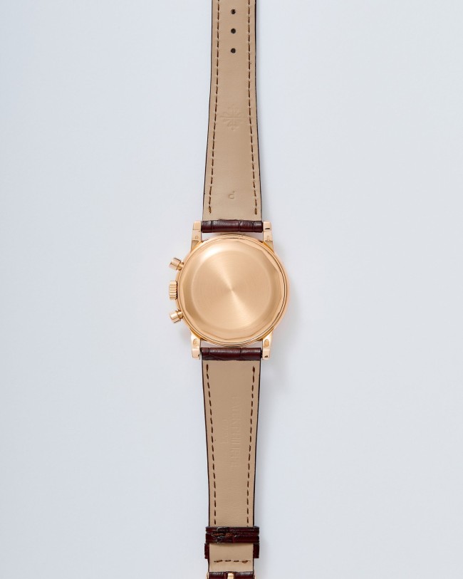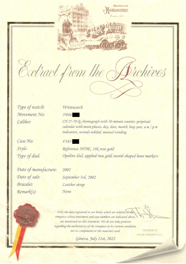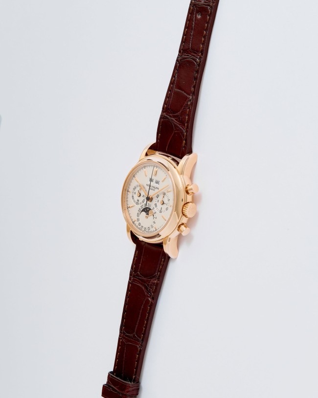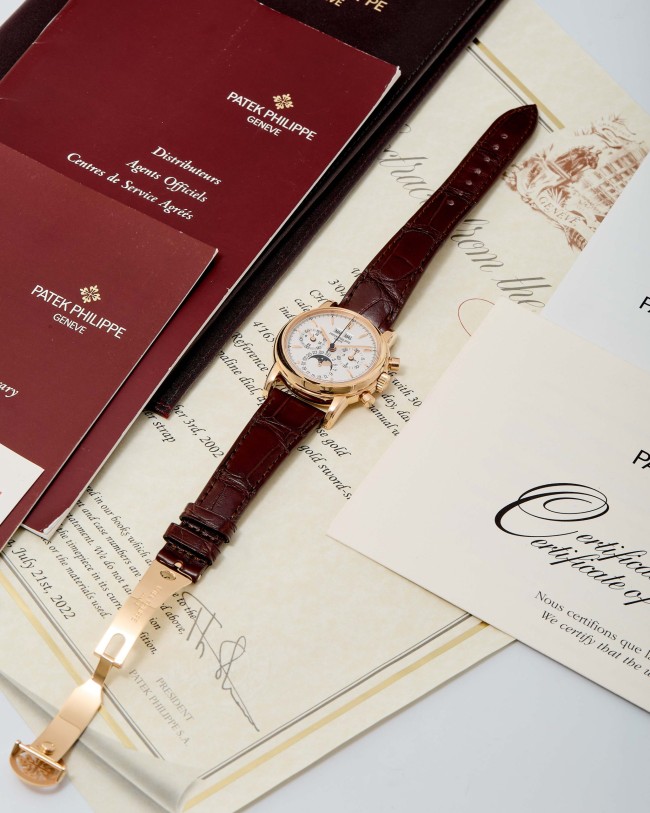 18K Pink gold Patek Philippe chronograph perpetual calendar ref. 3970E. A highly desirable Patek Philippe 3970, representing the 4th series of the reference and dating to 2002—a very rare configuration in pink gold. The watch has been worn and lightly polished over the years, yet remains in very good overall condition, with well-preserved original case proportions and clearly visible gold hallmarks. The dial is flawless, offering exceptional presence and balance. Power comes from the legendary manual-winding cal. CH 27-70Q. The watch is fitted with an alligator leather strap and deployant clasp and is accompanied by its original box and papers dated 2002, along with an Extract from the Archives for added provenance. A rare and refined expression of one of Patek Philippe’s most iconic complications—a compelling opportunity for the discerning collector.