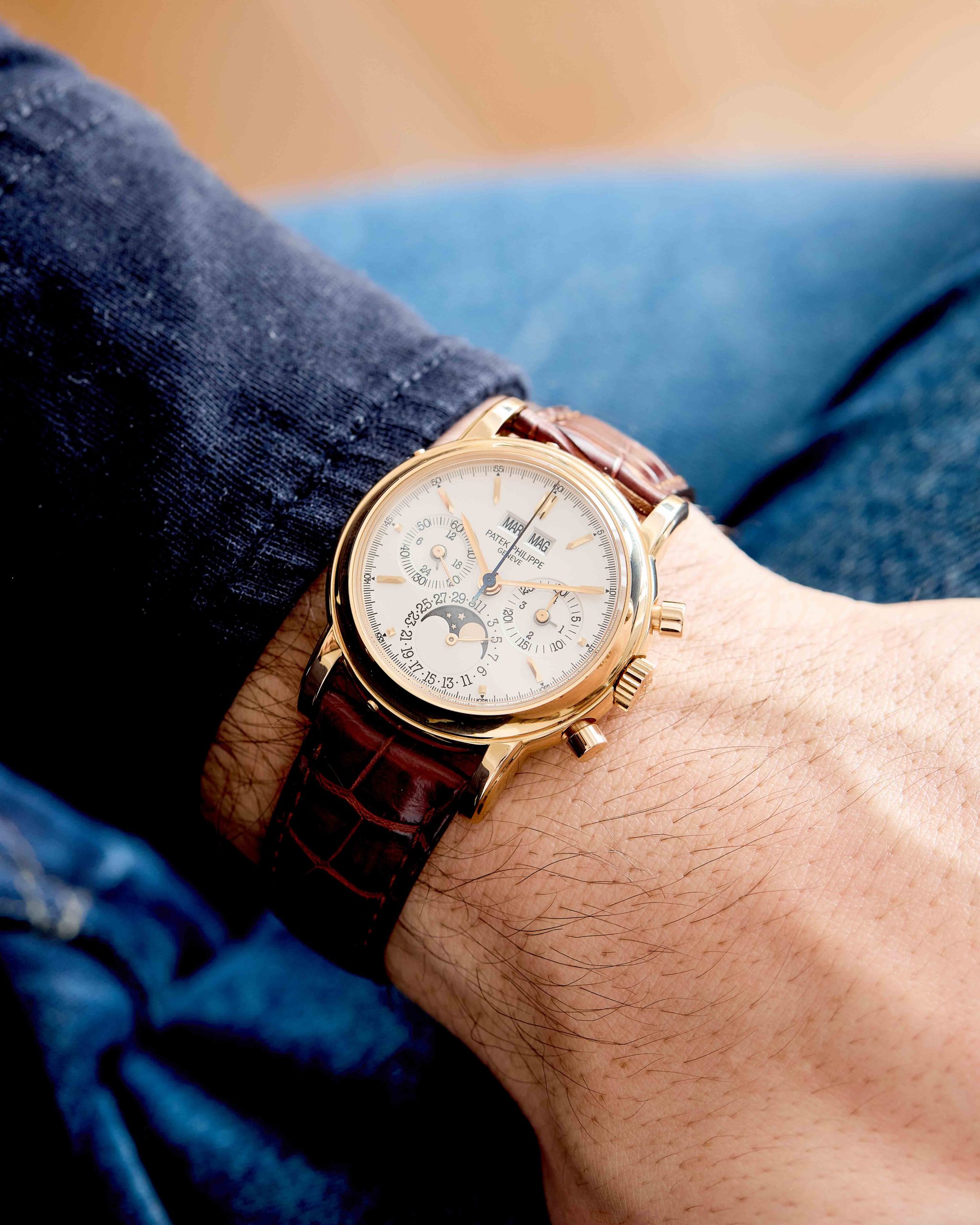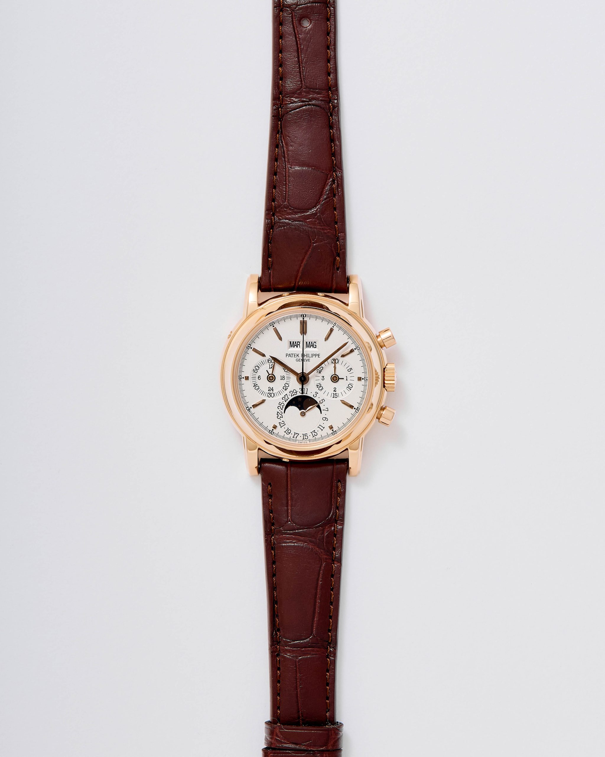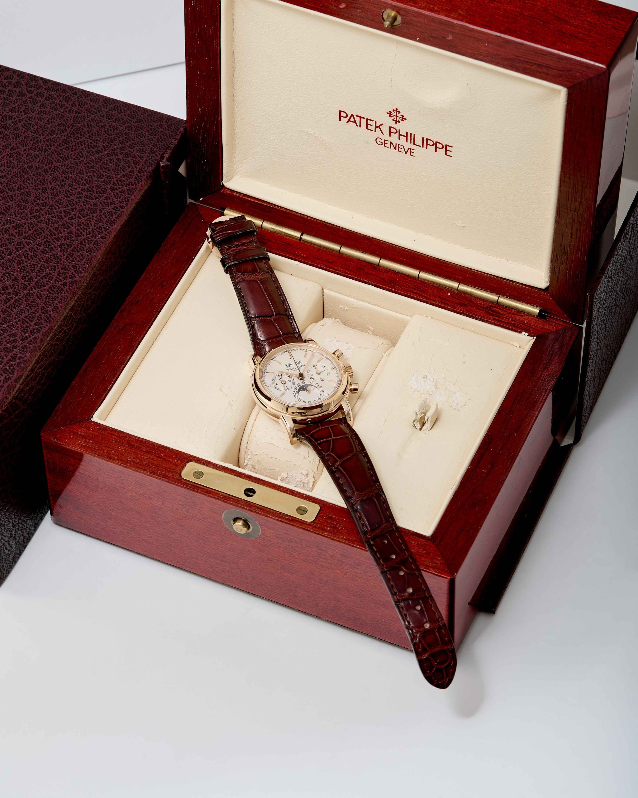18K Pink gold Patek Philippe chronograph perpetual calendar ref. 3970E. A highly desirable Patek Philippe 3970, representing the 4th series of the reference and dating to 2002—a very rare configuration in pink gold. The watch has been worn and lightly polished over the years, yet remains in very good overall condition, with well-preserved original case proportions and clearly visible gold hallmarks. The dial is flawless, offering exceptional presence and balance. Power comes from the legendary manual-winding cal. CH 27-70Q. The watch is fitted with an alligator leather strap and deployant clasp and is accompanied by its original box and papers dated 2002, along with an Extract from the Archives for added provenance. A rare and refined expression of one of Patek Philippe’s most iconic complications—a compelling opportunity for the discerning collector.