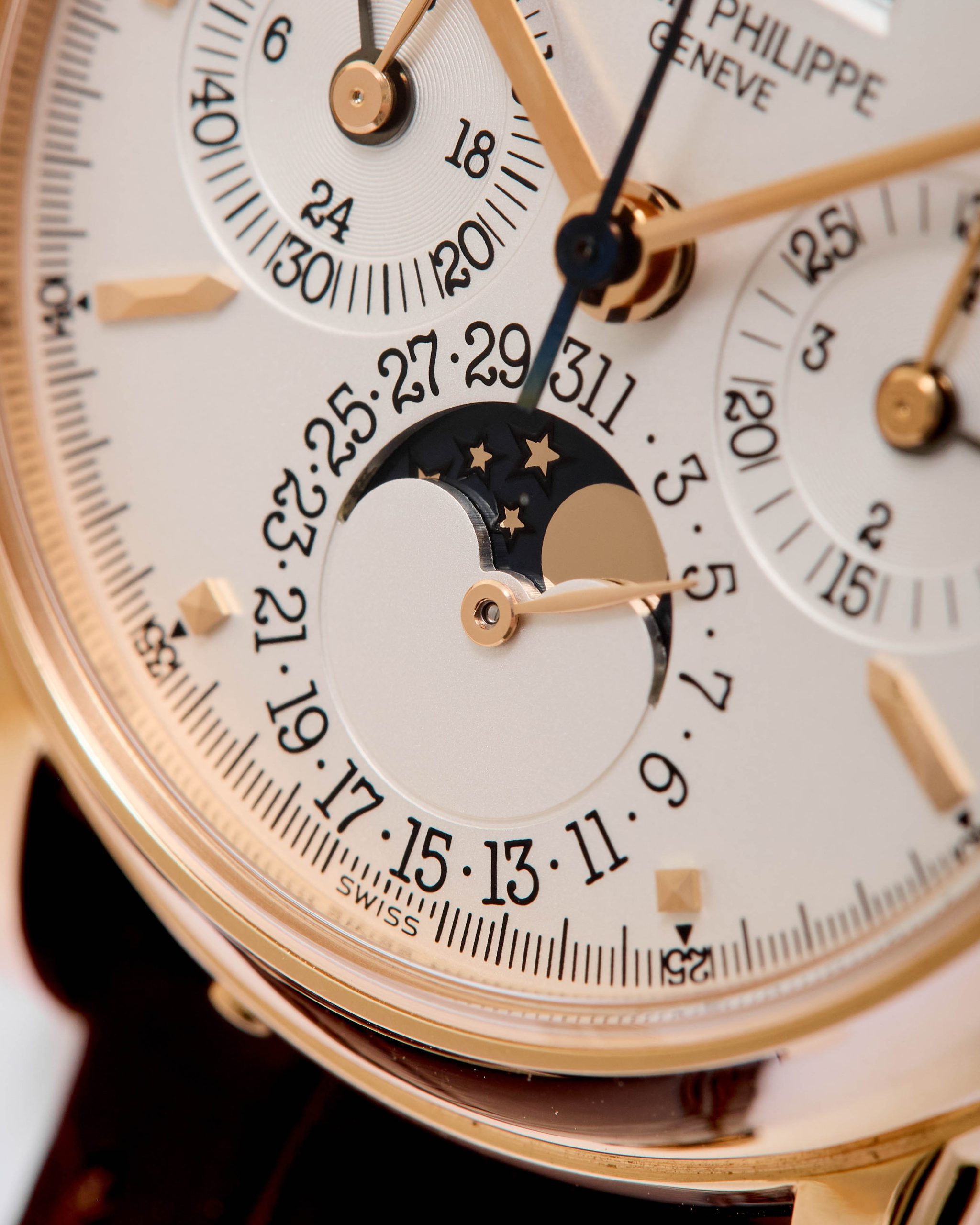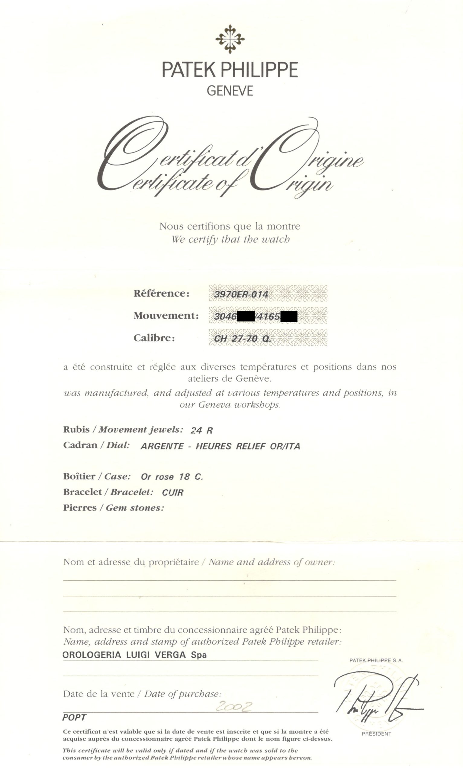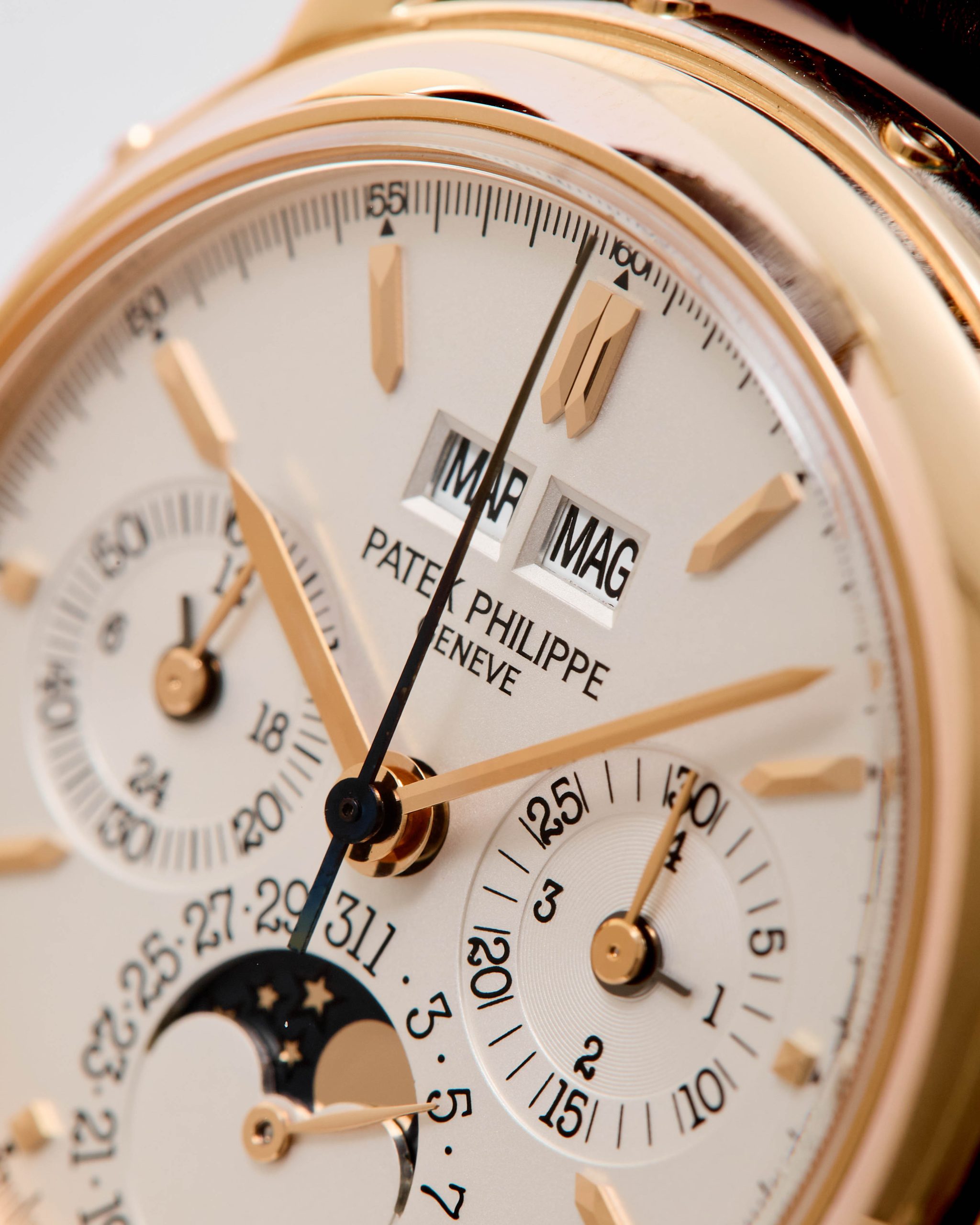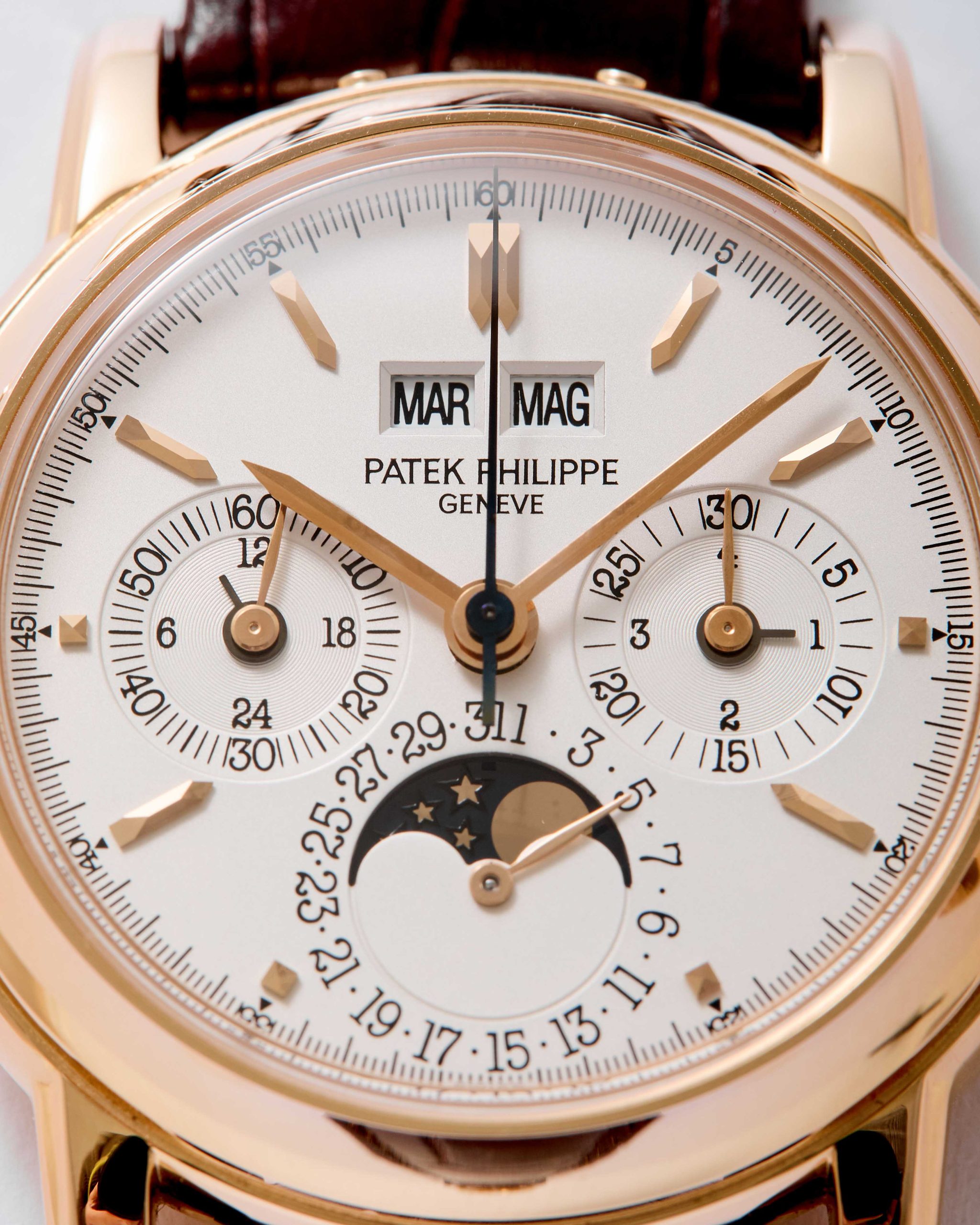 18K Pink gold Patek Philippe chronograph perpetual calendar ref. 3970E. A highly desirable Patek Philippe 3970, representing the 4th series of the reference and dating to 2002—a very rare configuration in pink gold. The watch has been worn and lightly polished over the years, yet remains in very good overall condition, with well-preserved original case proportions and clearly visible gold hallmarks. The dial is flawless, offering exceptional presence and balance. Power comes from the legendary manual-winding cal. CH 27-70Q. The watch is fitted with an alligator leather strap and deployant clasp and is accompanied by its original box and papers dated 2002, along with an Extract from the Archives for added provenance. A rare and refined expression of one of Patek Philippe’s most iconic complications—a compelling opportunity for the discerning collector.