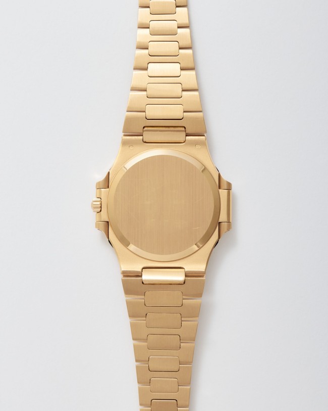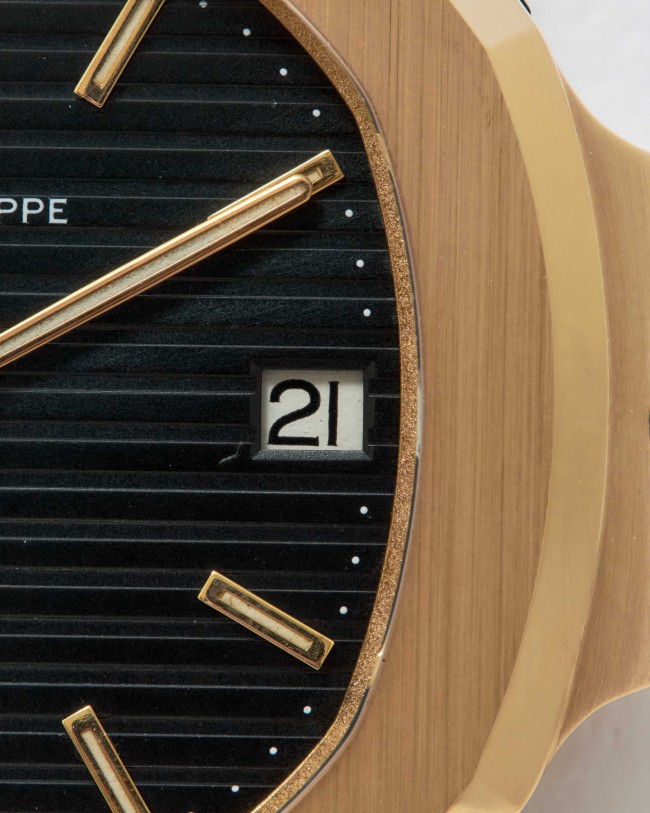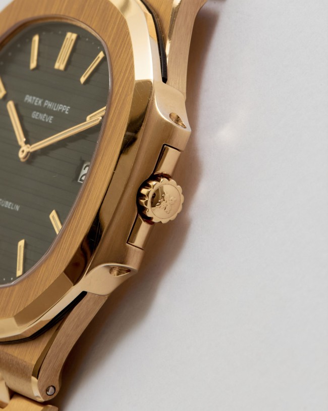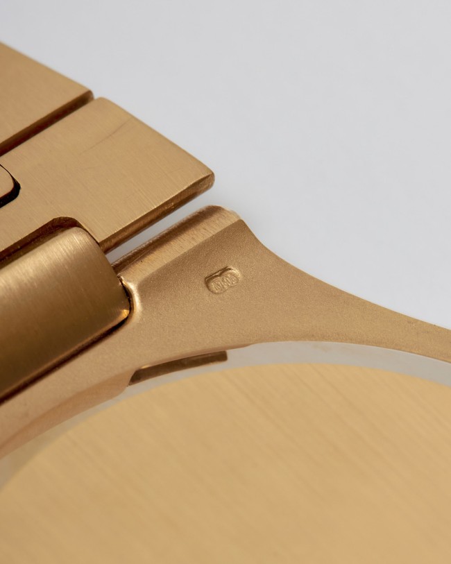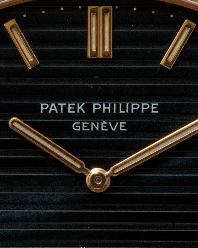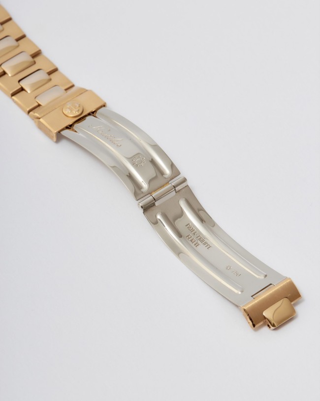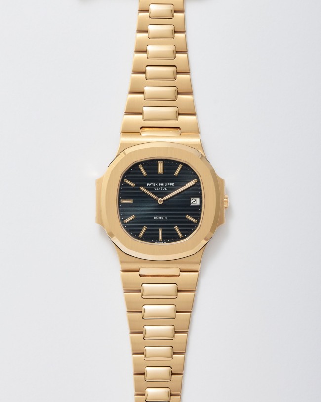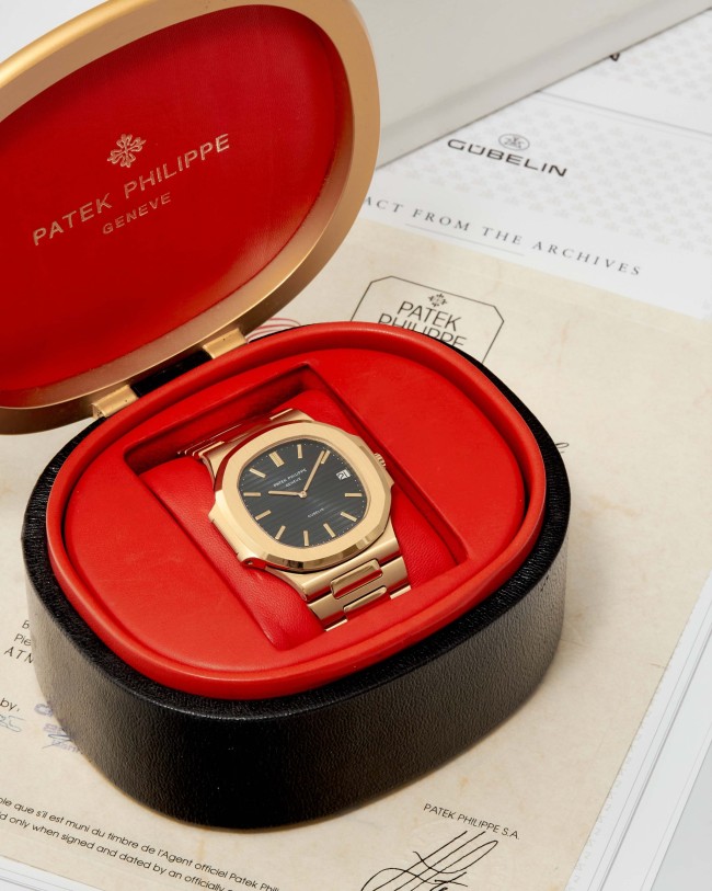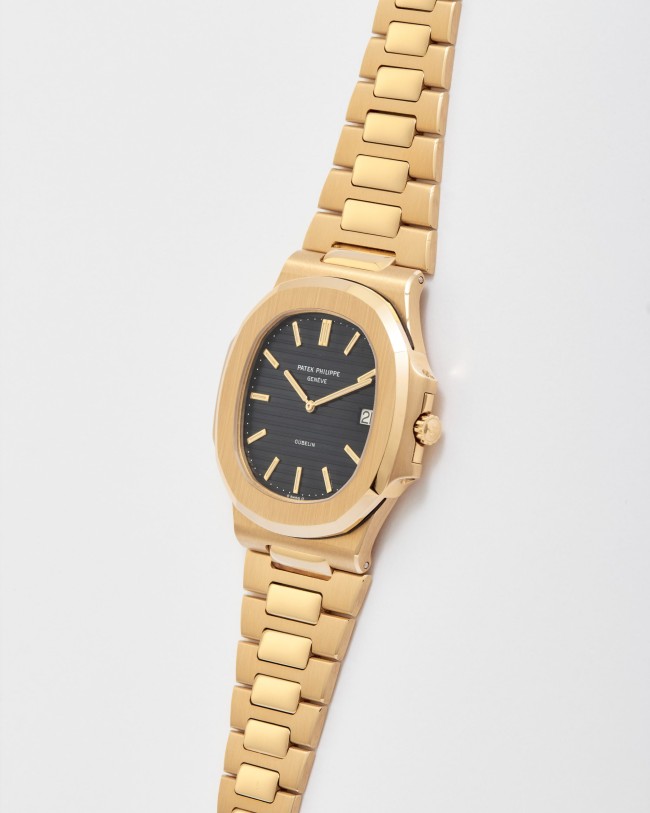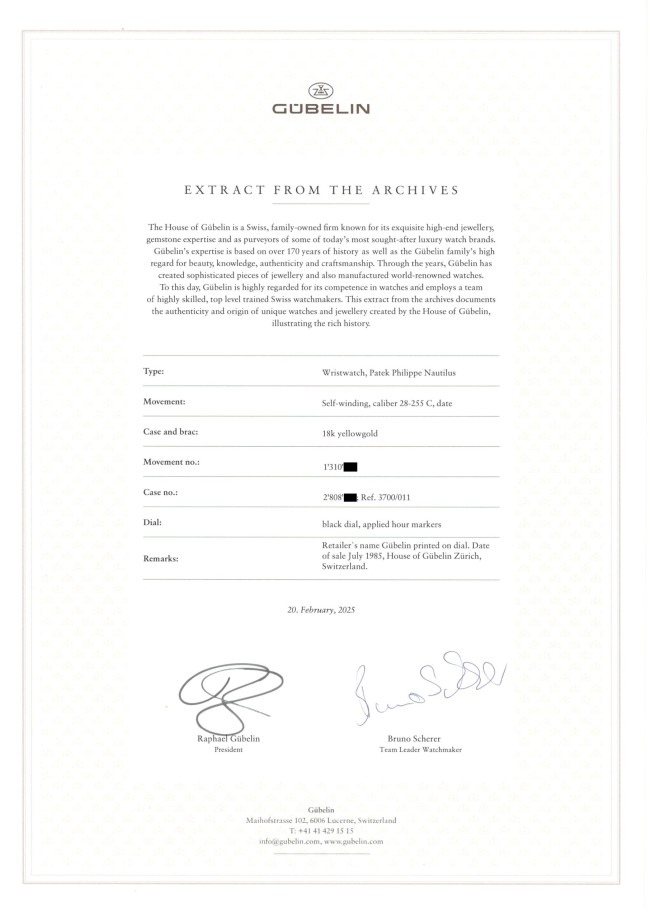 18K Gold Patek Philippe Nautilus Ref. 3700/11 Retailed by Gübelin. A superb example of the iconic gold Nautilus “Jumbo,” this rare Ref. 3700/11 represents the final production version of the model, distinguished by its narrower bracelet. This particular piece is further elevated by its dual signature, with the retailer's name Gübelin printed on the dial. The watch is in very good overall condition and has been professionally polished. The bracelet shows no stretch, and the dial remains in flawless condition, free of any signs of wear. Powered by the self-winding Caliber 28-255C, it is accompanied by its original box and papers dated July 1985, as well as a Gübelin Extract from the Archives confirming both the sale and the retailer-signed dial in the remarks. A highly collectible piece, ideal for discerning collectors of rare and significant Patek Philippe references.
