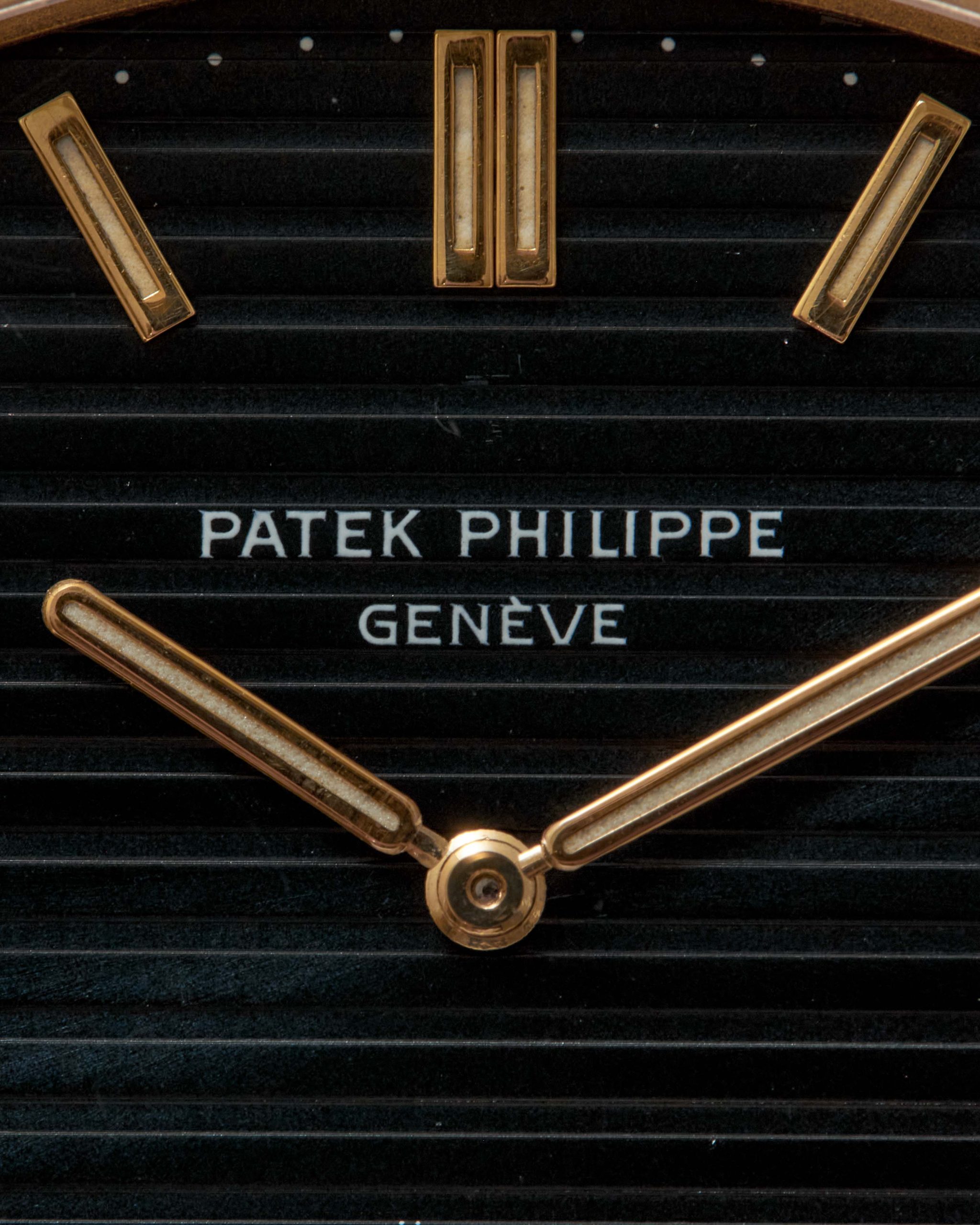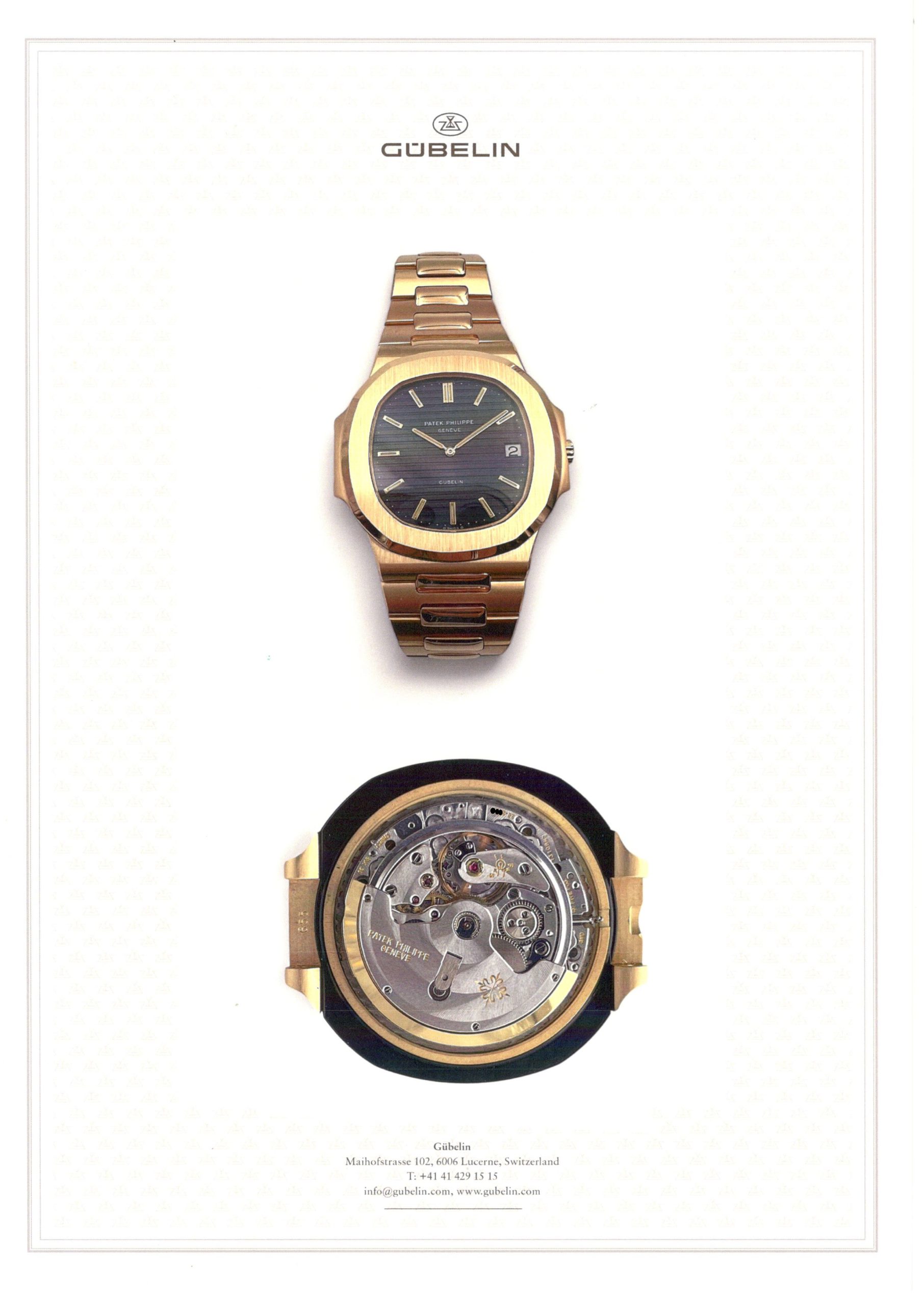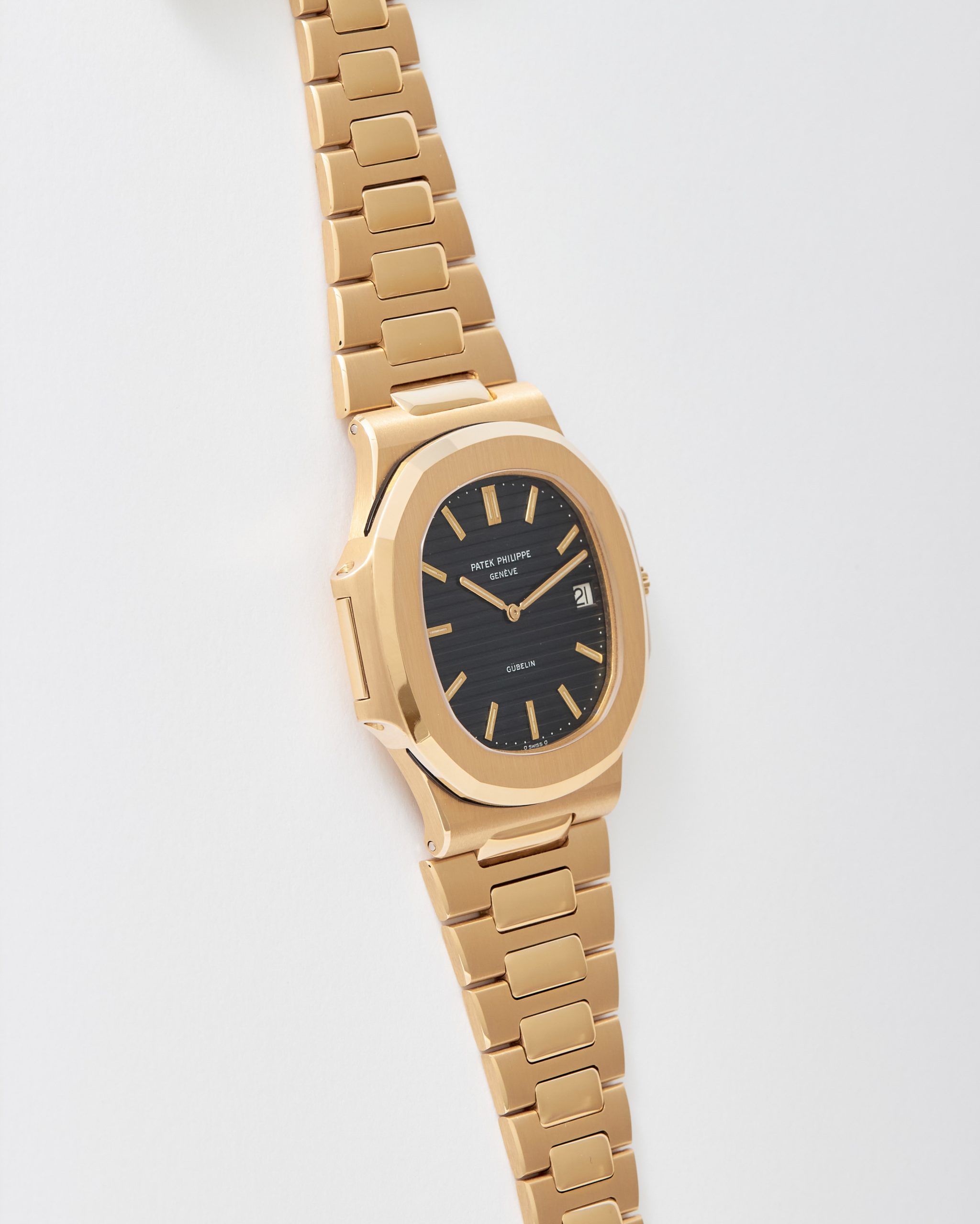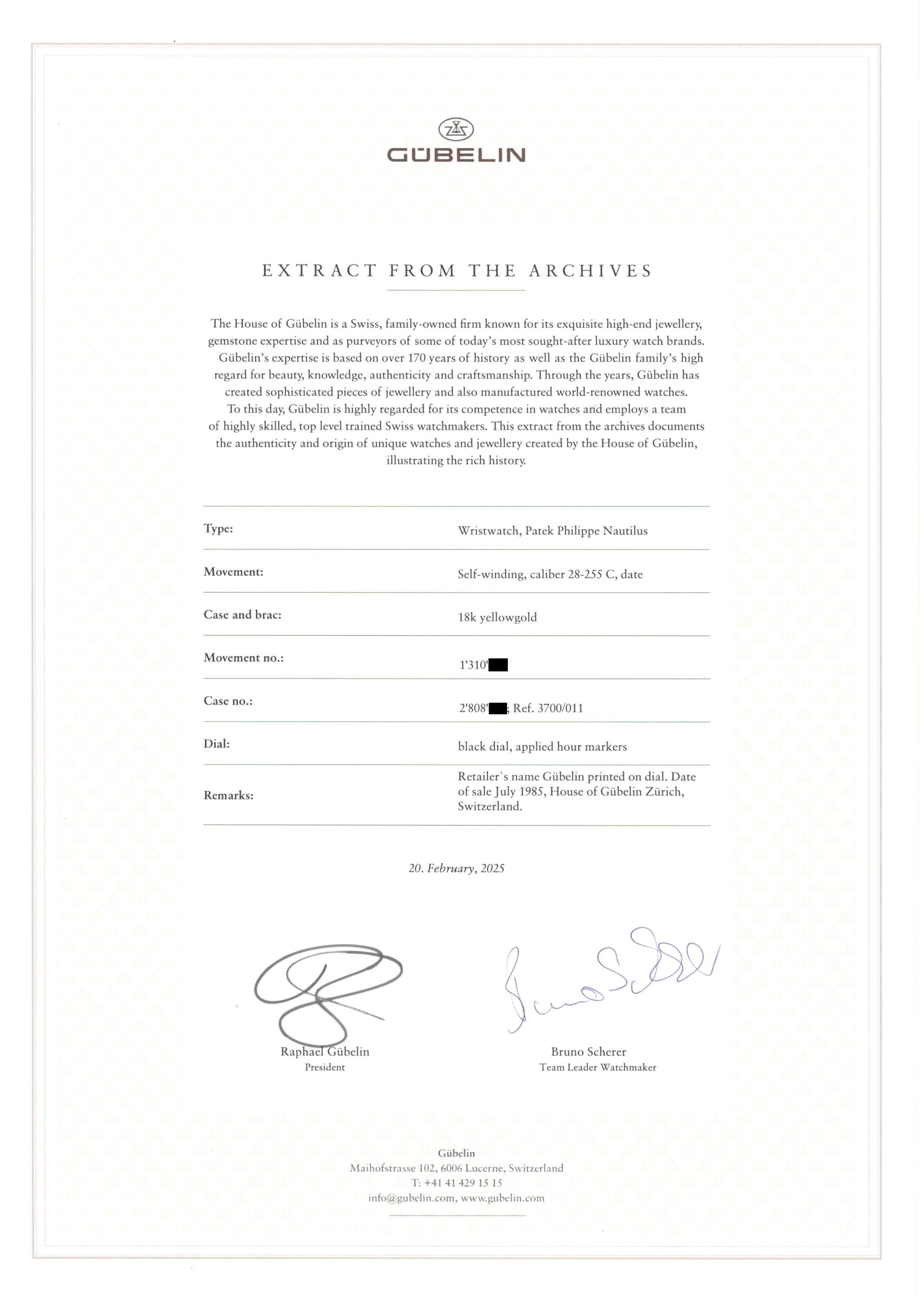 18K Gold Patek Philippe Nautilus Ref. 3700/11 Retailed by Gübelin. A superb example of the iconic gold Nautilus “Jumbo,” this rare Ref. 3700/11 represents the final production version of the model, distinguished by its narrower bracelet. This particular piece is further elevated by its dual signature, with the retailer's name Gübelin printed on the dial. The watch is in very good overall condition and has been professionally polished. The bracelet shows no stretch, and the dial remains in flawless condition, free of any signs of wear. Powered by the self-winding Caliber 28-255C, it is accompanied by its original box and papers dated July 1985, as well as a Gübelin Extract from the Archives confirming both the sale and the retailer-signed dial in the remarks. A highly collectible piece, ideal for discerning collectors of rare and significant Patek Philippe references.