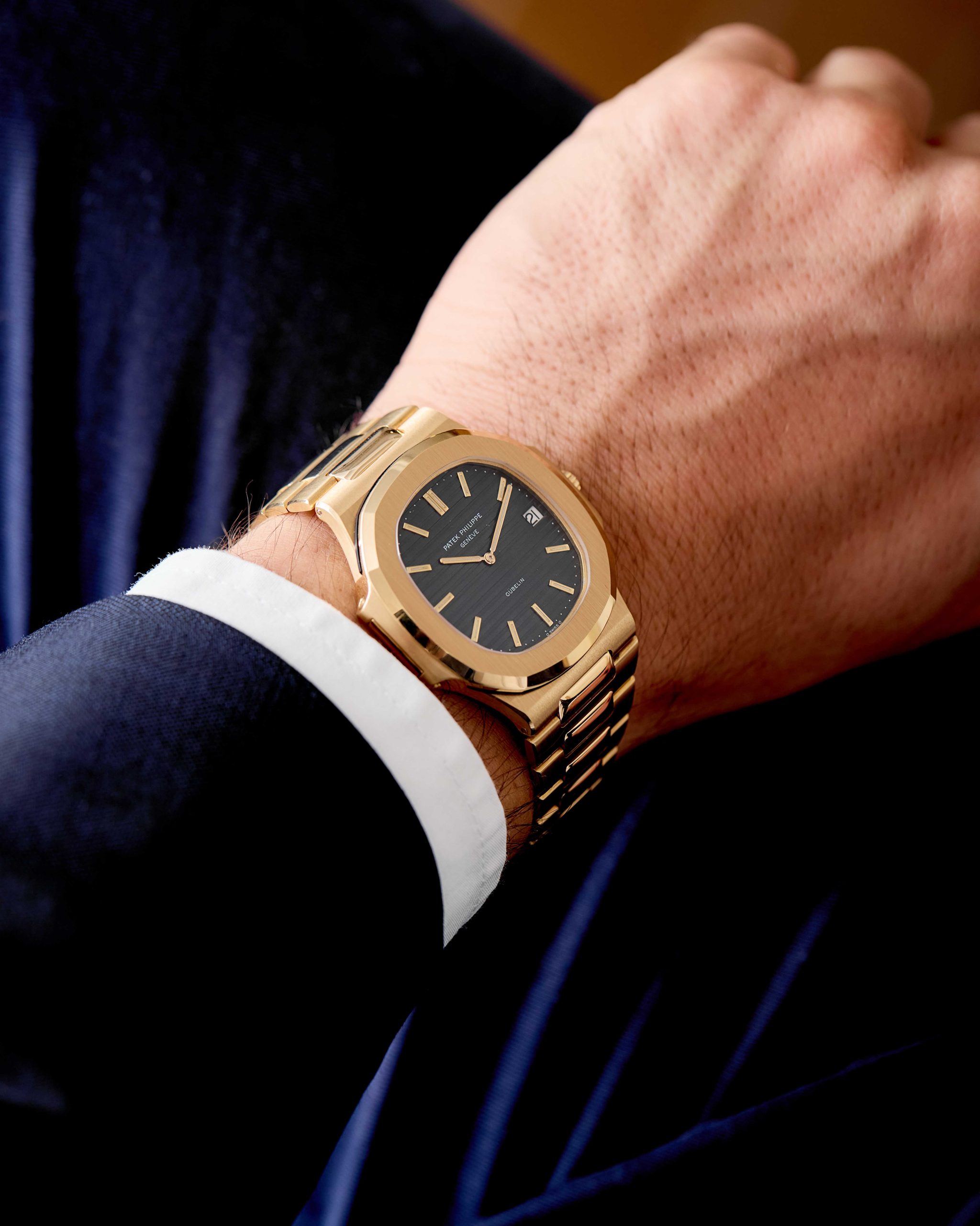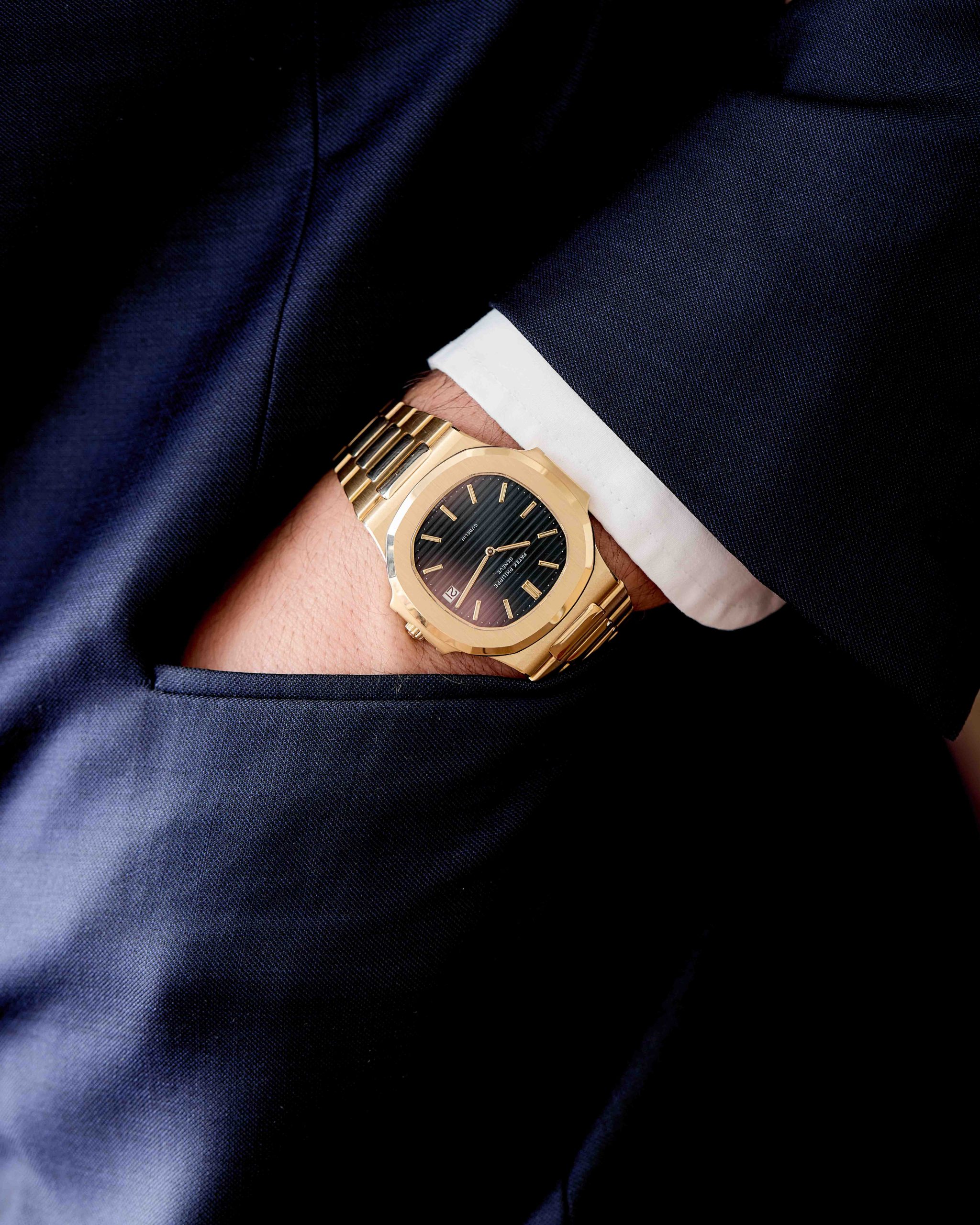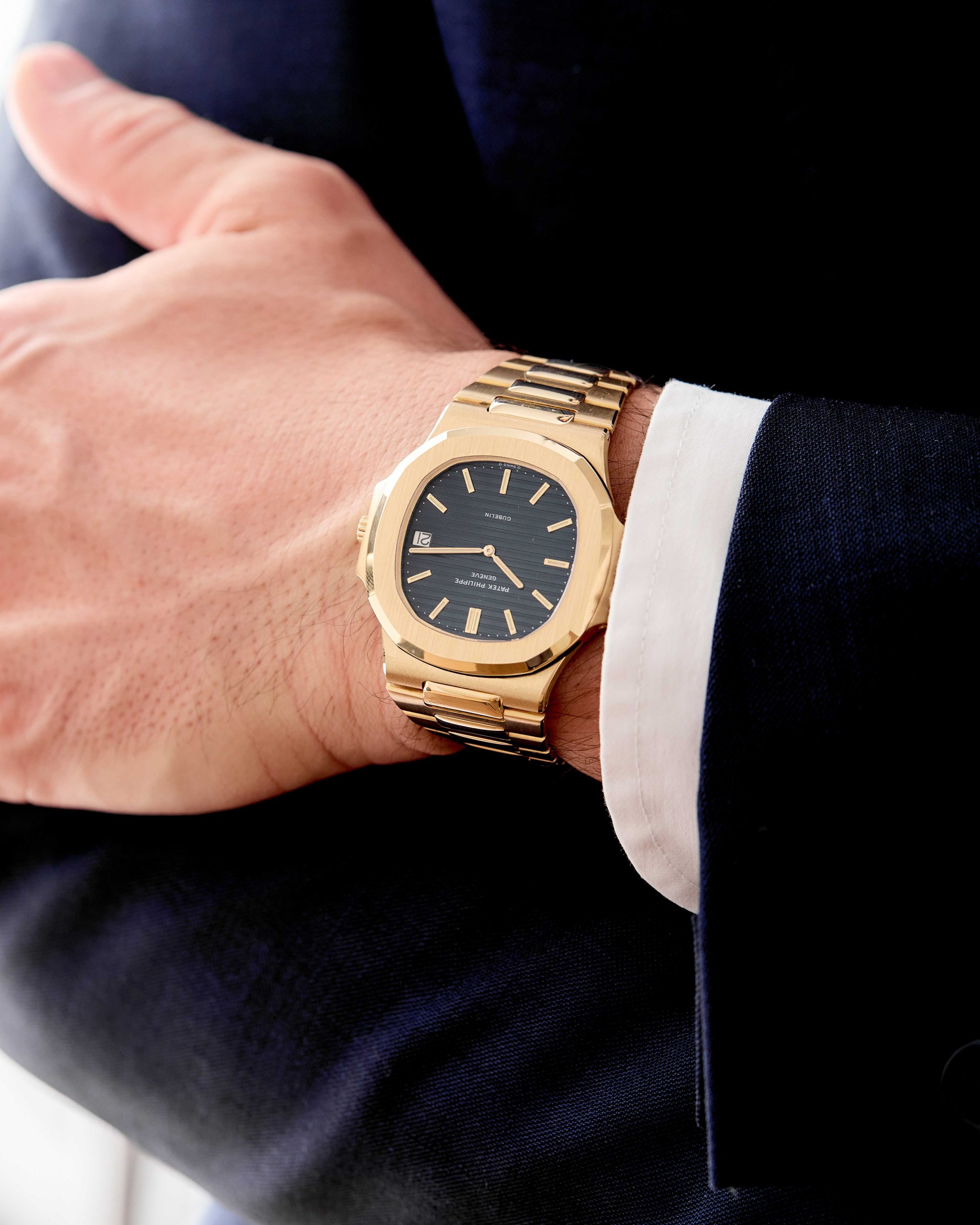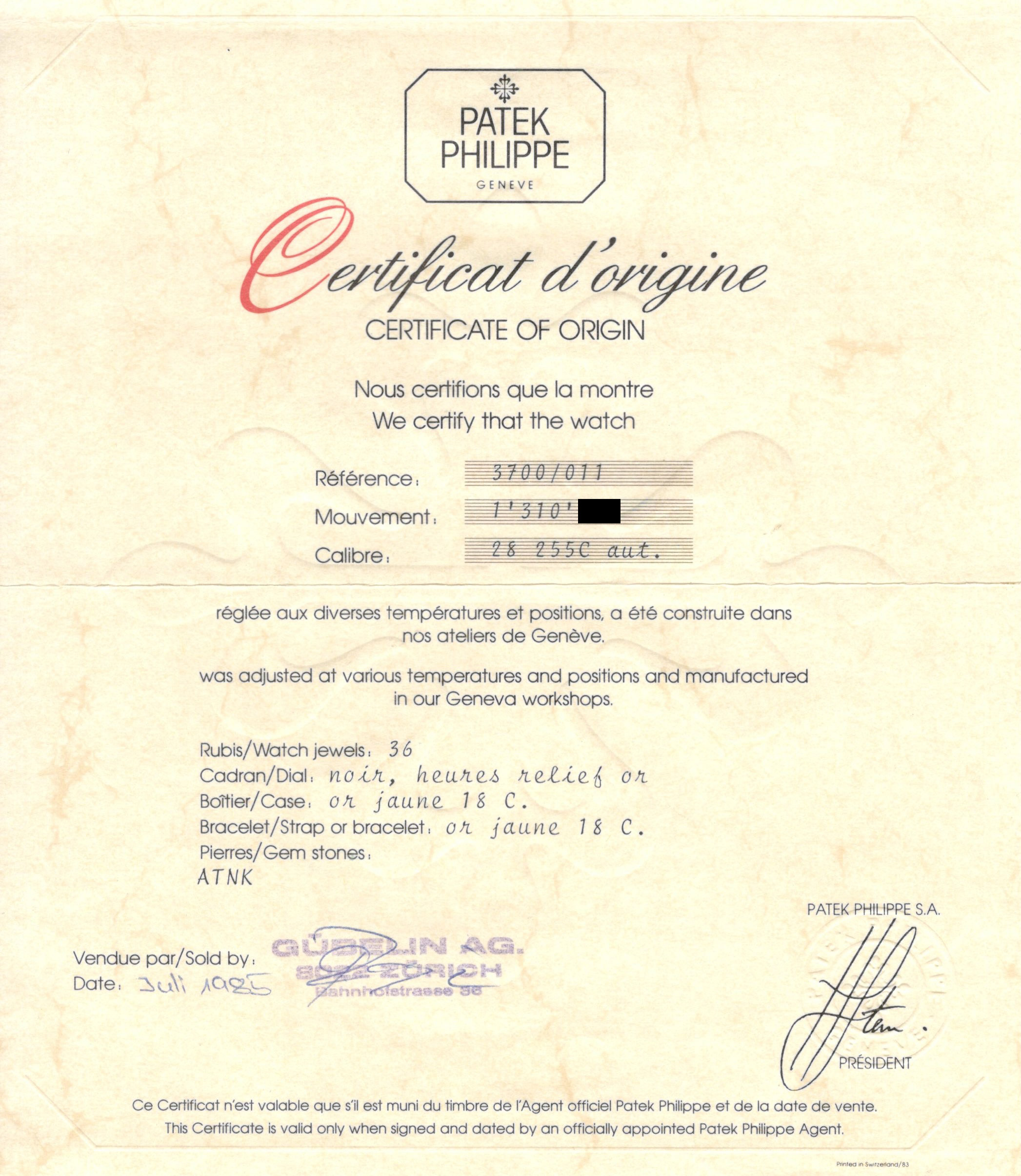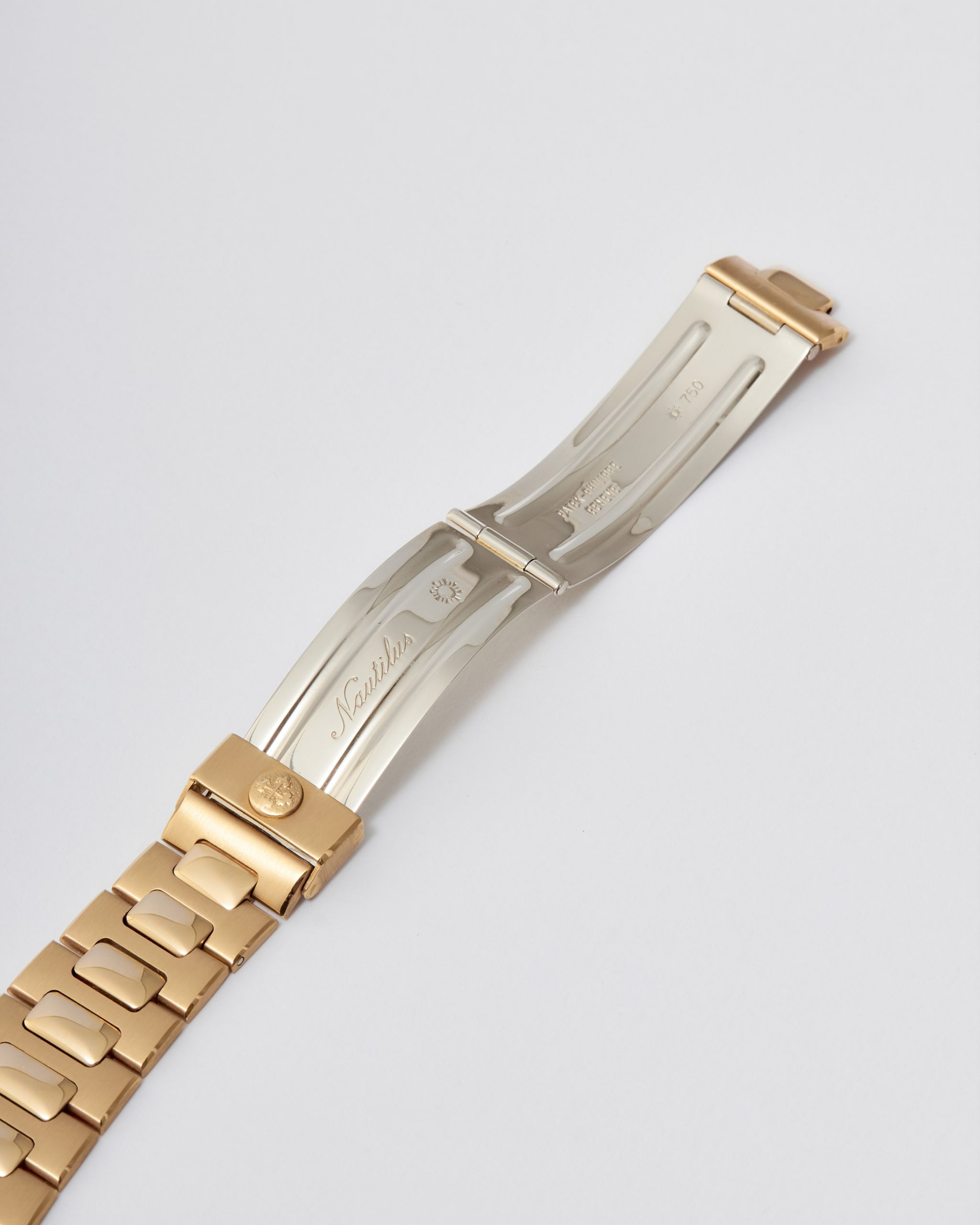 18K Gold Patek Philippe Nautilus Ref. 3700/11 Retailed by Gübelin. A superb example of the iconic gold Nautilus “Jumbo,” this rare Ref. 3700/11 represents the final production version of the model, distinguished by its narrower bracelet. This particular piece is further elevated by its dual signature, with the retailer's name Gübelin printed on the dial. The watch is in very good overall condition and has been professionally polished. The bracelet shows no stretch, and the dial remains in flawless condition, free of any signs of wear. Powered by the self-winding Caliber 28-255C, it is accompanied by its original box and papers dated July 1985, as well as a Gübelin Extract from the Archives confirming both the sale and the retailer-signed dial in the remarks. A highly collectible piece, ideal for discerning collectors of rare and significant Patek Philippe references.