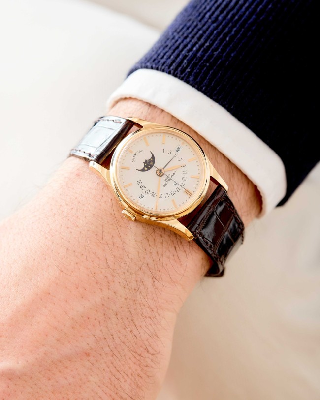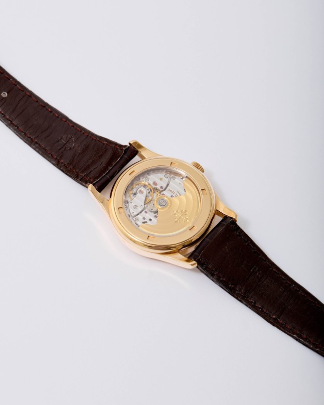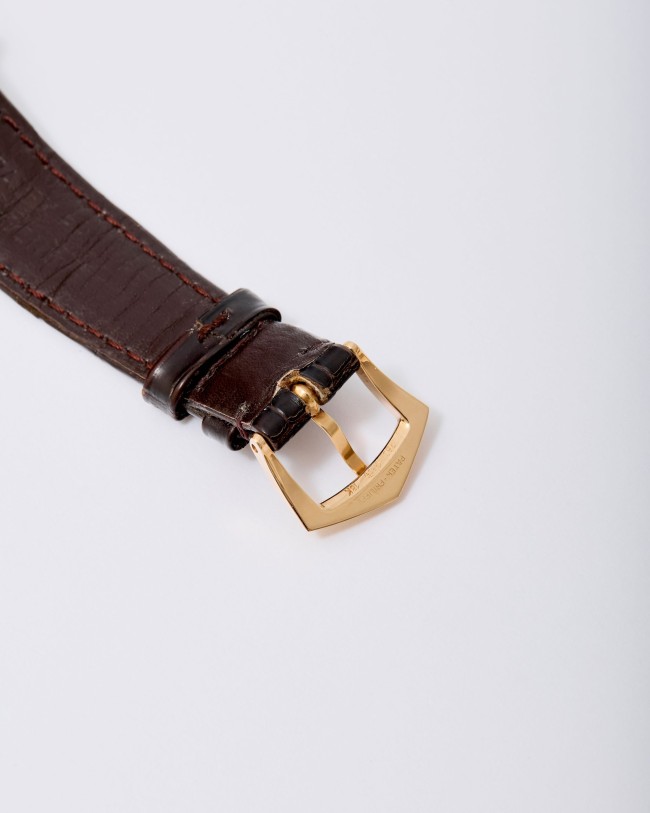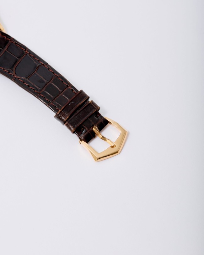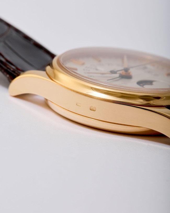 A refined and highly desirable Patek Philippe Calatrava Perpetual Calendar reference 5050R in 18K rose gold, dating to 1996. This elegant neo-vintage timepiece from the 1990s is particularly sought after in rose gold, a rarer and especially attractive configuration for this reference. The case has been lightly polished in the past but remains in very good overall condition, retaining well-defined lines with hallmarks clearly visible. The dial is flawless and beautifully preserved, showcasing the harmonious layout characteristic of the reference. The watch is powered by the self-winding caliber 315 S QR, featuring the distinctive retrograde date display combined with a perpetual calendar complication—one of the defining innovations of the model. It is fitted with its original vintage alligator strap and an 18K rose gold Patek Philippe buckle. The watch is offered as a full set with its original box and papers. Charming and sophisticated on the wrist, this neo-vintage Patek Philippe represents an appealing opportunity within a category that continues to attract strong collector interest.