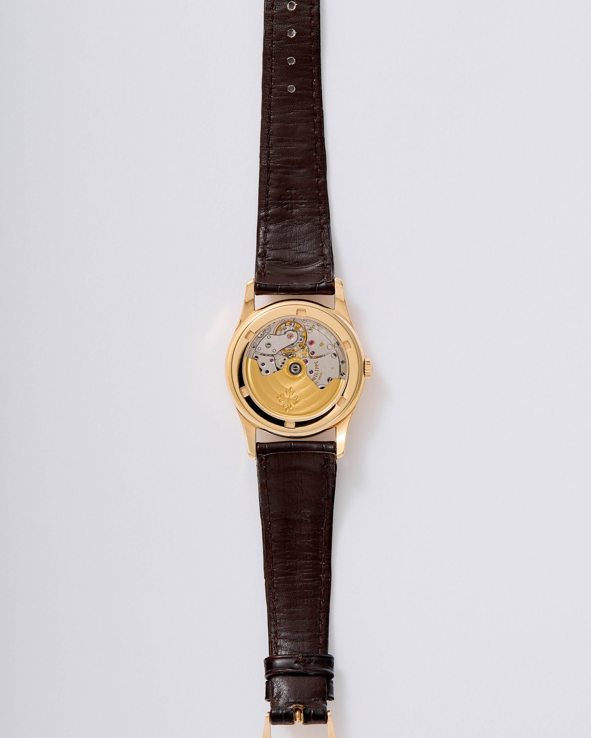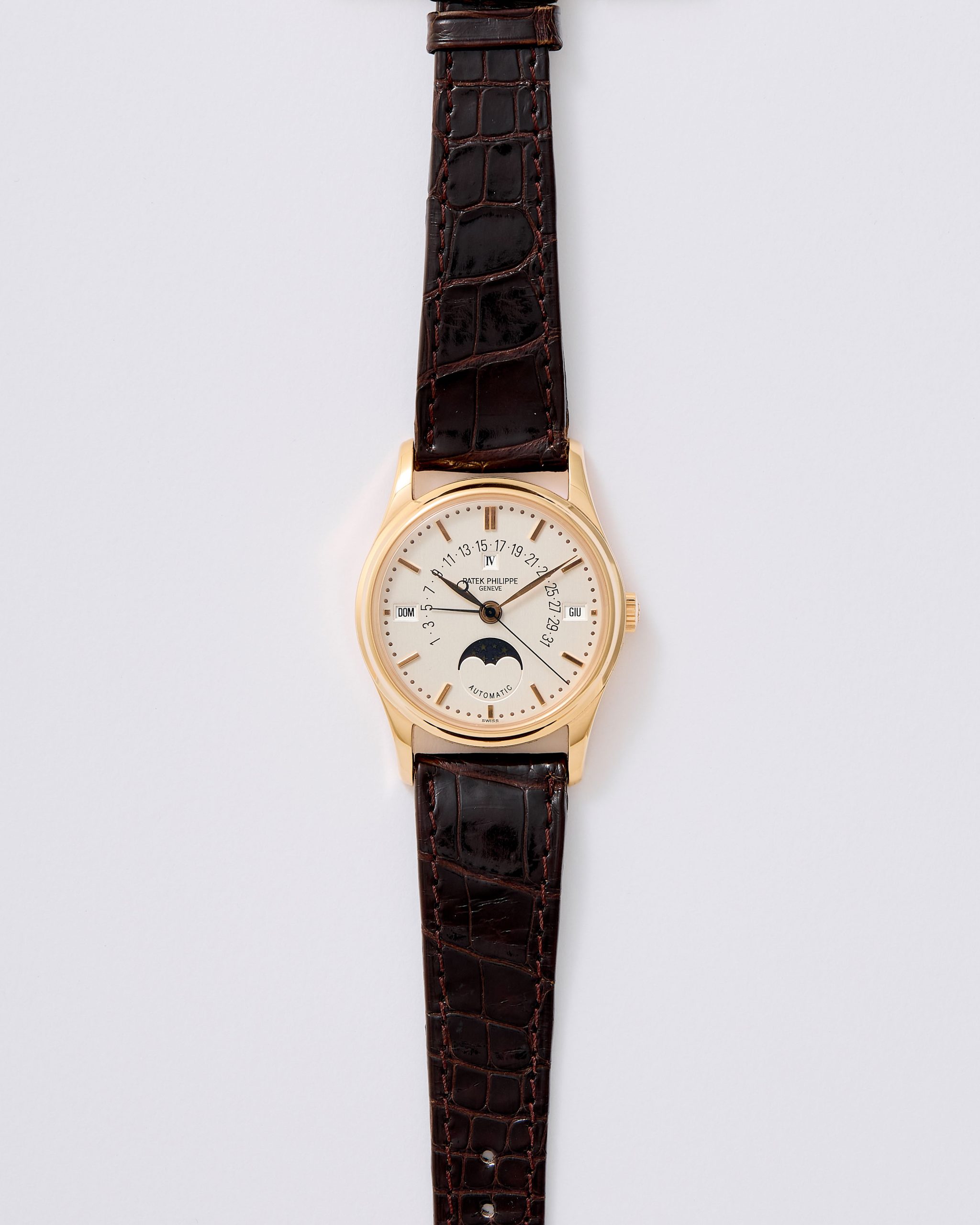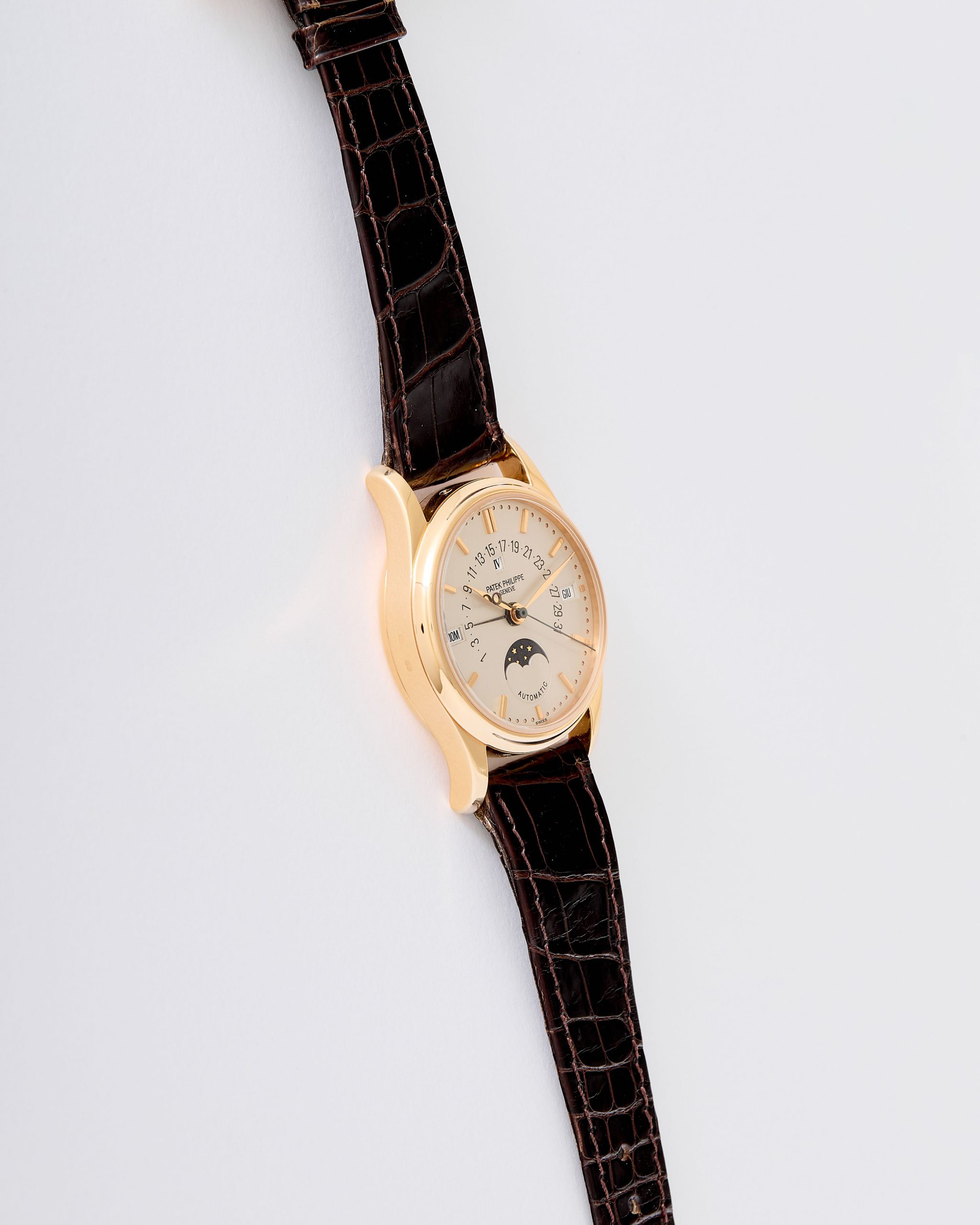 A refined and highly desirable Patek Philippe Calatrava Perpetual Calendar reference 5050R in 18K rose gold, dating to 1996. This elegant neo-vintage timepiece from the 1990s is particularly sought after in rose gold, a rarer and especially attractive configuration for this reference. The case has been lightly polished in the past but remains in very good overall condition, retaining well-defined lines with hallmarks clearly visible. The dial is flawless and beautifully preserved, showcasing the harmonious layout characteristic of the reference. The watch is powered by the self-winding caliber 315 S QR, featuring the distinctive retrograde date display combined with a perpetual calendar complication—one of the defining innovations of the model. It is fitted with its original vintage alligator strap and an 18K rose gold Patek Philippe buckle. The watch is offered as a full set with its original box and papers. Charming and sophisticated on the wrist, this neo-vintage Patek Philippe represents an appealing opportunity within a category that continues to attract strong collector interest.