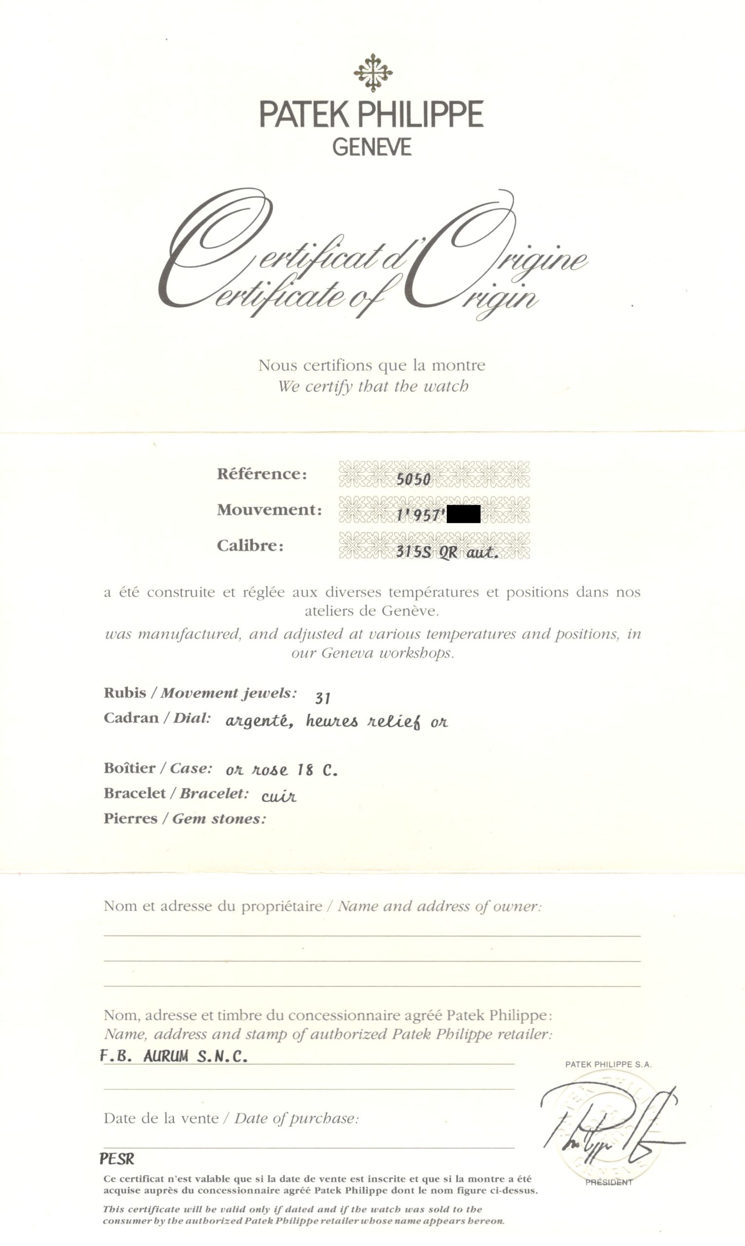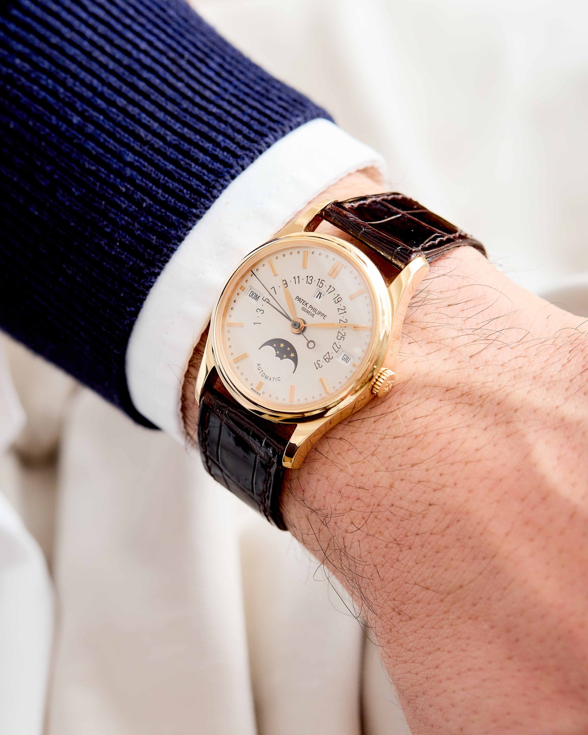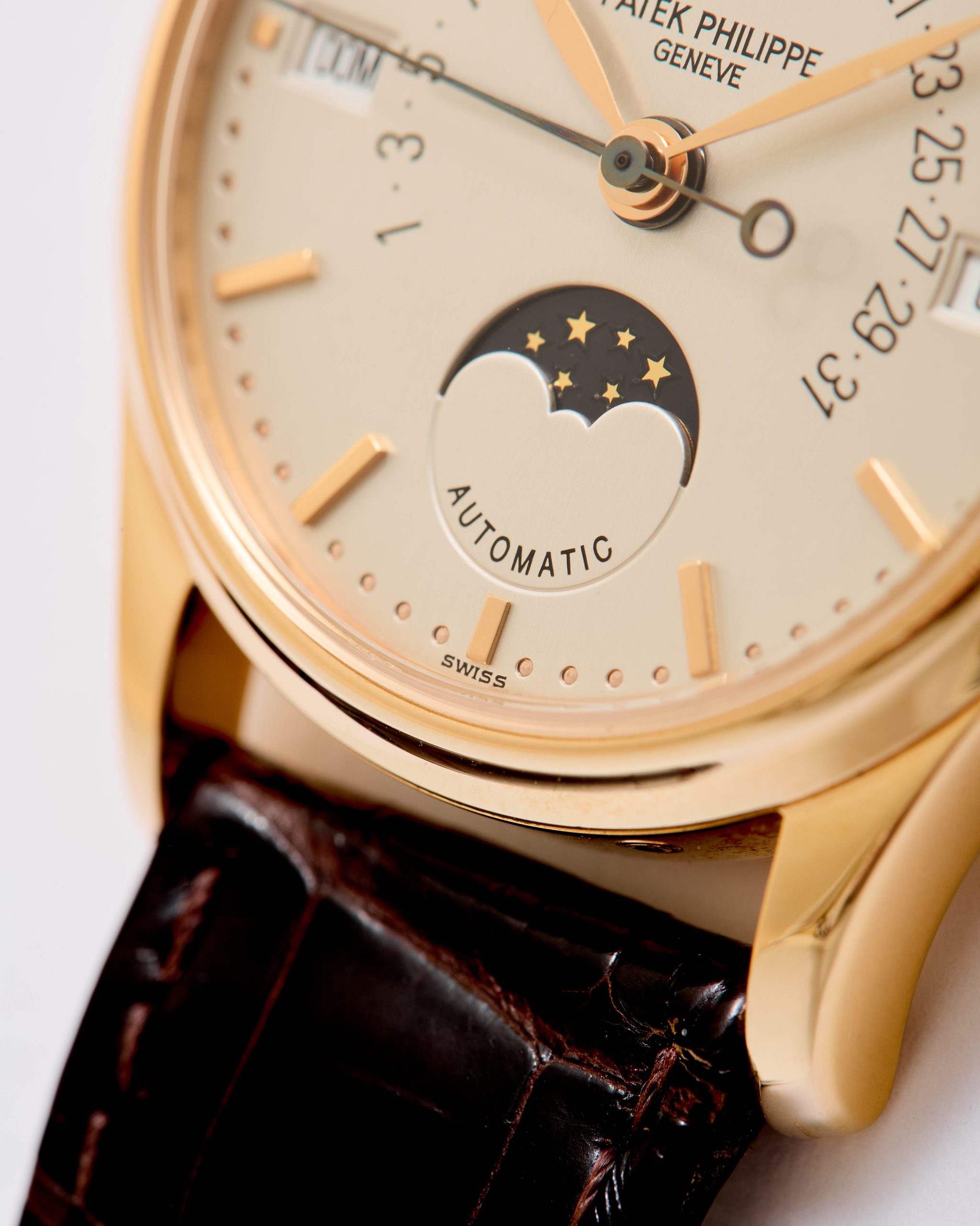 A refined and highly desirable Patek Philippe Calatrava Perpetual Calendar reference 5050R in 18K rose gold, dating to 1996. This elegant neo-vintage timepiece from the 1990s is particularly sought after in rose gold, a rarer and especially attractive configuration for this reference. The case has been lightly polished in the past but remains in very good overall condition, retaining well-defined lines with hallmarks clearly visible. The dial is flawless and beautifully preserved, showcasing the harmonious layout characteristic of the reference. The watch is powered by the self-winding caliber 315 S QR, featuring the distinctive retrograde date display combined with a perpetual calendar complication—one of the defining innovations of the model. It is fitted with its original vintage alligator strap and an 18K rose gold Patek Philippe buckle. The watch is offered as a full set with its original box and papers. Charming and sophisticated on the wrist, this neo-vintage Patek Philippe represents an appealing opportunity within a category that continues to attract strong collector interest.