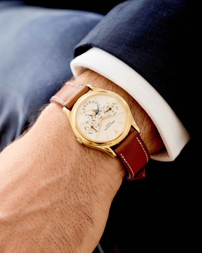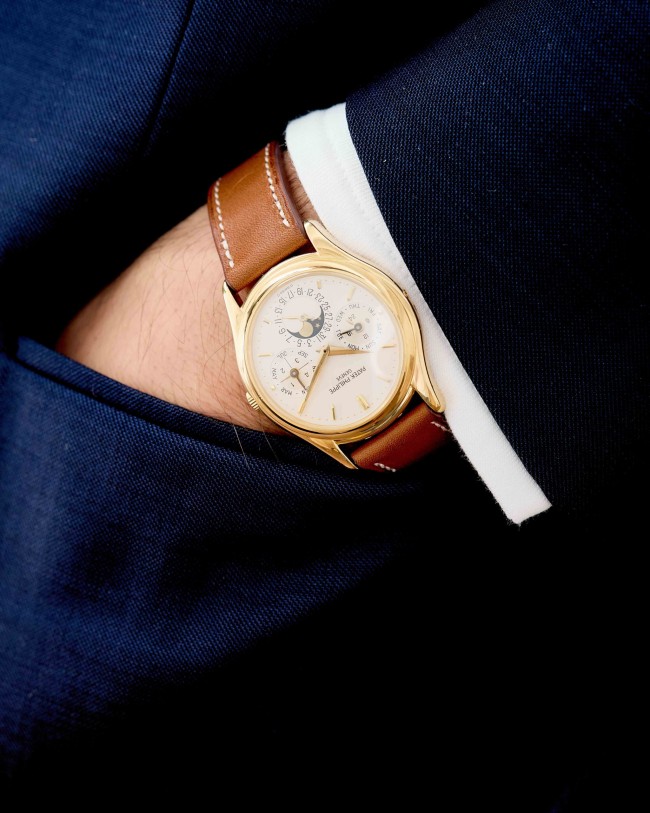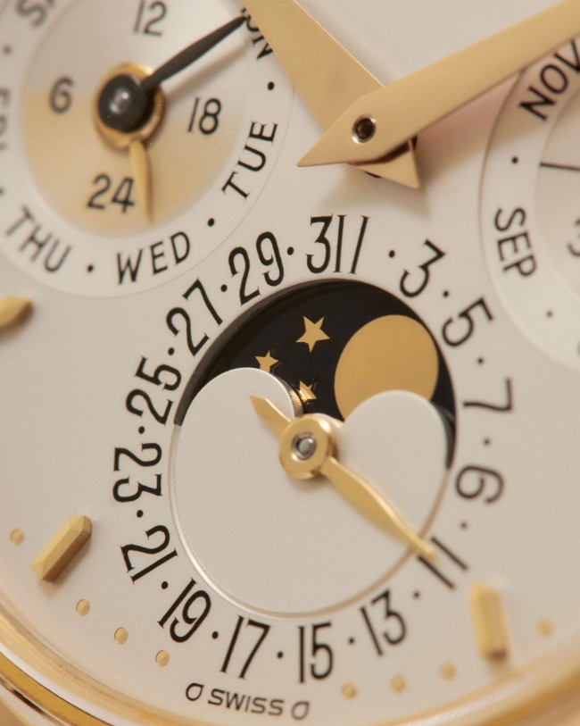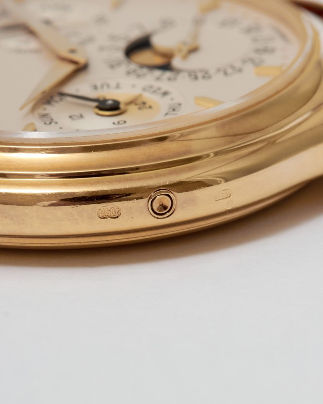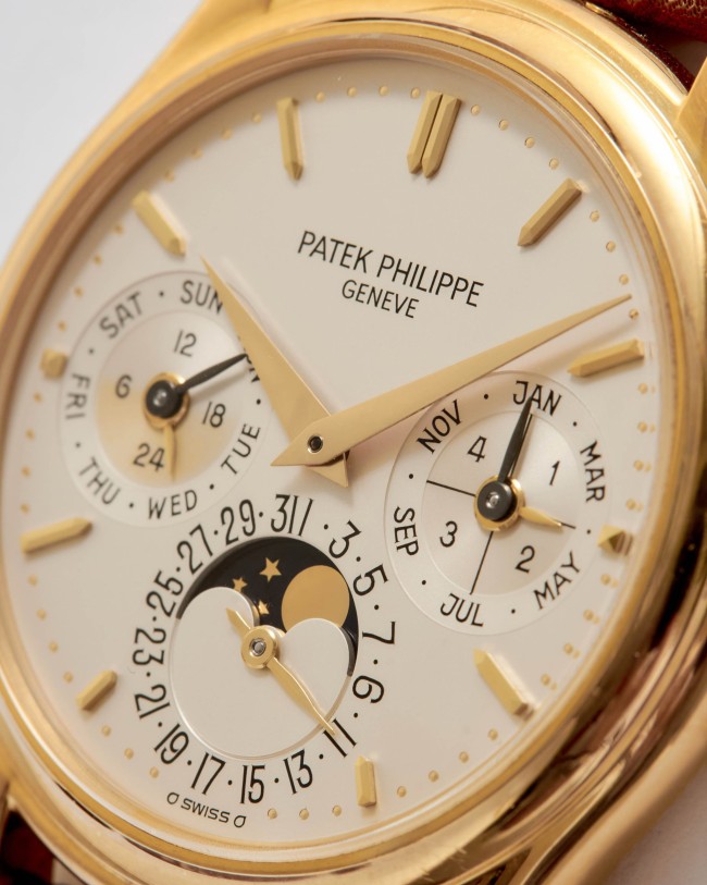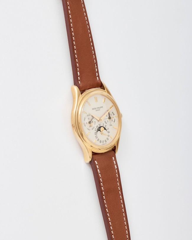 18K gold Patek Philippe perpetual calendar ref. 3940. An icon of 1990s watch design, this second-series Ref. 3940 embodies timeless elegance with its classical shape and ideal proportions. Originally purchased in Italy in 1990, it is offered here in excellent condition and as a complete set. The case remains in very good condition, showing minor signs of use while retaining its thickness and sharp lines. All gold hallmarks are clearly visible. The dial is flawless, without any signs of wear. Powered by the self-winding Caliber 240Q, the watch is fitted with a leather strap and the original vintage Patek Philippe gold buckle. It is accompanied by its box and papers, dated June 1990. Comfortable and discreet on the wrist, with a clear and highly legible dial, this perpetual calendar is perfectly suited for everyday wear.