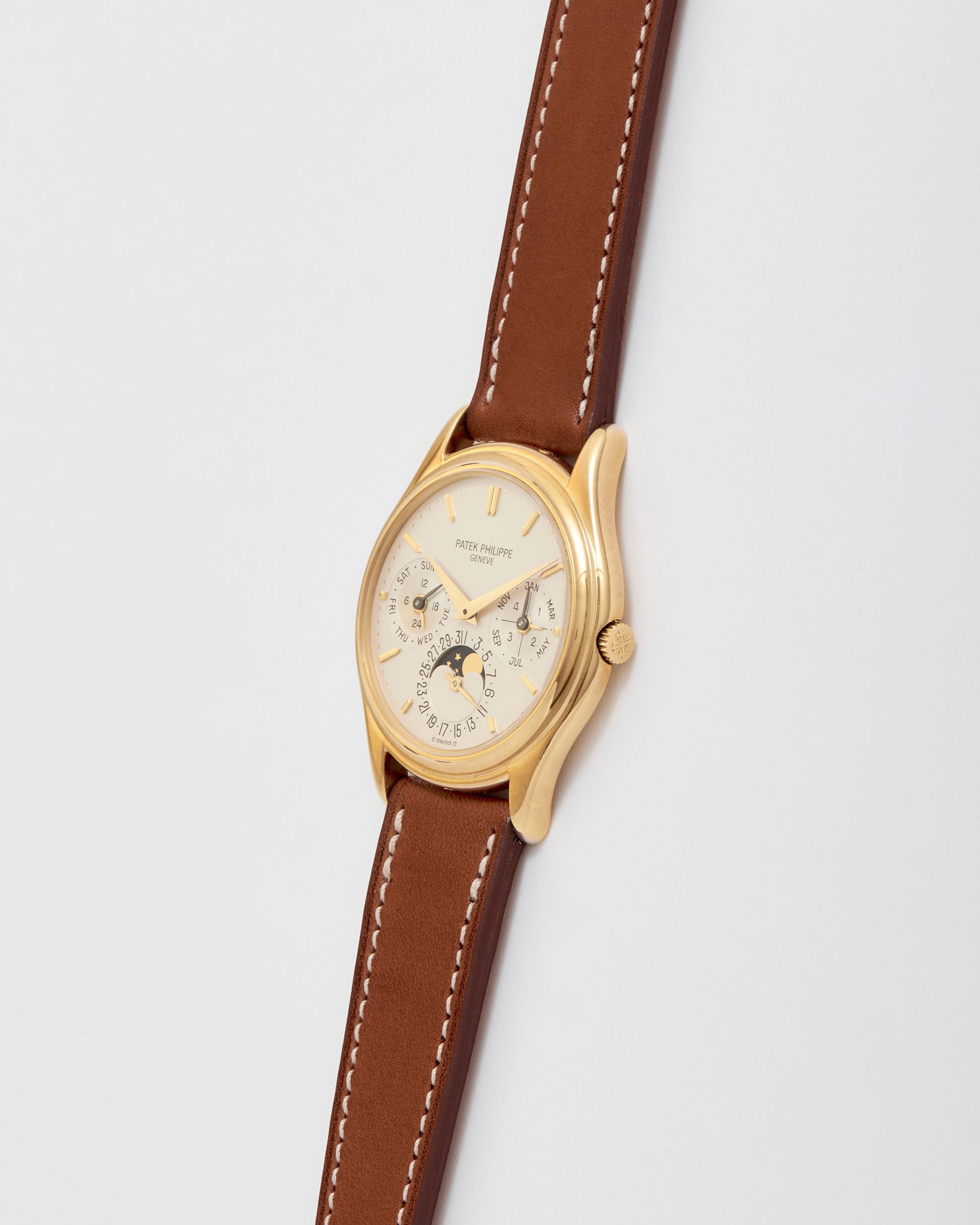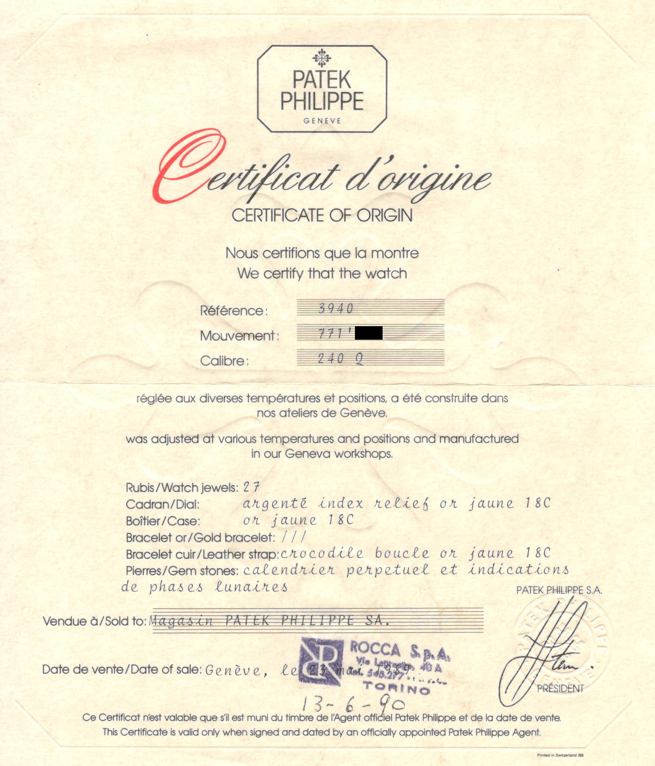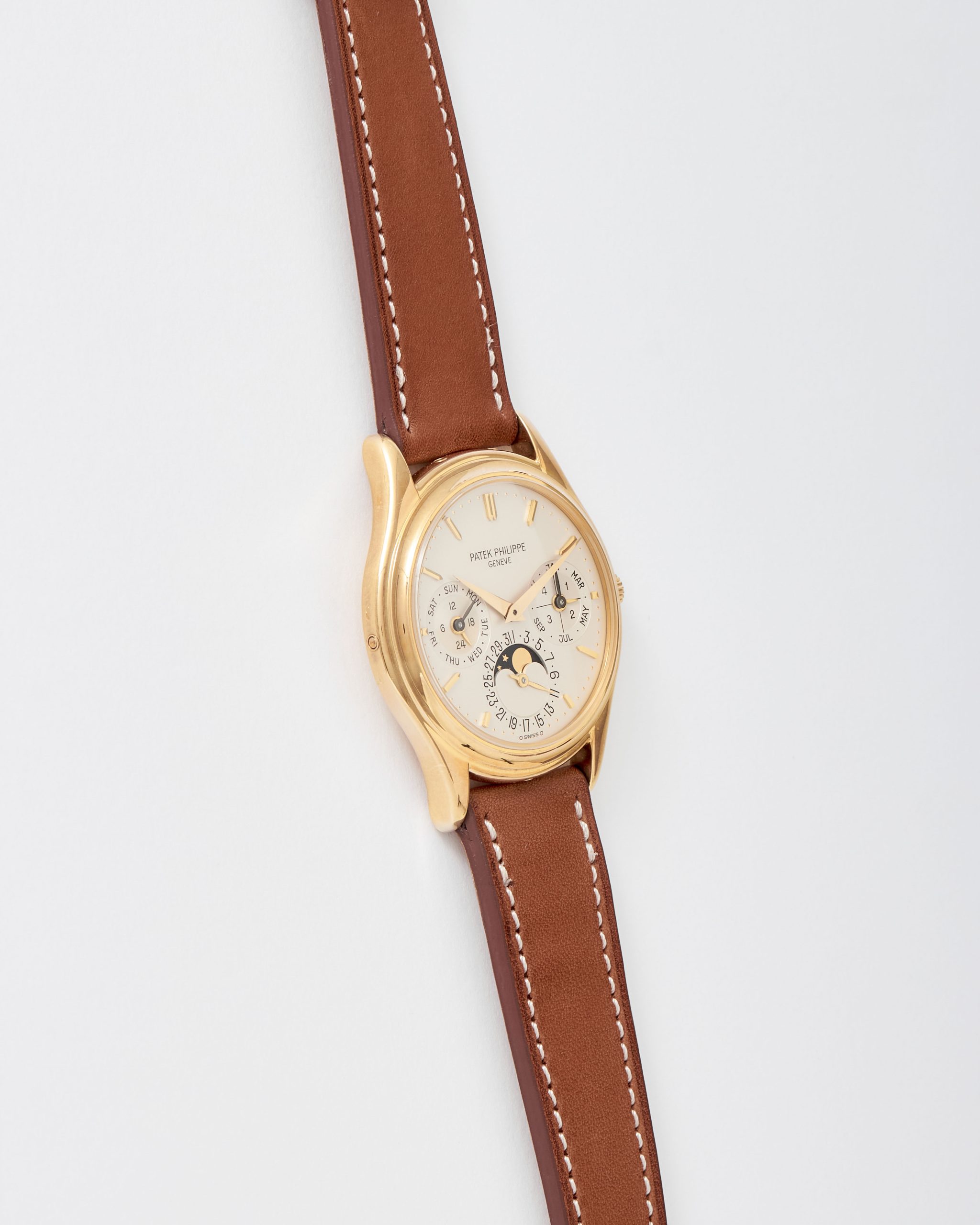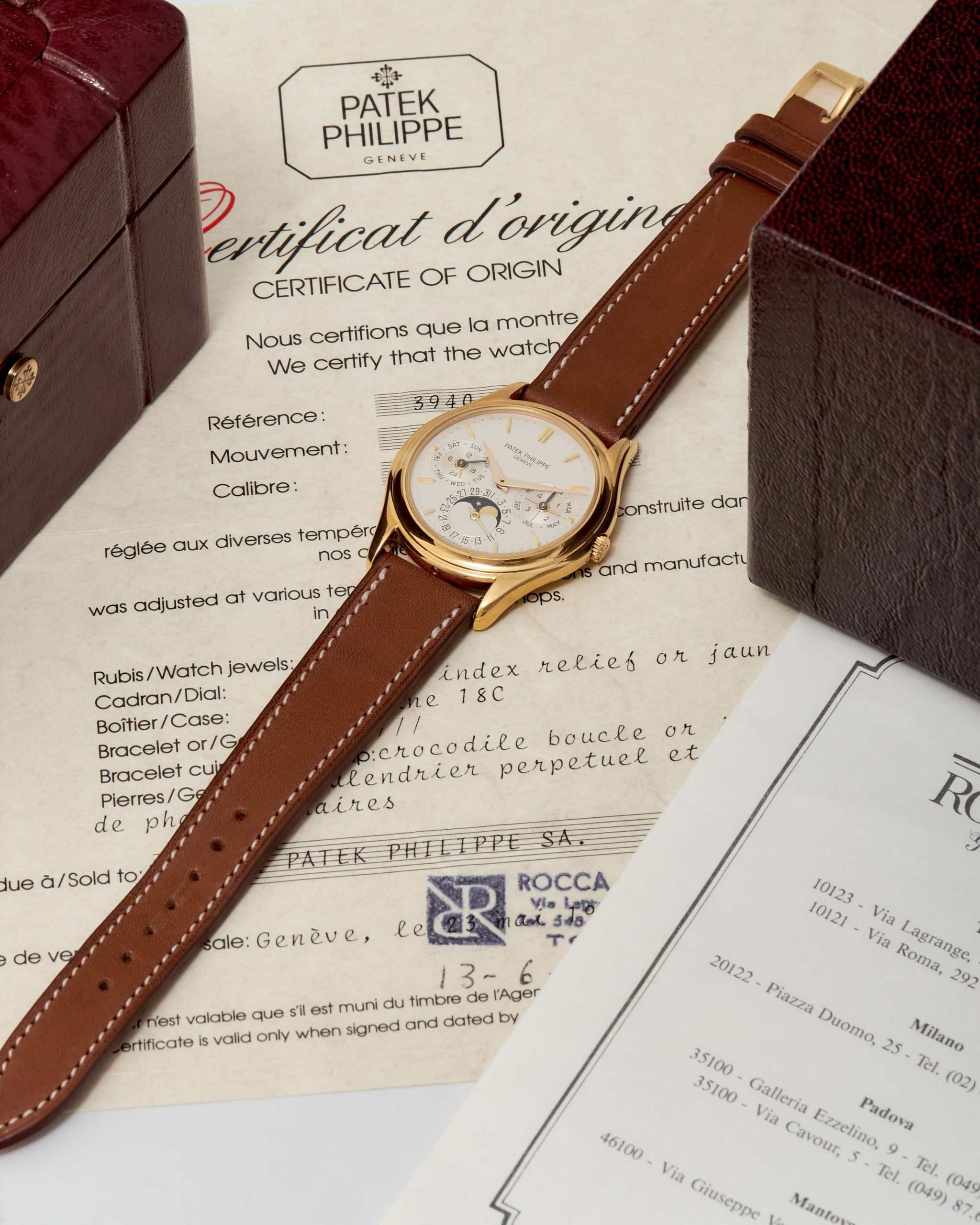 18K gold Patek Philippe perpetual calendar ref. 3940. An icon of 1990s watch design, this second-series Ref. 3940 embodies timeless elegance with its classical shape and ideal proportions. Originally purchased in Italy in 1990, it is offered here in excellent condition and as a complete set. The case remains in very good condition, showing minor signs of use while retaining its thickness and sharp lines. All gold hallmarks are clearly visible. The dial is flawless, without any signs of wear. Powered by the self-winding Caliber 240Q, the watch is fitted with a leather strap and the original vintage Patek Philippe gold buckle. It is accompanied by its box and papers, dated June 1990. Comfortable and discreet on the wrist, with a clear and highly legible dial, this perpetual calendar is perfectly suited for everyday wear.