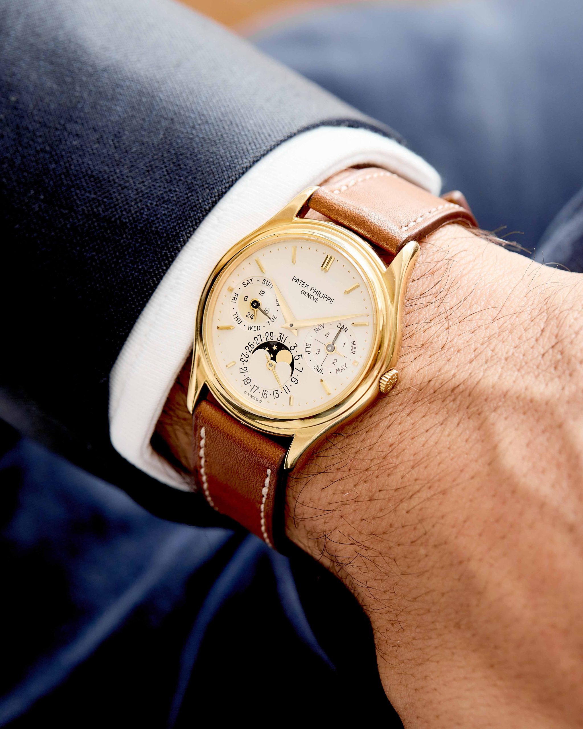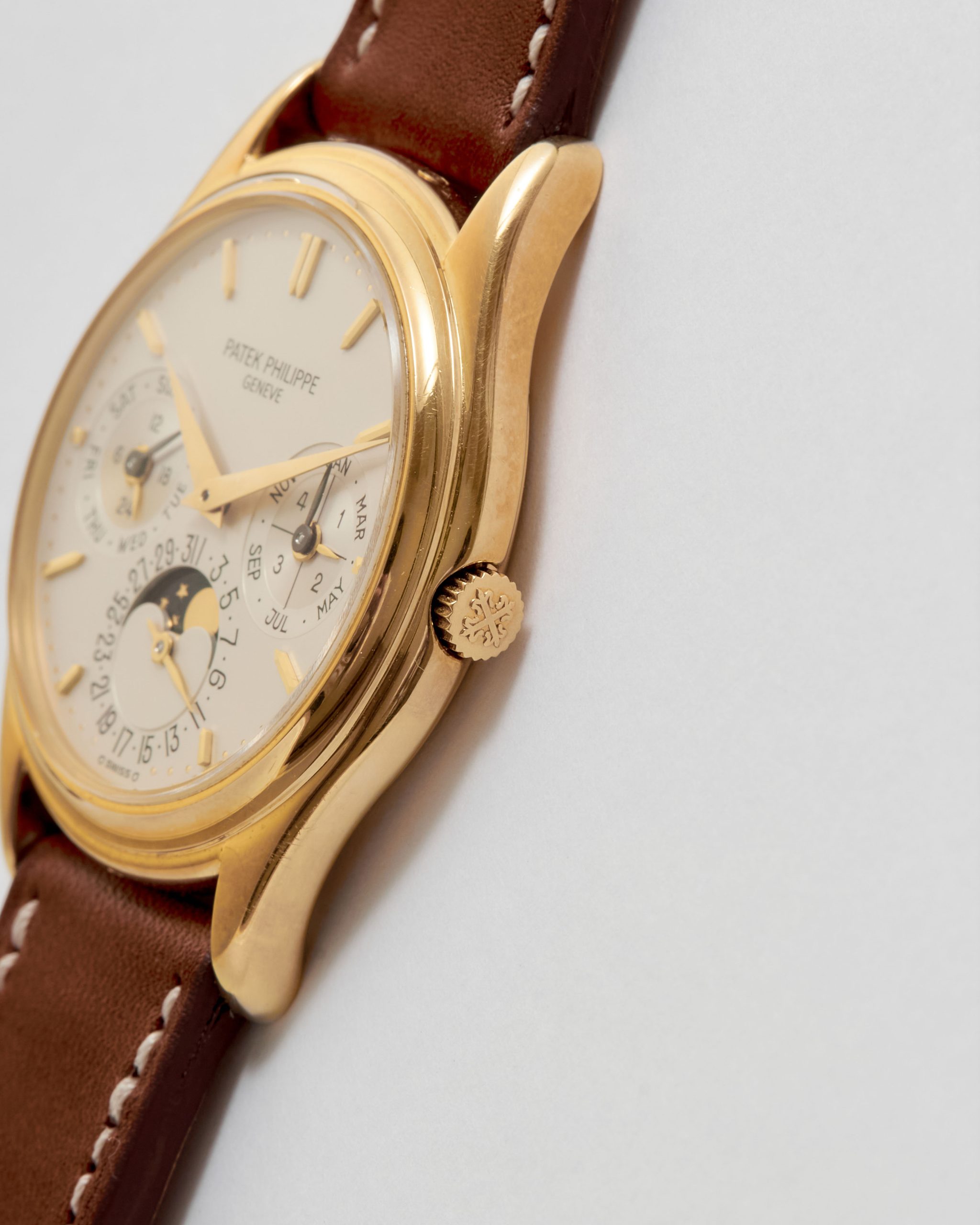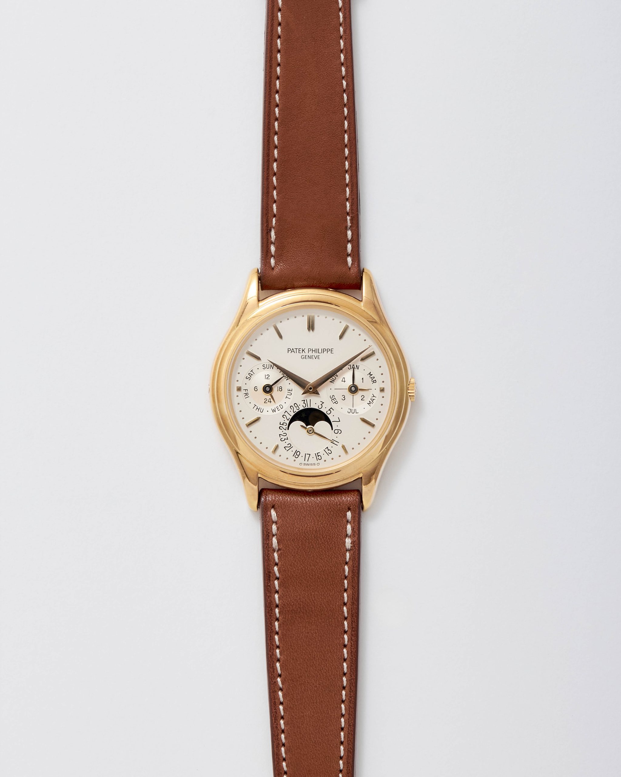 18K gold Patek Philippe perpetual calendar ref. 3940. An icon of 1990s watch design, this second-series Ref. 3940 embodies timeless elegance with its classical shape and ideal proportions. Originally purchased in Italy in 1990, it is offered here in excellent condition and as a complete set. The case remains in very good condition, showing minor signs of use while retaining its thickness and sharp lines. All gold hallmarks are clearly visible. The dial is flawless, without any signs of wear. Powered by the self-winding Caliber 240Q, the watch is fitted with a leather strap and the original vintage Patek Philippe gold buckle. It is accompanied by its box and papers, dated June 1990. Comfortable and discreet on the wrist, with a clear and highly legible dial, this perpetual calendar is perfectly suited for everyday wear.