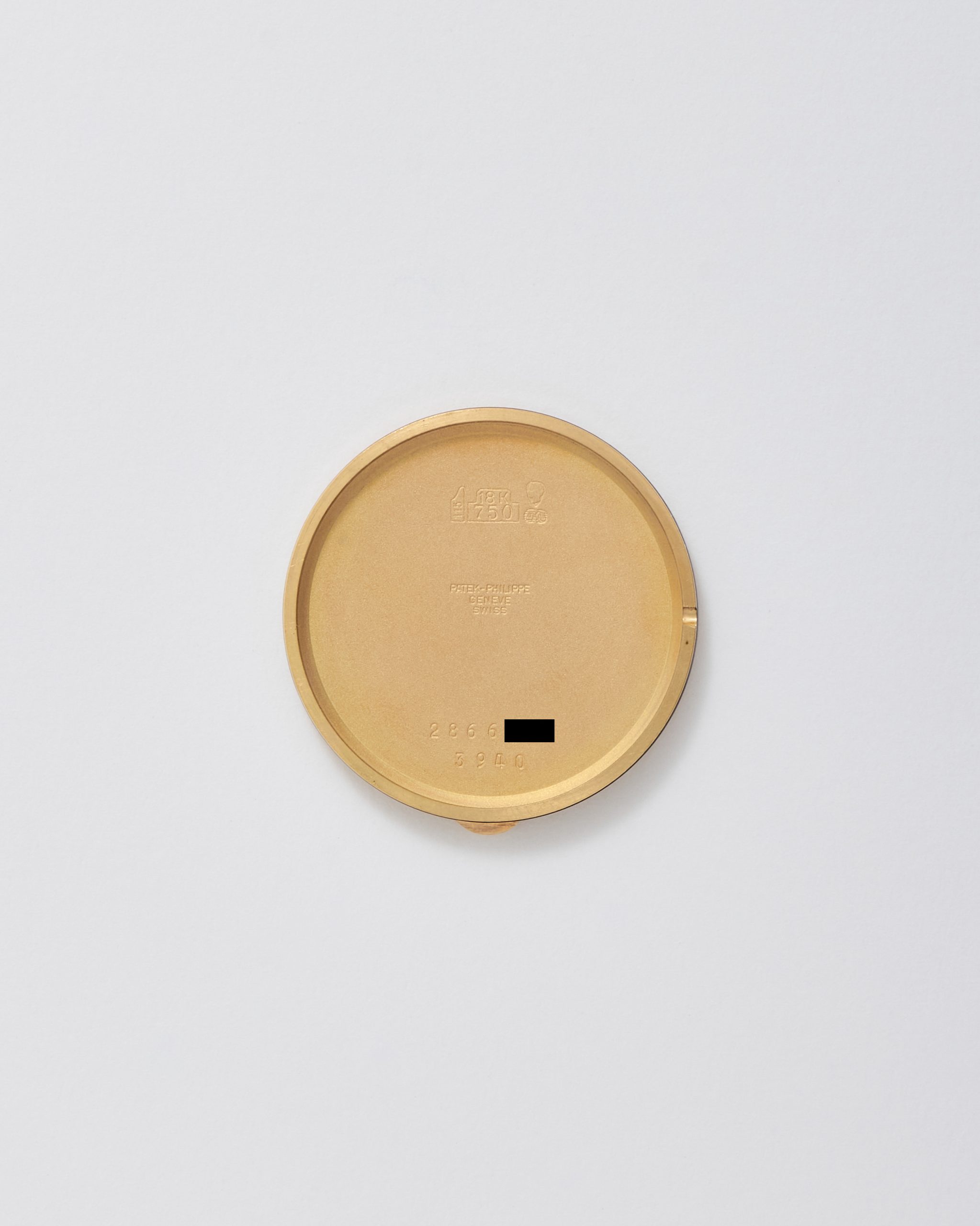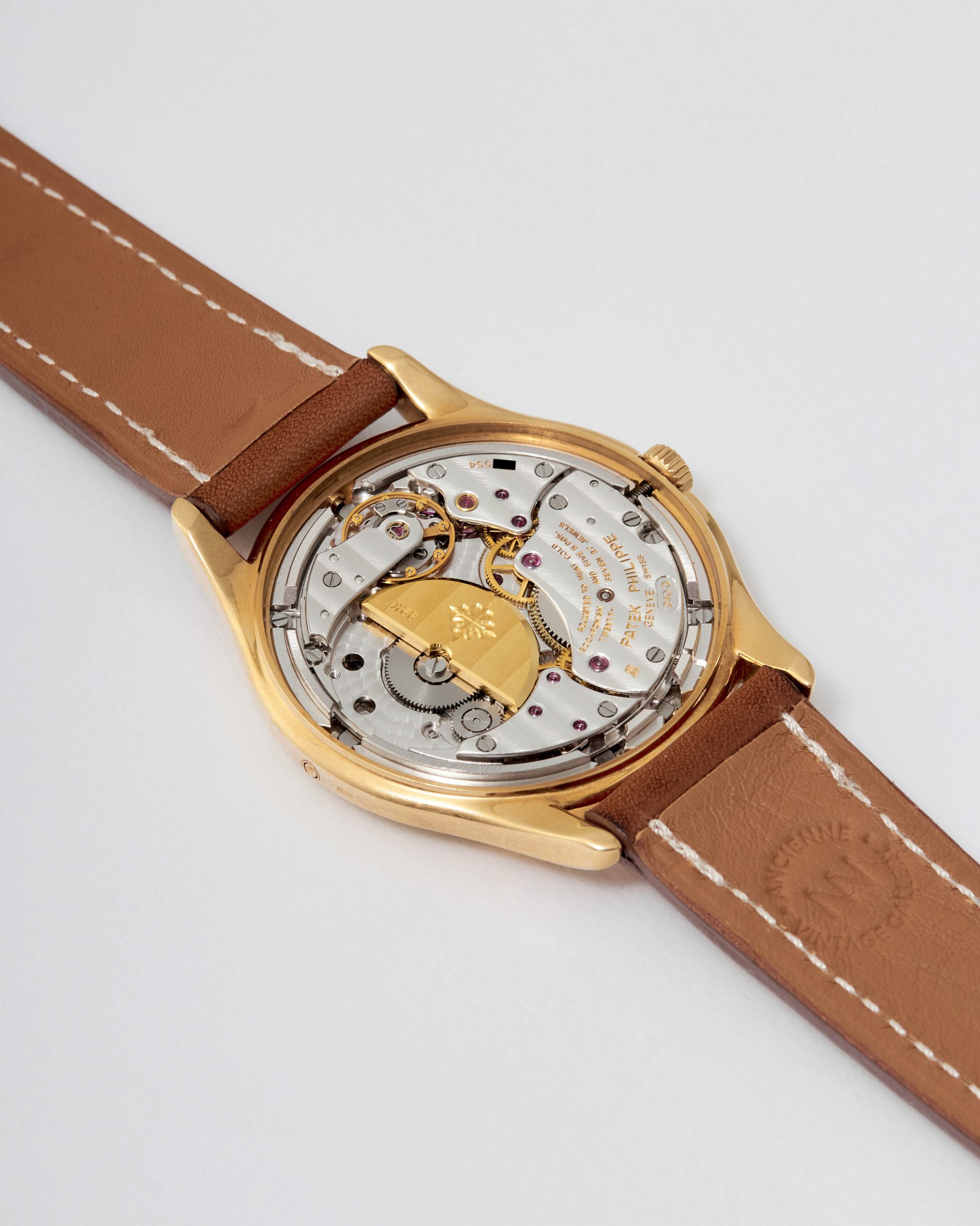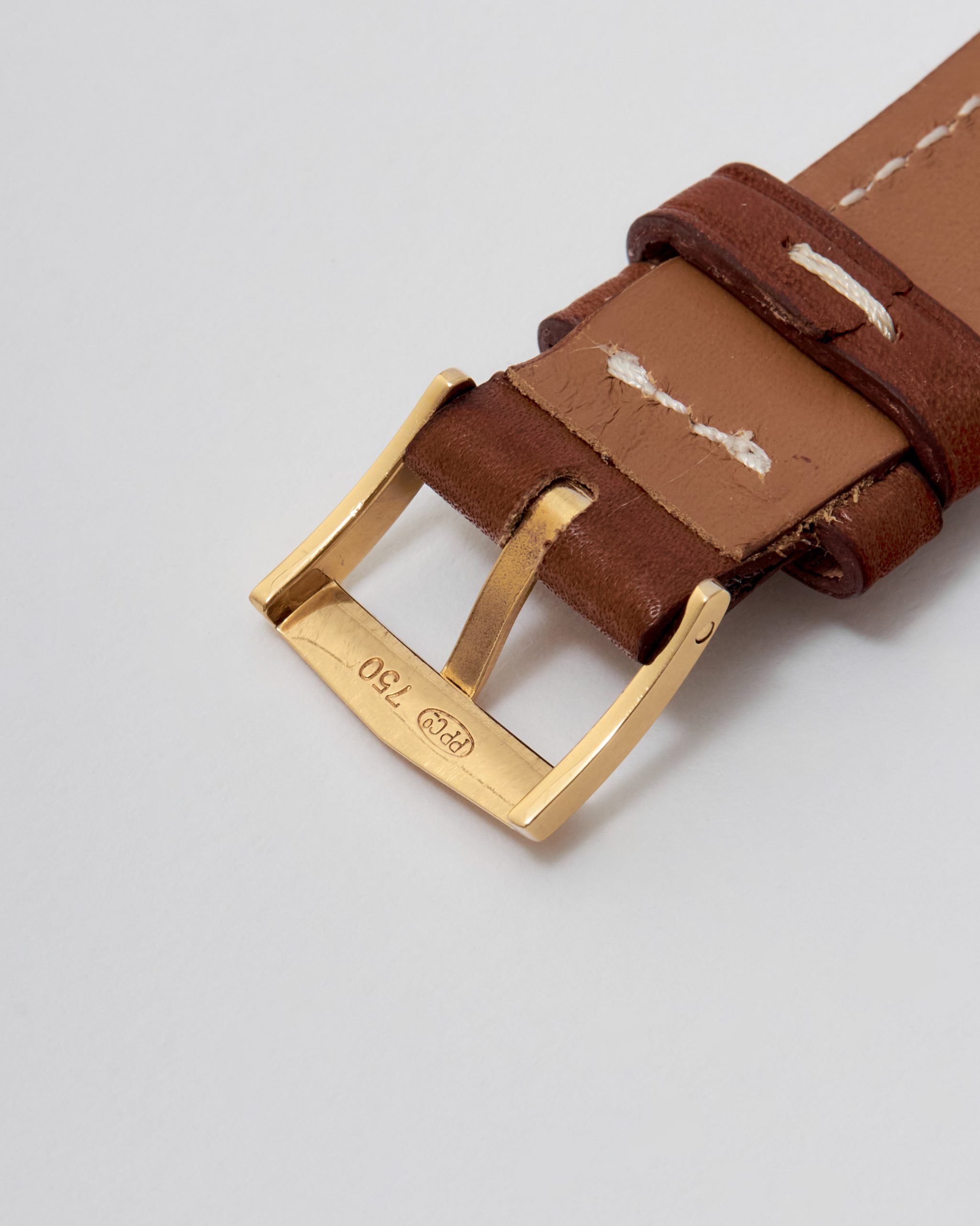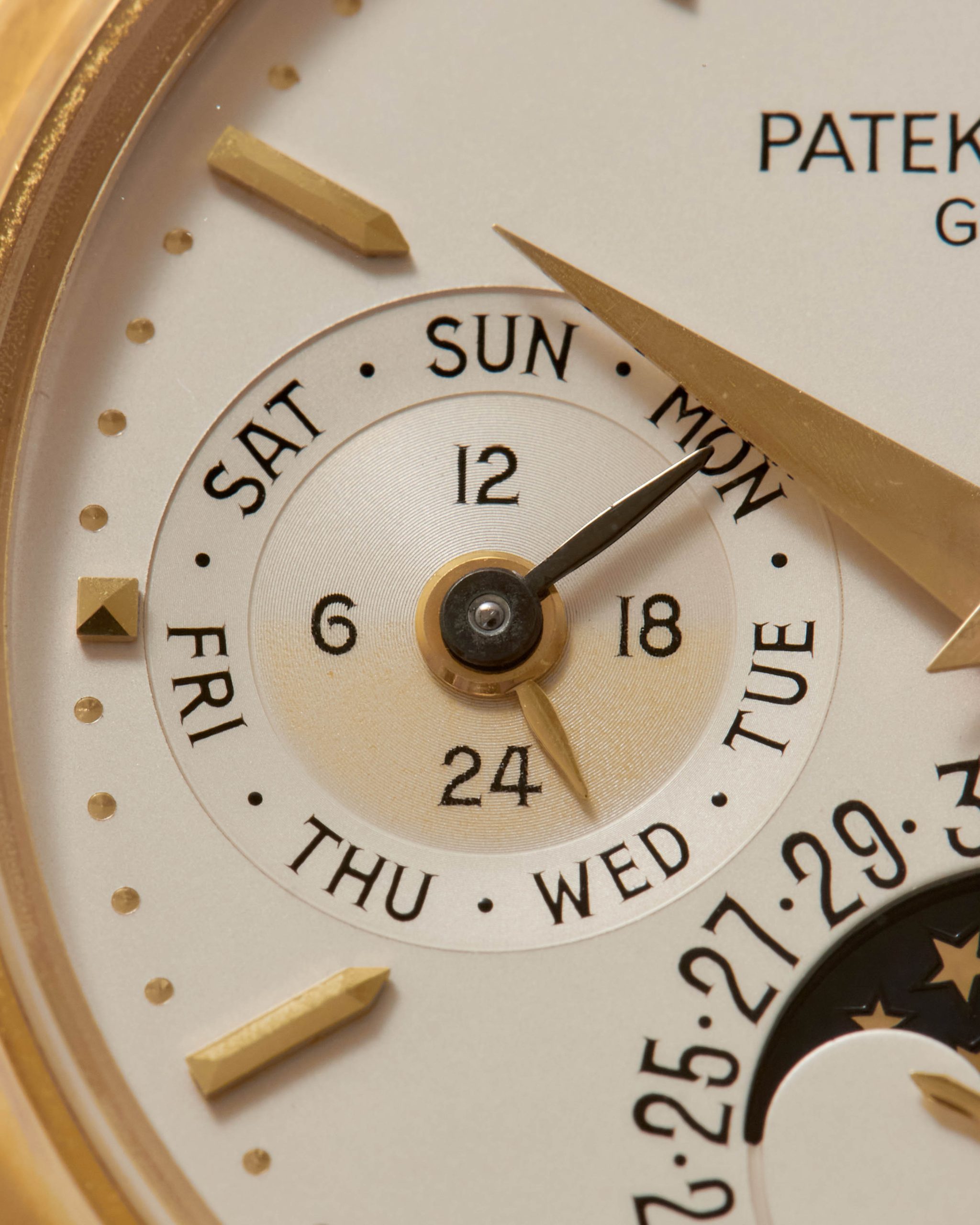 18K gold Patek Philippe perpetual calendar ref. 3940. An icon of 1990s watch design, this second-series Ref. 3940 embodies timeless elegance with its classical shape and ideal proportions. Originally purchased in Italy in 1990, it is offered here in excellent condition and as a complete set. The case remains in very good condition, showing minor signs of use while retaining its thickness and sharp lines. All gold hallmarks are clearly visible. The dial is flawless, without any signs of wear. Powered by the self-winding Caliber 240Q, the watch is fitted with a leather strap and the original vintage Patek Philippe gold buckle. It is accompanied by its box and papers, dated June 1990. Comfortable and discreet on the wrist, with a clear and highly legible dial, this perpetual calendar is perfectly suited for everyday wear.