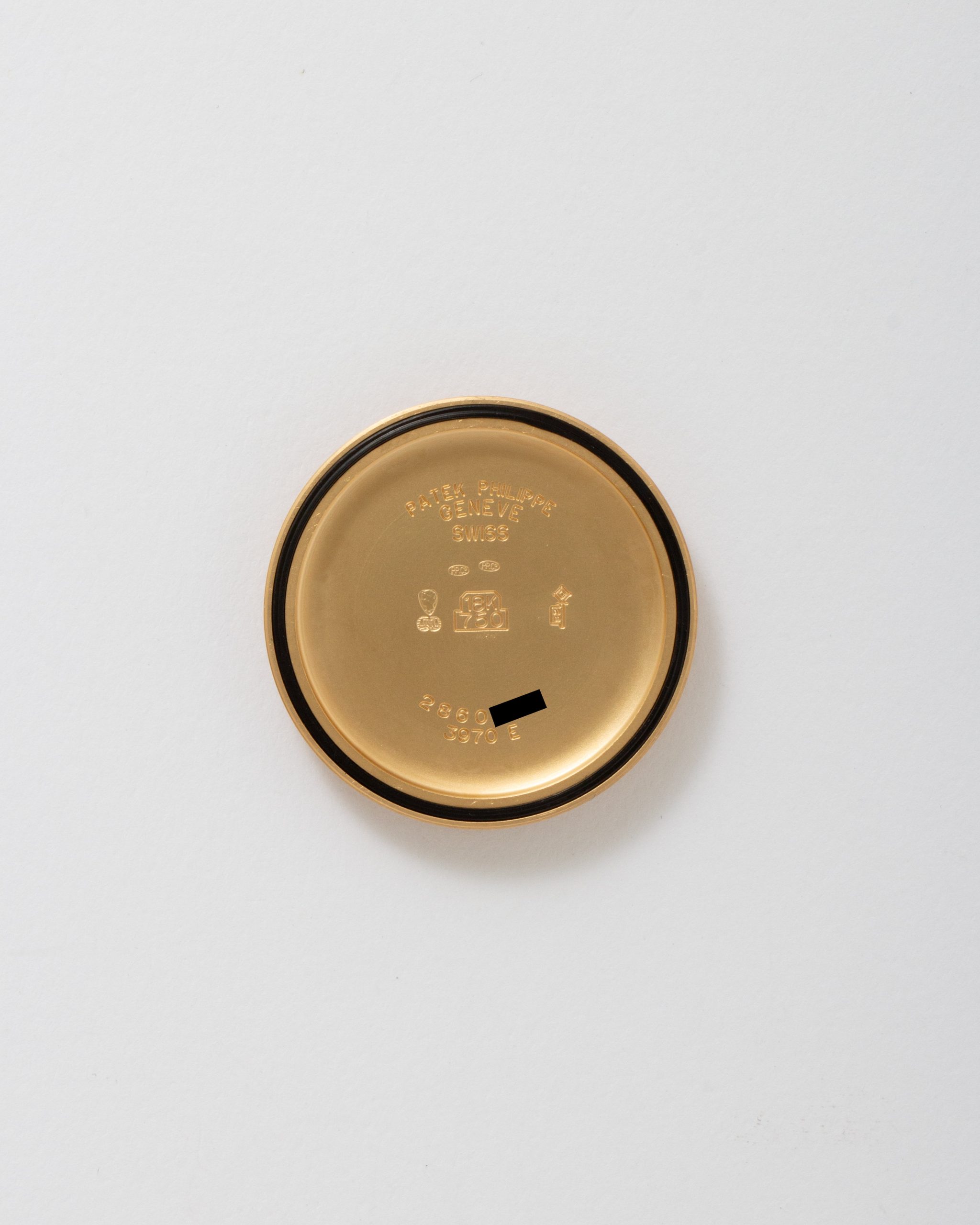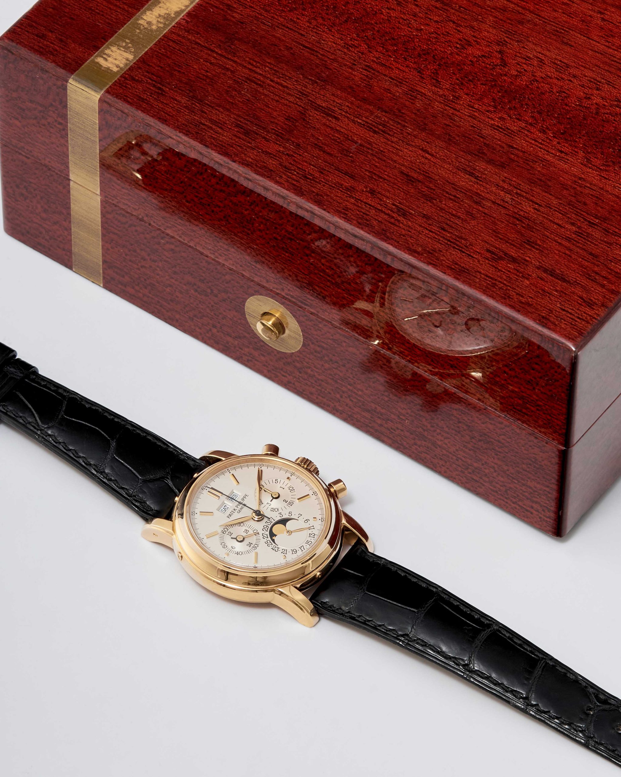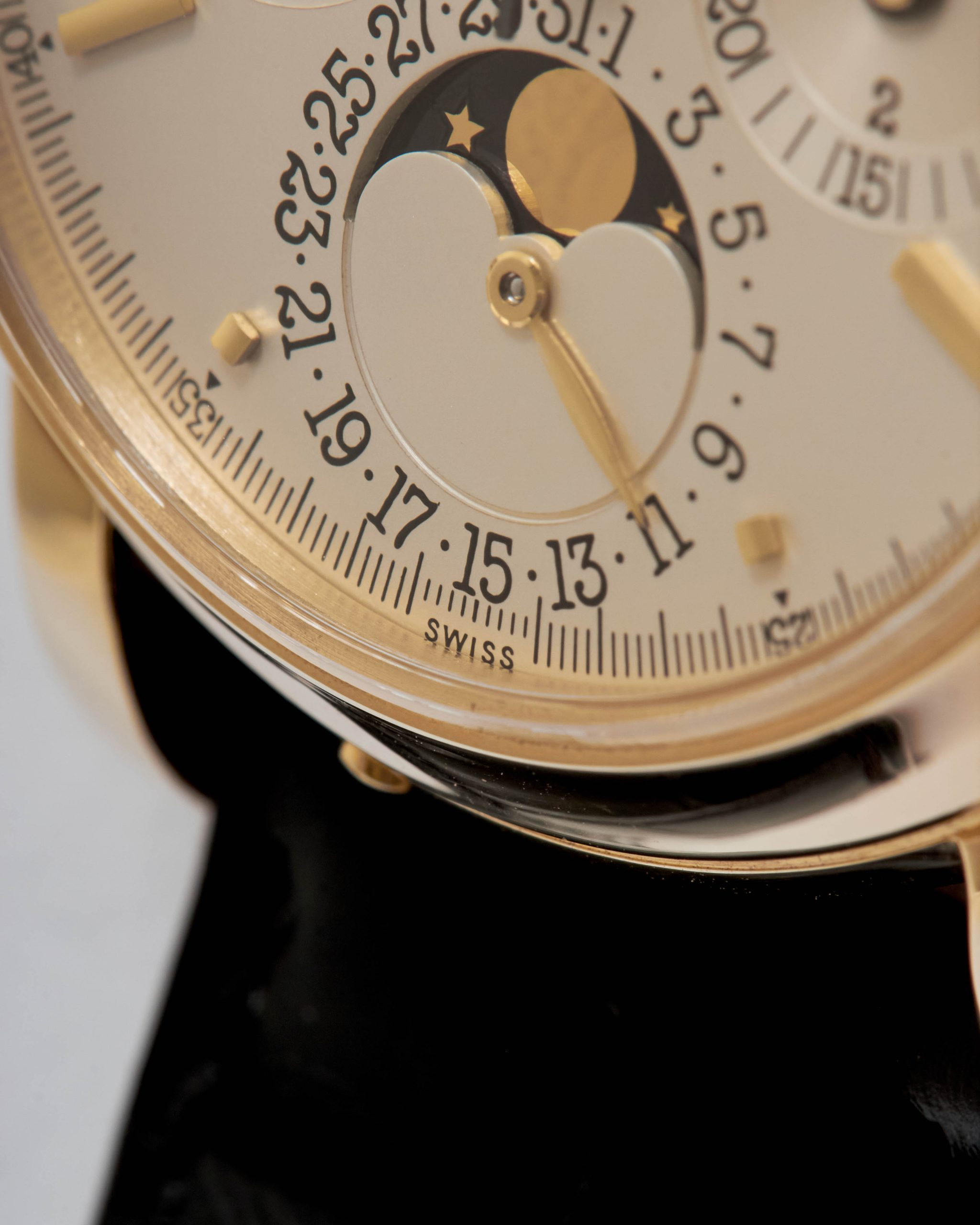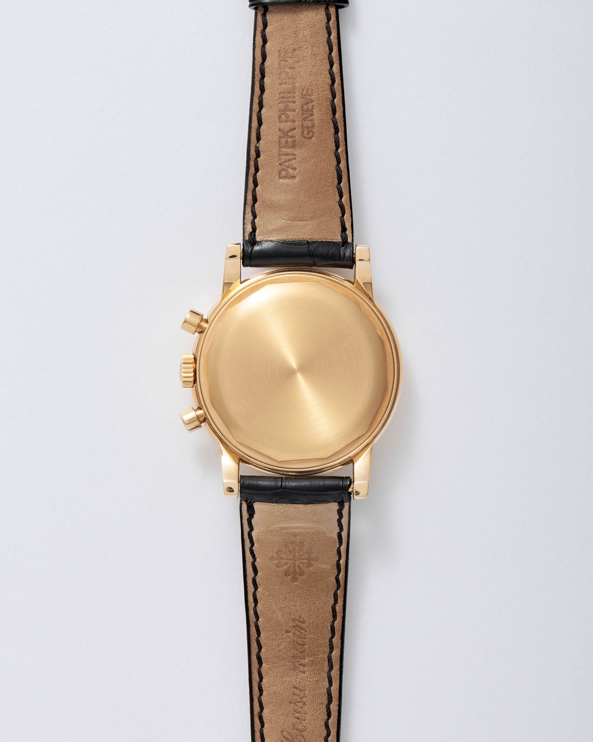 18K gold Patek Philippe perpetual calendar chronograph ref. 3970. A highly coveted 2nd series of the legendary Patek Philippe Ref. 3970 from the late 1980s. This timepiece has been gently used but remains in excellent condition, featuring a crisp case with clearly visible hallmarks. The dial is flawless, showing no signs of wear. Powered by the manual-winding CH 27-70Q movement, this watch comes with a Patek Philippe alligator strap, its original box, and an extract from the archives. As one of the last references before significant design evolutions in the brand’s collection, this model embodies the timeless craftsmanship and vintage charm of Patek Philippe’s classical production.