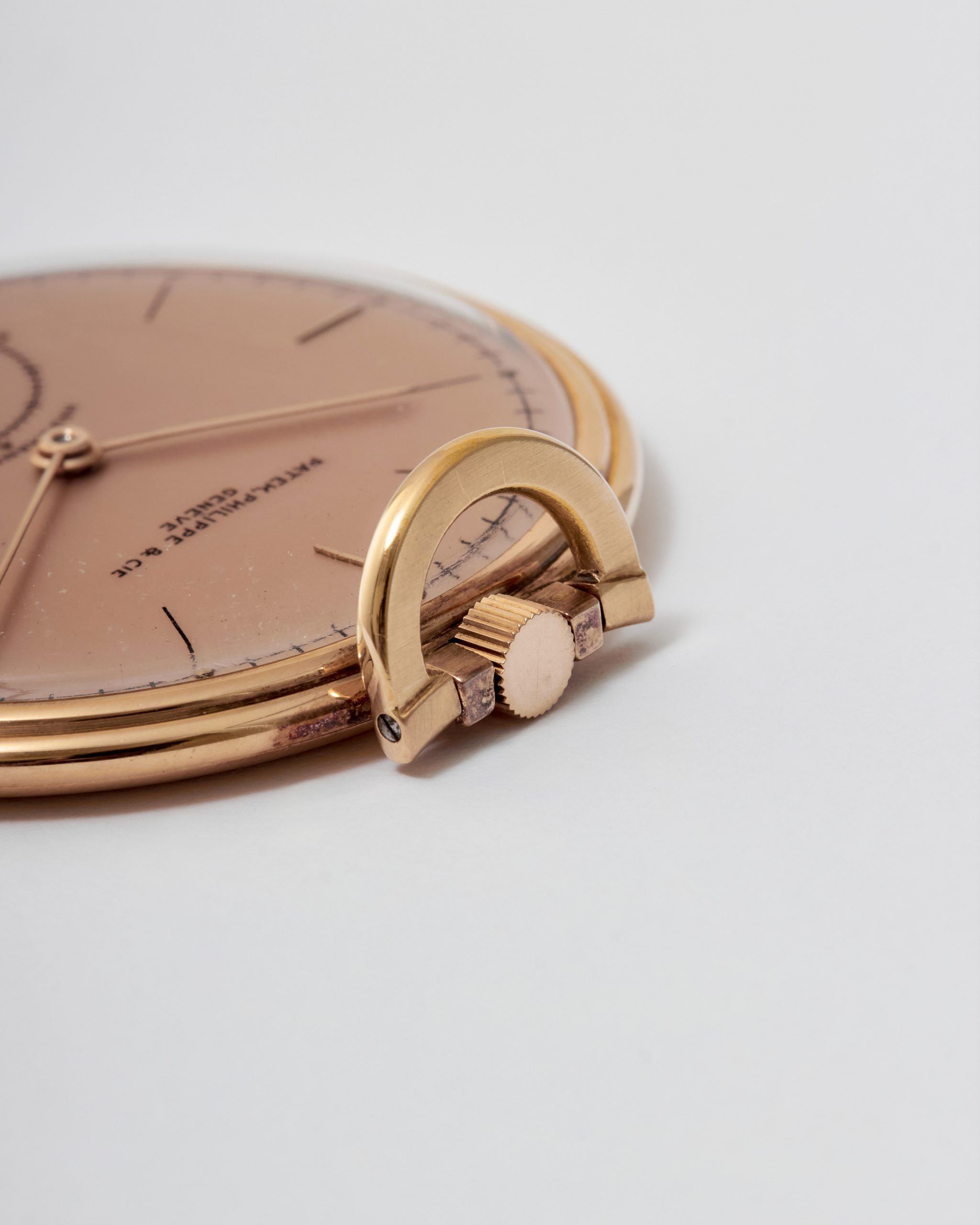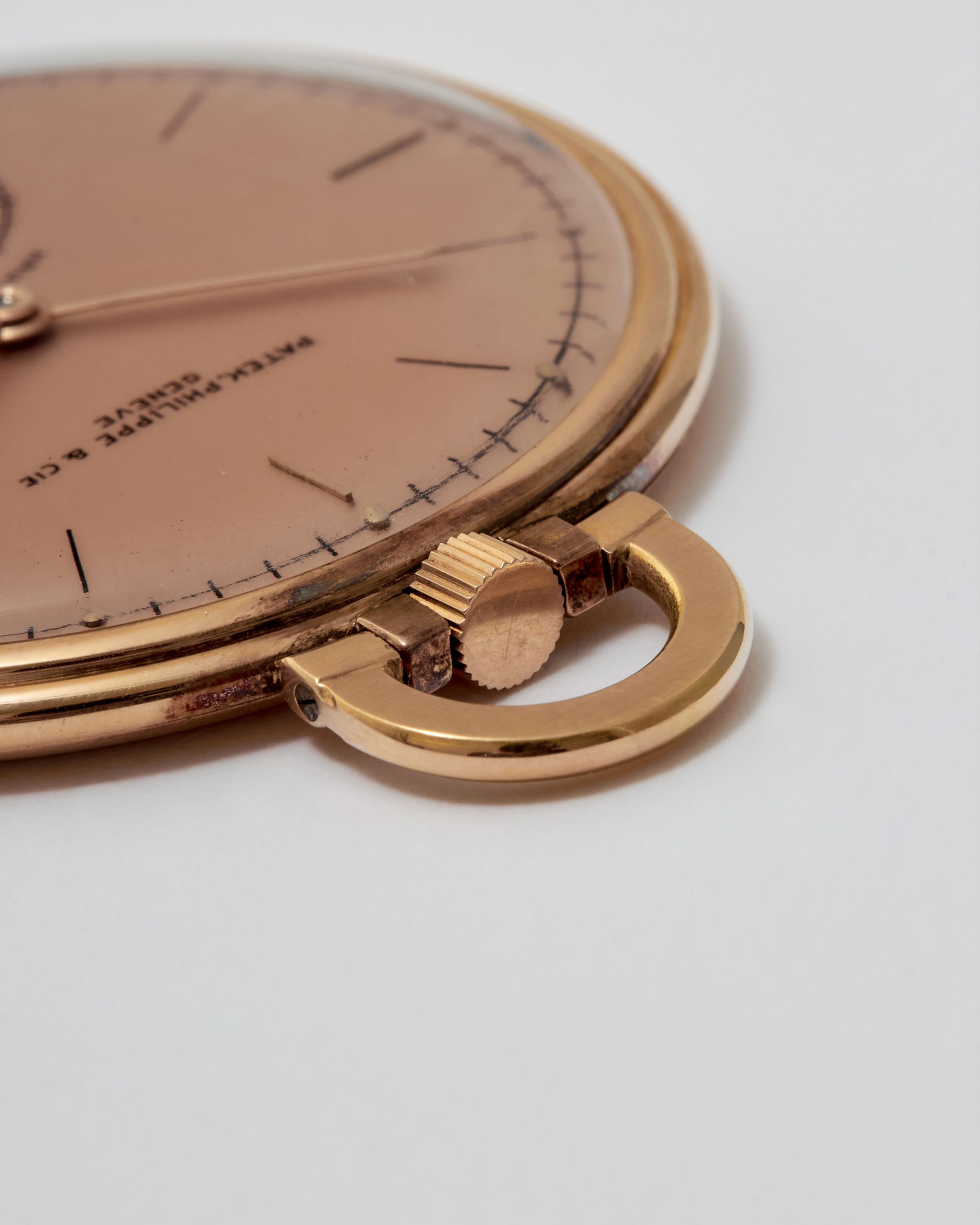 18K Pink gold Patek Philippe pocket watch ref. 716. In exceptional condition and featuring a stunning double-signed pink dial, this exquisite pocket watch is sure to command attention. The case shows minimal signs of polishing and remains beautifully preserved. The dial is flawless, showcasing crisp enamel graphics and a prestigious signature from a renowned Italian retailer based in Rome. The 47mm case offers a refined and elegant presence, making it both visually striking and surprisingly wearable. Powered by the manual-winding Caliber 17‴14/12, this watch is accompanied by its Extract from the Archives. A wonderful opportunity for collectors, especially those looking to begin or enhance a distinguished pocket watch collection.