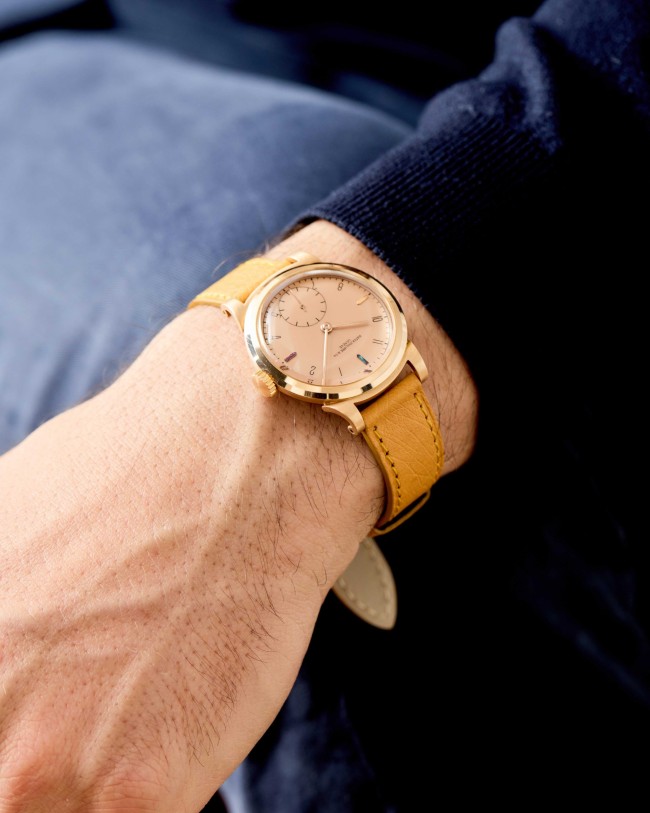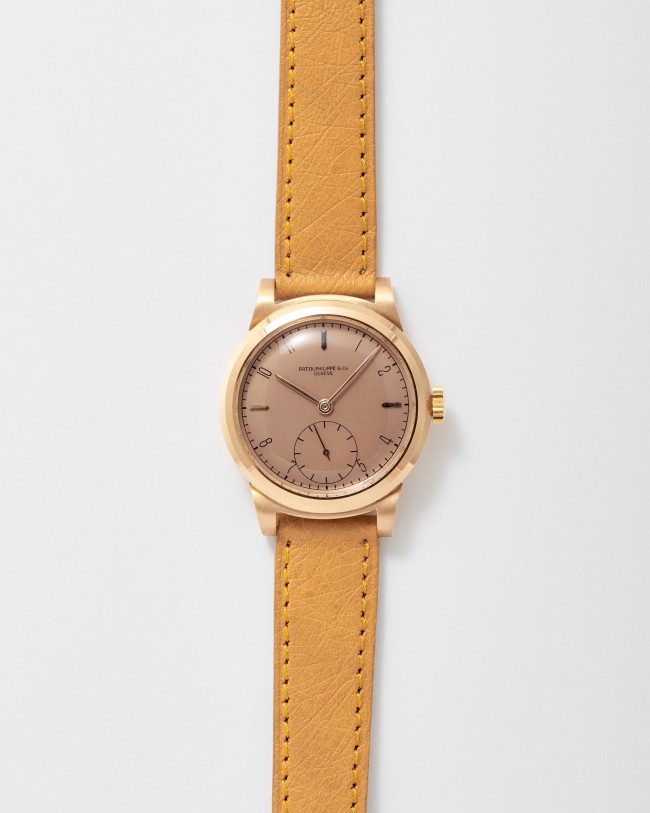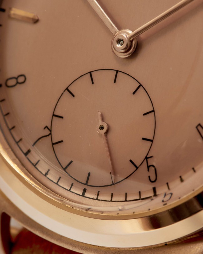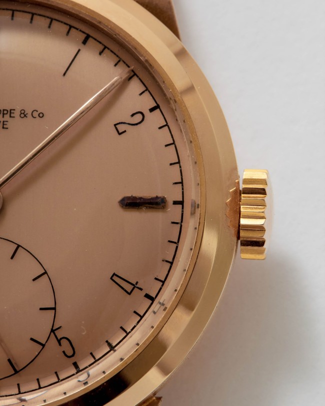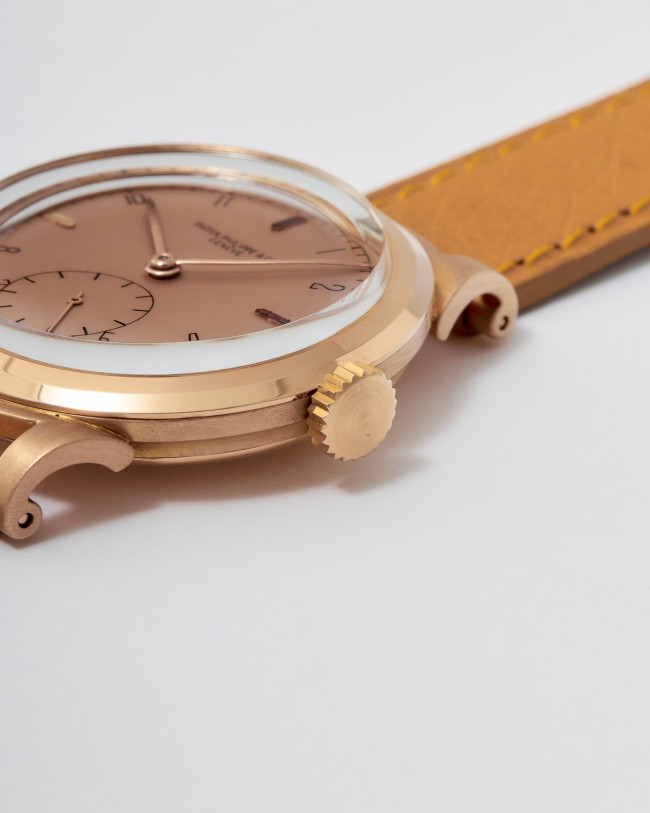 18K Rose Gold Patek Philippe Ref. 1491. An exceptional “like new” example of the iconic Patek Philippe “Ricciolo” with a stunning pink dial. This rare pink-on-pink configuration is made even more remarkable by its mint condition. The watch appears to have never been worn, preserving its sharp, untouched case and flawless dial. Powered by a manual-winding movement, this timepiece is fitted with a leather strap, retains its original box, and is accompanied by an Extract from the Archives confirming its sale in 1942. A true time capsule, this watch is destined for the most discerning collectors seeking only the finest quality.