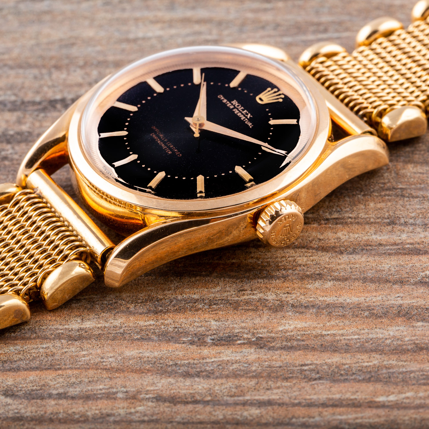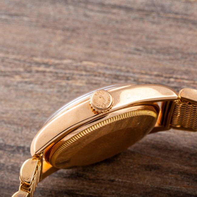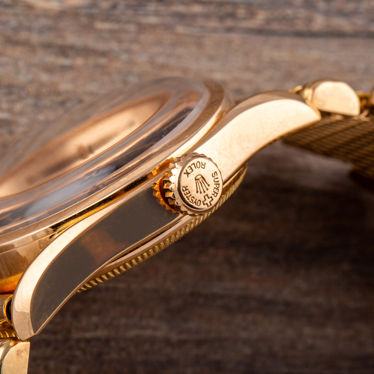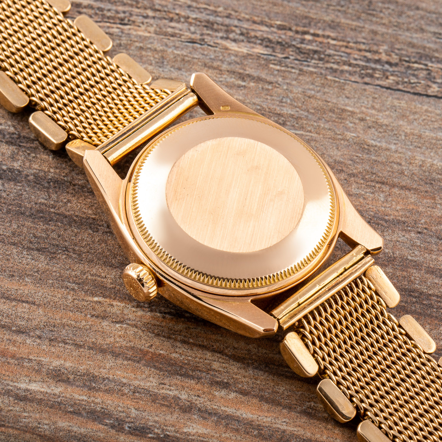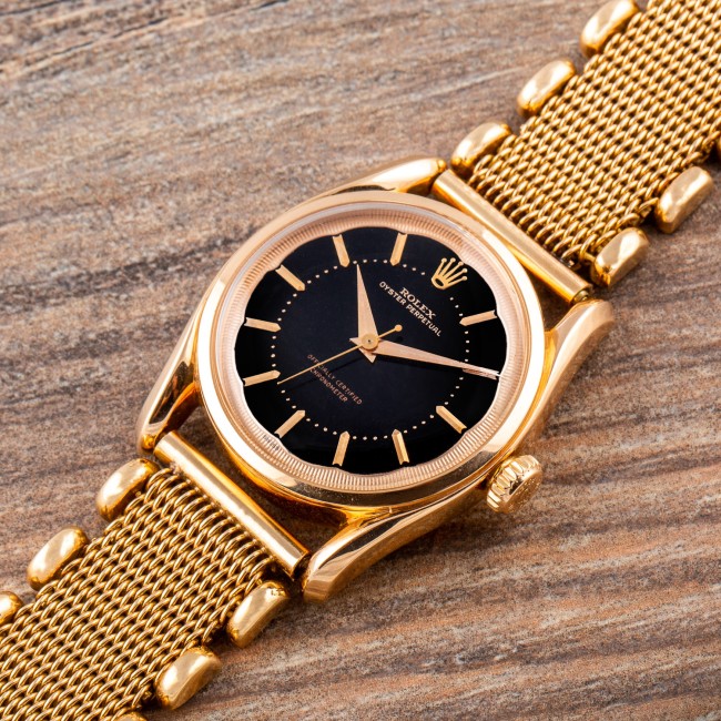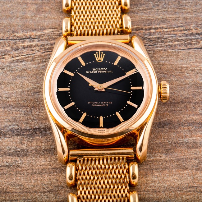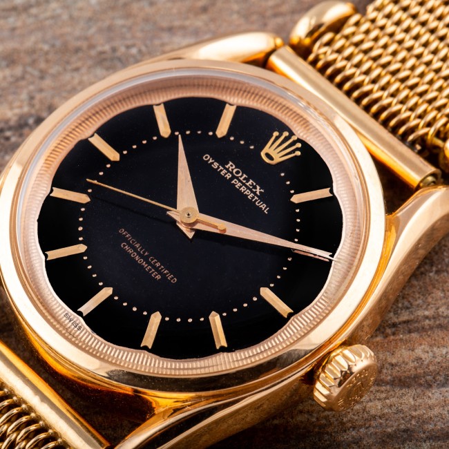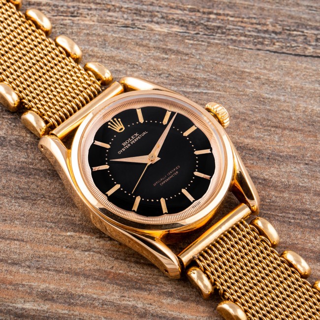 ROLEX BOMBAY REF. 6090 In 1926, Rolex introduced the world's first waterproof watch, the "Oyster," famously tested by Mercedes Gleitze during her English Channel swim in 1927. Rolex founder Hans Wilsdorf celebrated this achievement and made Gleitze the brand's first ambassador. The name "Oyster" reflects its tightly sealed case, showcased in jewelry store fish tanks to highlight its waterproofing. However, merely being waterproof wasn't enough to make wristwatches essential. Constantly unscrewing the crown compromised water resistance. In 1931, Rolex introduced the self-winding Perpetual rotor, a groundbreaking innovation. The term "Oyster Perpetual" emerged around 1945, signifying the integration of this mechanism with the robust Oyster case. The late 1940s saw the introduction of a distinctive Oyster Perpetual model with unique lugs, often affectionately known as "Rolex Bombay" among collectors. This nickname originated from the term "bombè" describing the lug's curved shape. While unofficial, it's widely recognized in the collector community. The Rolex Bombay, although it always maintained a case size of approximately 34mm, was produced in various versions and references over the years. This Rolex Oyster Perpetual reference 6090 is undoubtedly one of the rarest and most captivating Bombay models ever produced. The dial features a two-tone design with an outer ring in rose gold and a black gilt lacquer center with sparkling gold OCC lettering, complemented by dauphine hands, creating a truly extraordinary aesthetic. Very few examples with this dial configuration have come to market because they were produced in very limited quantities, catering to the most discerning and extravagant clientele. The rarity of this 6090 is further accentuated by its rose gold case, a material seldom used in Bombay models. The icing on the cake is the rose gold mesh bracelet from the same production period as the watch. The preservation condition is truly exceptional: the case still boasts beautiful Bombè lugs with well-defined shapes, deep hallmarks, and perfectly visible serial numbers. The A.260 caliber functions flawlessly, the black gilt lacquer dial remains mirror-like without any defects, the case back shows no closure issues, and the Super Oyster crown works as it should. The bracelet is neither loose nor deteriorated. This watch is exceptional, both for its rarity and its beauty—an object for a discerning collector seeking a truly unique timepiece. Serial Number 855,XXX Year 1951 Circa, Diameter 34mm circa