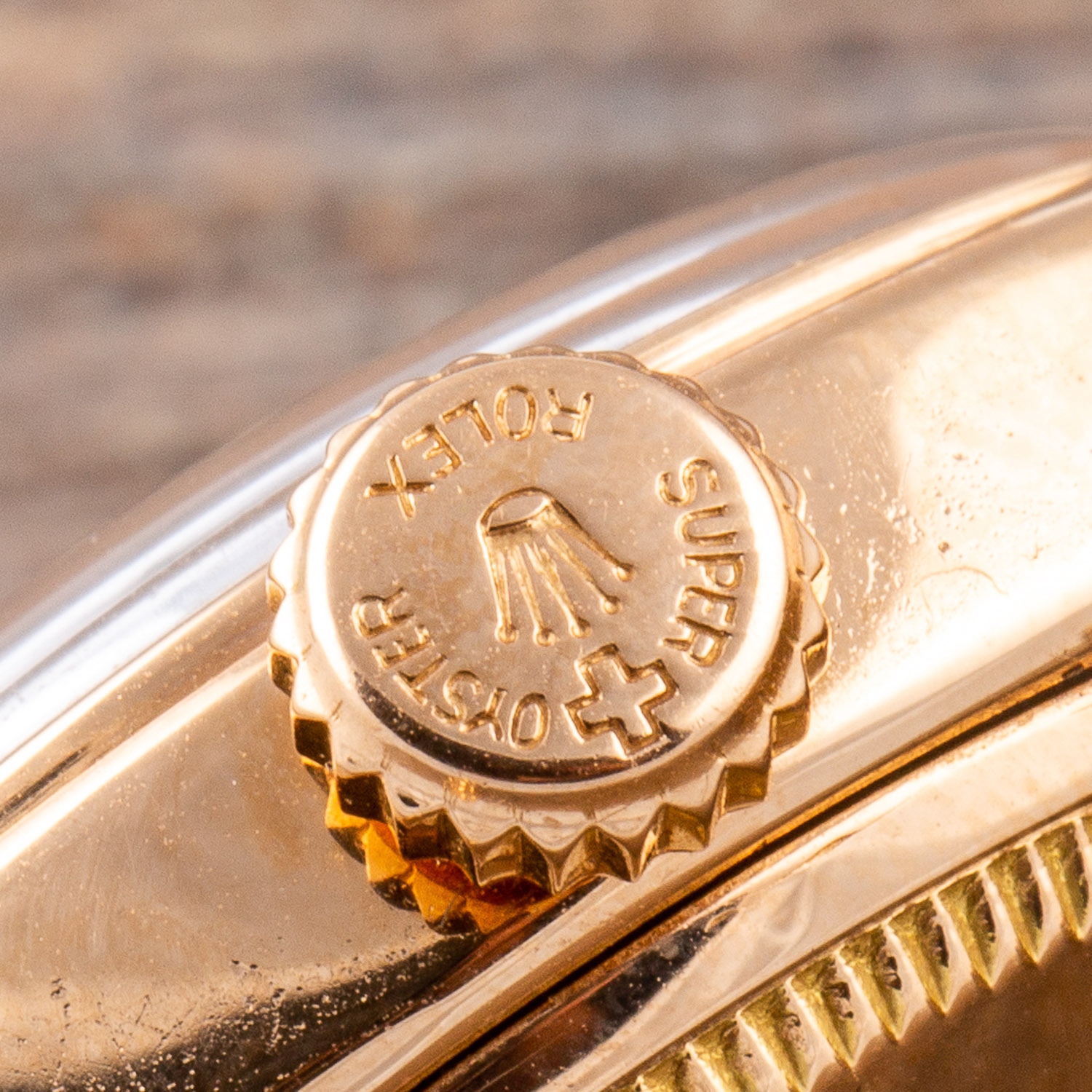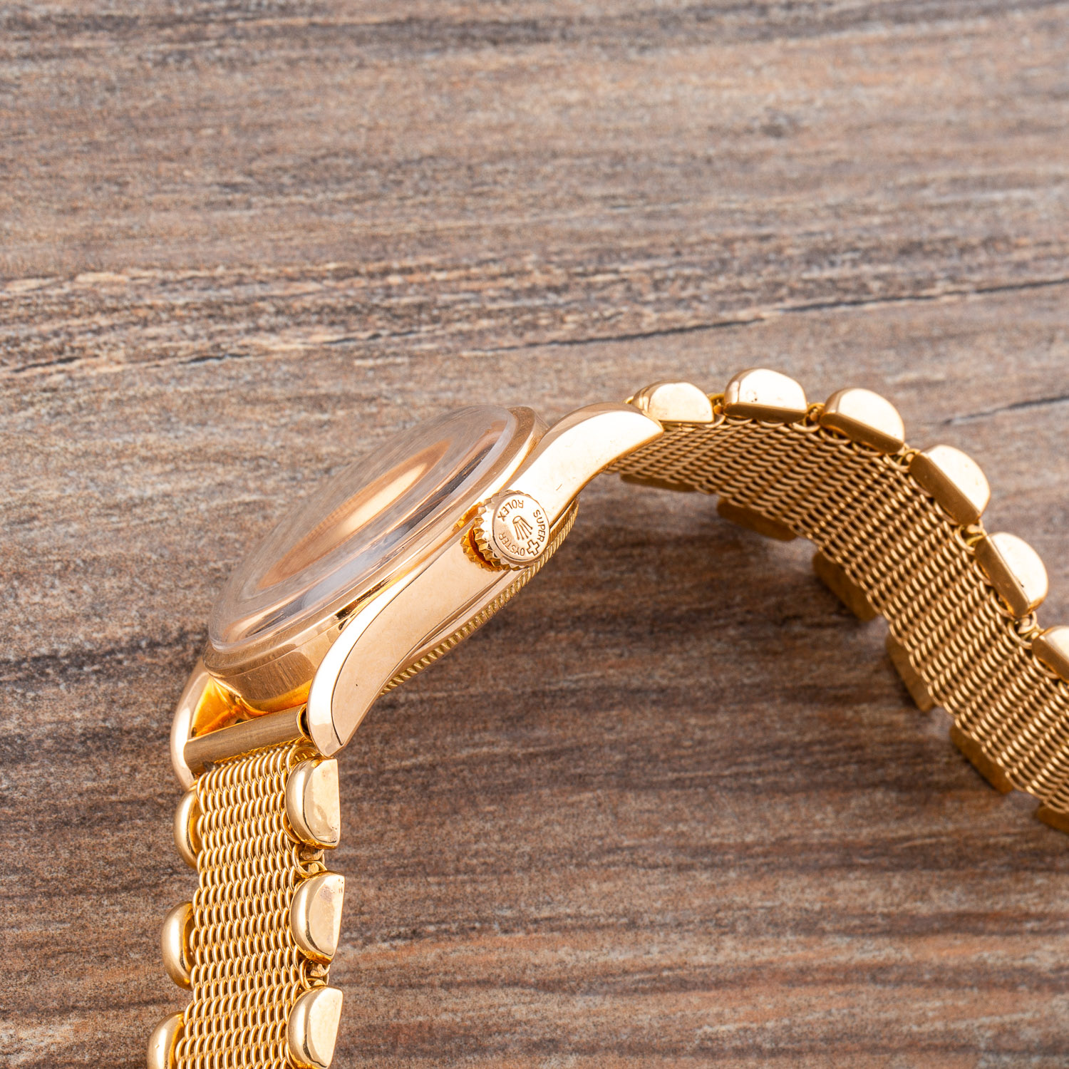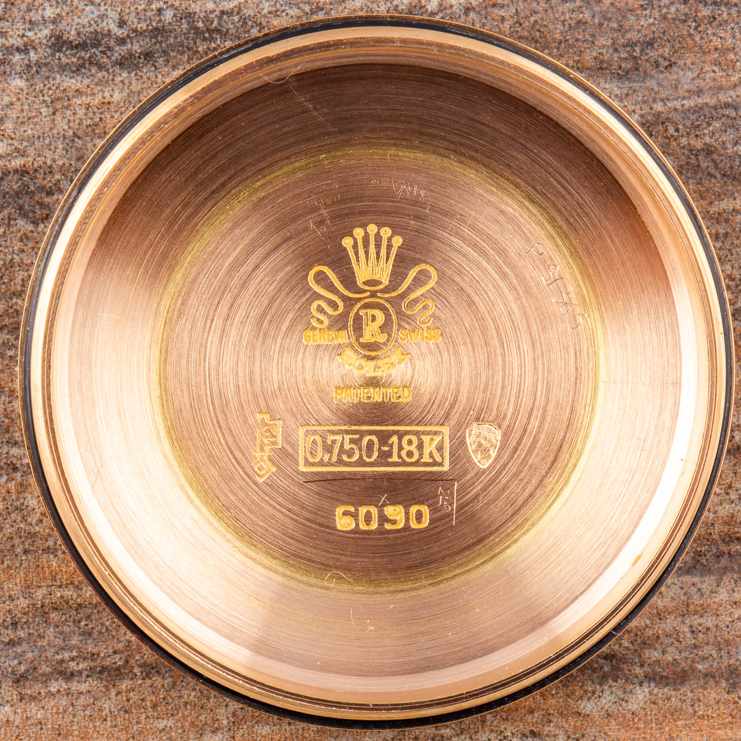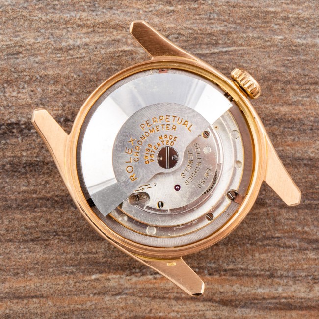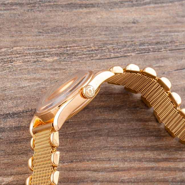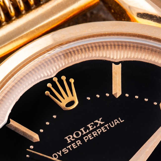 ROLEX BOMBAY REF. 6090 In 1926, Rolex introduced the world's first waterproof watch, the "Oyster," famously tested by Mercedes Gleitze during her English Channel swim in 1927. Rolex founder Hans Wilsdorf celebrated this achievement and made Gleitze the brand's first ambassador. The name "Oyster" reflects its tightly sealed case, showcased in jewelry store fish tanks to highlight its waterproofing. However, merely being waterproof wasn't enough to make wristwatches essential. Constantly unscrewing the crown compromised water resistance. In 1931, Rolex introduced the self-winding Perpetual rotor, a groundbreaking innovation. The term "Oyster Perpetual" emerged around 1945, signifying the integration of this mechanism with the robust Oyster case. The late 1940s saw the introduction of a distinctive Oyster Perpetual model with unique lugs, often affectionately known as "Rolex Bombay" among collectors. This nickname originated from the term "bombè" describing the lug's curved shape. While unofficial, it's widely recognized in the collector community. The Rolex Bombay, although it always maintained a case size of approximately 34mm, was produced in various versions and references over the years. This Rolex Oyster Perpetual reference 6090 is undoubtedly one of the rarest and most captivating Bombay models ever produced. The dial features a two-tone design with an outer ring in rose gold and a black gilt lacquer center with sparkling gold OCC lettering, complemented by dauphine hands, creating a truly extraordinary aesthetic. Very few examples with this dial configuration have come to market because they were produced in very limited quantities, catering to the most discerning and extravagant clientele. The rarity of this 6090 is further accentuated by its rose gold case, a material seldom used in Bombay models. The icing on the cake is the rose gold mesh bracelet from the same production period as the watch. The preservation condition is truly exceptional: the case still boasts beautiful Bombè lugs with well-defined shapes, deep hallmarks, and perfectly visible serial numbers. The A.260 caliber functions flawlessly, the black gilt lacquer dial remains mirror-like without any defects, the case back shows no closure issues, and the Super Oyster crown works as it should. The bracelet is neither loose nor deteriorated. This watch is exceptional, both for its rarity and its beauty—an object for a discerning collector seeking a truly unique timepiece. Serial Number 855,XXX Year 1951 Circa, Diameter 34mm circa