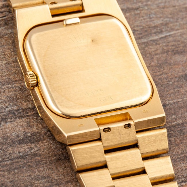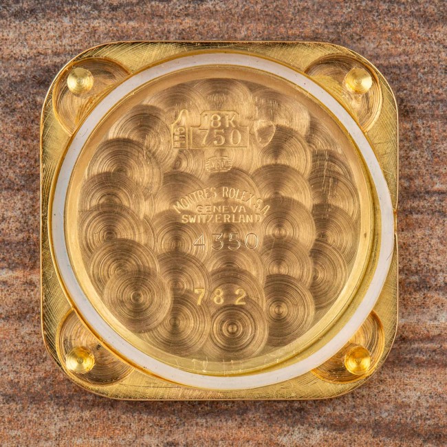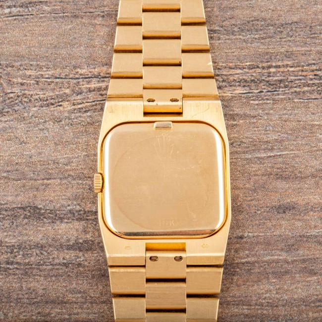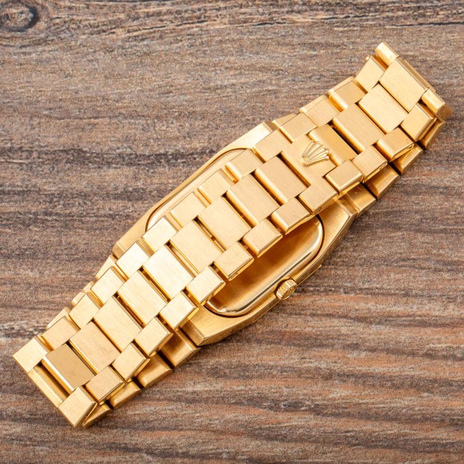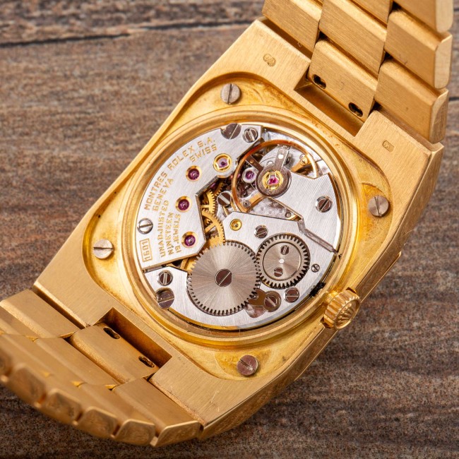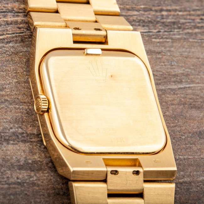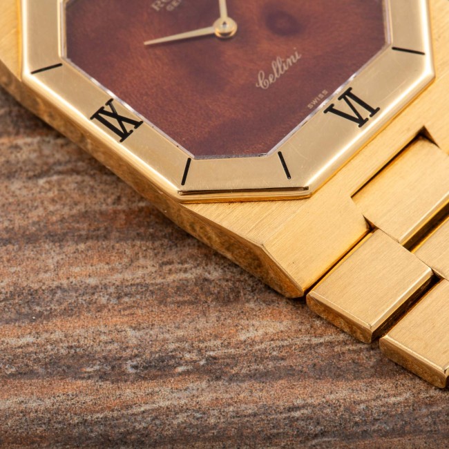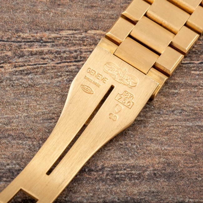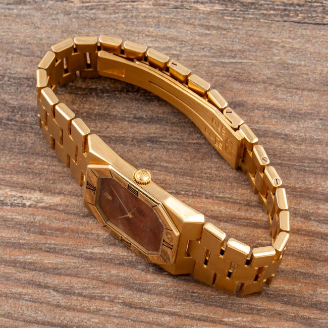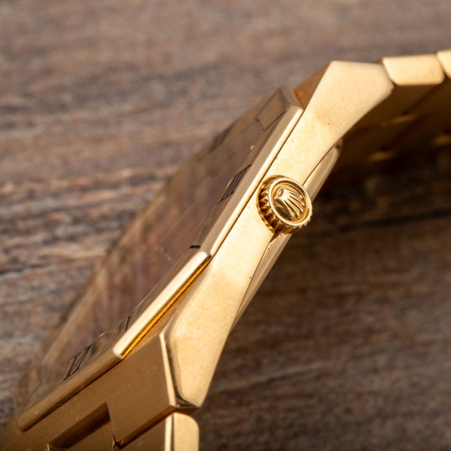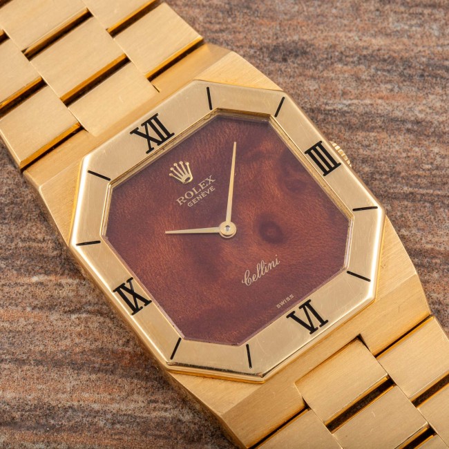 ROLEX CELLINI REFERENCE 4350 WOOD DIAL Rolex Cellini models epitomize elegance and refinement, offering a departure from the brand’s iconic sports watches. With timeless designs and meticulous craftsmanship, Cellini watches boast classic round cases and minimalist dials adorned. Available over the years in various sizes and materials, each Cellini timepiece is a symbol of sophistication and understated luxury. Powered by Rolex’s precise mechanical movements, they embody a tradition of horological excellence, perfect for those who appreciate timeless style and impeccable craftsmanship. A pristine embodiment of this artistry can be found in the present Cellini reference 4350, representing a quintessential symbol of luxurious style. The Rolex reference 4350 stands as a rare gem within the Cellini line, crafted in limited quantities, it embodies exquisite artistry and fine watchmaking. Constructed entirely in 18kt yellow gold, including the bracelet, its wood dial and Roman numerals bezel exude opulence with a subtle elegance. The watch’s exceptional craftsmanship is evident, particularly in the seamlessly integrated hidden clasp bracelet and the meticulously angled case, ensuring both beauty and comfort in wear. In impeccable condition, boasting a mint wood dial, original black enamel bezel, and maintaining its factory proportions, this timepiece is a testament to enduring luxury. Measures 27×35,5mm.