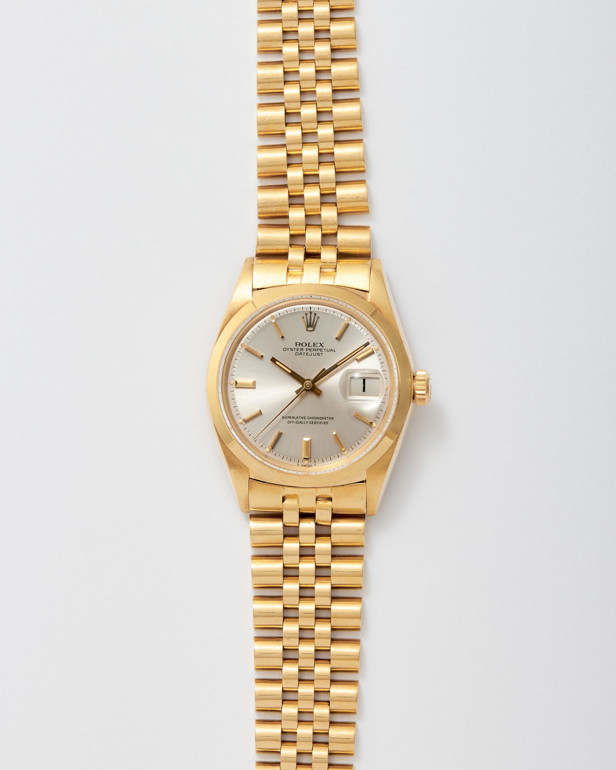 18K gold Rolex Datejust ref. 1600. A rare and beautifully preserved 18K gold Rolex Datejust from 1967, featuring the desirable smooth bezel. This vintage piece is a testament to careful use and excellent preservation over the decades. The case remains thick and sharp, showing only minor signs of wear. The original Jubilee bracelet, stamped with the 1967 date code, displays remarkably little stretch for its age, an impressive detail for a nearly 60-year-old watch. The silver dial is flawless, with all lume plots evenly aged to a warm tone and still retaining their original puffy texture, perfectly matching the original hands. Powered by the reliable self-winding Caliber 1570 movement, this Datejust is a refined and understated choice for lovers of classic gold watches.