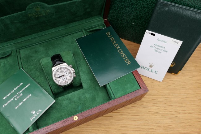 Completely unworn watch in N.O.S. condition. Keeping its original Rolex box and papers; and the sticker on the back cover confirming the reference corresponding to its diamond bezel.