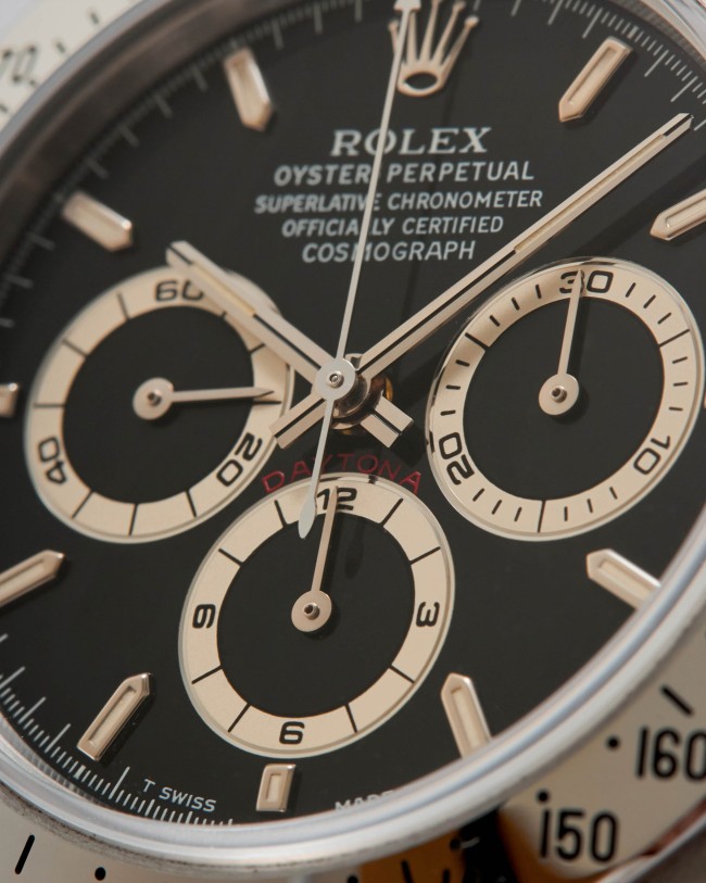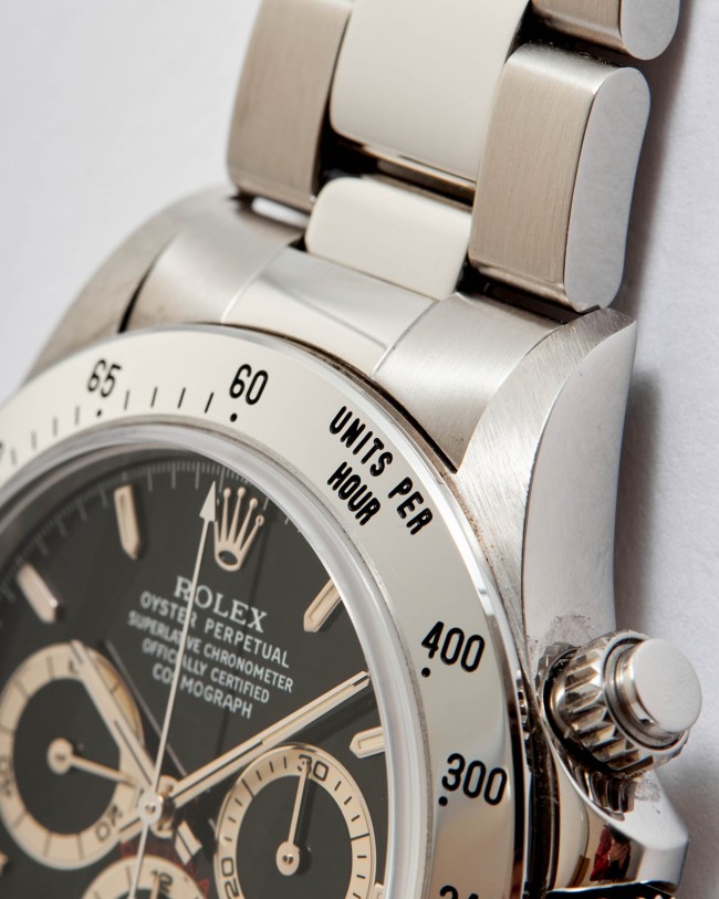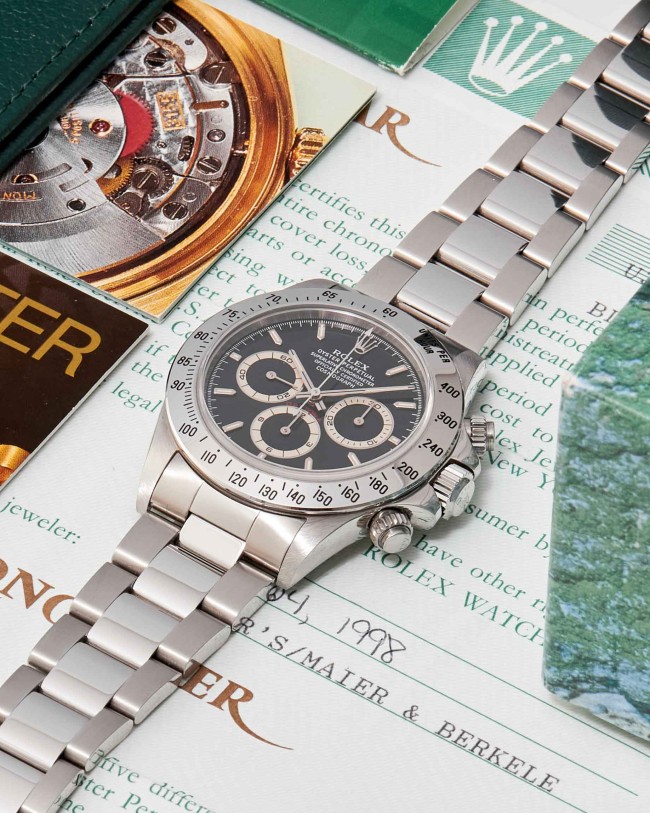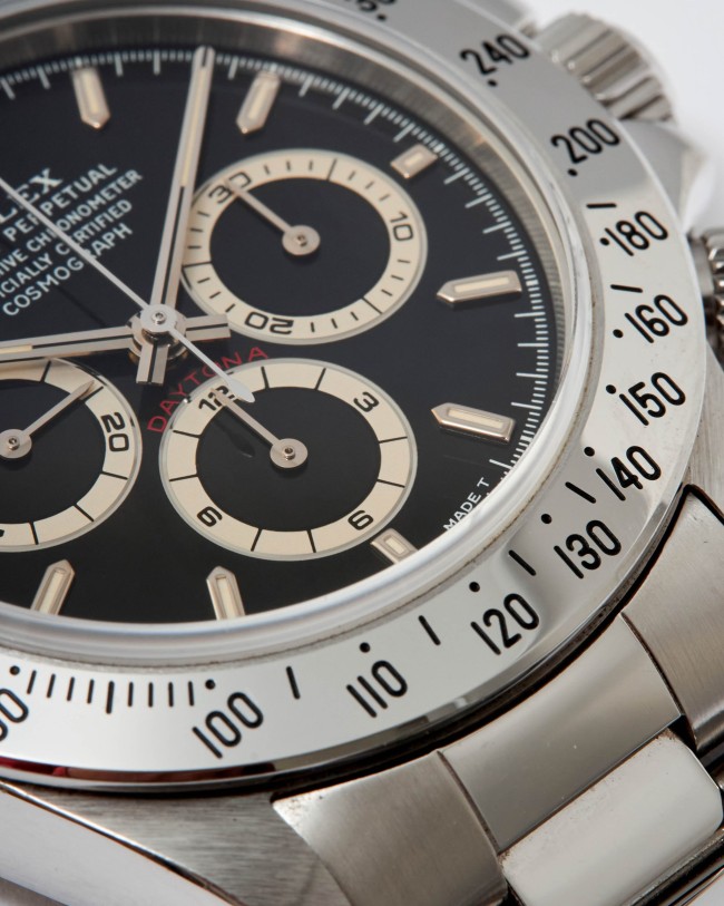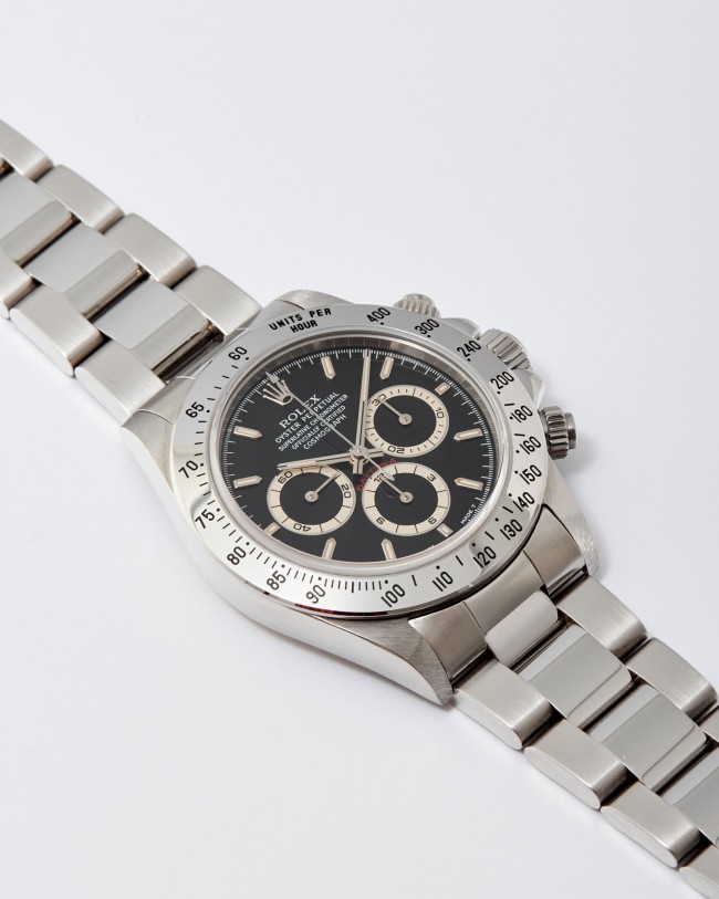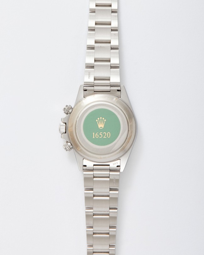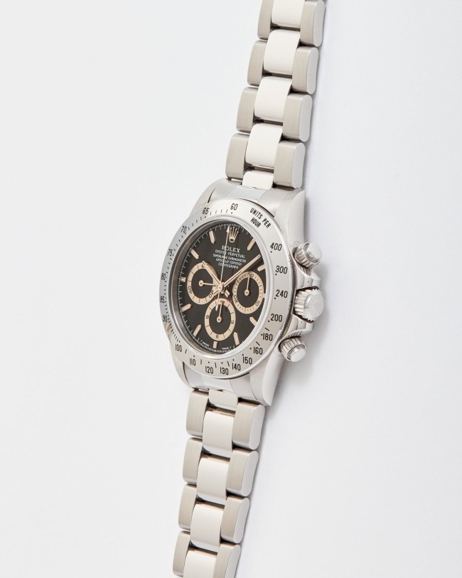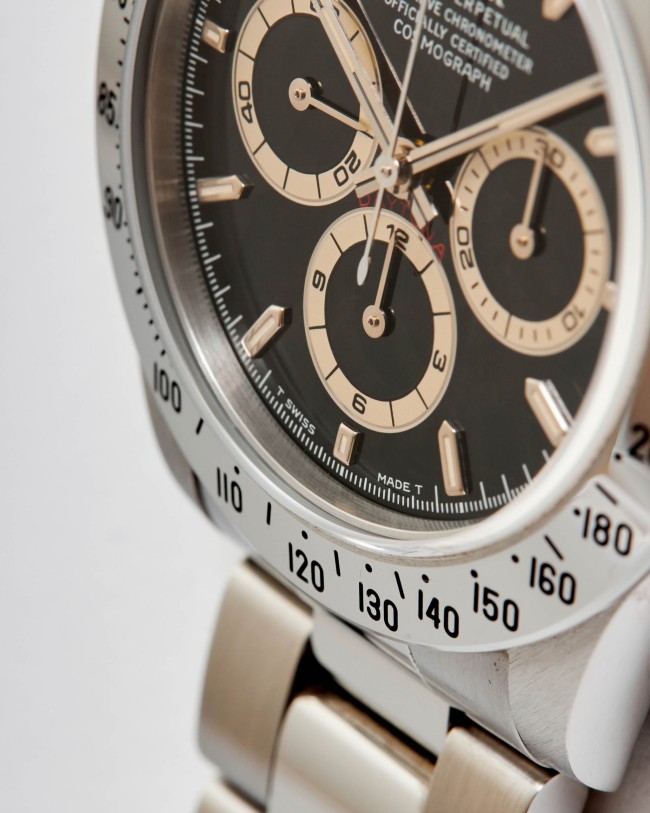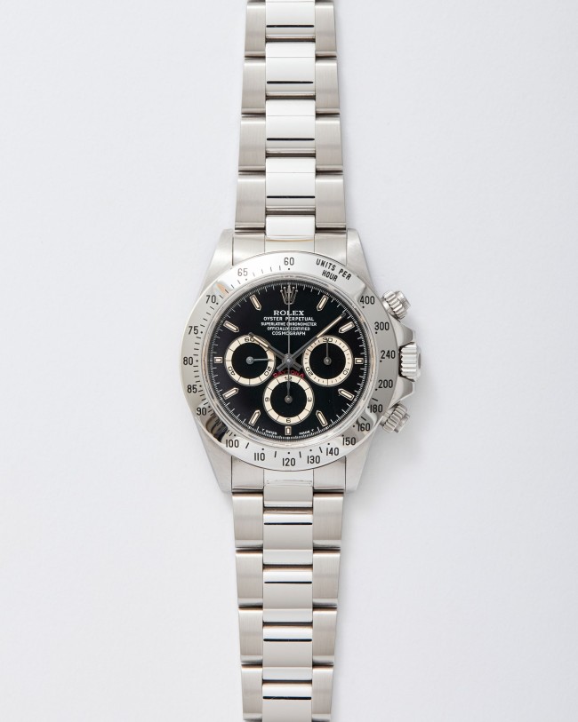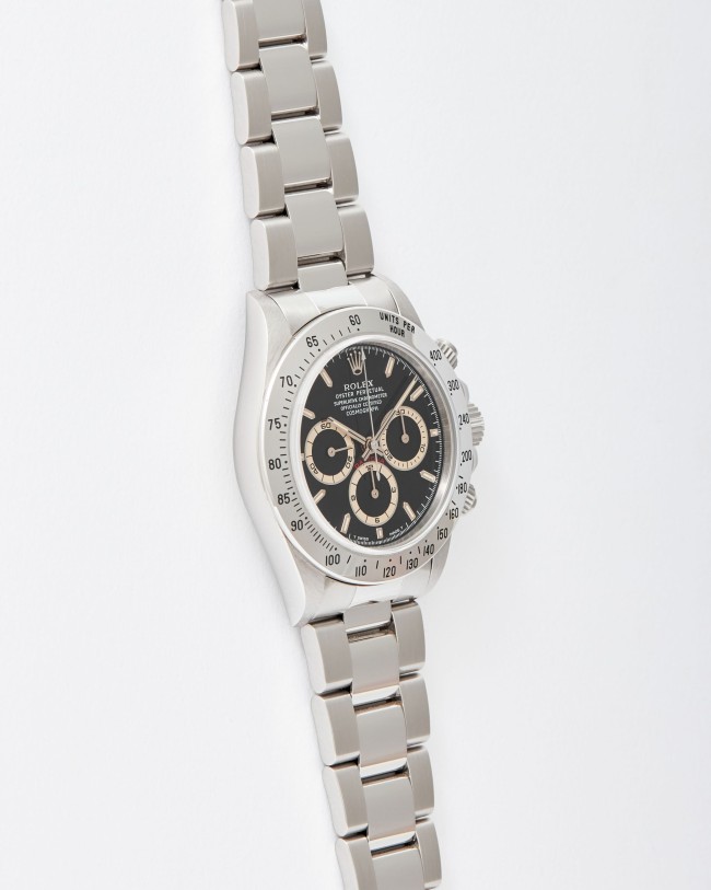 Stainless steel Rolex Daytona ref. 16520. This steel ref. 16520, is an exceptional example of the iconic Daytona with a black dial, dating to the late 1990s. Remarkably, this watch has never been worn and remains in pristine N.O.S. (New Old Stock) condition. Originally purchased from Mayors Jewelers in the U.S. in 1998, it has been carefully stored by the family ever since and is now making its market debut. Accompanied by its full set, including the original box, booklets, tags, wallet, and papers, this timepiece offers a rare opportunity to own a virtually brand-new example of Rolex’s legendary Daytona collection.