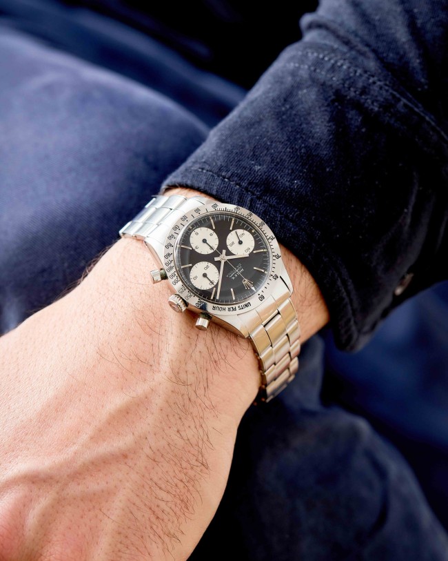 Stainless steel Rolex Daytona ref. 6239. An outstanding and highly attractive Rolex Cosmograph Daytona reference 6239 in stainless steel, dating to 1967 and fitted with a beautiful black dial. This Rolex Daytona was acquired directly from the original owner in the south of Spain, adding exceptional provenance and authenticity and is presented in very nice original condition. Although it has been worn, the case remains beautifully preserved, retaining thick, sharp lugs and strong, well-defined edges. The black dial is in excellent condition and has been professionally relumed to original factory standards, preserving both its aesthetics and legibility. The original rivet Oyster bracelet is remarkably well preserved, showing very little stretch and correctly stamped 1967, further confirming the coherence of the watch. Powered by the legendary manual-winding cal. 722, this Daytona exemplifies the elegant simplicity and functional purity that define early Rolex chronographs. A true classic and a compelling testament to Rolex’s chronograph heritage—an exceptional addition to any serious collection.