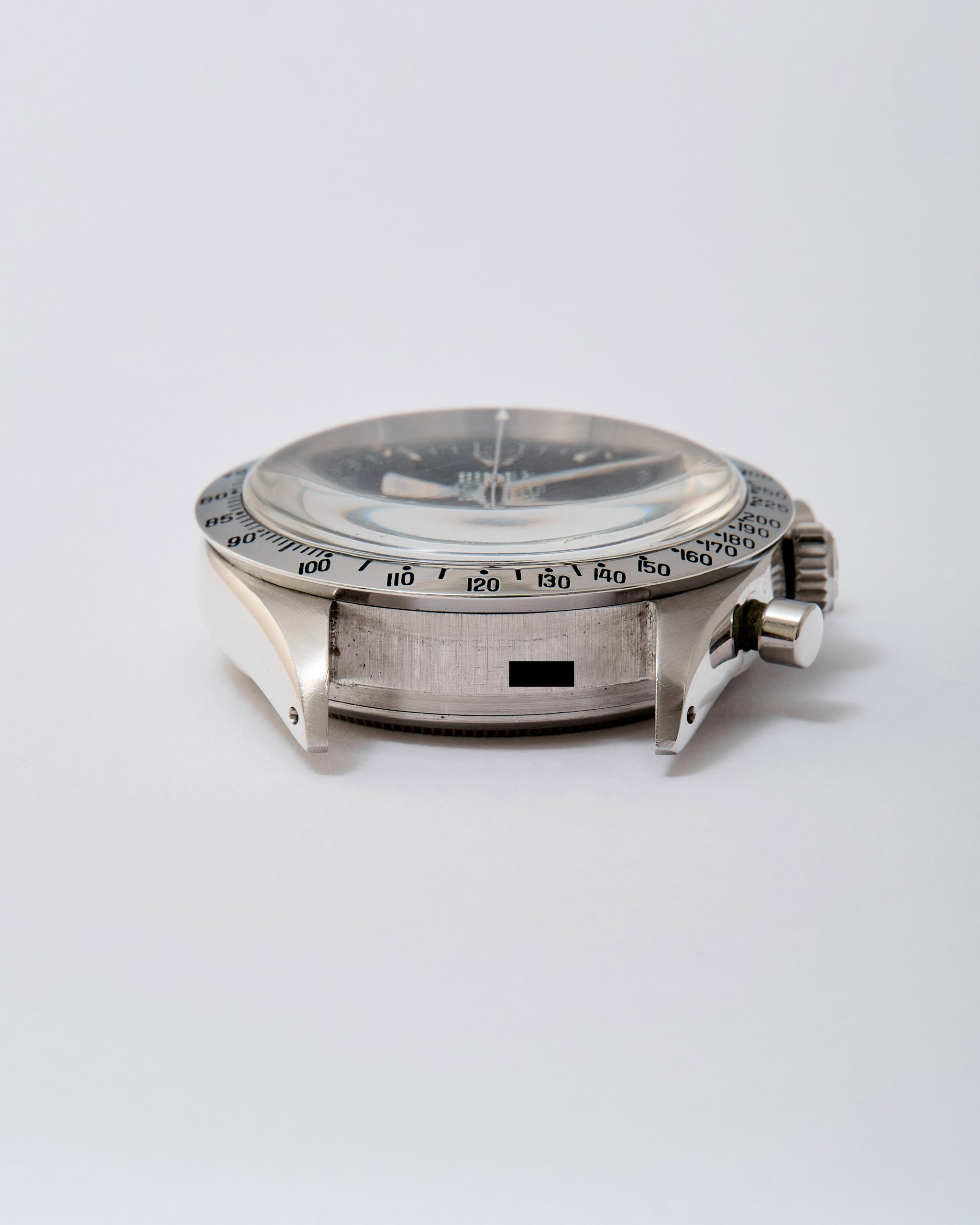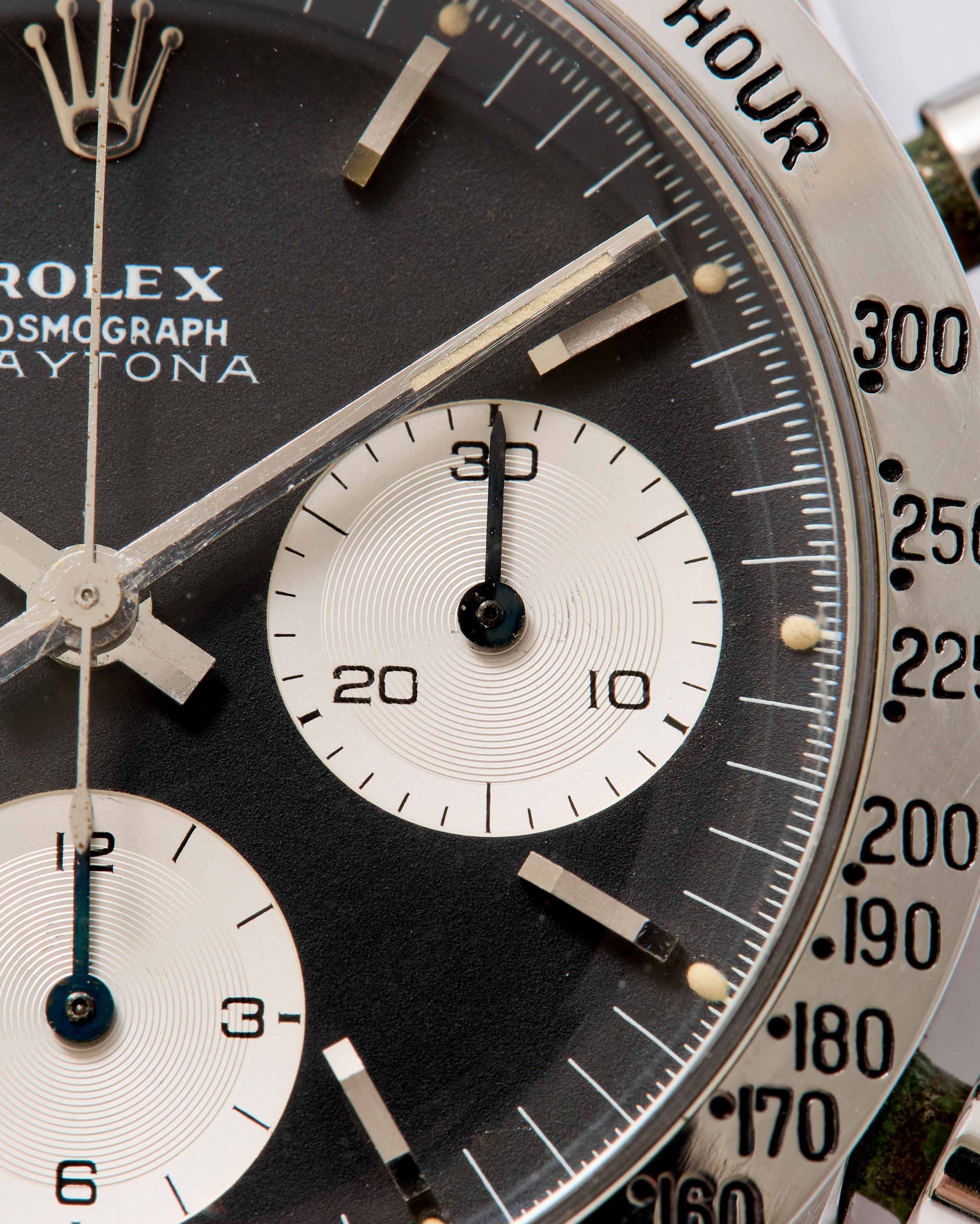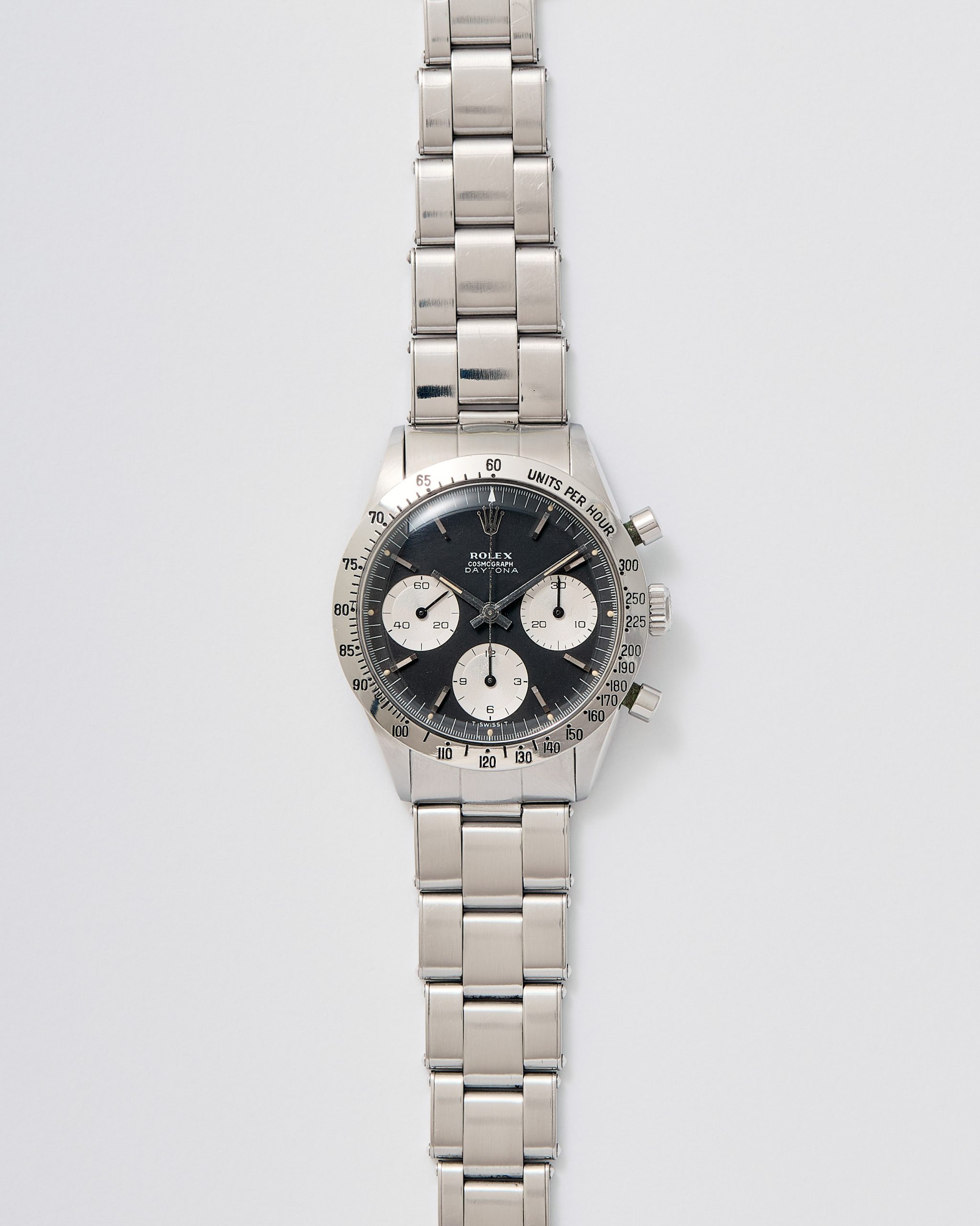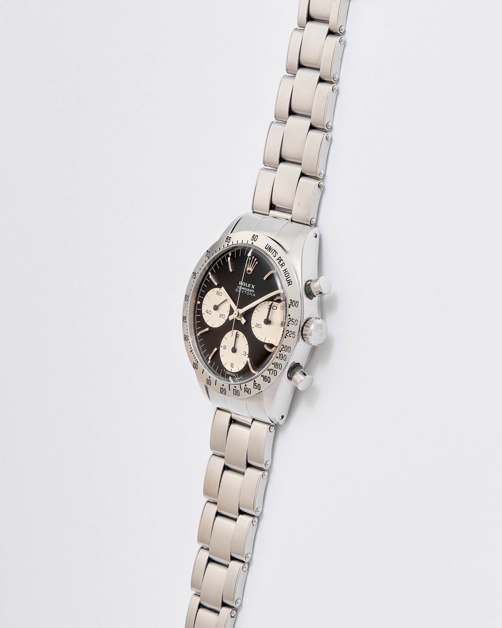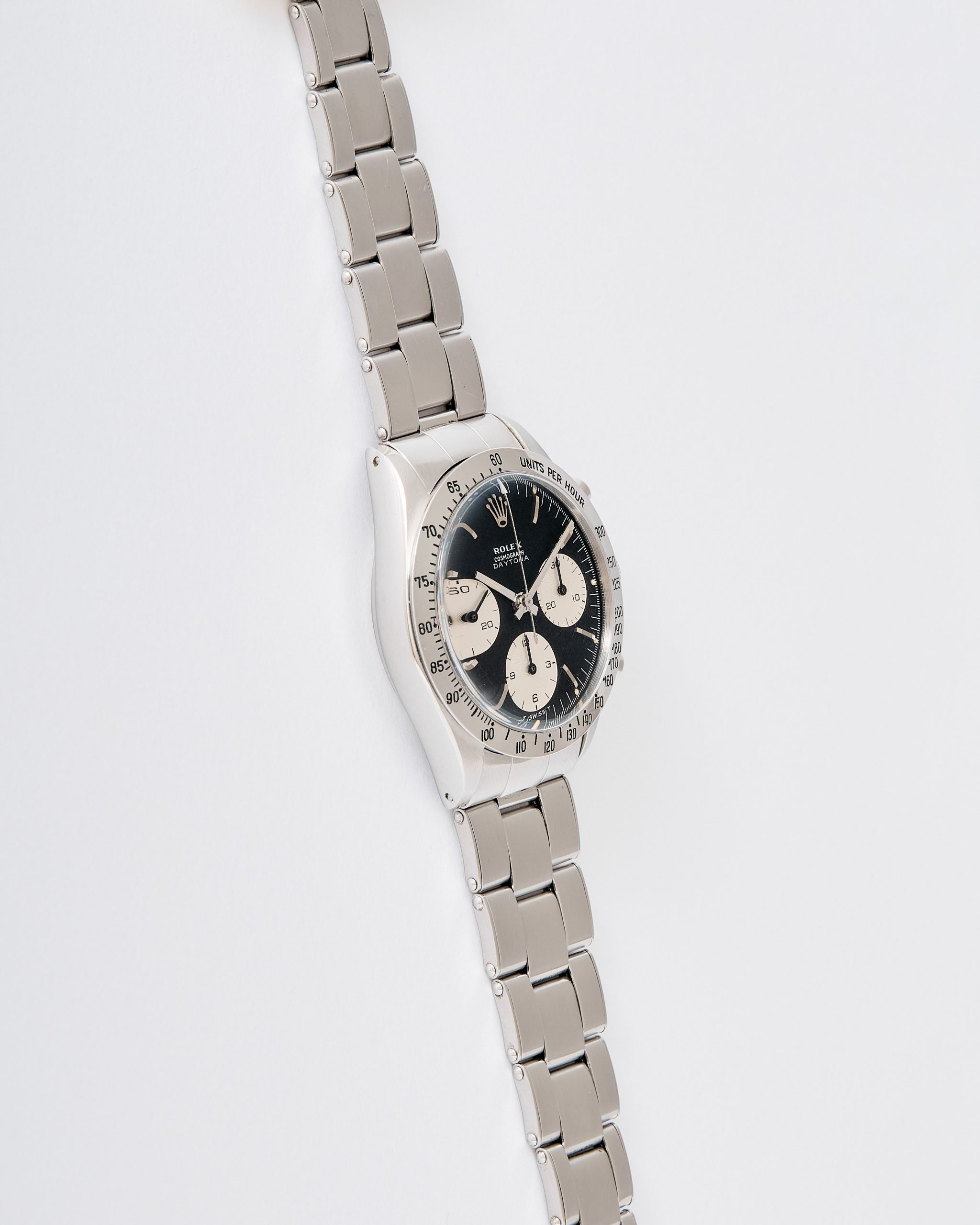 Stainless steel Rolex Daytona ref. 6239. An outstanding and highly attractive Rolex Cosmograph Daytona reference 6239 in stainless steel, dating to 1967 and fitted with a beautiful black dial. This Rolex Daytona was acquired directly from the original owner in the south of Spain, adding exceptional provenance and authenticity and is presented in very nice original condition. Although it has been worn, the case remains beautifully preserved, retaining thick, sharp lugs and strong, well-defined edges. The black dial is in excellent condition and has been professionally relumed to original factory standards, preserving both its aesthetics and legibility. The original rivet Oyster bracelet is remarkably well preserved, showing very little stretch and correctly stamped 1967, further confirming the coherence of the watch. Powered by the legendary manual-winding cal. 722, this Daytona exemplifies the elegant simplicity and functional purity that define early Rolex chronographs. A true classic and a compelling testament to Rolex’s chronograph heritage—an exceptional addition to any serious collection.