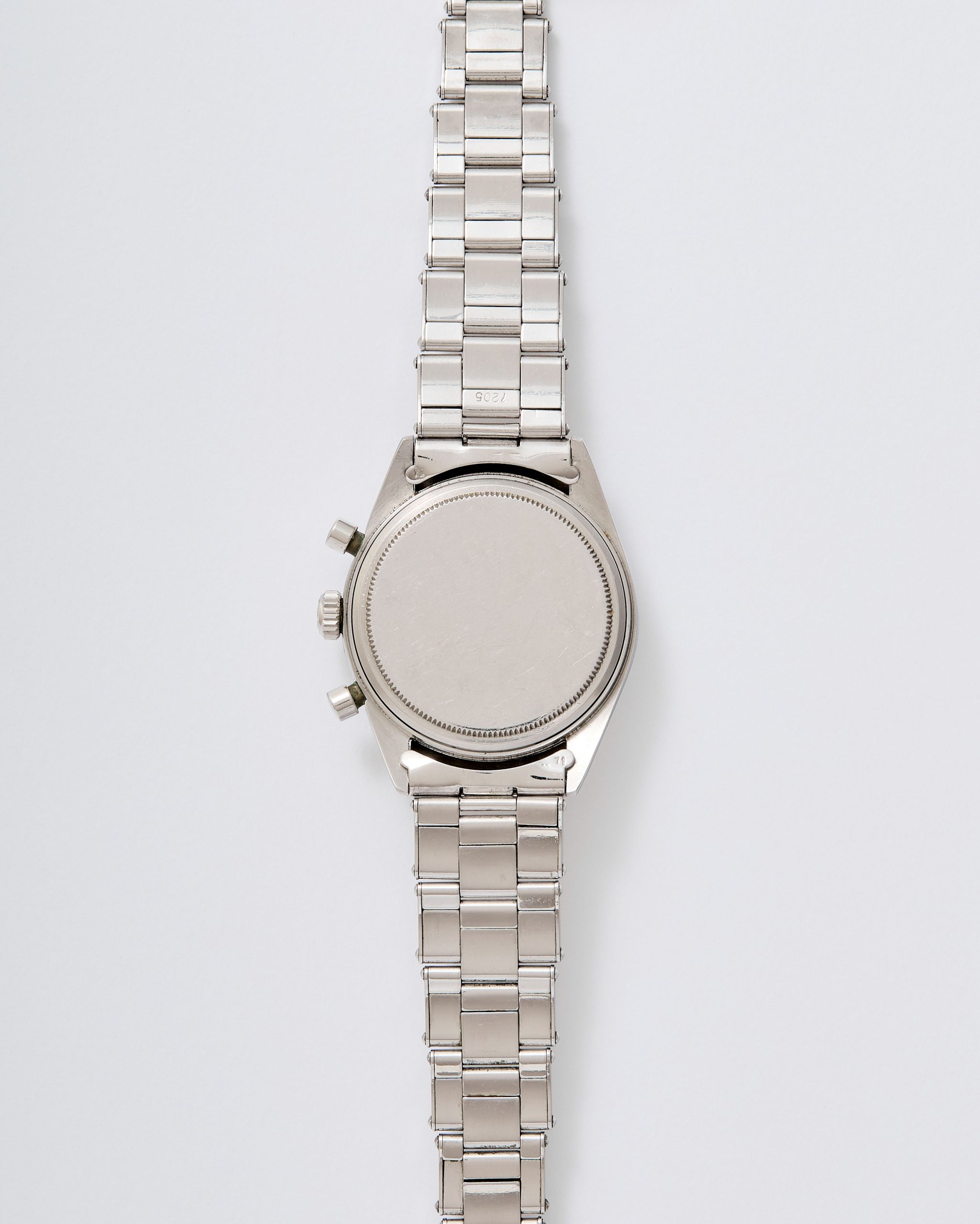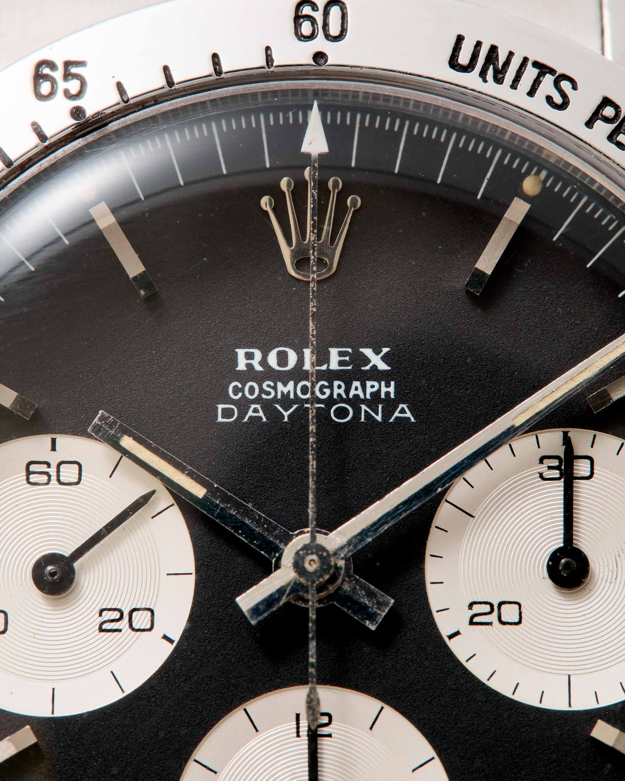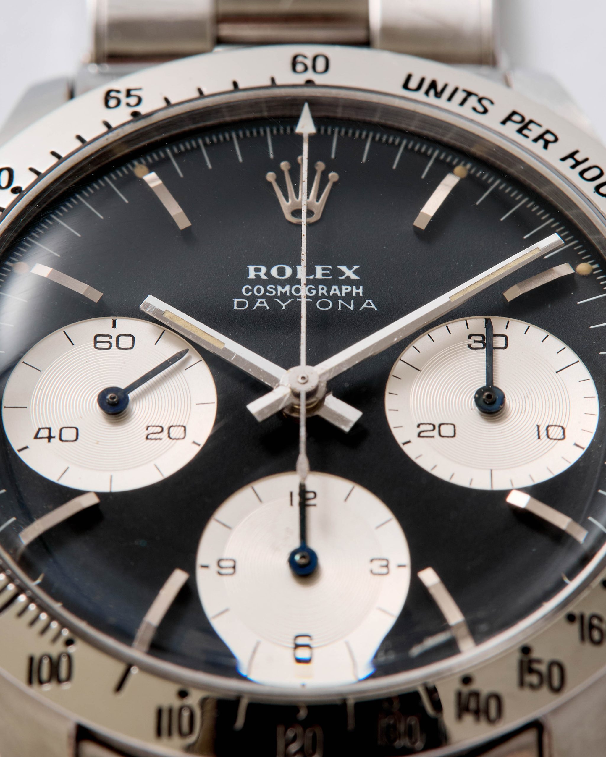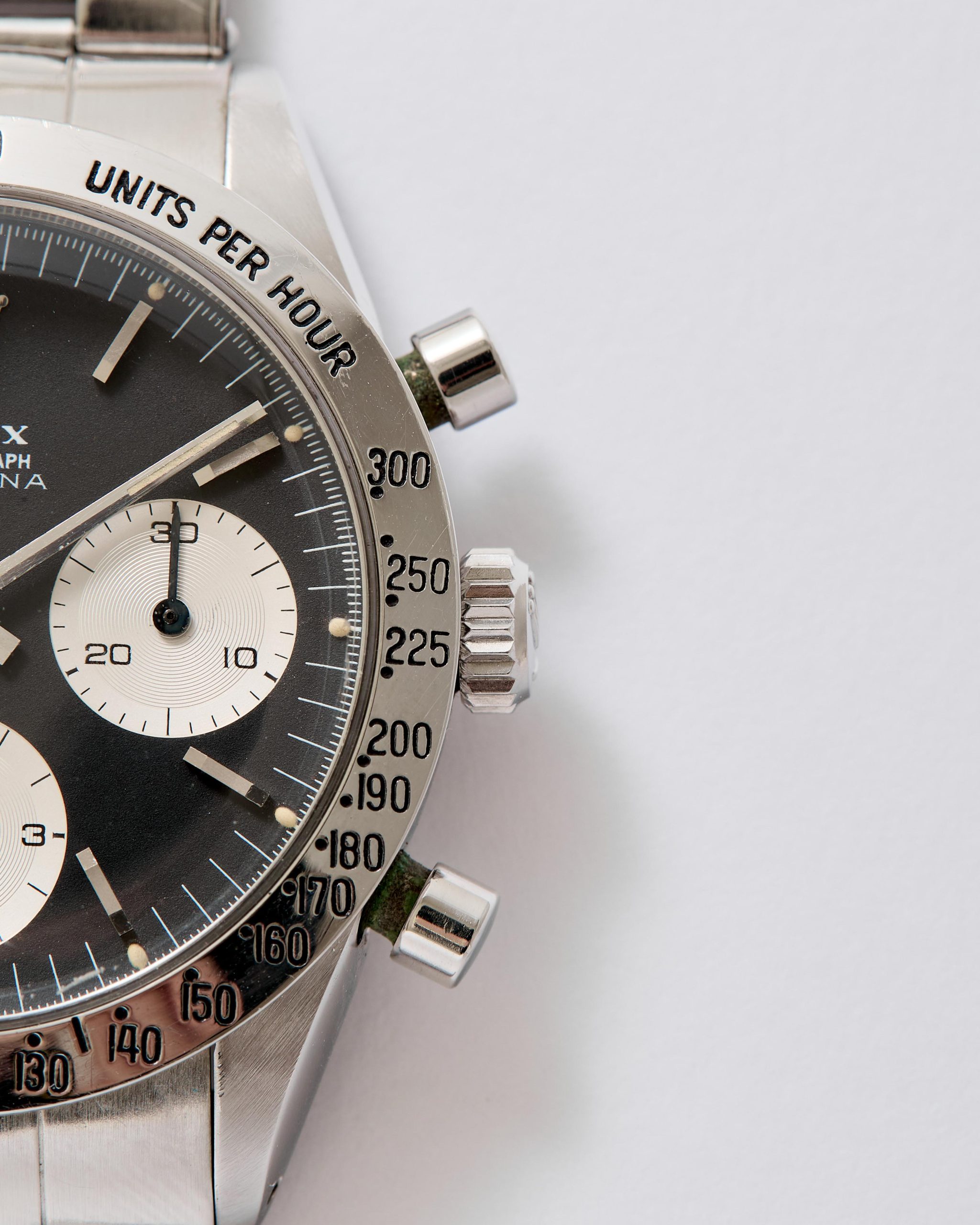 Stainless steel Rolex Daytona ref. 6239. An outstanding and highly attractive Rolex Cosmograph Daytona reference 6239 in stainless steel, dating to 1967 and fitted with a beautiful black dial. This Rolex Daytona was acquired directly from the original owner in the south of Spain, adding exceptional provenance and authenticity and is presented in very nice original condition. Although it has been worn, the case remains beautifully preserved, retaining thick, sharp lugs and strong, well-defined edges. The black dial is in excellent condition and has been professionally relumed to original factory standards, preserving both its aesthetics and legibility. The original rivet Oyster bracelet is remarkably well preserved, showing very little stretch and correctly stamped 1967, further confirming the coherence of the watch. Powered by the legendary manual-winding cal. 722, this Daytona exemplifies the elegant simplicity and functional purity that define early Rolex chronographs. A true classic and a compelling testament to Rolex’s chronograph heritage—an exceptional addition to any serious collection.