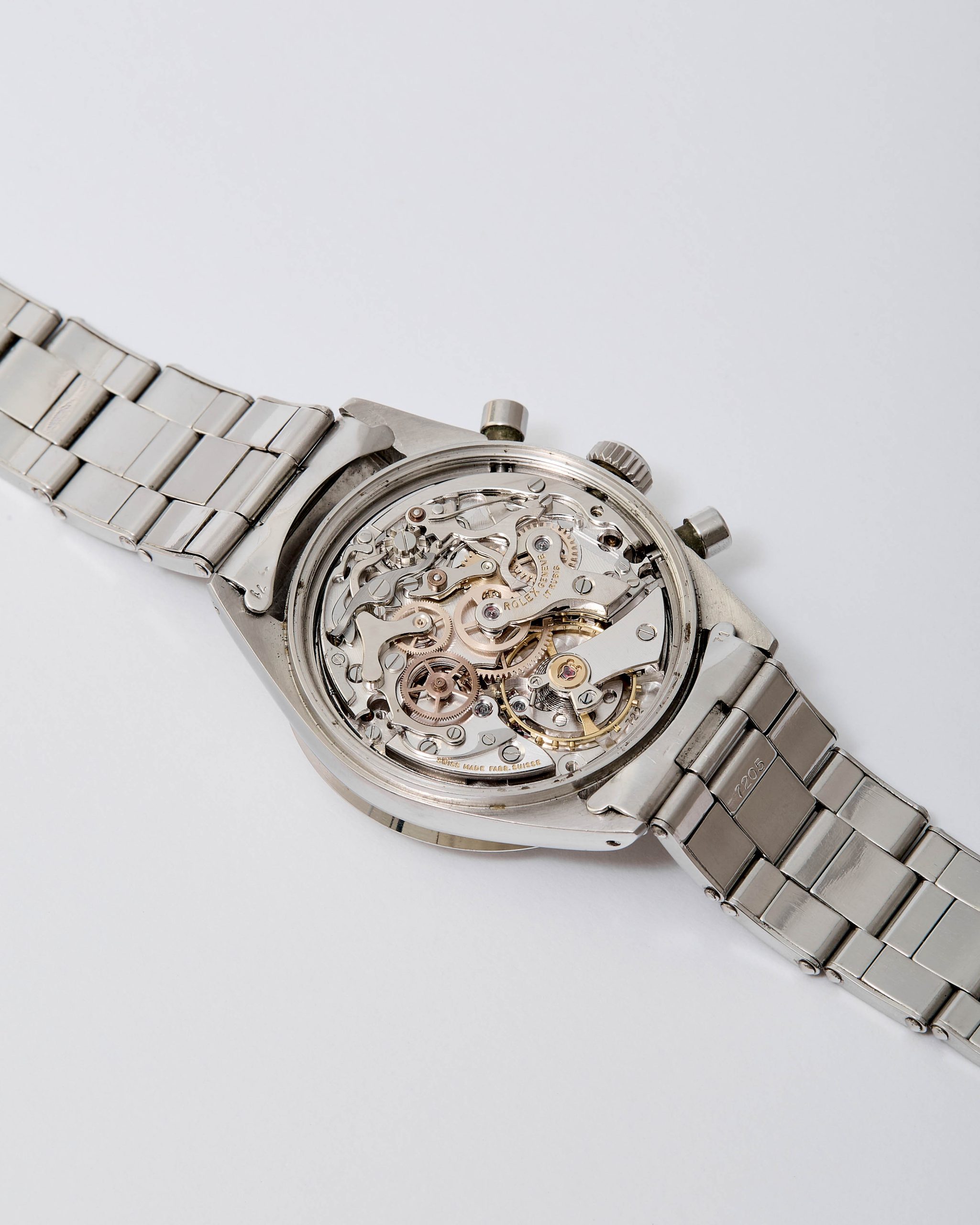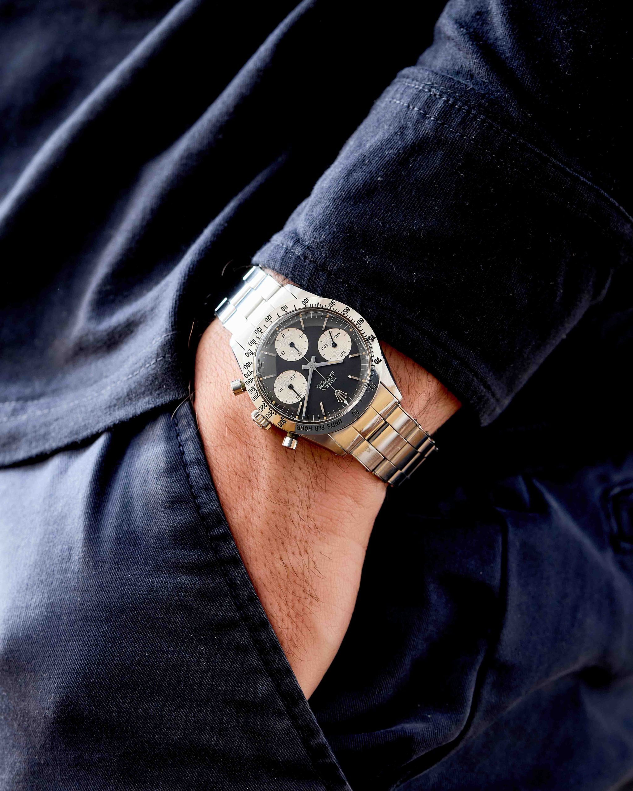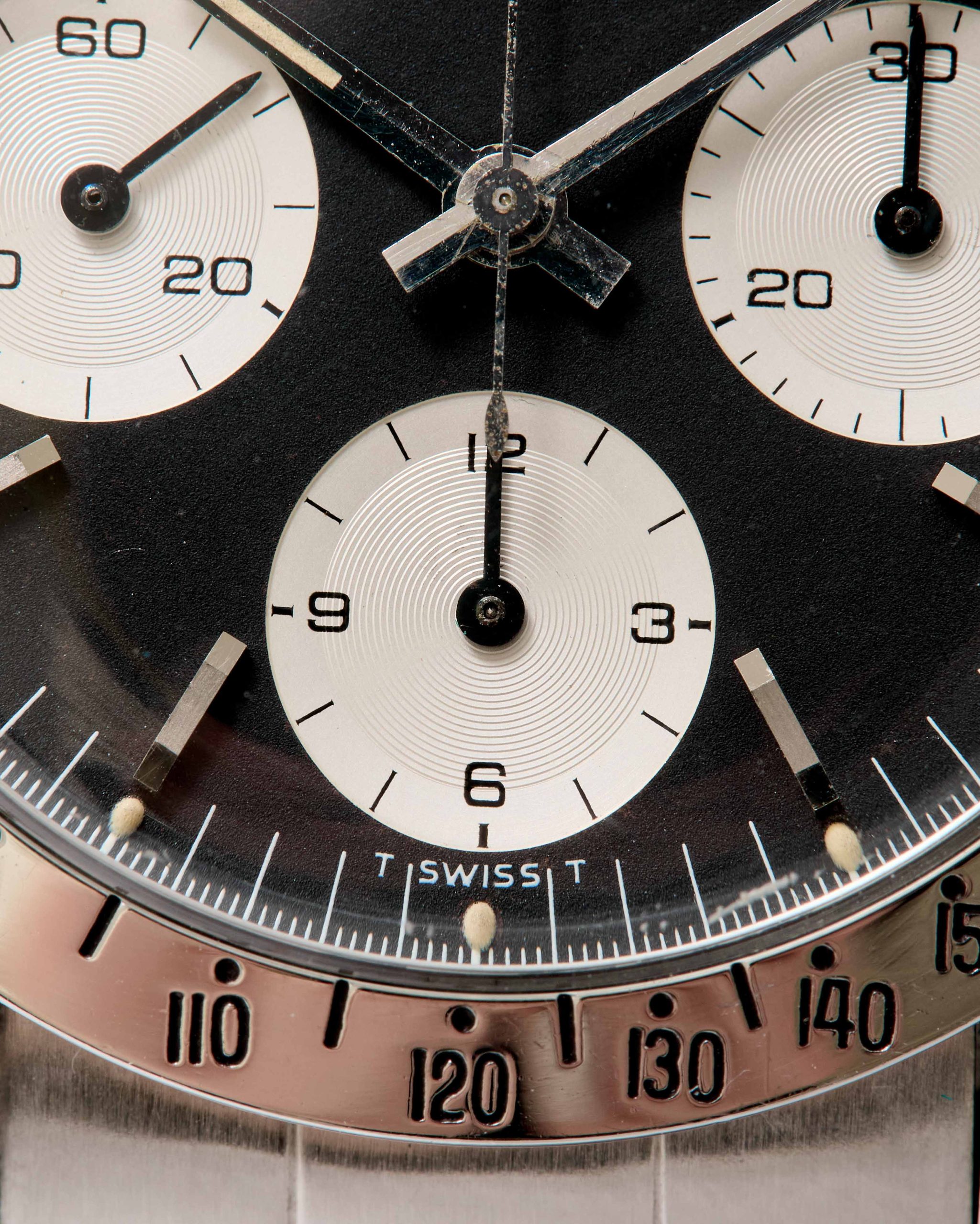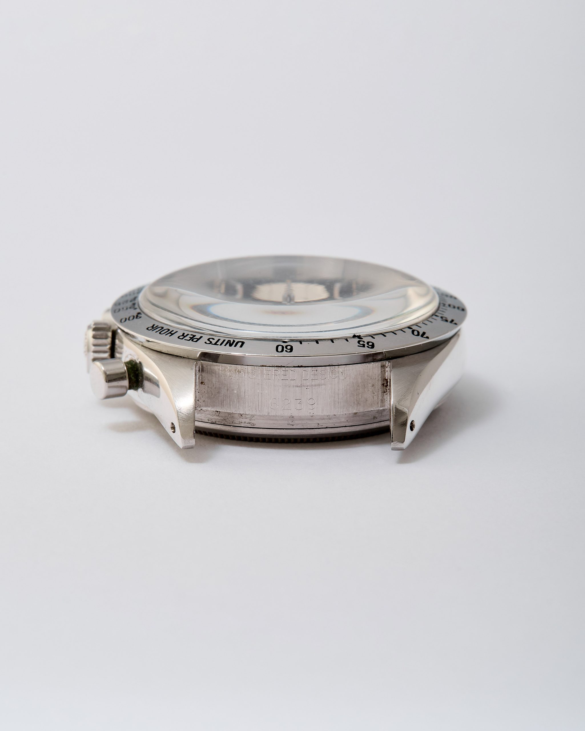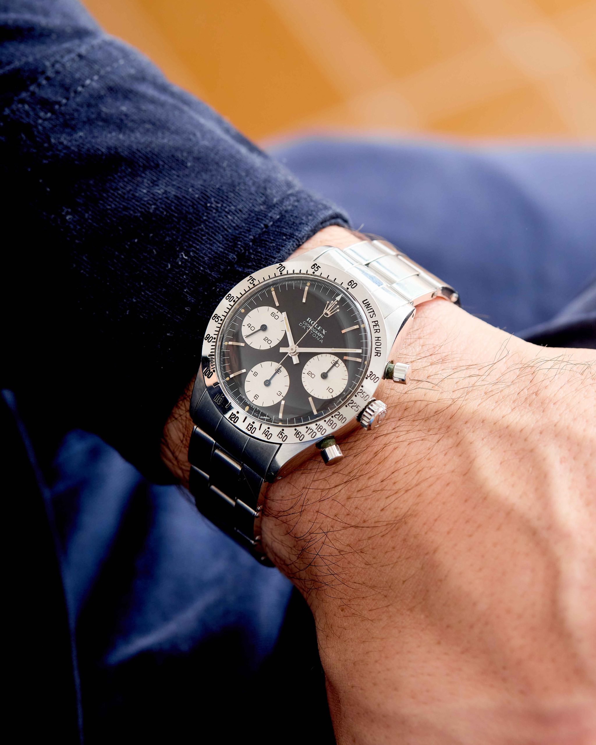 Stainless steel Rolex Daytona ref. 6239. An outstanding and highly attractive Rolex Cosmograph Daytona reference 6239 in stainless steel, dating to 1967 and fitted with a beautiful black dial. This Rolex Daytona was acquired directly from the original owner in the south of Spain, adding exceptional provenance and authenticity and is presented in very nice original condition. Although it has been worn, the case remains beautifully preserved, retaining thick, sharp lugs and strong, well-defined edges. The black dial is in excellent condition and has been professionally relumed to original factory standards, preserving both its aesthetics and legibility. The original rivet Oyster bracelet is remarkably well preserved, showing very little stretch and correctly stamped 1967, further confirming the coherence of the watch. Powered by the legendary manual-winding cal. 722, this Daytona exemplifies the elegant simplicity and functional purity that define early Rolex chronographs. A true classic and a compelling testament to Rolex’s chronograph heritage—an exceptional addition to any serious collection.