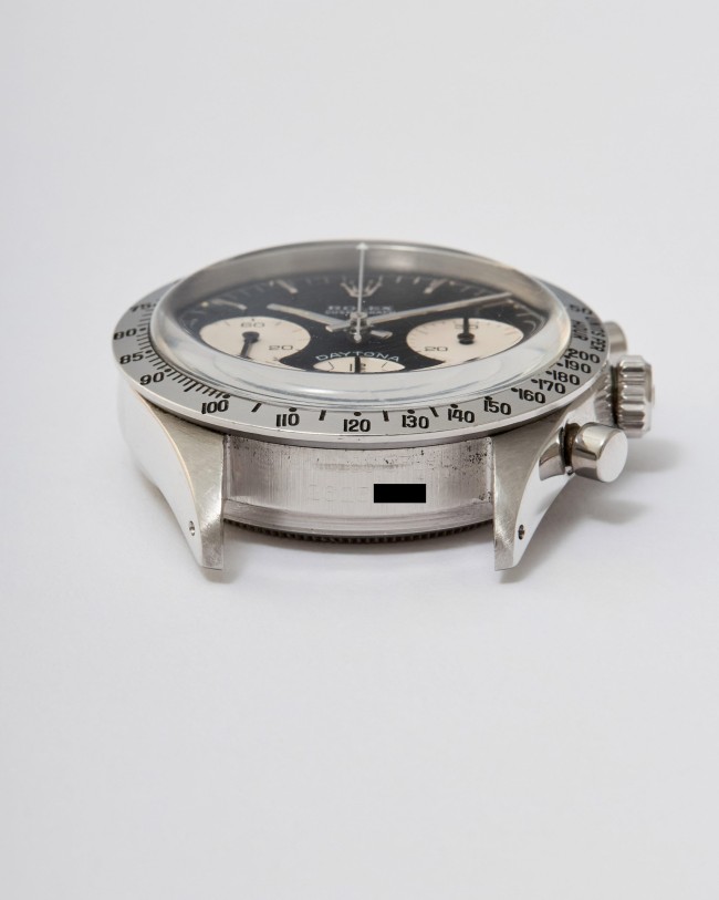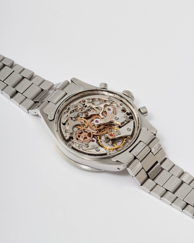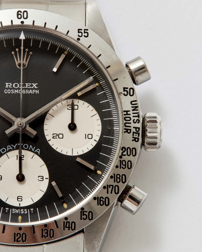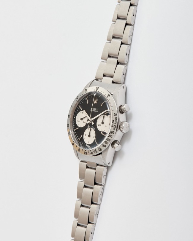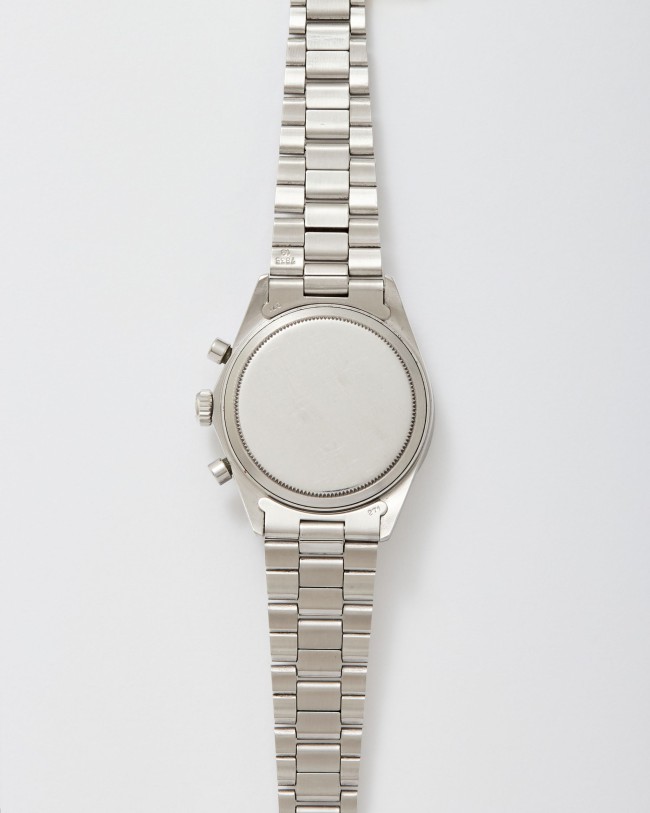 Stainless steel Rolex Daytona ref. 6262. Nicknamed the “Blue Daytona” for the subtle light-blue hue of the Daytona signature, this exquisite reference 6262 from 1972 presents beautifully in highly original condition. Worn over the years yet clearly cherished, the case remains sharp, thick, and well preserved. The bracelet, stamped 2.71, shows minimal wear and very little stretch, reflecting the careful use this piece has enjoyed throughout its life. The black dial is notably well kept, with all luminous plots visible and evenly aged, perfectly complemented by matching hands. Powered by the revered manual-winding calibre 727, this Daytona offers both mechanical charm and timeless appeal. Elegant, discreet, and undeniably captivating, it is a watch that will enchant you from the first moment—a perfect companion for daily wear and a piece sure to brighten your days.