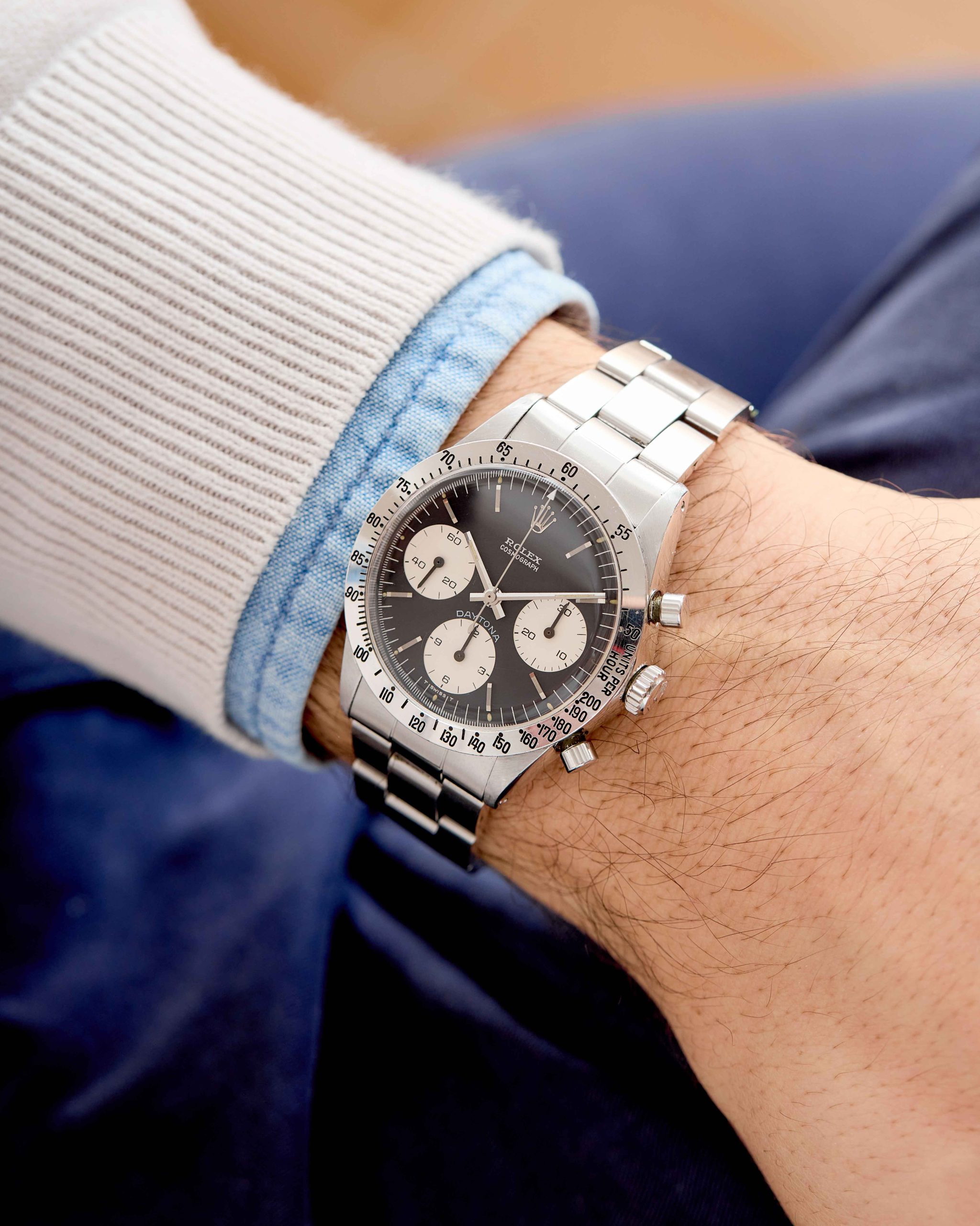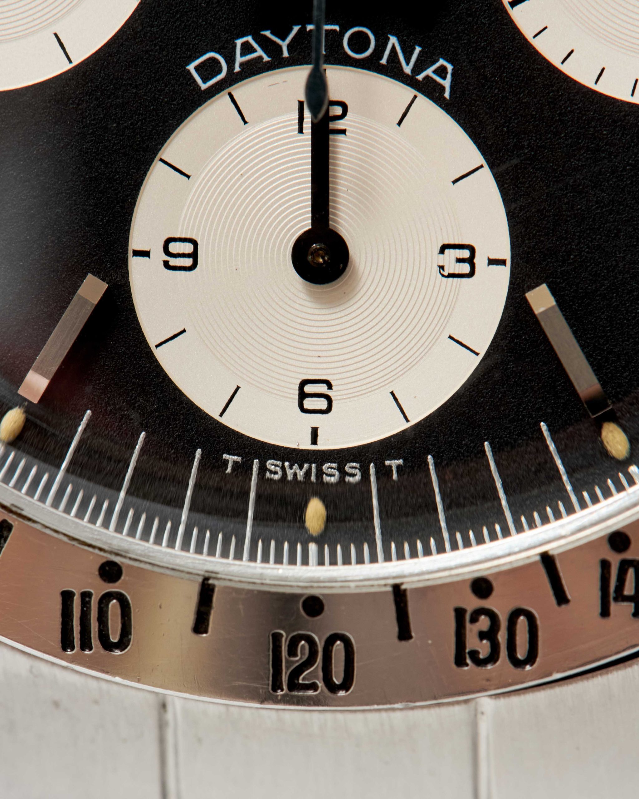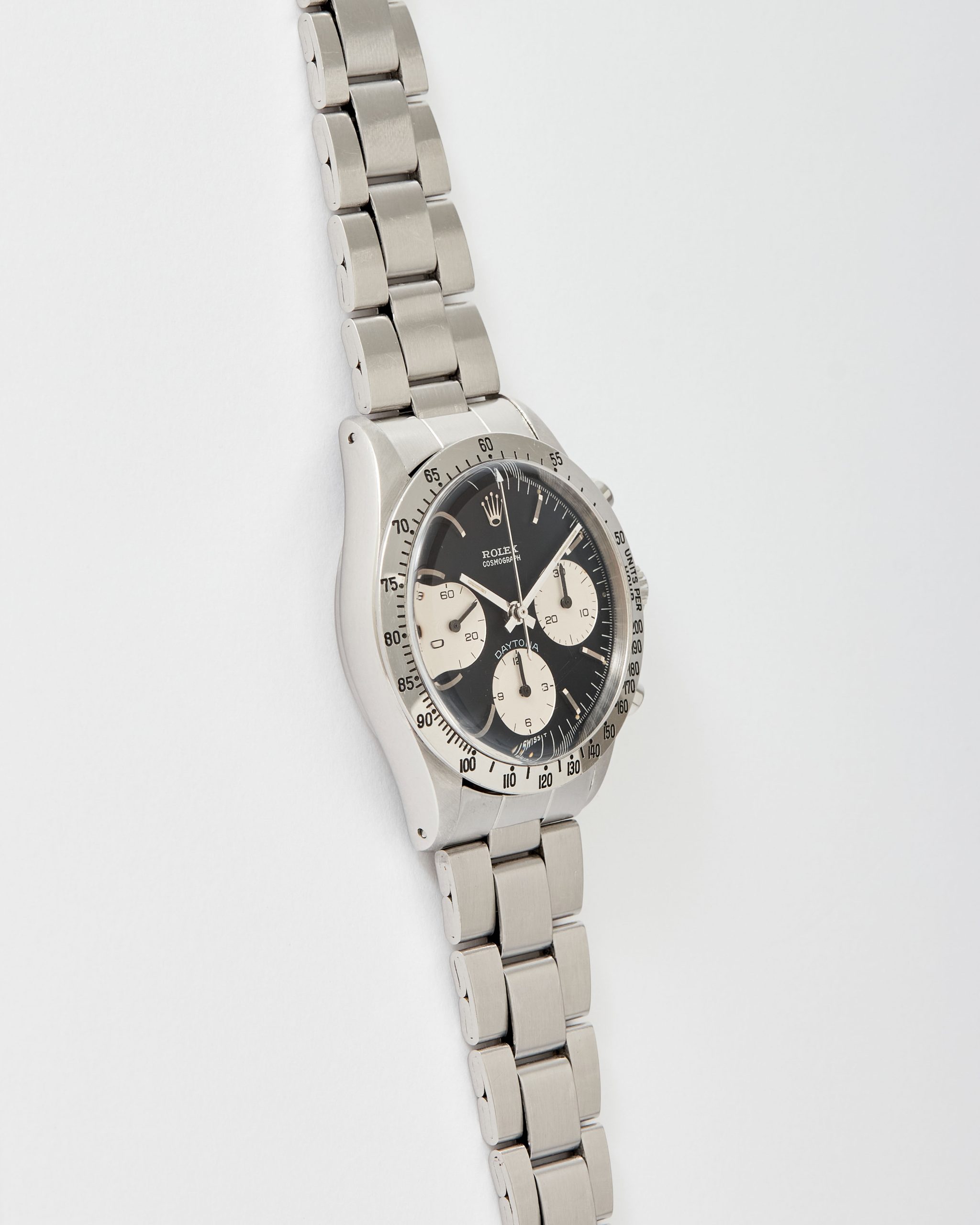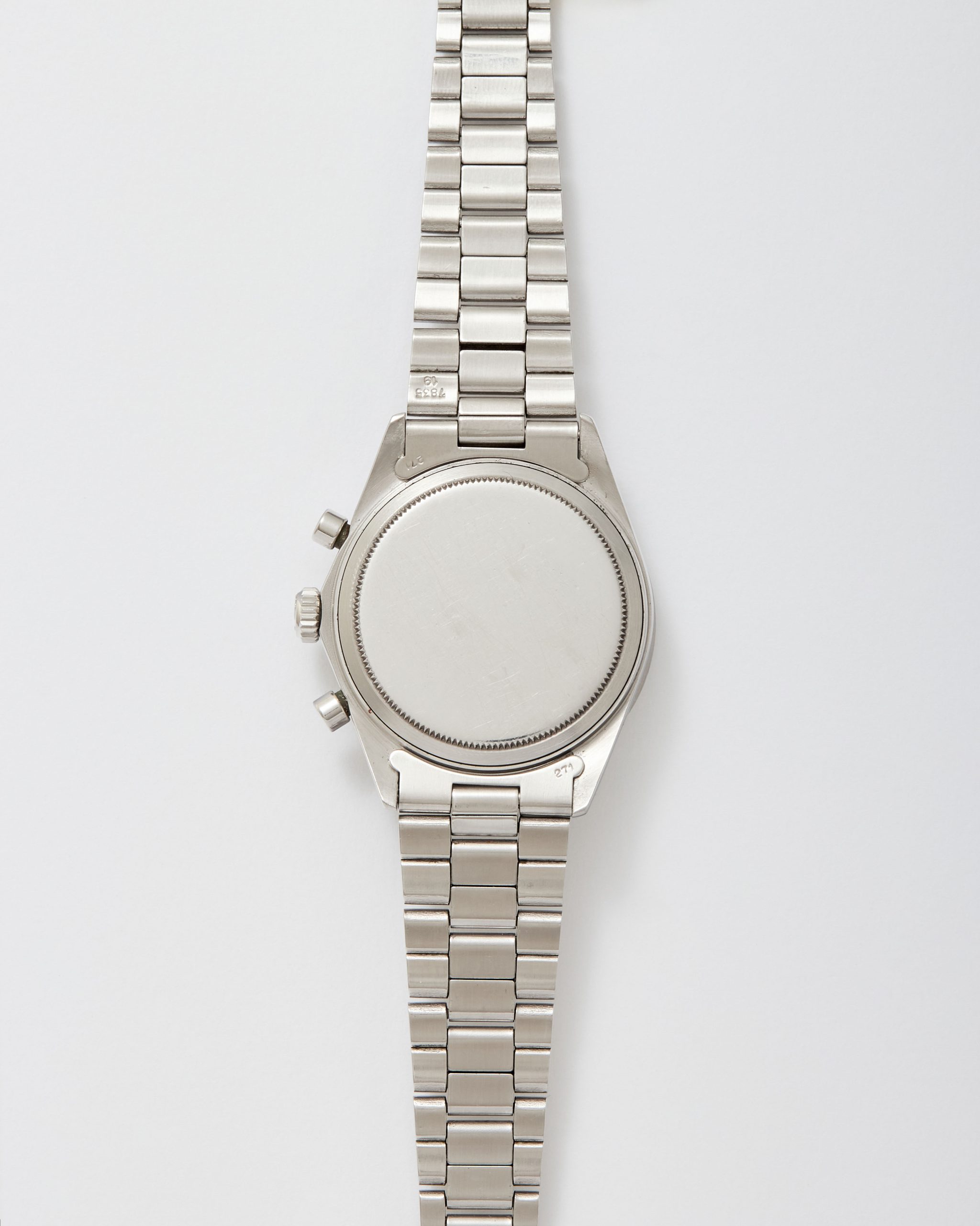 Stainless steel Rolex Daytona ref. 6262. Nicknamed the “Blue Daytona” for the subtle light-blue hue of the Daytona signature, this exquisite reference 6262 from 1972 presents beautifully in highly original condition. Worn over the years yet clearly cherished, the case remains sharp, thick, and well preserved. The bracelet, stamped 2.71, shows minimal wear and very little stretch, reflecting the careful use this piece has enjoyed throughout its life. The black dial is notably well kept, with all luminous plots visible and evenly aged, perfectly complemented by matching hands. Powered by the revered manual-winding calibre 727, this Daytona offers both mechanical charm and timeless appeal. Elegant, discreet, and undeniably captivating, it is a watch that will enchant you from the first moment—a perfect companion for daily wear and a piece sure to brighten your days.