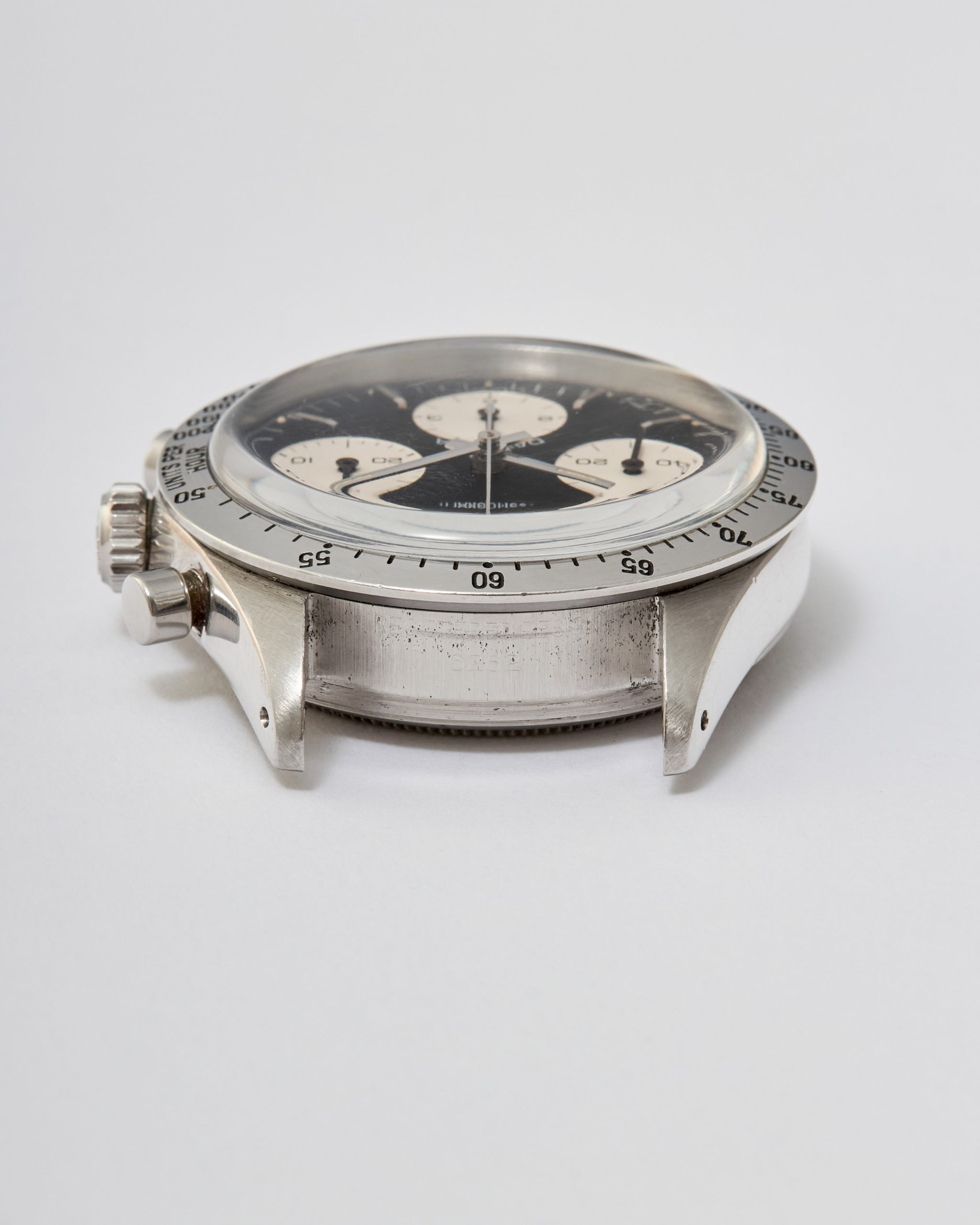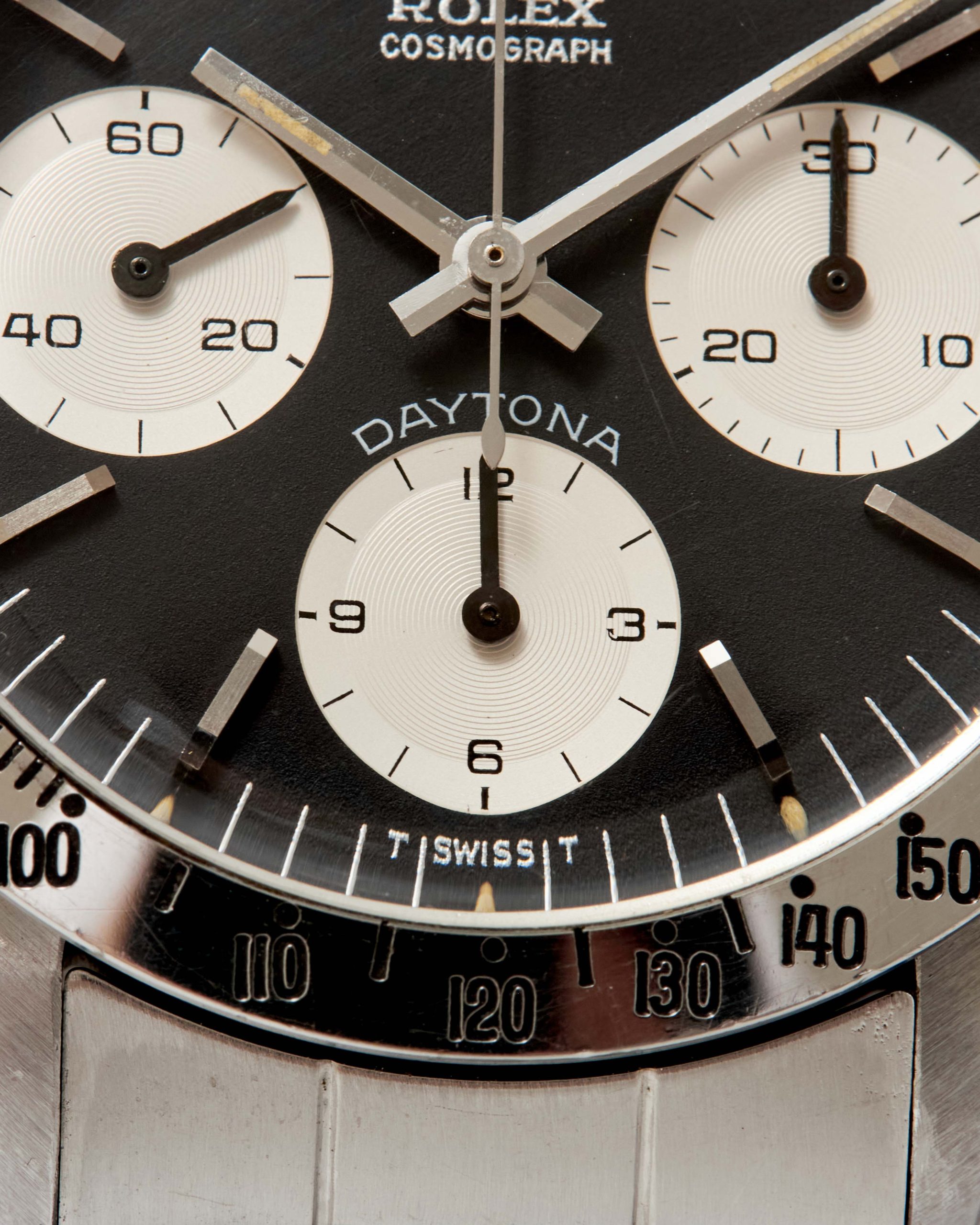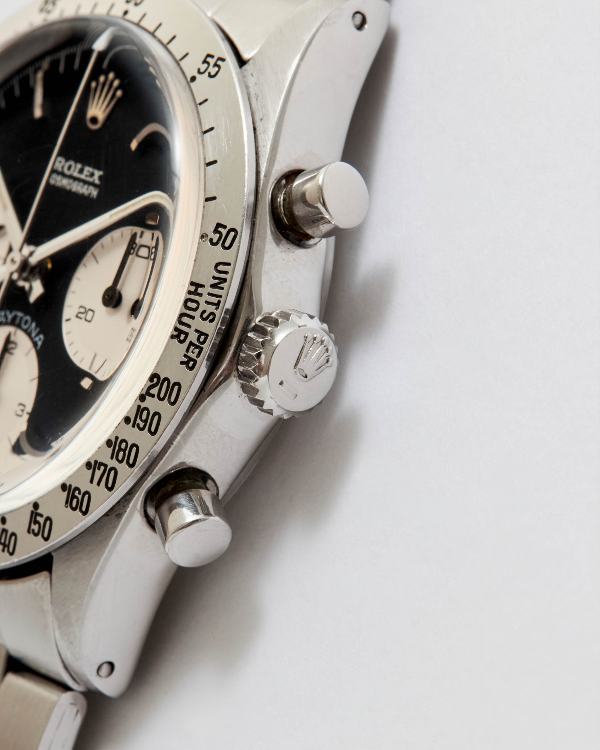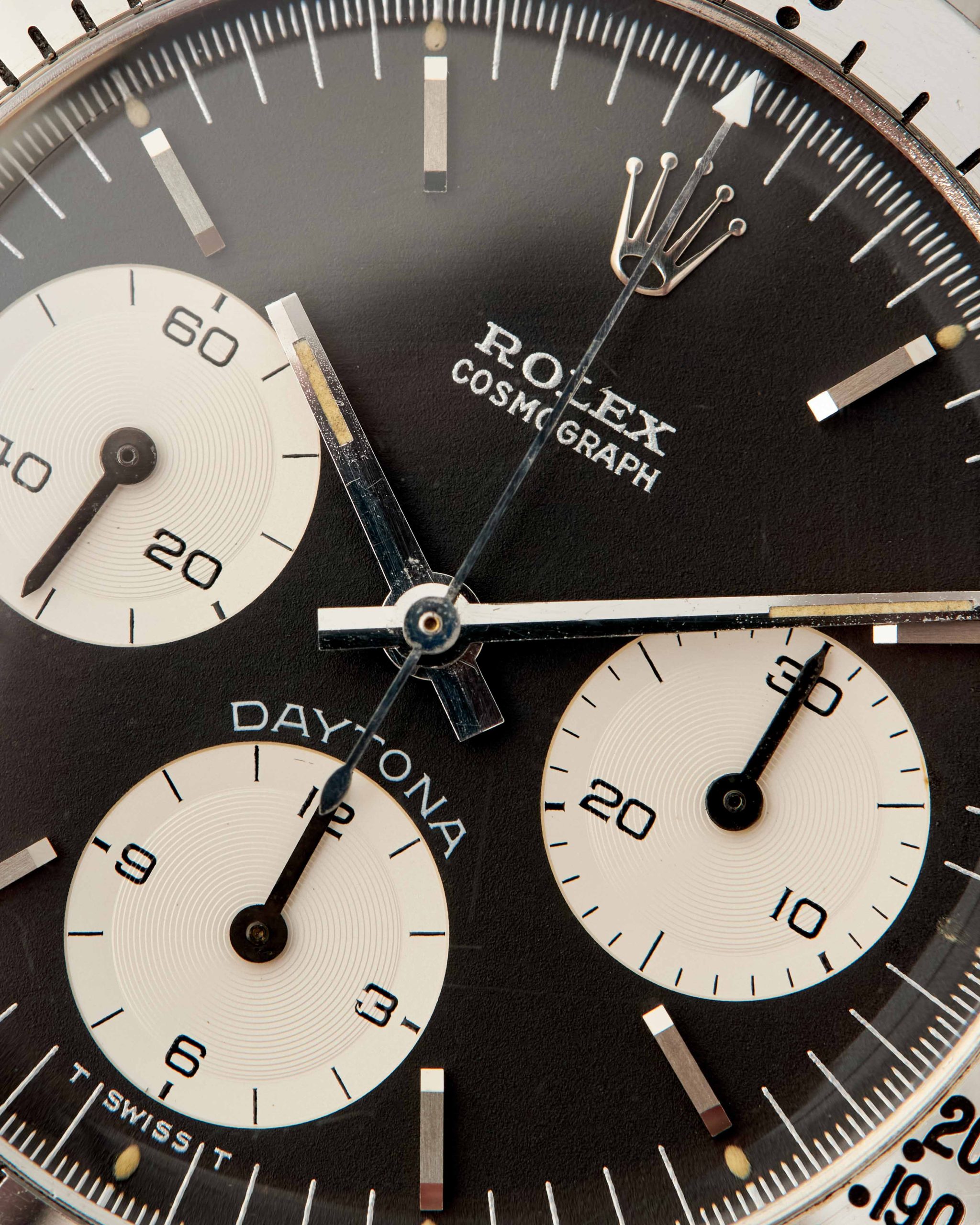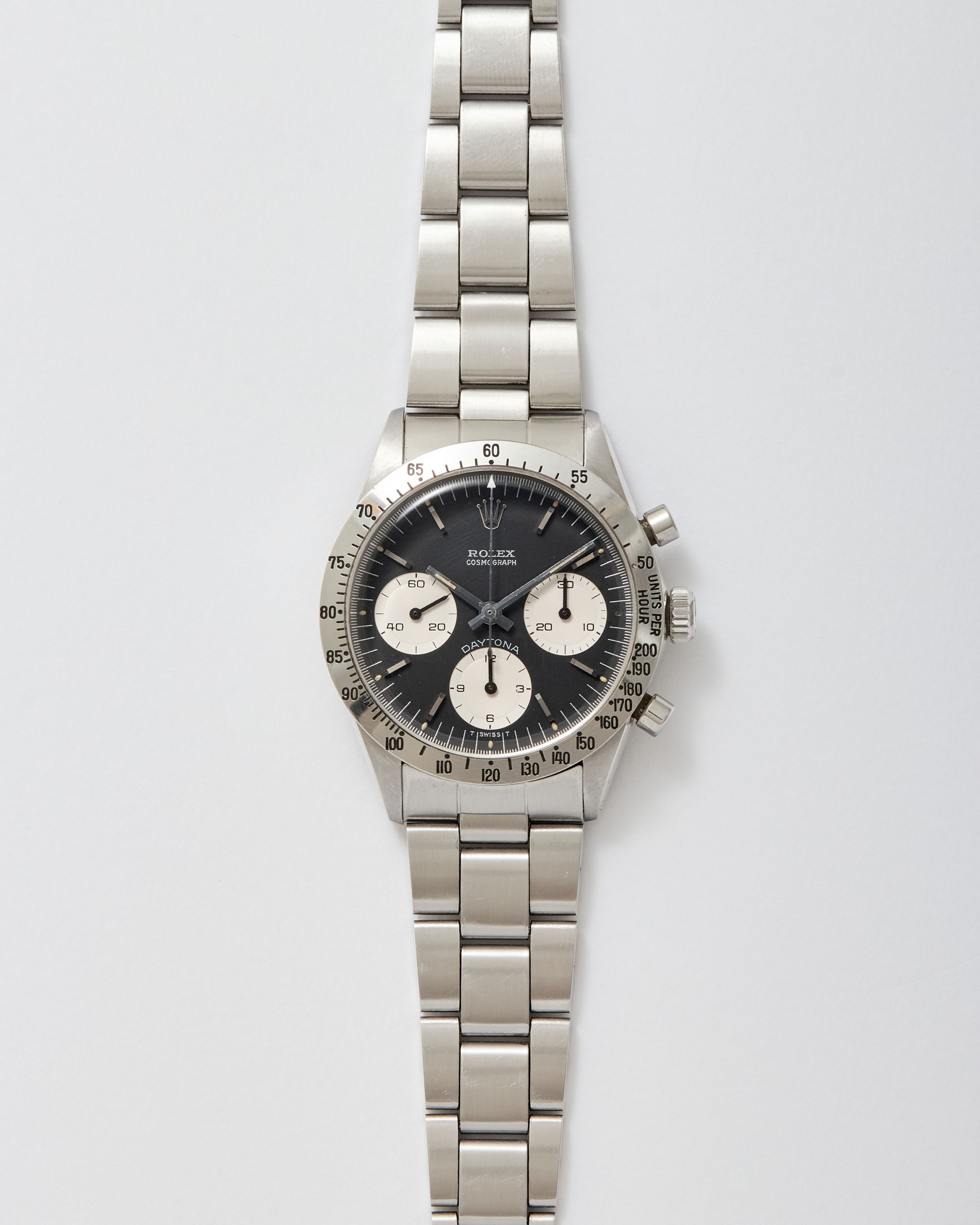 Stainless steel Rolex Daytona ref. 6262. Nicknamed the “Blue Daytona” for the subtle light-blue hue of the Daytona signature, this exquisite reference 6262 from 1972 presents beautifully in highly original condition. Worn over the years yet clearly cherished, the case remains sharp, thick, and well preserved. The bracelet, stamped 2.71, shows minimal wear and very little stretch, reflecting the careful use this piece has enjoyed throughout its life. The black dial is notably well kept, with all luminous plots visible and evenly aged, perfectly complemented by matching hands. Powered by the revered manual-winding calibre 727, this Daytona offers both mechanical charm and timeless appeal. Elegant, discreet, and undeniably captivating, it is a watch that will enchant you from the first moment—a perfect companion for daily wear and a piece sure to brighten your days.