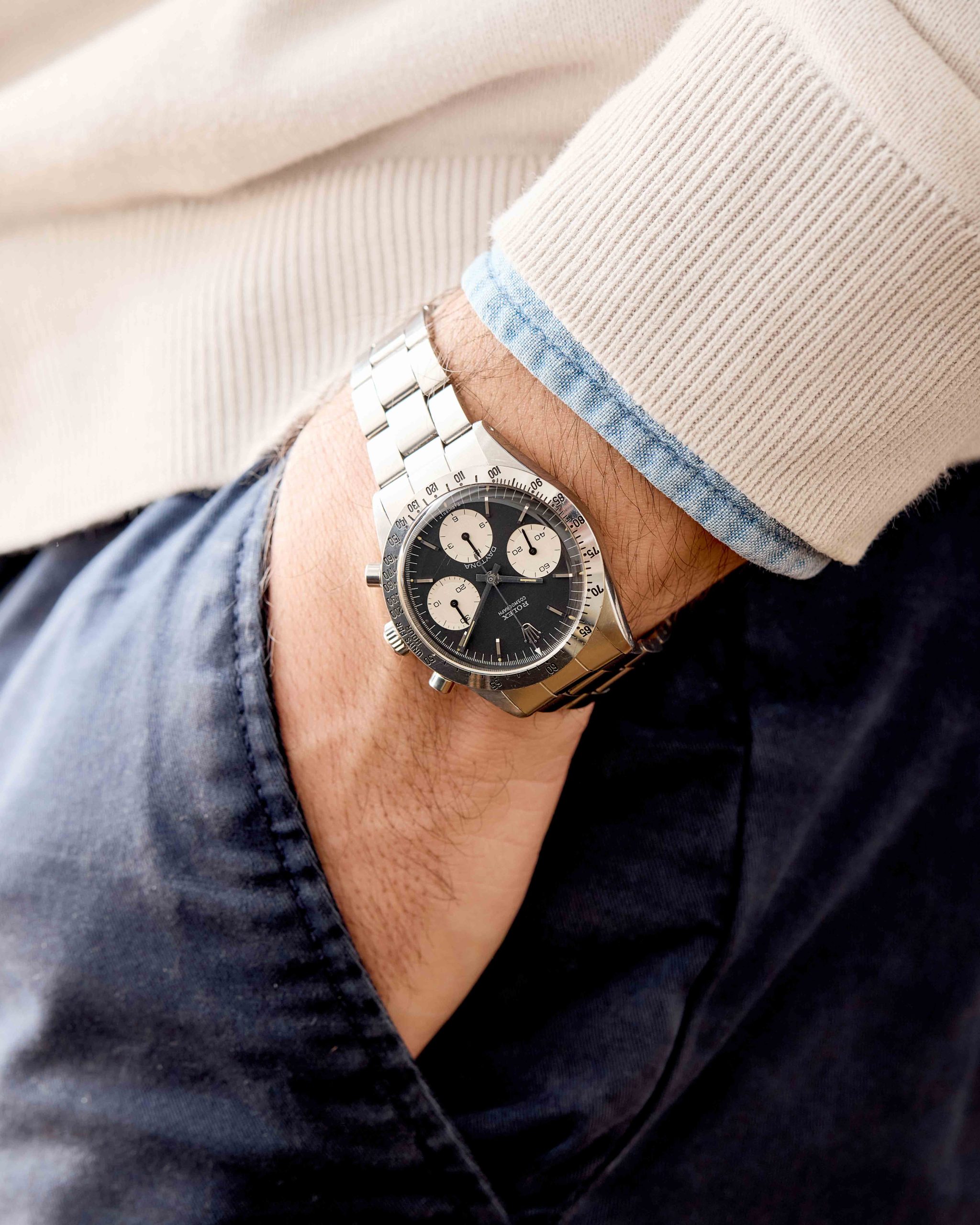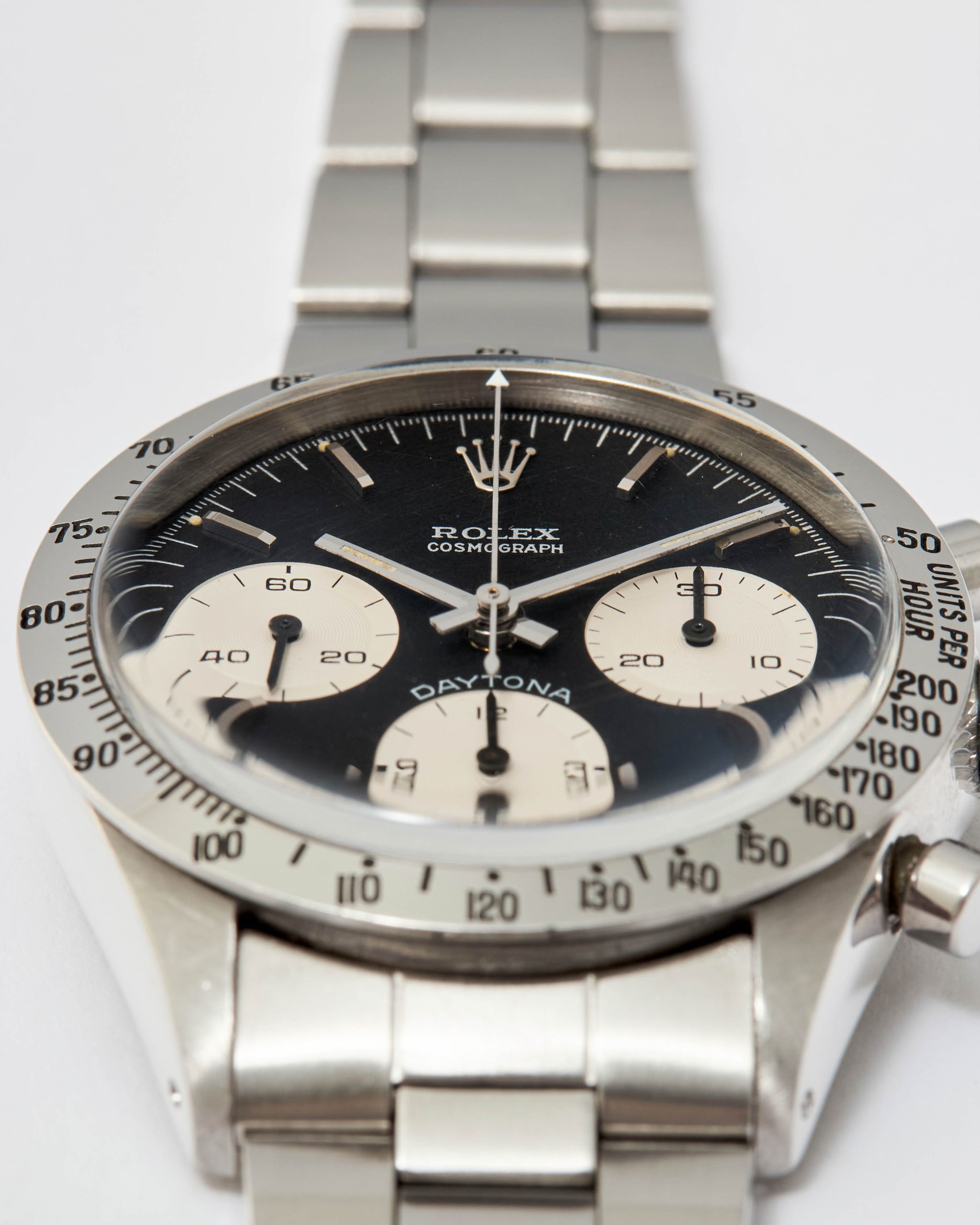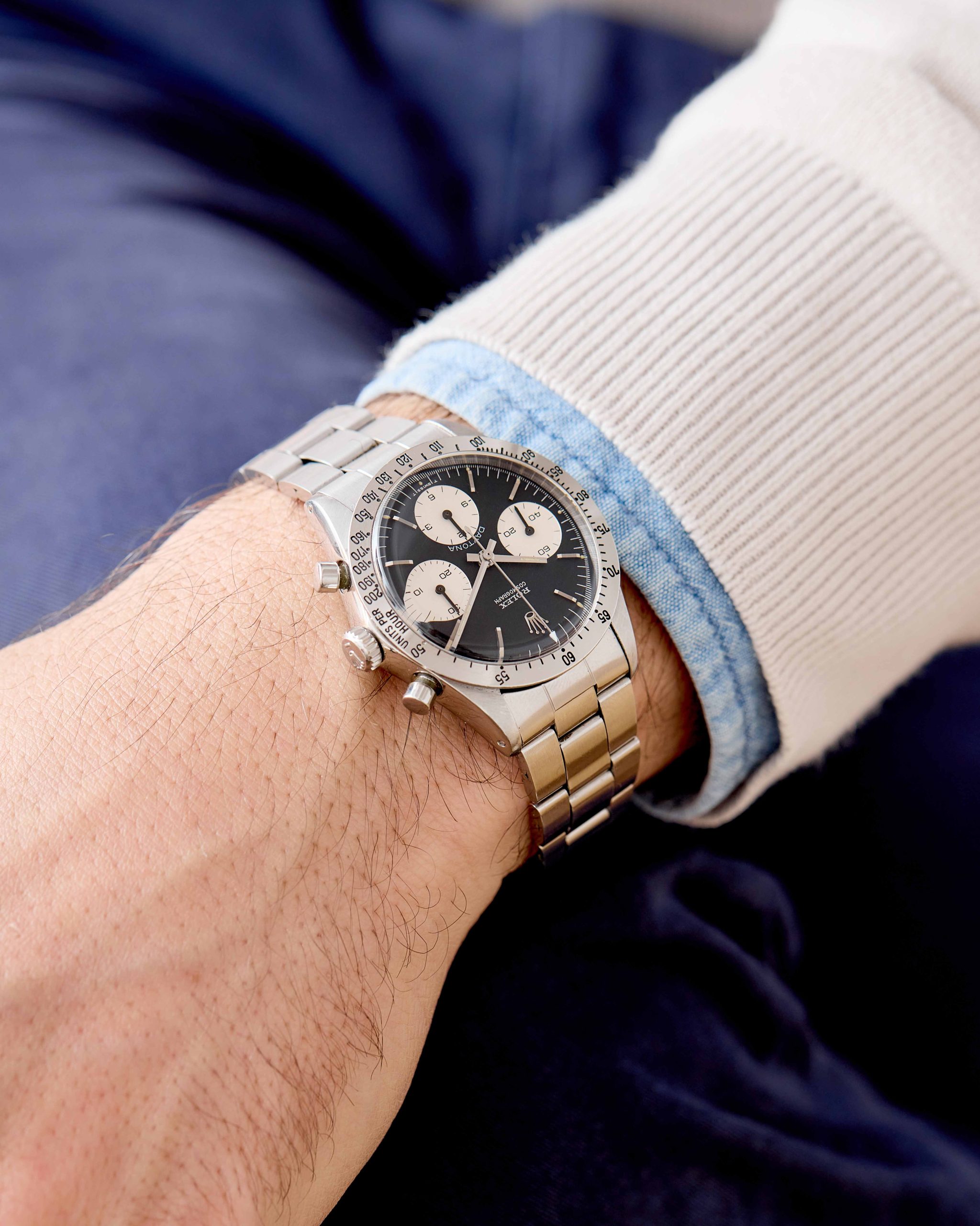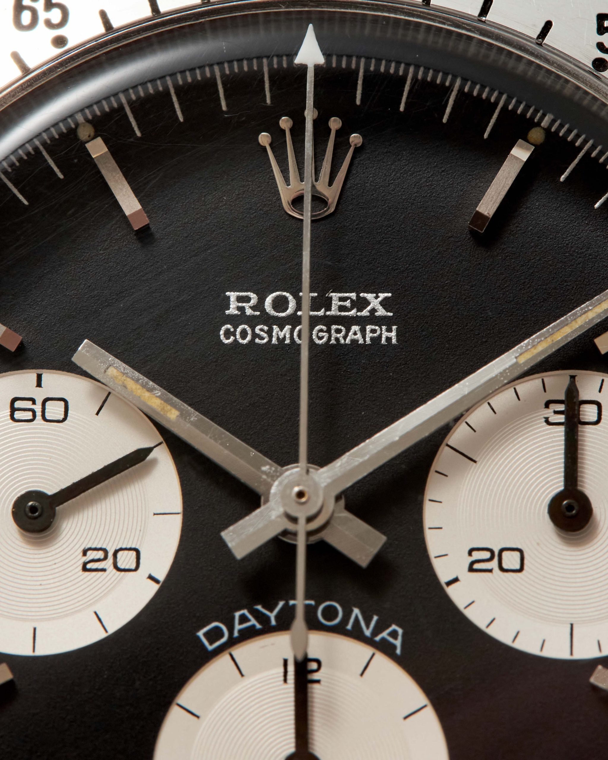 Stainless steel Rolex Daytona ref. 6262. Nicknamed the “Blue Daytona” for the subtle light-blue hue of the Daytona signature, this exquisite reference 6262 from 1972 presents beautifully in highly original condition. Worn over the years yet clearly cherished, the case remains sharp, thick, and well preserved. The bracelet, stamped 2.71, shows minimal wear and very little stretch, reflecting the careful use this piece has enjoyed throughout its life. The black dial is notably well kept, with all luminous plots visible and evenly aged, perfectly complemented by matching hands. Powered by the revered manual-winding calibre 727, this Daytona offers both mechanical charm and timeless appeal. Elegant, discreet, and undeniably captivating, it is a watch that will enchant you from the first moment—a perfect companion for daily wear and a piece sure to brighten your days.