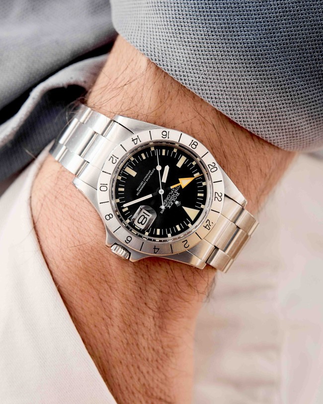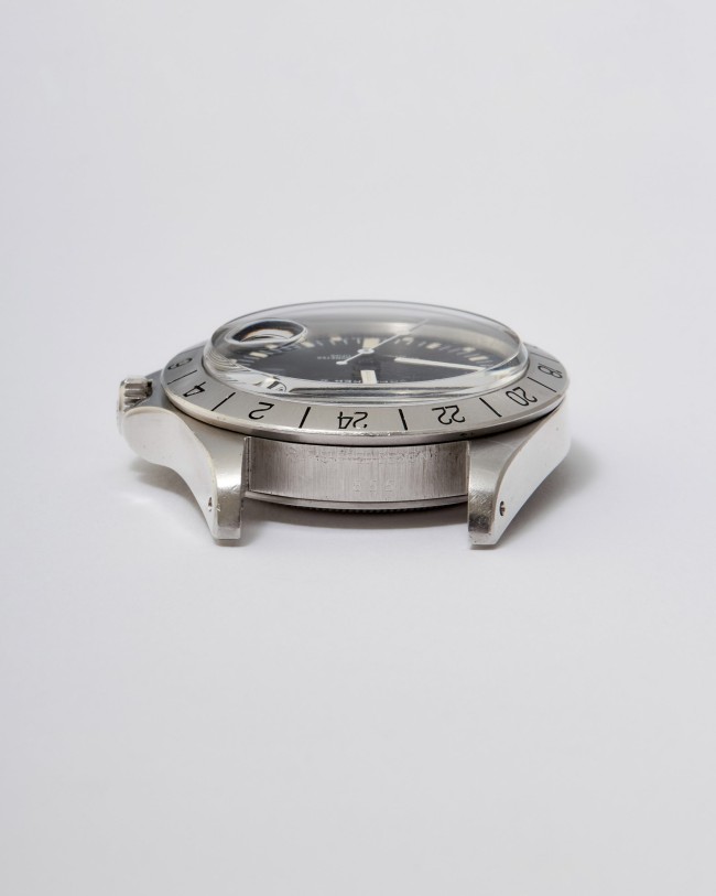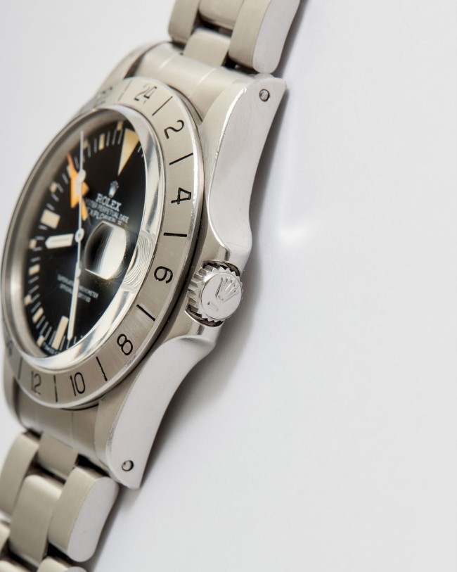 Stainless steel Rolex Explorer II “Freccione”. A superb example of the iconic Rolex Explorer II “Freccione” from 1980, presented in original condition and offered as a complete set. This watch was previously sold by us years ago to a discerning collector and close friend, who has carefully preserved it ever since. The large, unpolished case remains in excellent condition, showcasing its original lines. The steel bracelet is also in very good shape, exhibiting minimal stretch. The MK4 dial is perfect and flawless, retaining its striking character. Powered by the self-winding Caliber 1570, this piece was originally sold by a Rolex retailer in Barcelona in December 1982. It comes with its original box and papers. A fantastic and highly collectible watch — an exceptional addition to any serious collection.