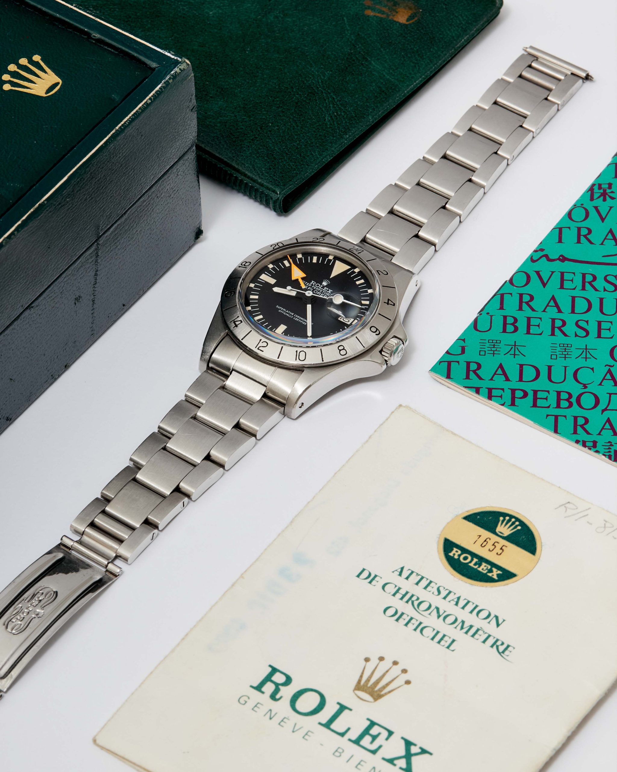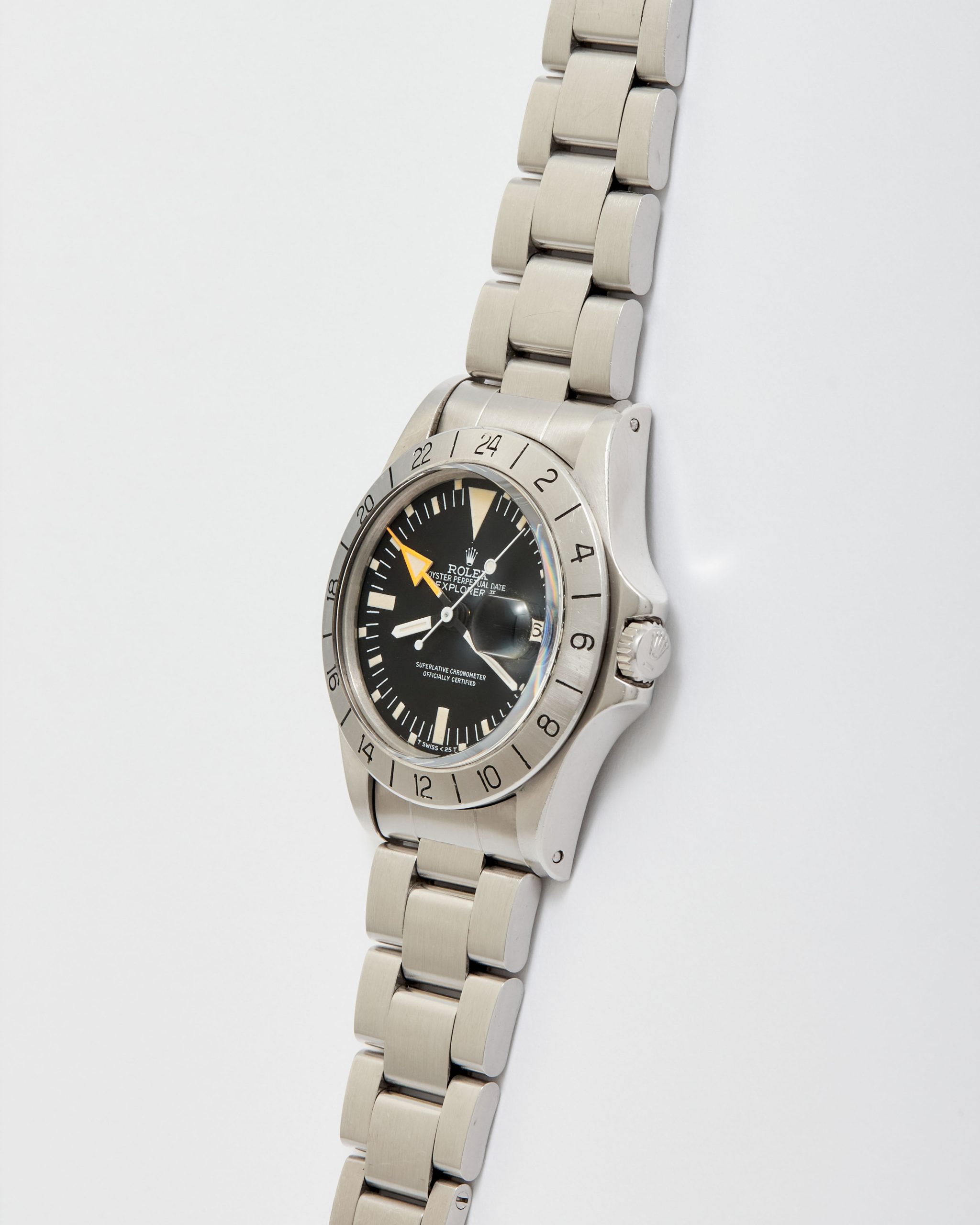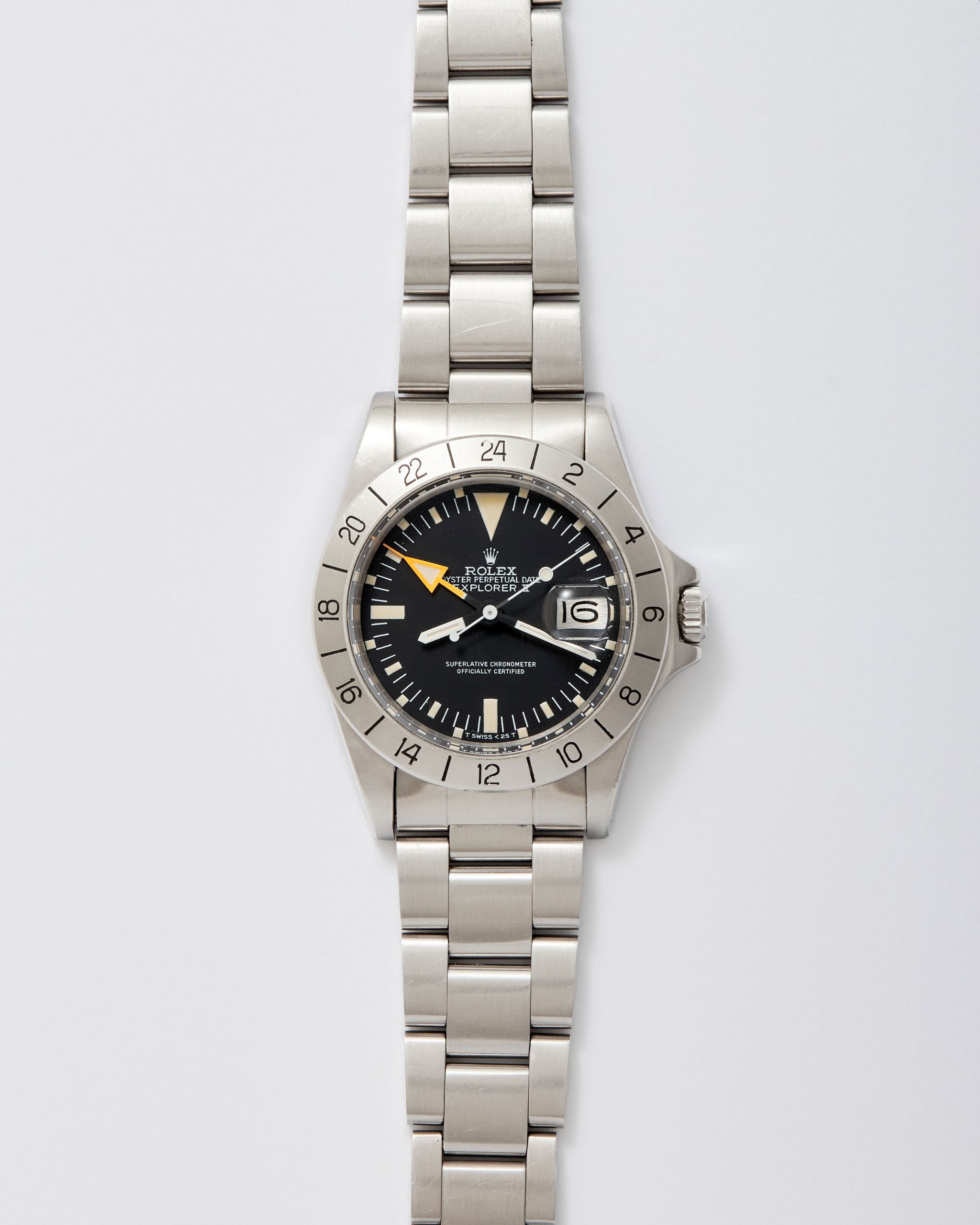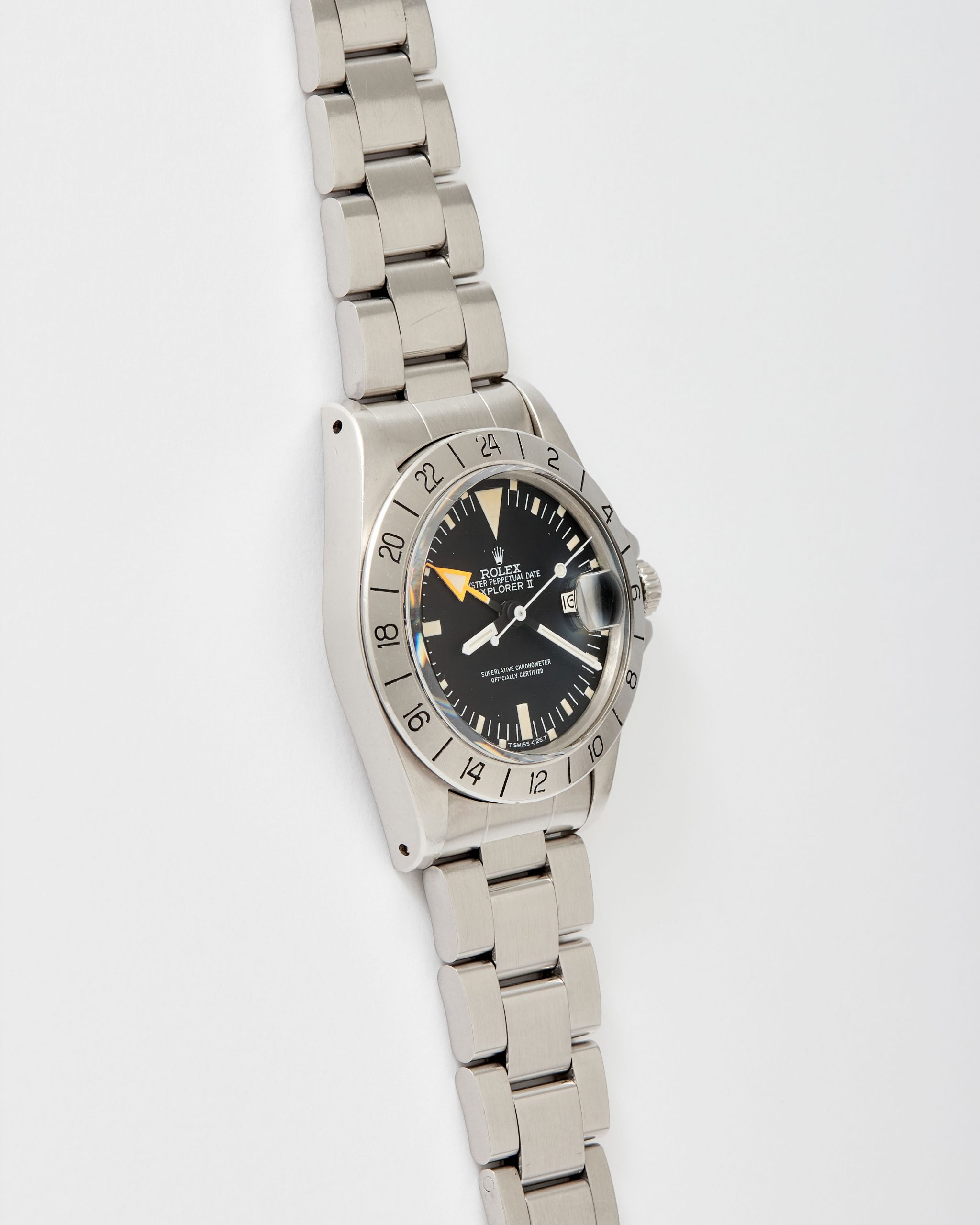 Stainless steel Rolex Explorer II “Freccione”. A superb example of the iconic Rolex Explorer II “Freccione” from 1980, presented in original condition and offered as a complete set. This watch was previously sold by us years ago to a discerning collector and close friend, who has carefully preserved it ever since. The large, unpolished case remains in excellent condition, showcasing its original lines. The steel bracelet is also in very good shape, exhibiting minimal stretch. The MK4 dial is perfect and flawless, retaining its striking character. Powered by the self-winding Caliber 1570, this piece was originally sold by a Rolex retailer in Barcelona in December 1982. It comes with its original box and papers. A fantastic and highly collectible watch — an exceptional addition to any serious collection.