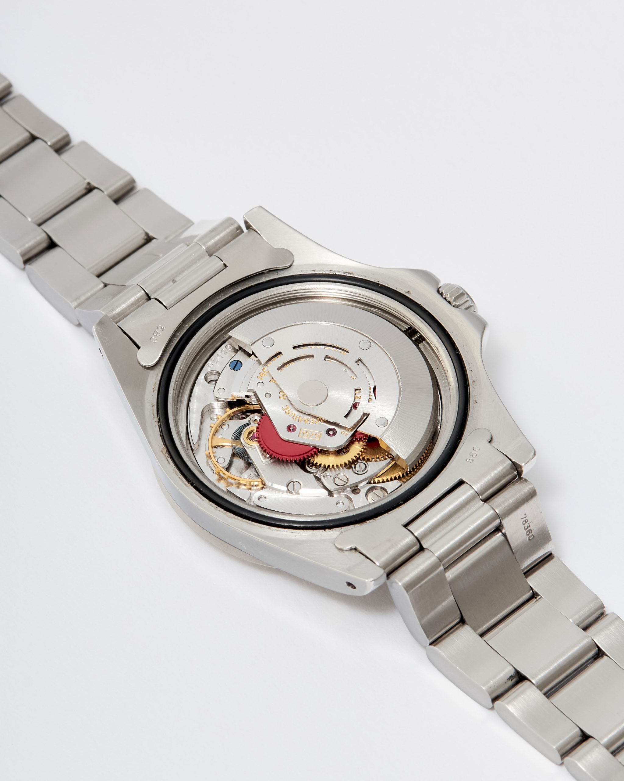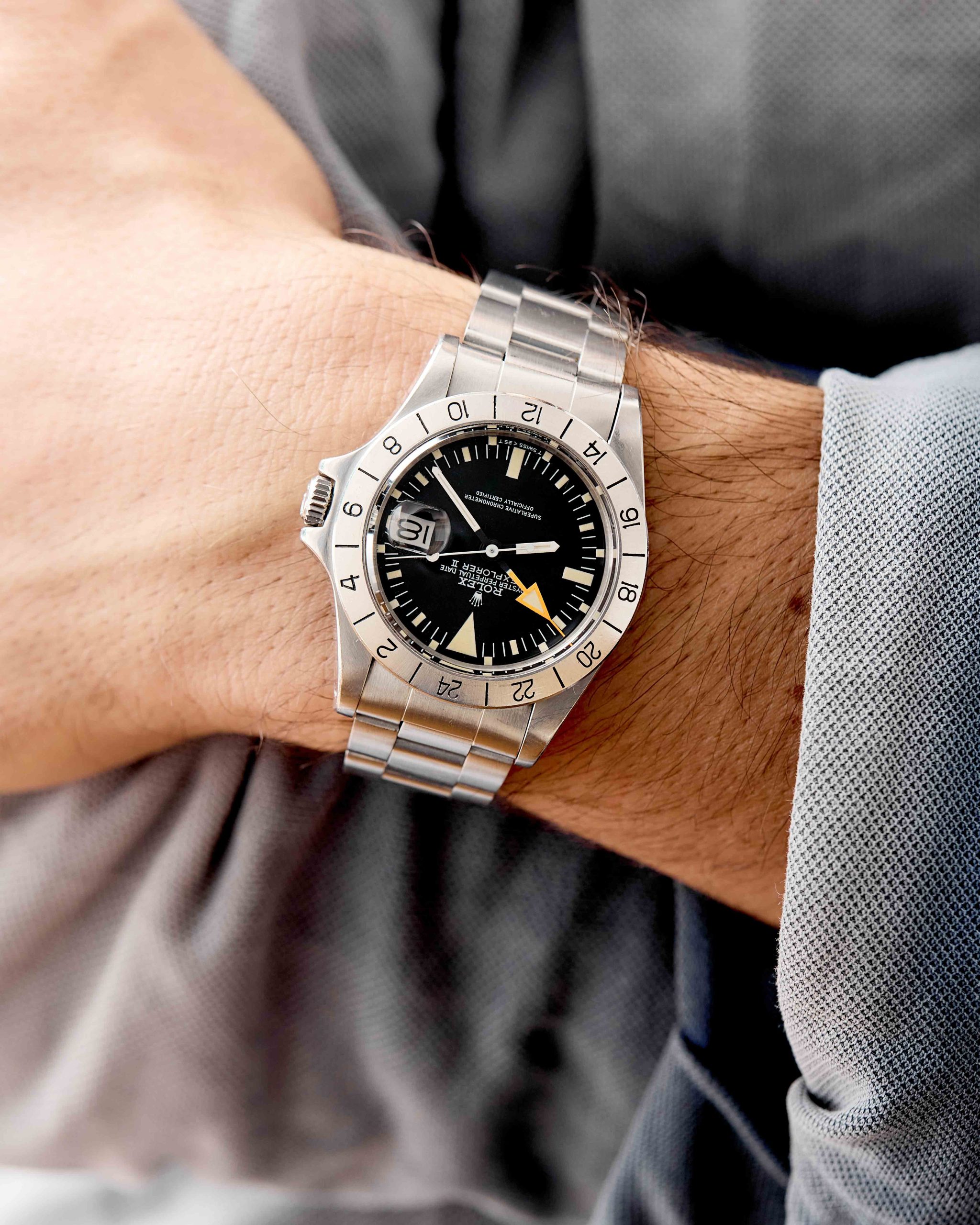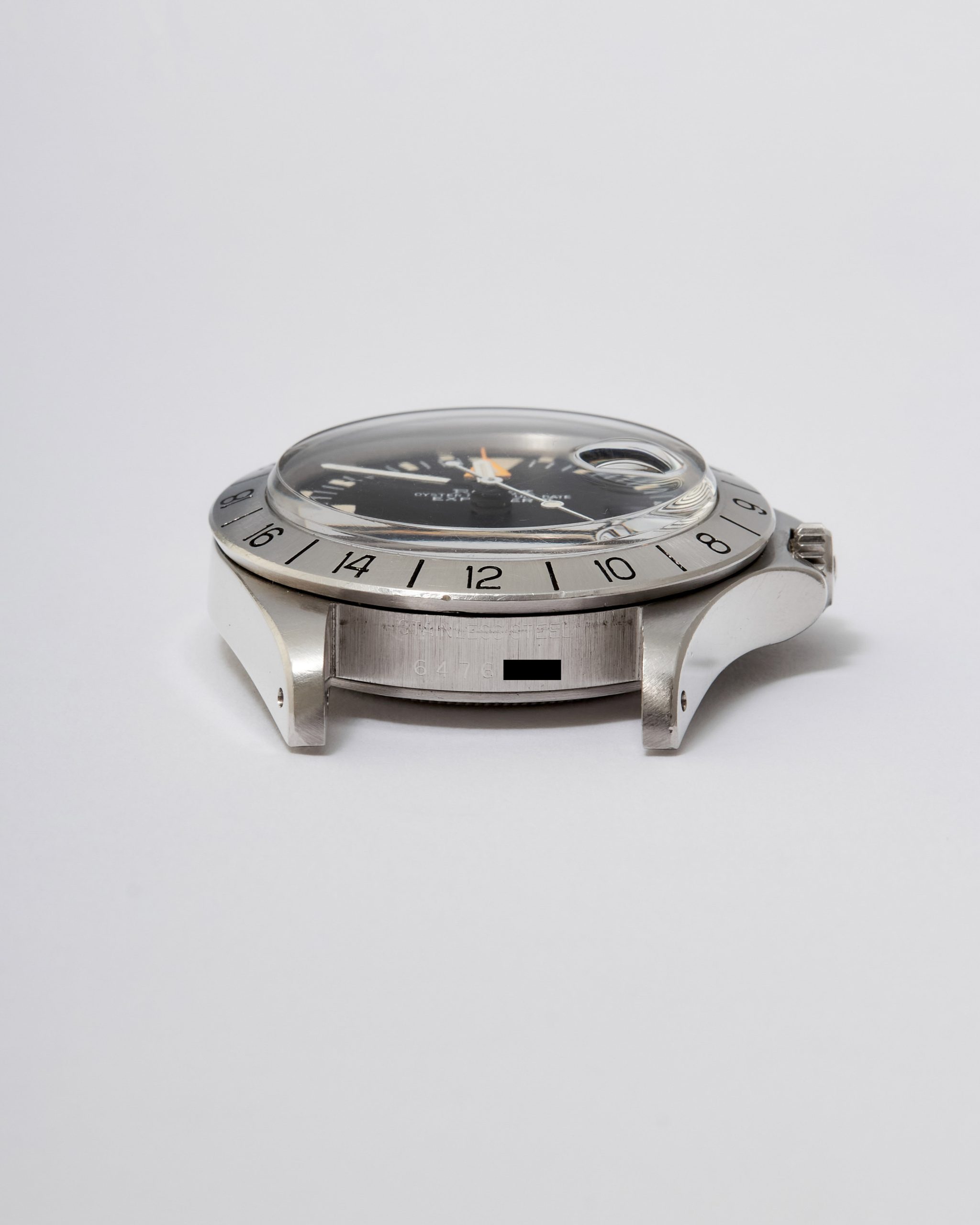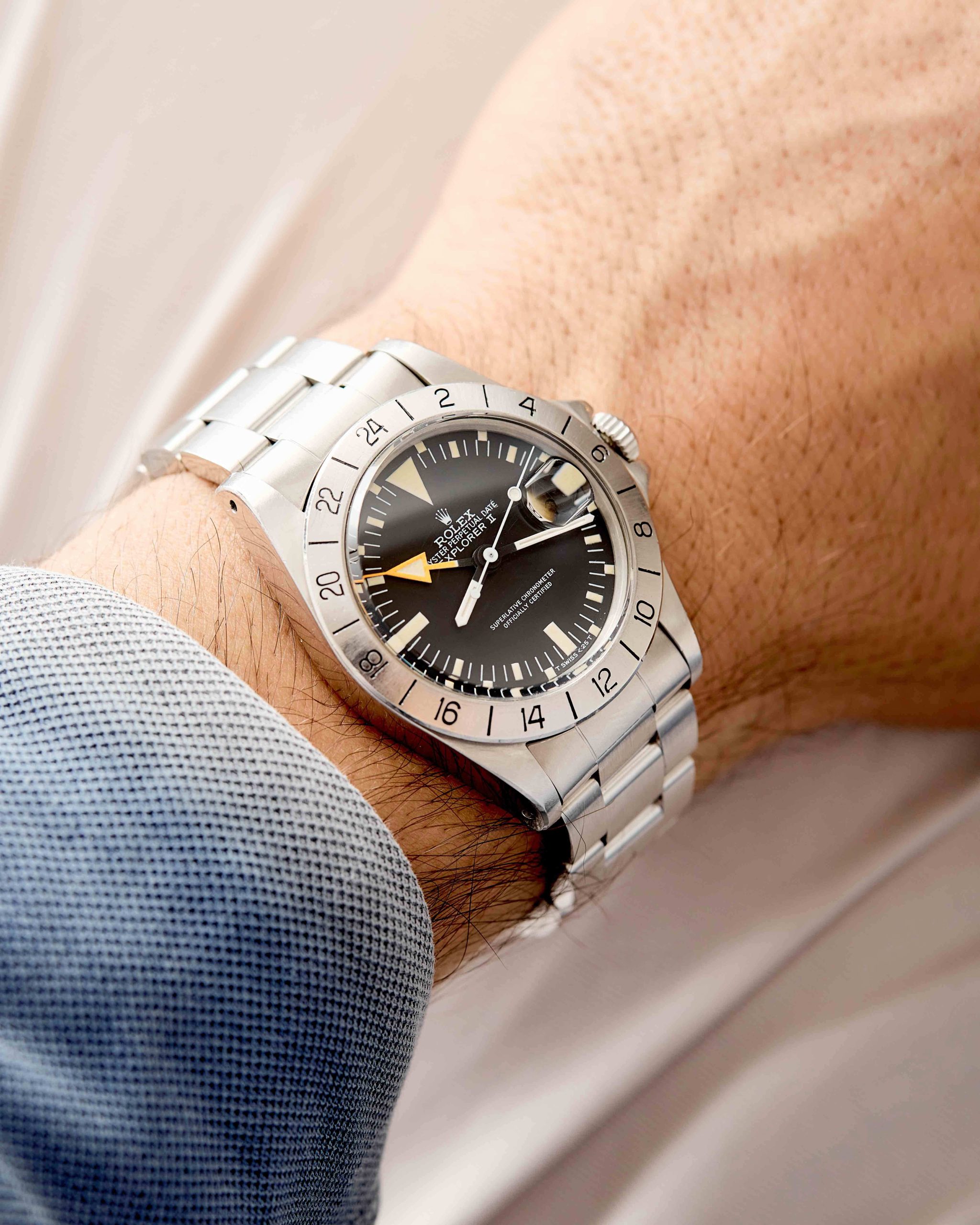 Stainless steel Rolex Explorer II “Freccione”. A superb example of the iconic Rolex Explorer II “Freccione” from 1980, presented in original condition and offered as a complete set. This watch was previously sold by us years ago to a discerning collector and close friend, who has carefully preserved it ever since. The large, unpolished case remains in excellent condition, showcasing its original lines. The steel bracelet is also in very good shape, exhibiting minimal stretch. The MK4 dial is perfect and flawless, retaining its striking character. Powered by the self-winding Caliber 1570, this piece was originally sold by a Rolex retailer in Barcelona in December 1982. It comes with its original box and papers. A fantastic and highly collectible watch — an exceptional addition to any serious collection.