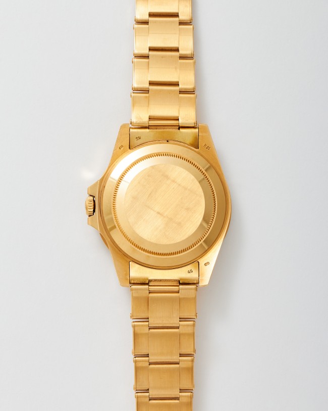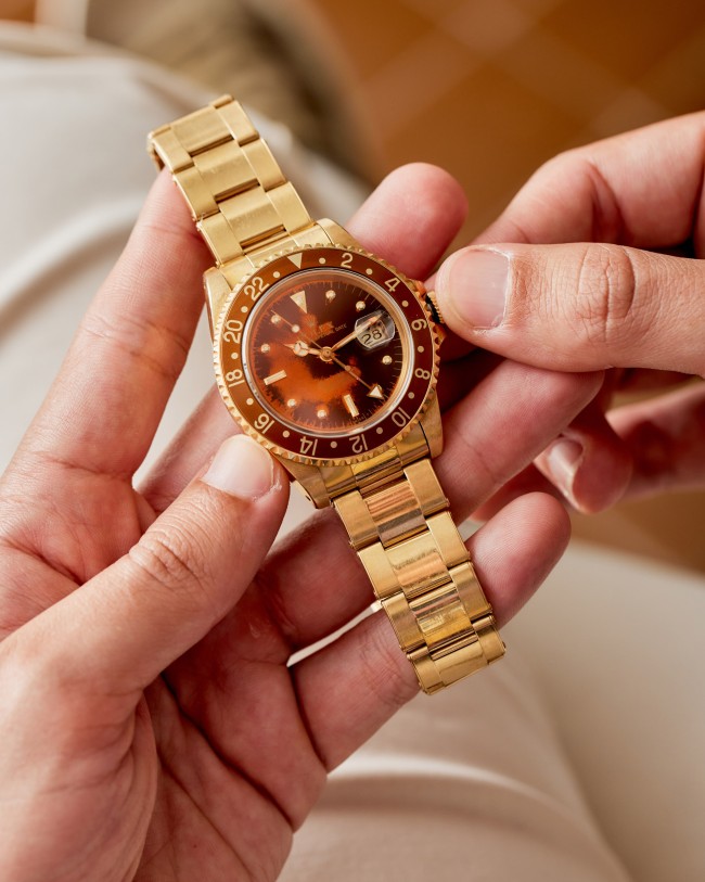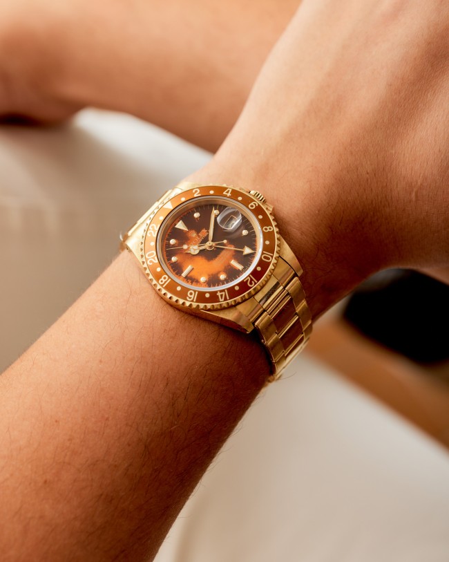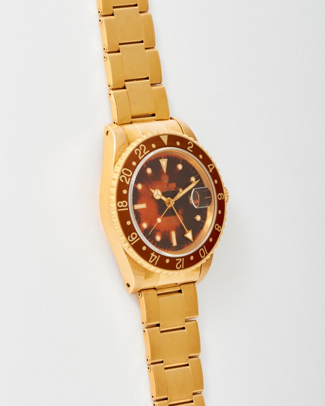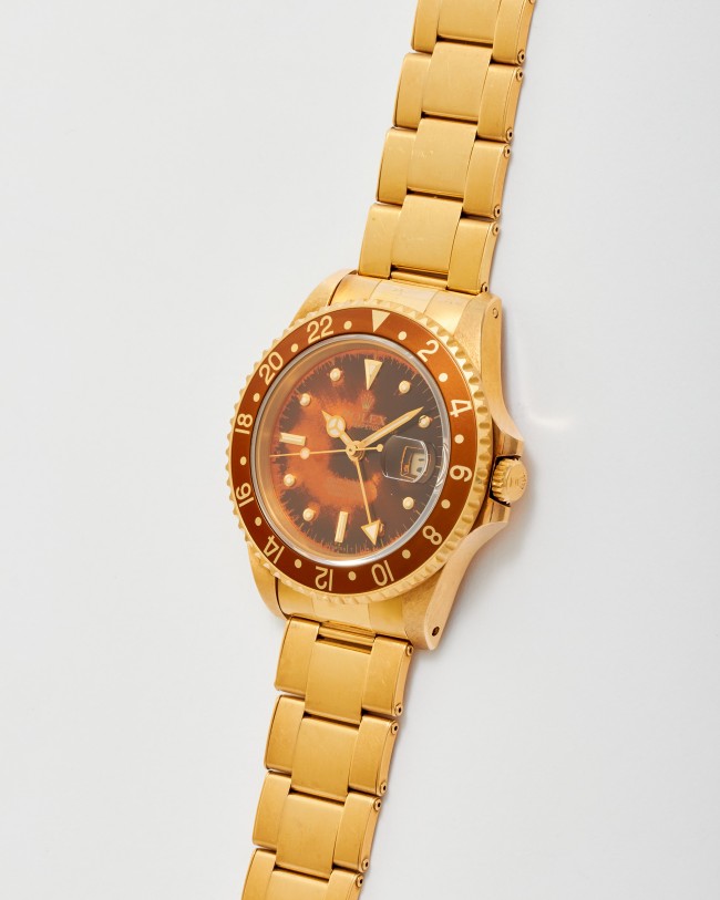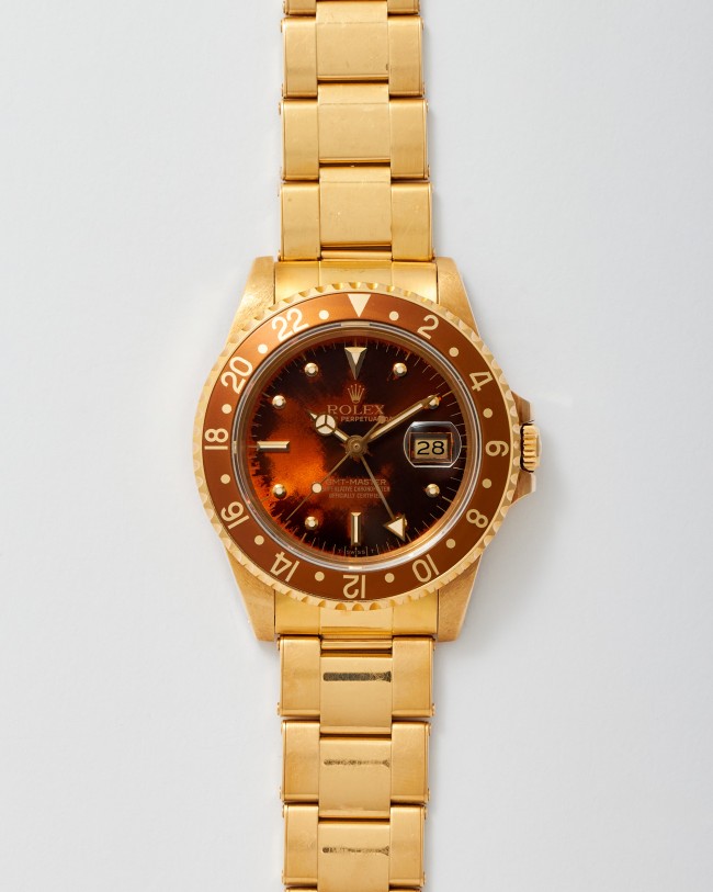 18K gold GMT Master Ref. 16758. Excellently preserved and never polished, this GMT Master stands as a testament to its enduring quality and authenticity. The original brown dial has gracefully transitioned to a stunning rust hue, imbuing the watch with a rare tropical charm that sets it apart from the rest. This distinctive transformation adds a layer of character and individuality to an already iconic timepiece. The Oyster rivet gold bracelet, meticulously preserved, further enhances the watch's allure. Although crafted in 1984, its journey continued with a subsequent sale in 1991, as evidenced by the accompanying “Garantie”, adding another chapter to its storied history. Complete with its original box and papers, this Rolex GMT Master is a coveted collectible.